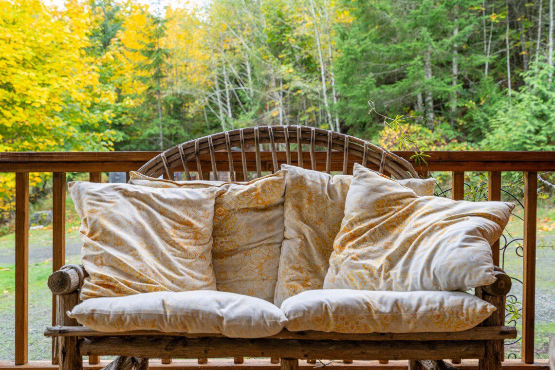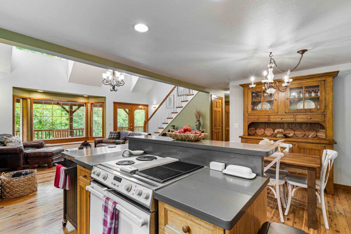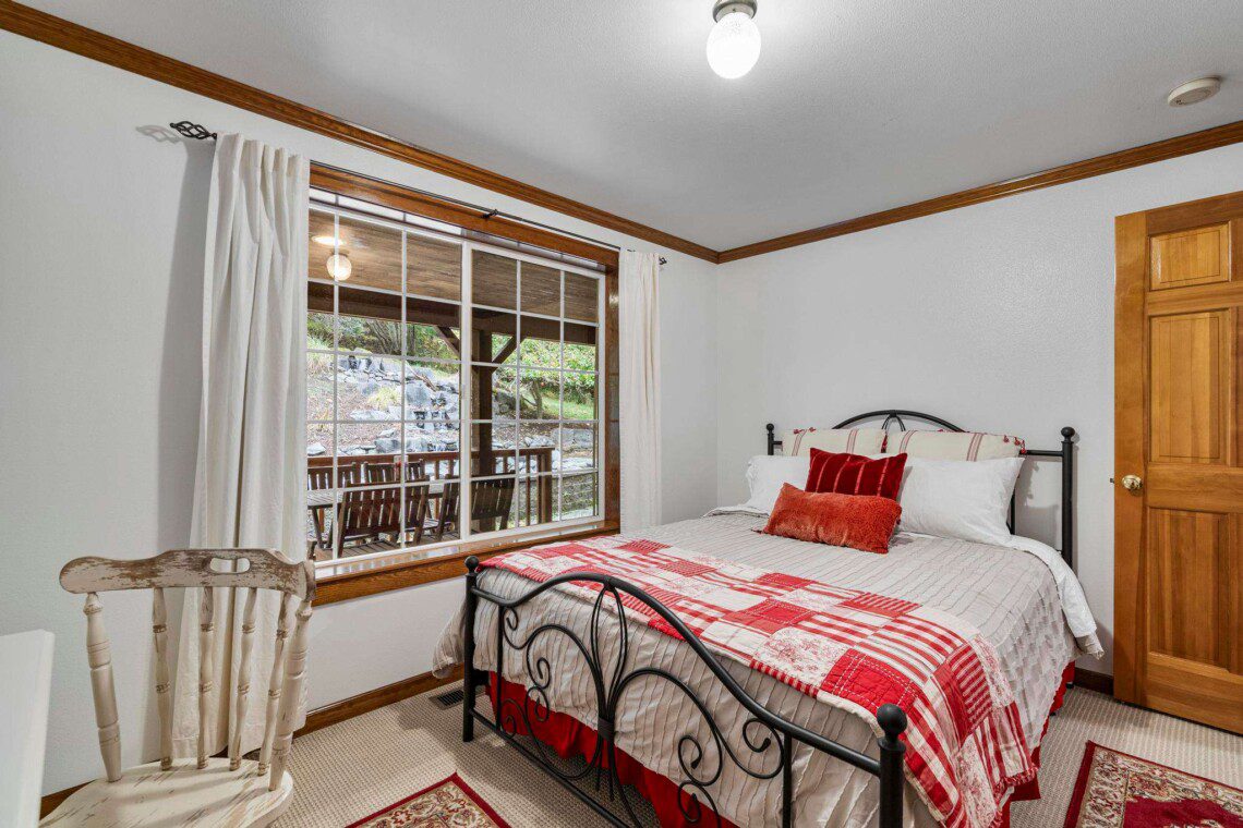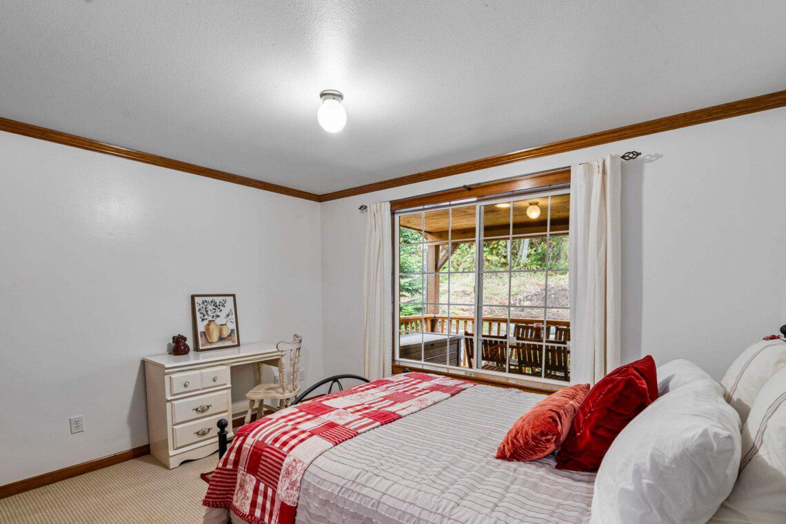 Downstairs, you’ll find two queen bedrooms, each with a full closet and writing desk. The Apple Room overlooks the backyard and pond, while the Sunshine Room offers views of the front yard, forest, and porch. Each bedroom is designed to be calm, comfortable, and welcoming. A full bathroom is also located downstairs.