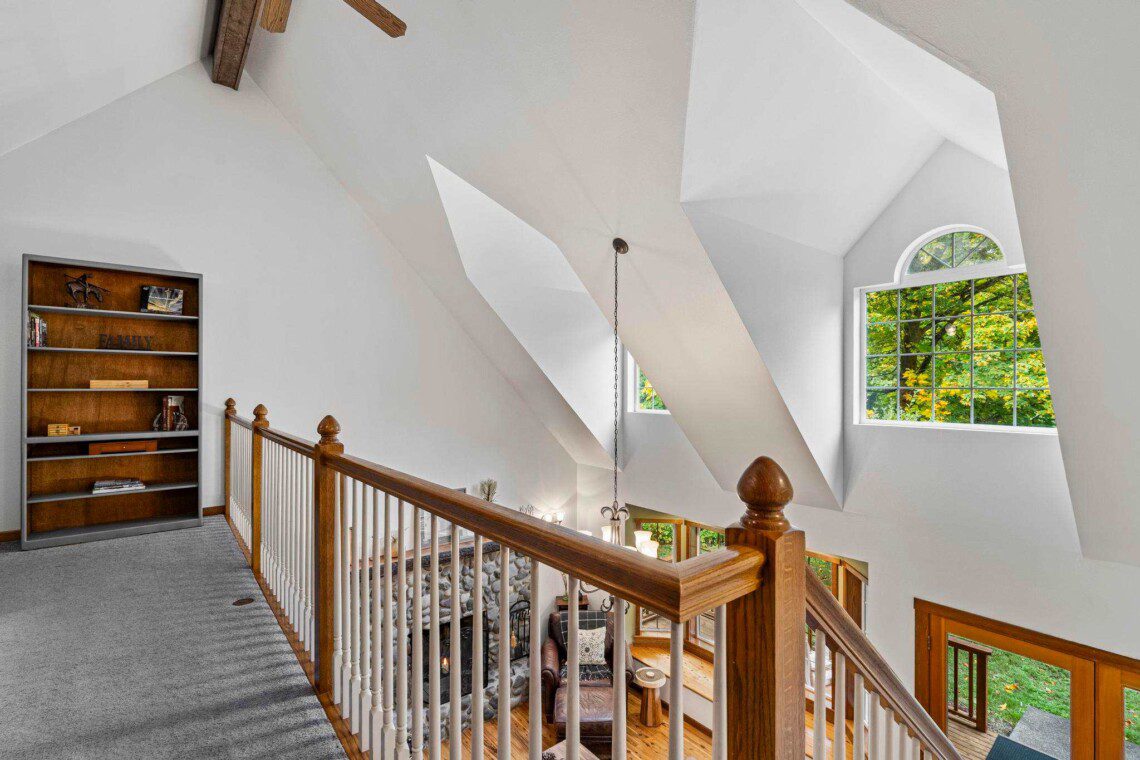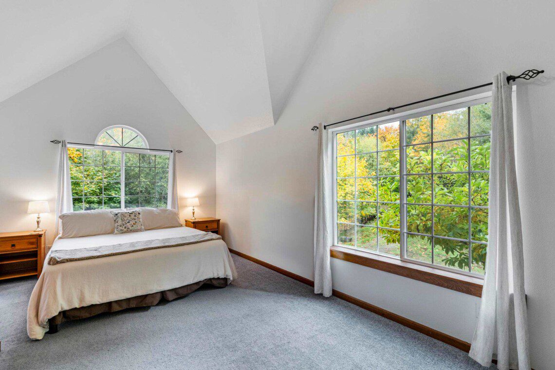 Upstairs, the spacious primary bedroom features a king-sized bed, peaceful views of the surrounding trees, and a jet tub for relaxing soaks. Just outside the bedroom, the loft offers a comfy couch, TV, workout bench, weights, and a full-length mirror — all overlooking the living room below with beautiful views of the backyard and pond.