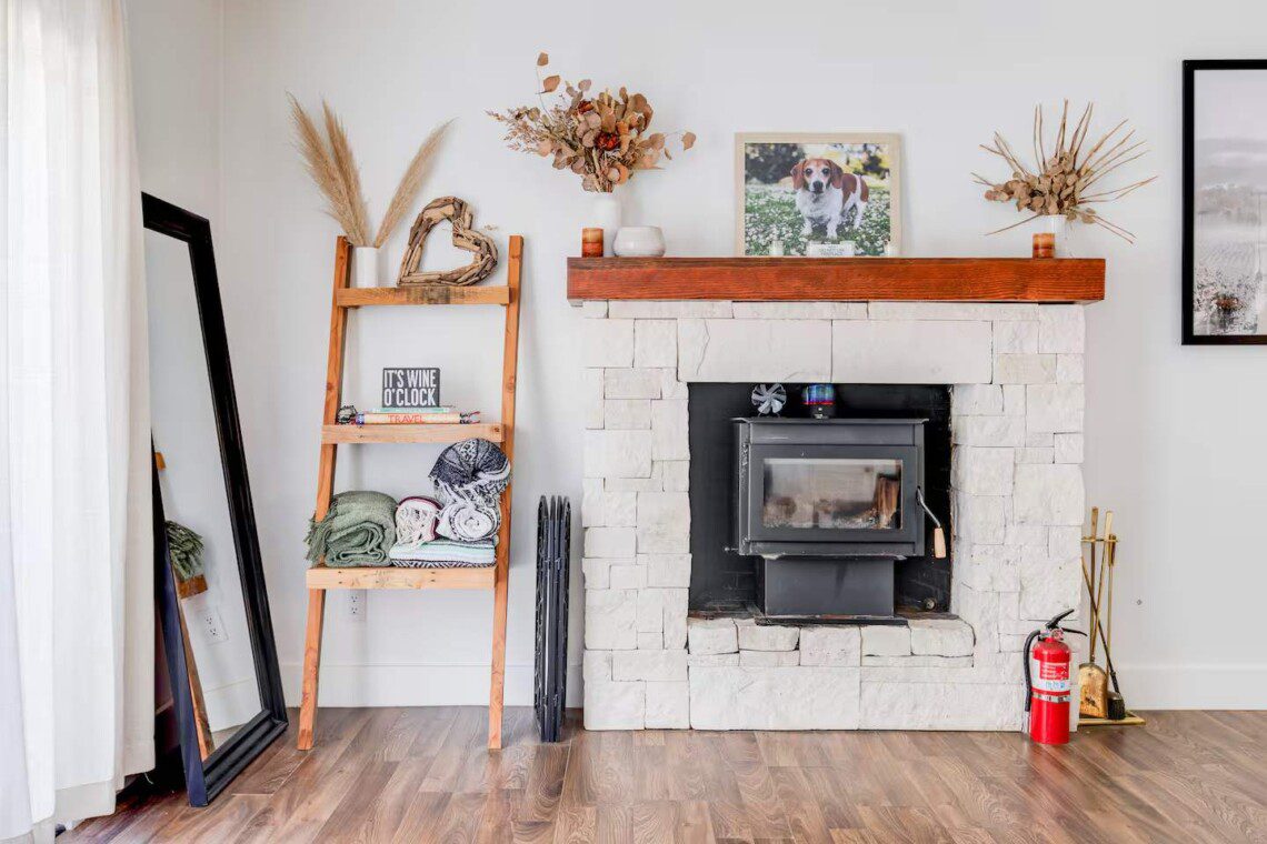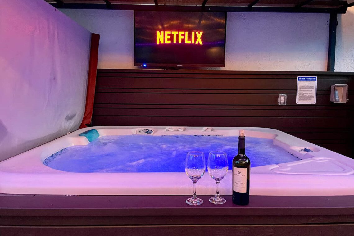 Outside you’ll find a private patio with ample seating, an outdoor dining table, a fire pit, BBQ grill, and a covered hot tub with a TV! It’s perfect for sipping wine under the stars or watching the ball game while soaking in the hot tub. The front portion of the backyard is newly landscaped, very spacious, and peaceful! The back part of the yard runs more natural and a little wild, adding to the charm.