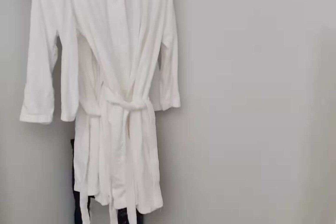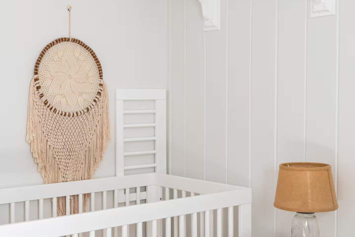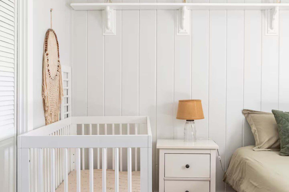 The third bedroom has a queen-sized bed, a bedside dresser, and a baby crib, making it a flexible space for families. Tastefully decorated with organic elements, this room is a breath of fresh air.
