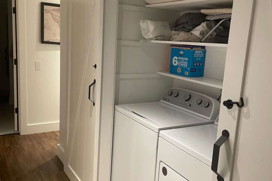 Laundry facilities are conveniently located in the hallway, featuring a full-sized washer and dryer, including free and clear detergents and scent-free softeners.