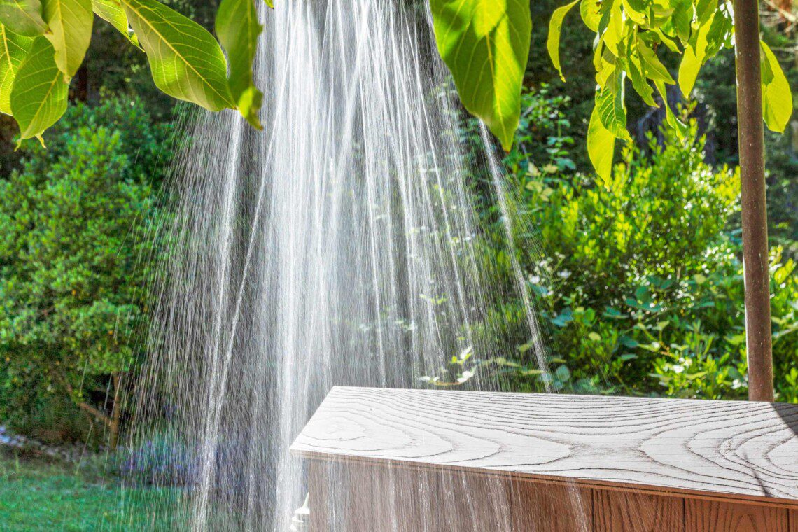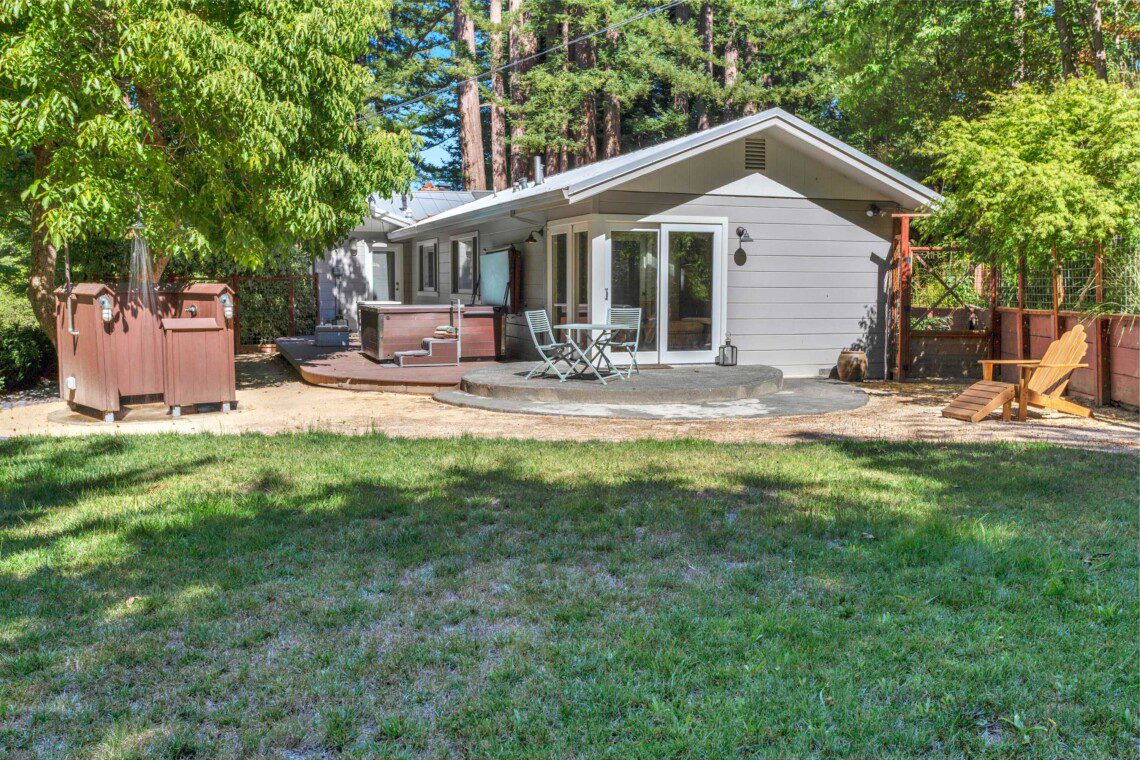 The property’s outdoor spaces are a true extension of the home. The main panoramic deck greets you upon arrival, offering an outdoor dining table for taking in the sunset. Just off the kitchen, you’ll find a dedicated deck with a propane BBQ and seating. The entire property is a 5-acre permaculture oasis, featuring an orchard, bee-friendly plants, and towering redwoods. The private backyard features a grassy lawn and a secluded hot tub, complemented by an outdoor shower and a comfortable couch. Benches and tables are thoughtfully placed along the property’s pathways, ensuring you will always find a perfect spot to relax and take in the scenery.