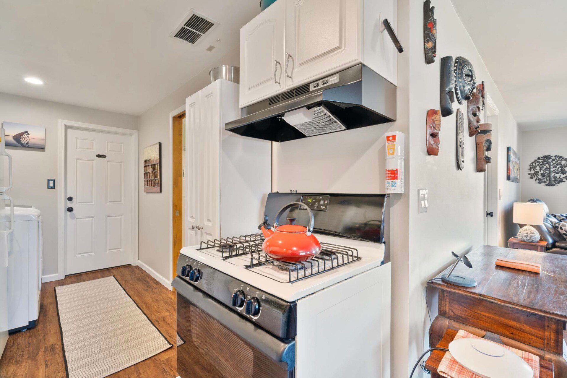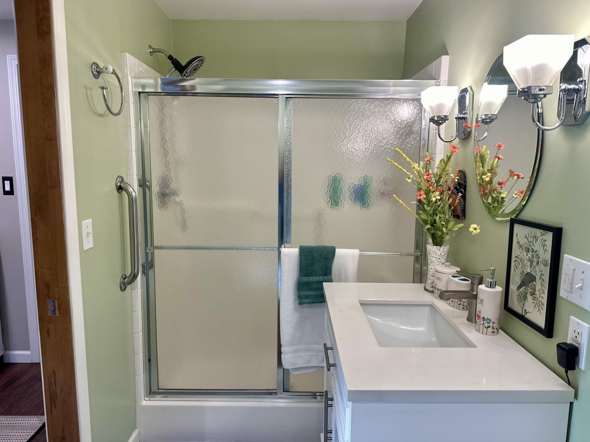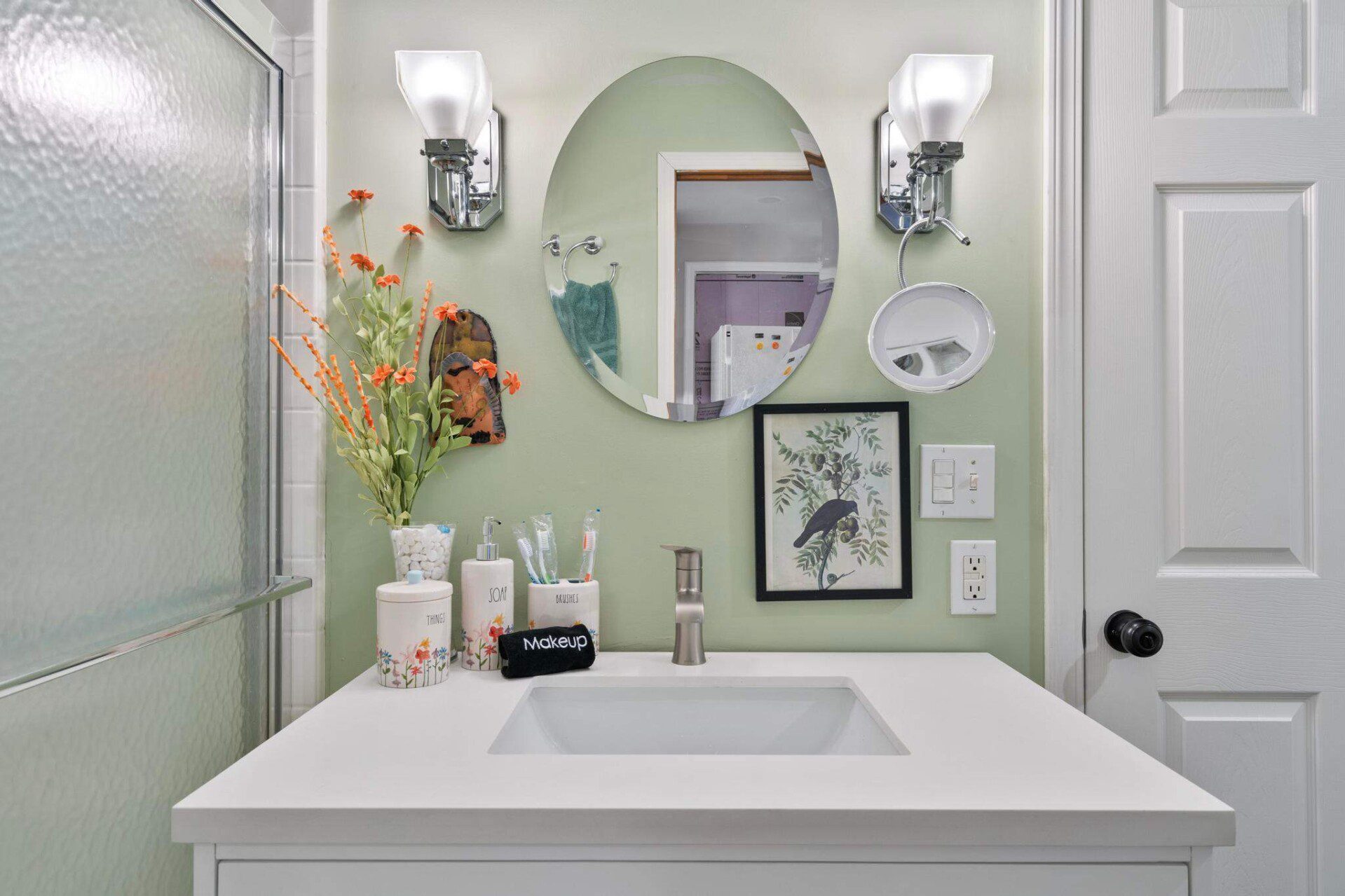 The generously sized bathroom with a walk-in shower is accessible from both the kitchen and the main bedroom. Additionally, the washer and dryer off the kitchen ensures that guests planning longer stays or needing fresh attire can pack lightly.