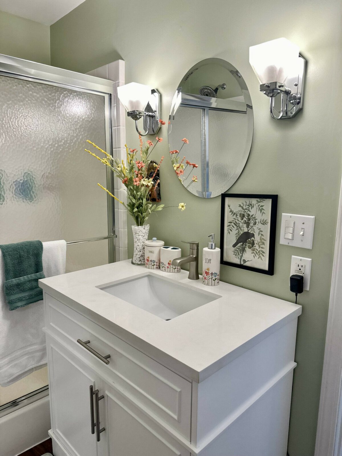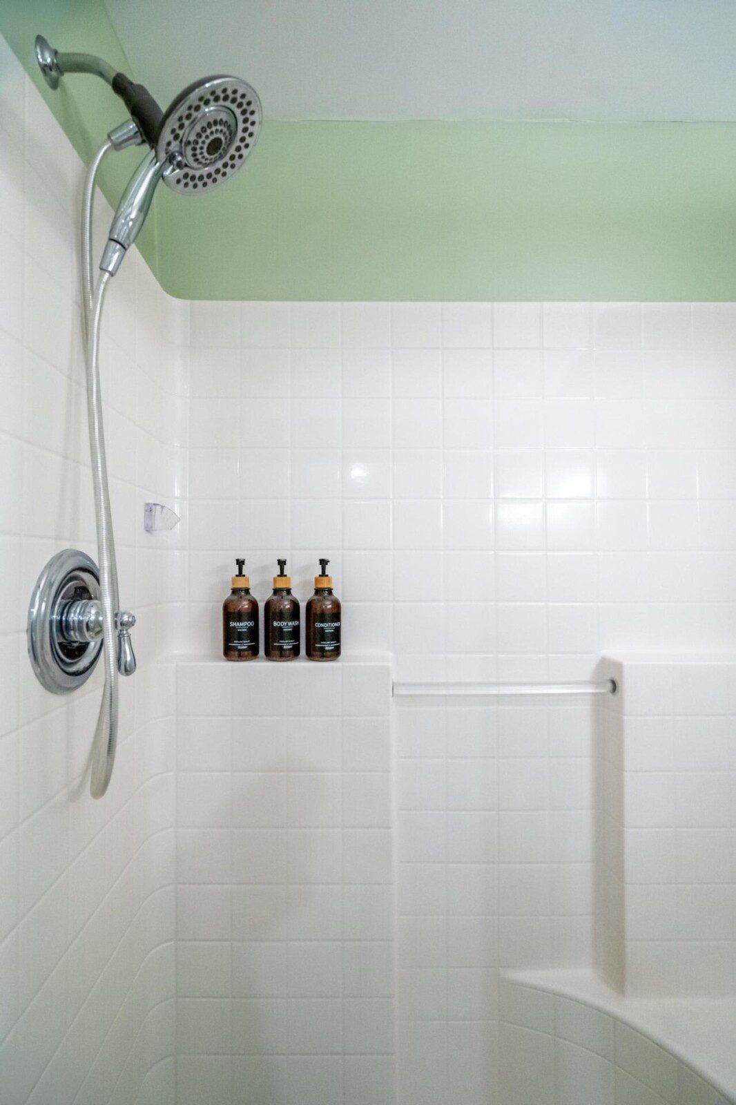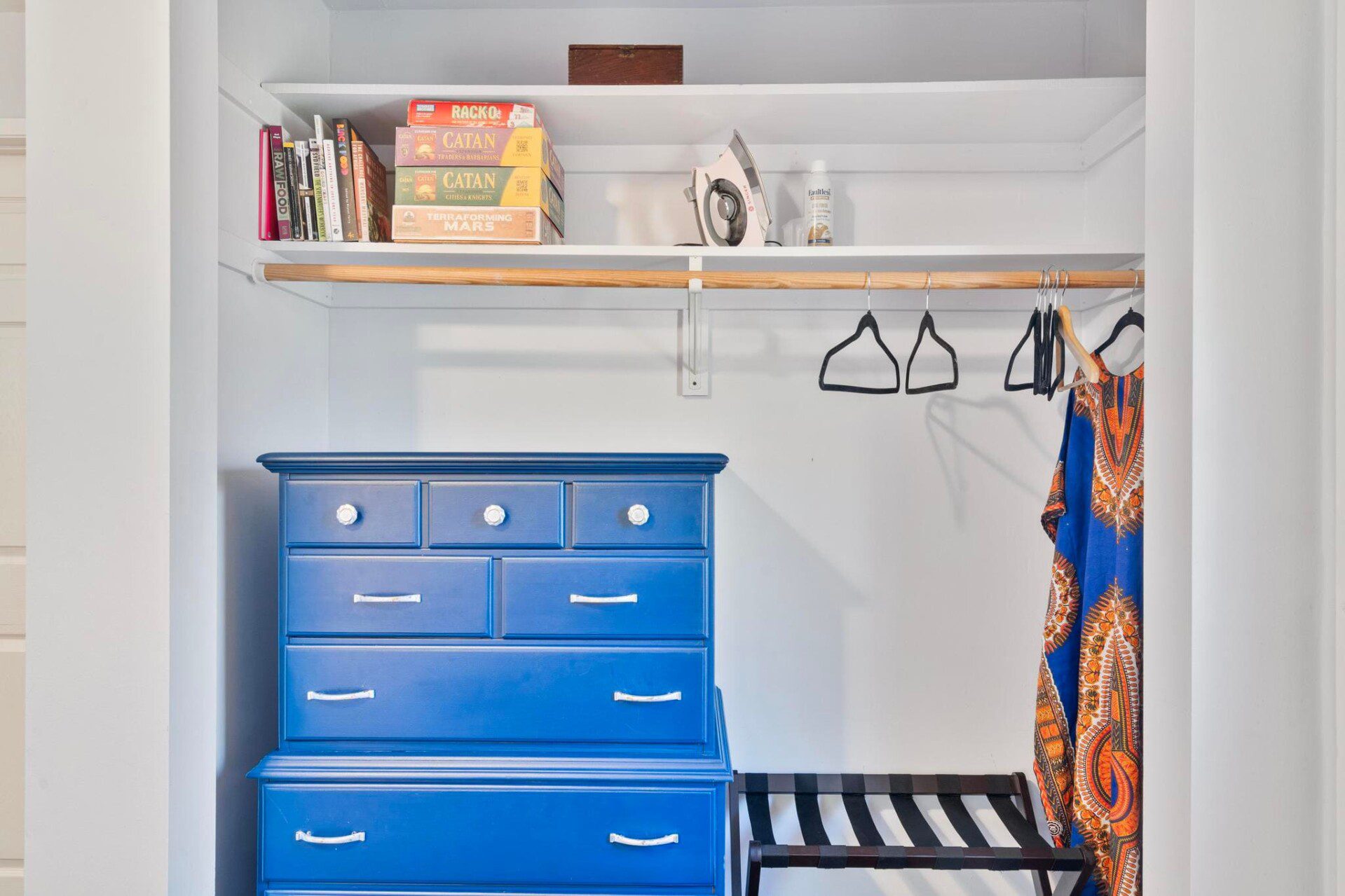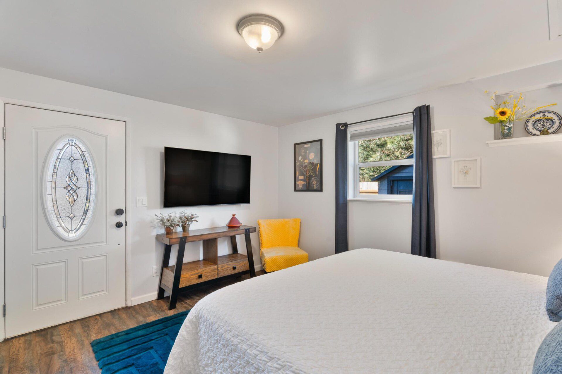 The generously sized bathroom with a walk-in shower is accessible from both the kitchen and the main bedroom. Additionally, the washer and dryer off the kitchen ensures that guests planning longer stays or needing fresh attire can pack lightly.