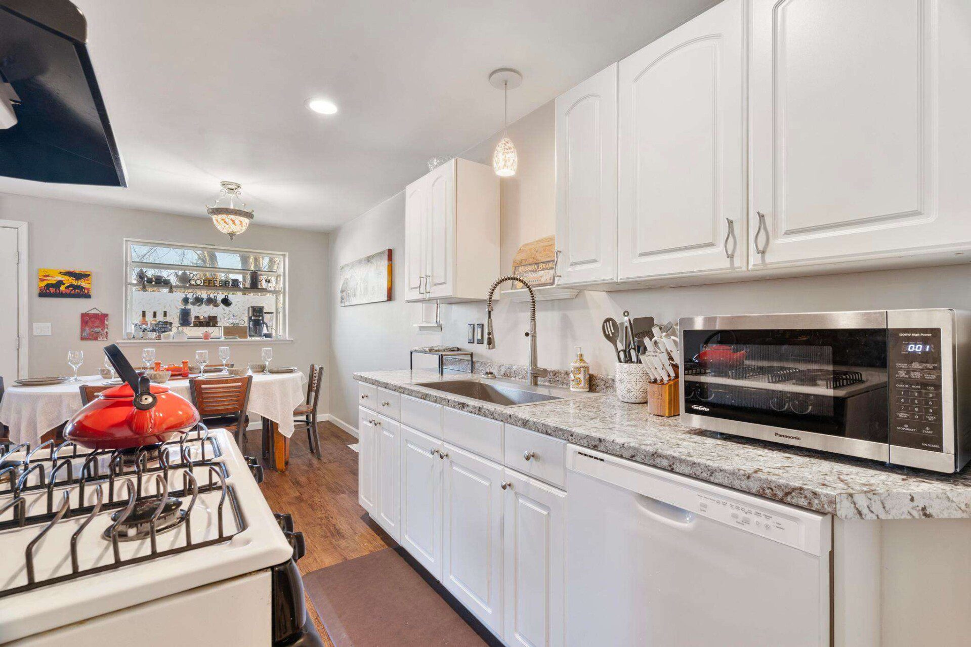 Adjacent to the living room, the dining area provides a welcoming space to host friends or family, with a table that seats six. The journey continues into the kitchen, where every inch of this cozy space is maximized to offer all the amenities needed for preparing delightful meals or baking treats, ensuring culinary enthusiasts are well catered for.