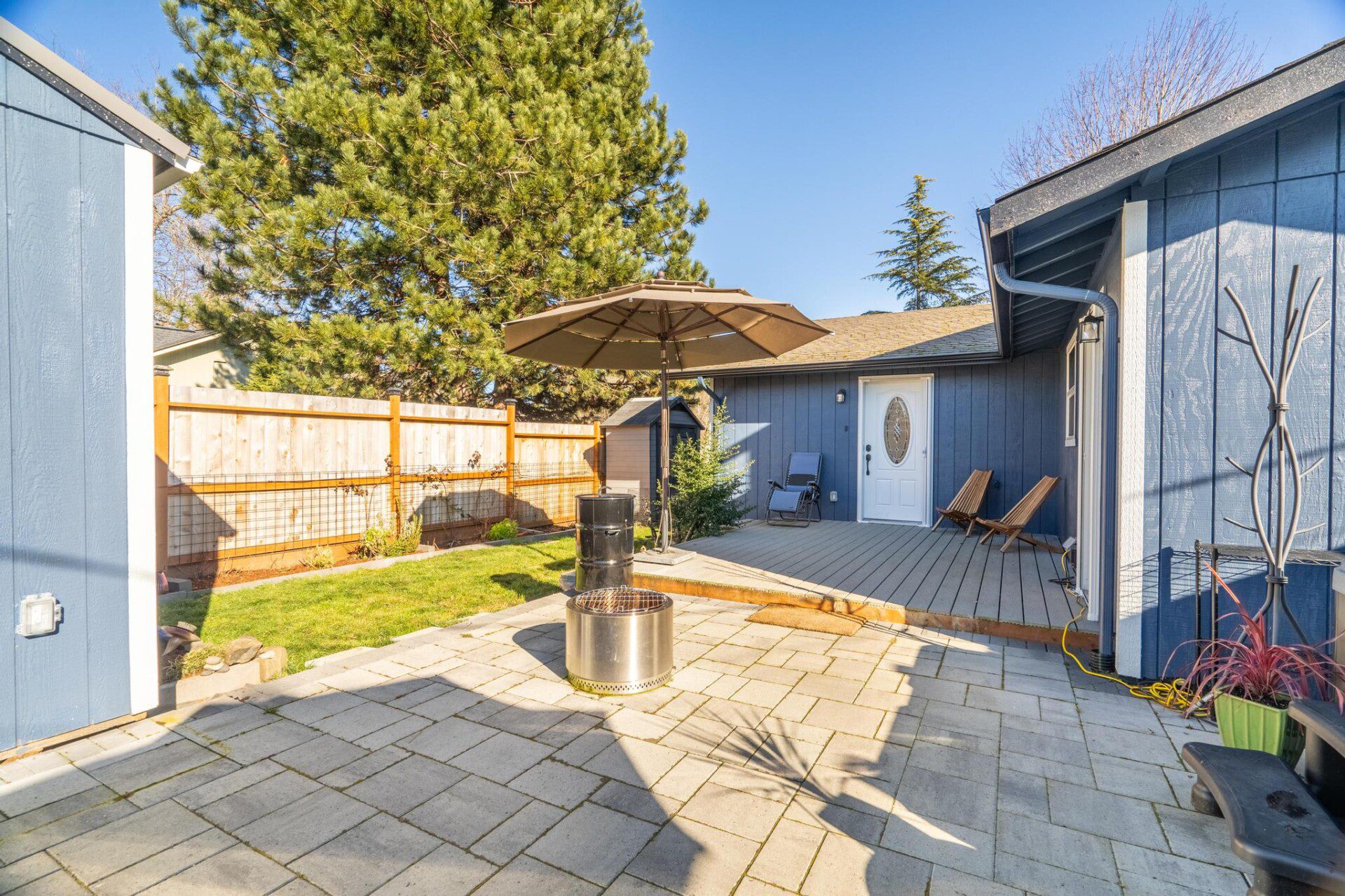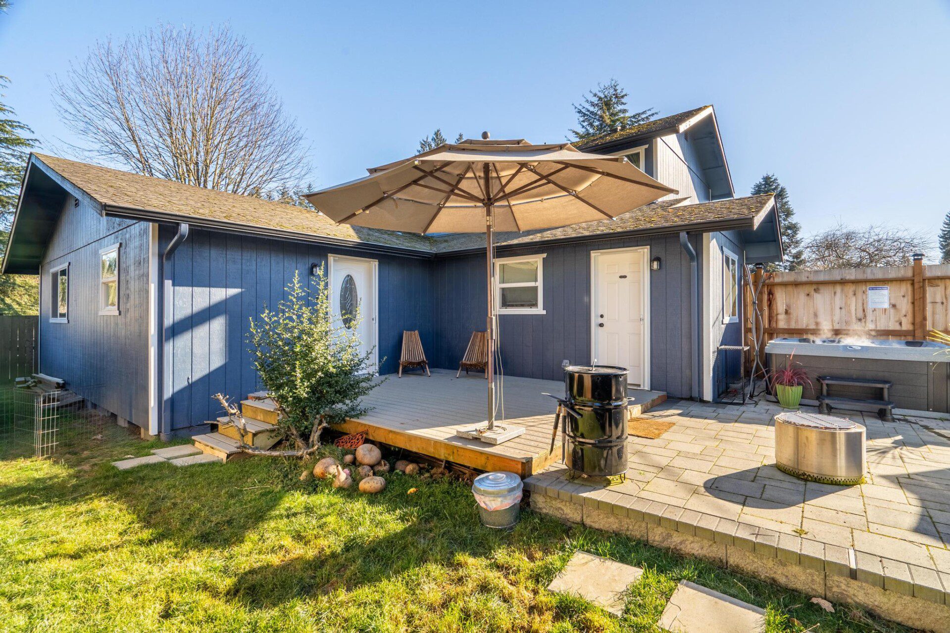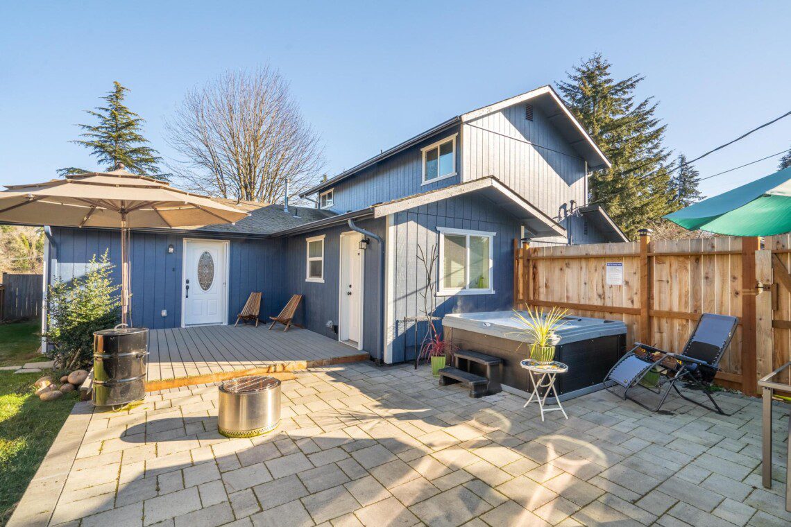 Welcome to your home away from home, where comfort meets convenience. As you enter the space, the private stone patio immediately sets the tone for your stay, presenting an inviting hot tub that promises relaxing moments ahead. The patio also houses an outdoor dining table and a cozy fire pit, surrounded by a selection of umbrellas for shade on sunny days, crafting the perfect ambiance for al fresco dining or your morning coffee in your secluded yard.