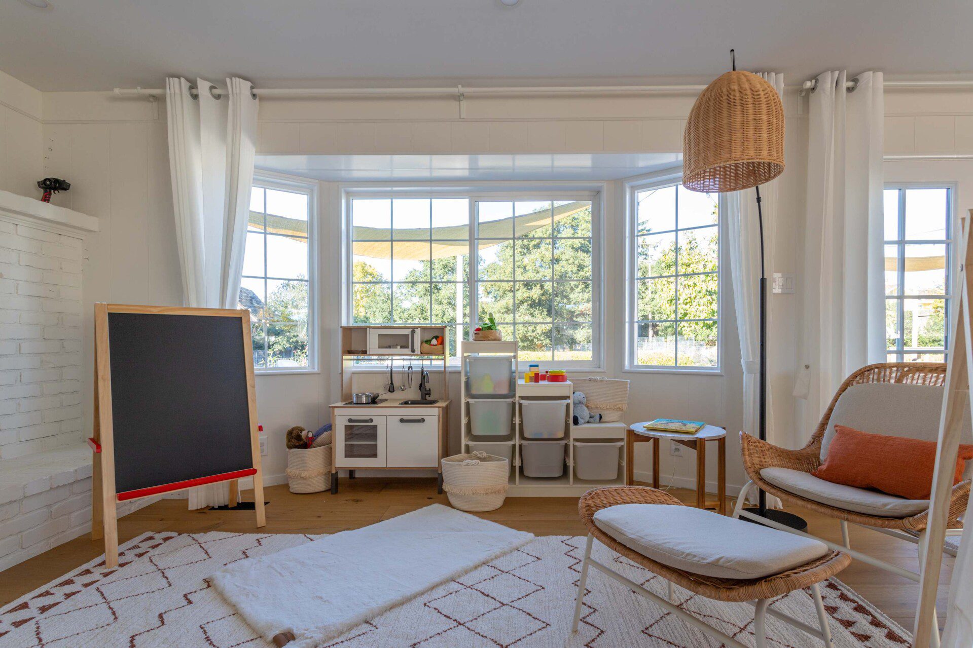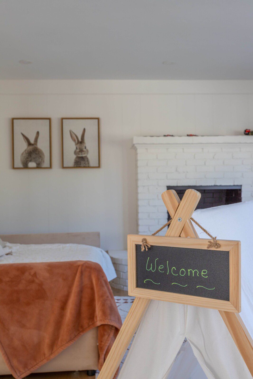 Upon stepping into the home, you’re immediately welcomed by the warmth of the living room. This area is divided into two inviting spaces — one side features a TV, coffee table and a super comfortable couch, where you can kick back and enjoy your favorite shows. On the other side, you’ll find a full-sized (double) daybed with a twin trundle next to the fireplace. This side of the living room also features an interactive play-zone designed for young children. You’ll love the reading chair where you can snuggle up with a book while watching the flickering candles in the fireplace.