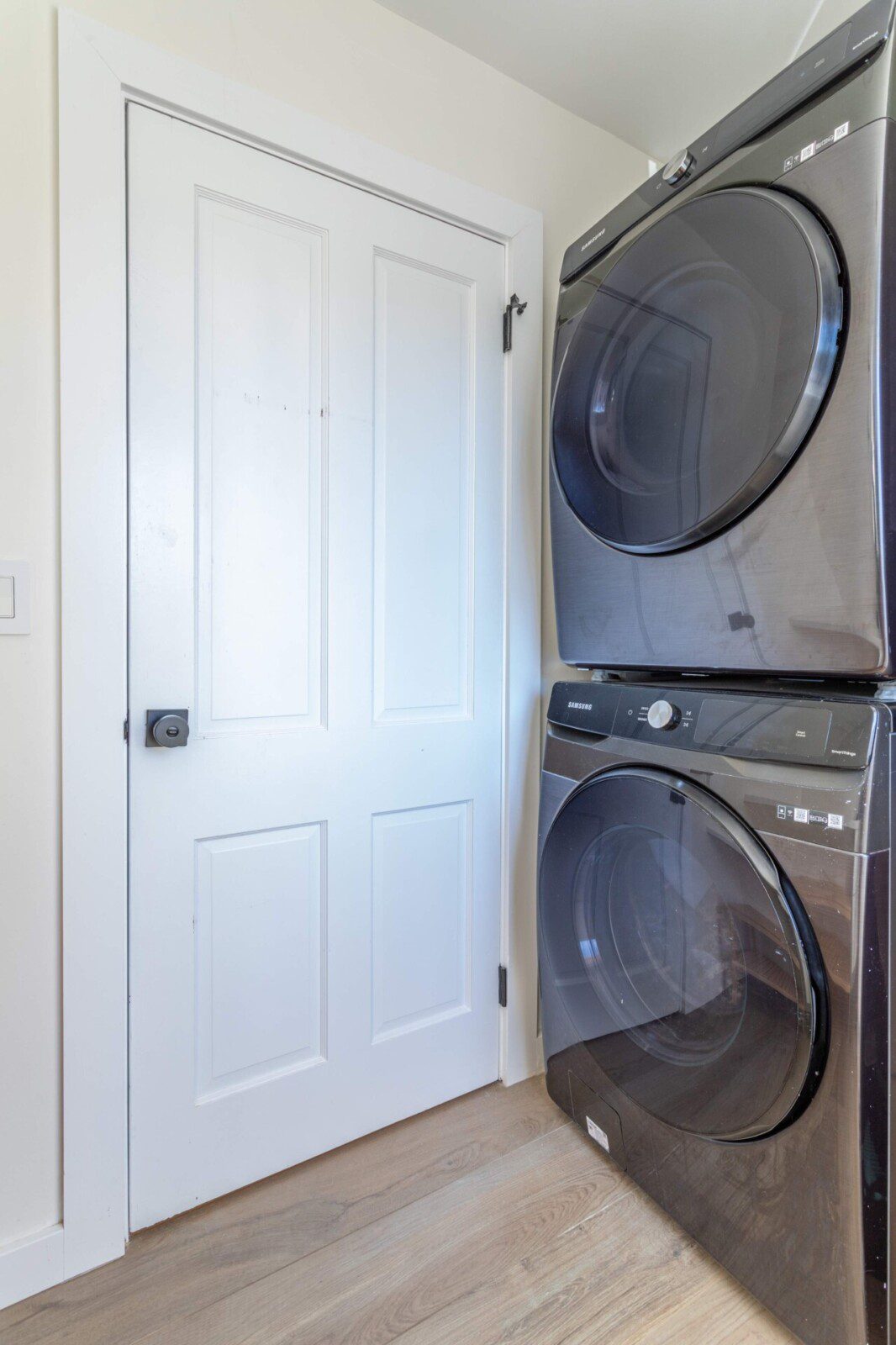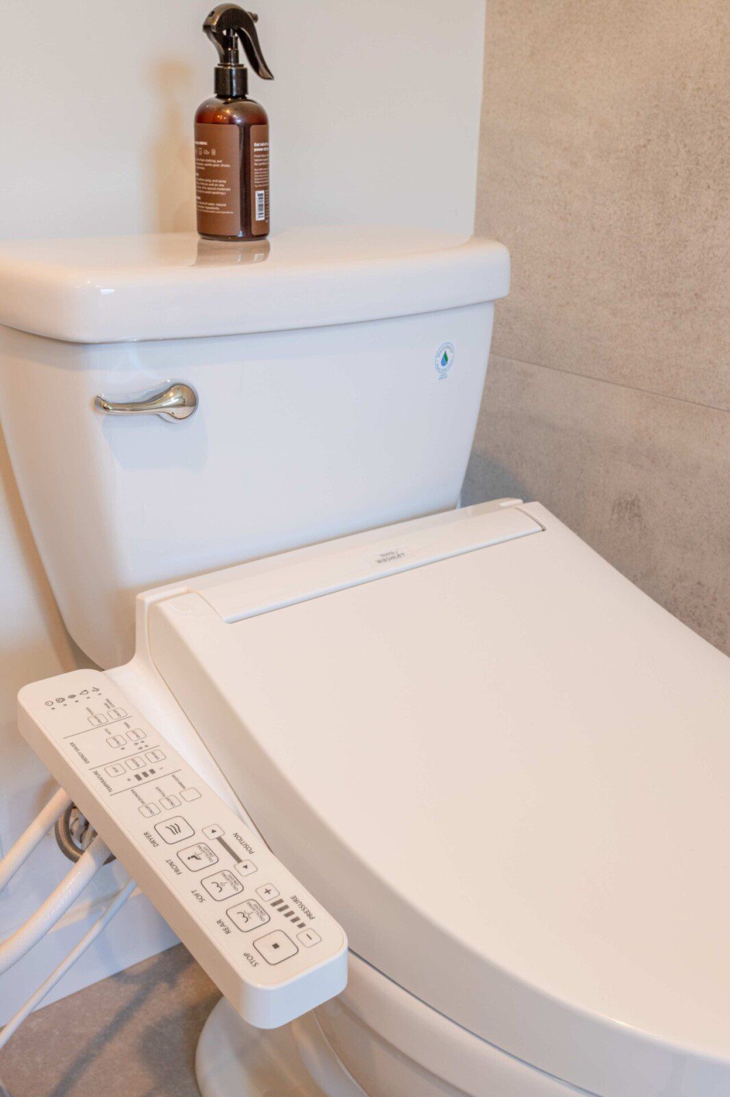 The main bathroom offers a deep, luxurious bathtub, a spa-like shower, double sinks, and another bidet-equipped toilet. Here you’ll find the perfect setting for refreshing after a day of exploring. For added convenience, there’s an additional half-bathroom and a laundry room available for guests.