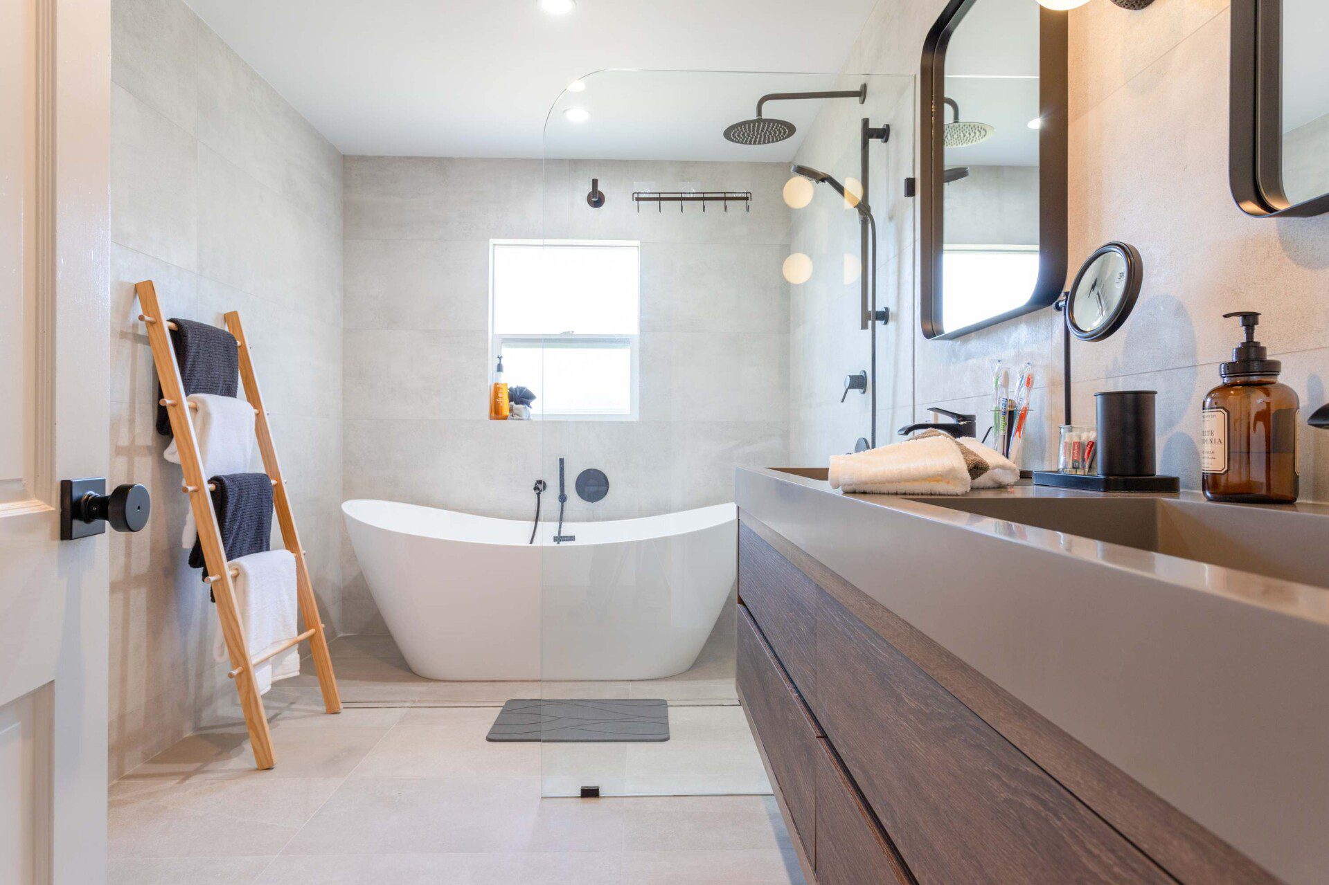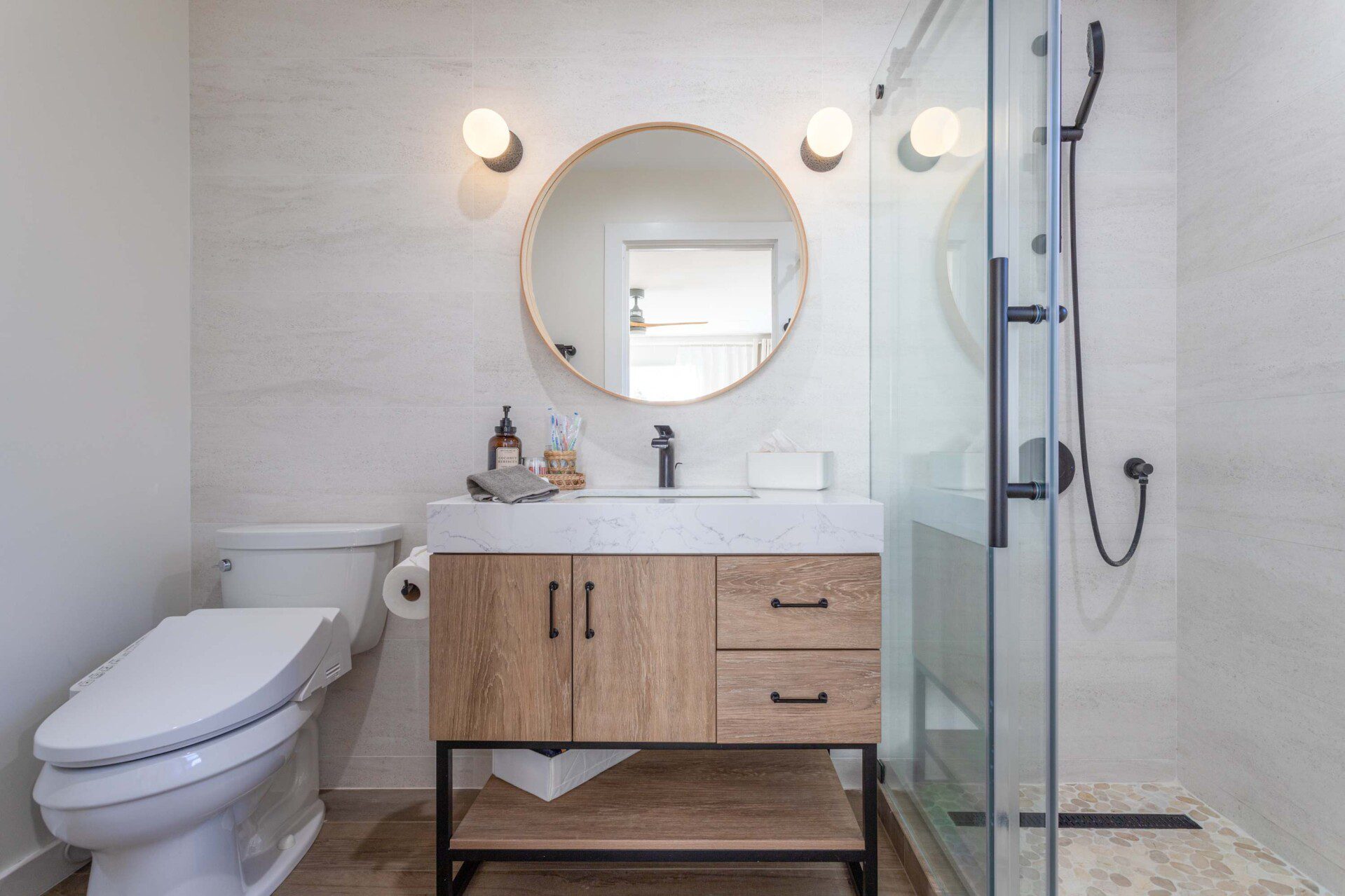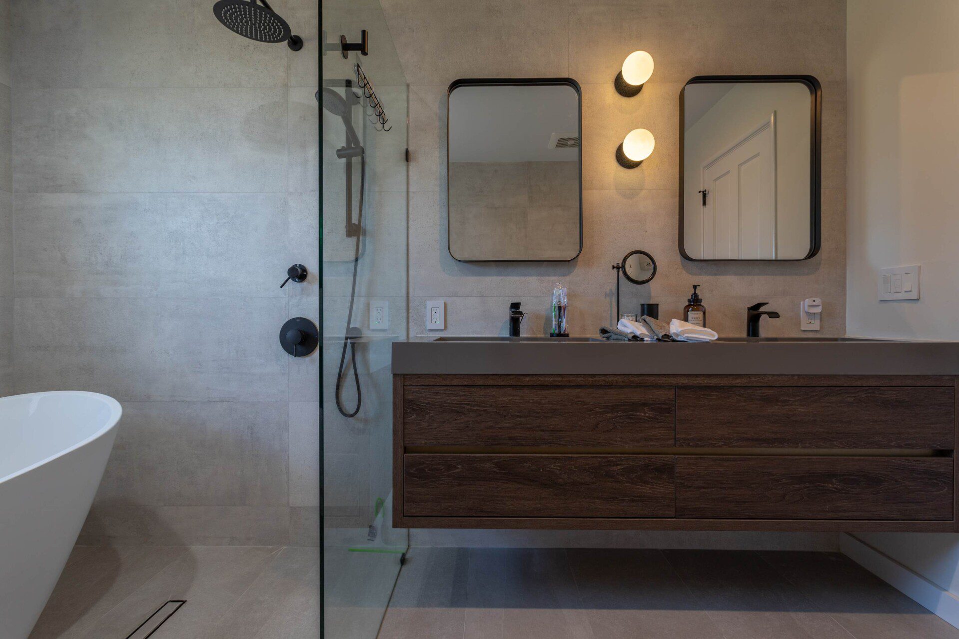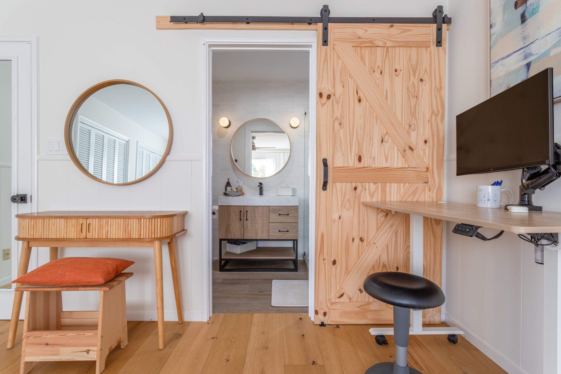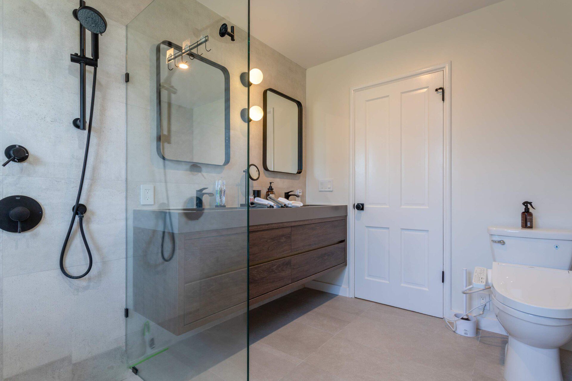 As you walk down the hall, you’ll find two inviting bedrooms, each with a king-sized bed. The master bedroom is a true retreat, featuring a vanity, an adjustable workspace, and an ensuite bathroom designed for relaxation, complete with a luxurious shower, bidet-equipped toilet, and plush linens. The second bedroom also offers a king-sized bed, a dedicated desk for remote work, and direct access to the patio, garden, and hot tub.