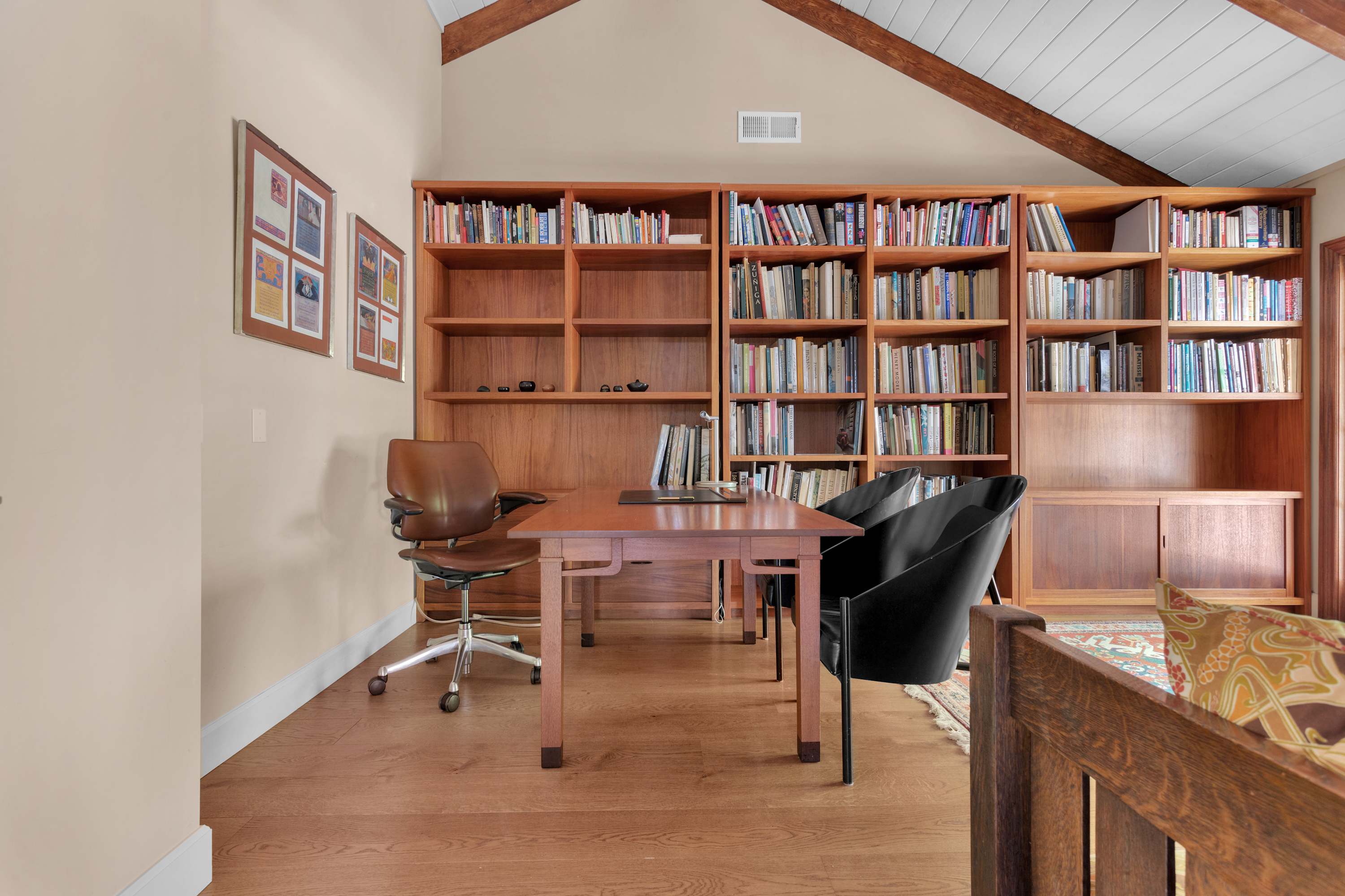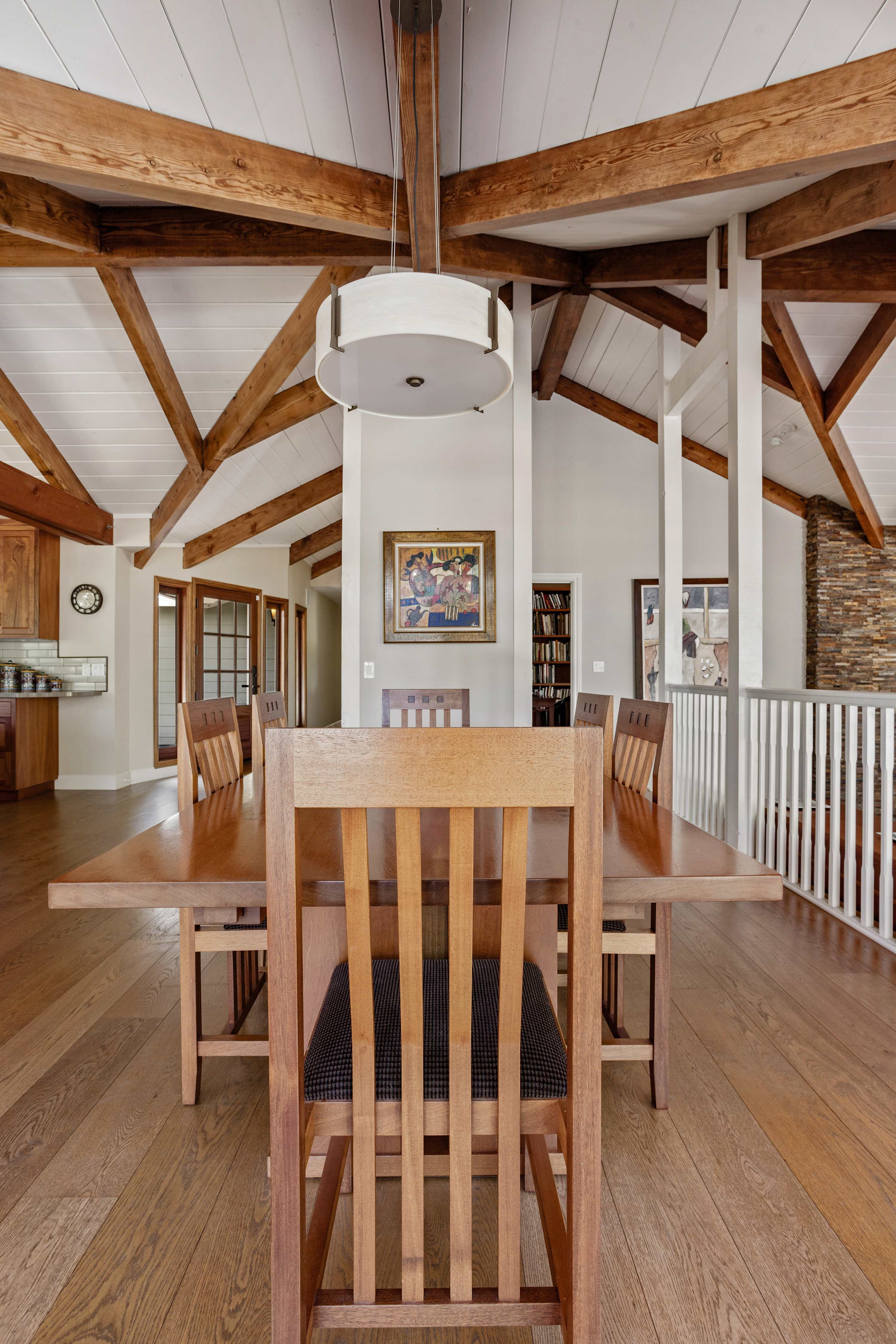 The gourmet kitchen is a chef’s dream, equipped with high-end appliances, including a Wolf range, and offering sweeping views of the landscape. A formal dining room connects the kitchen to a spacious deck, perfect for indoor-outdoor living. The separate office, complete with its own fireplace and a library of books, offers a quiet space for reading or work and also features private doors to the backyard.