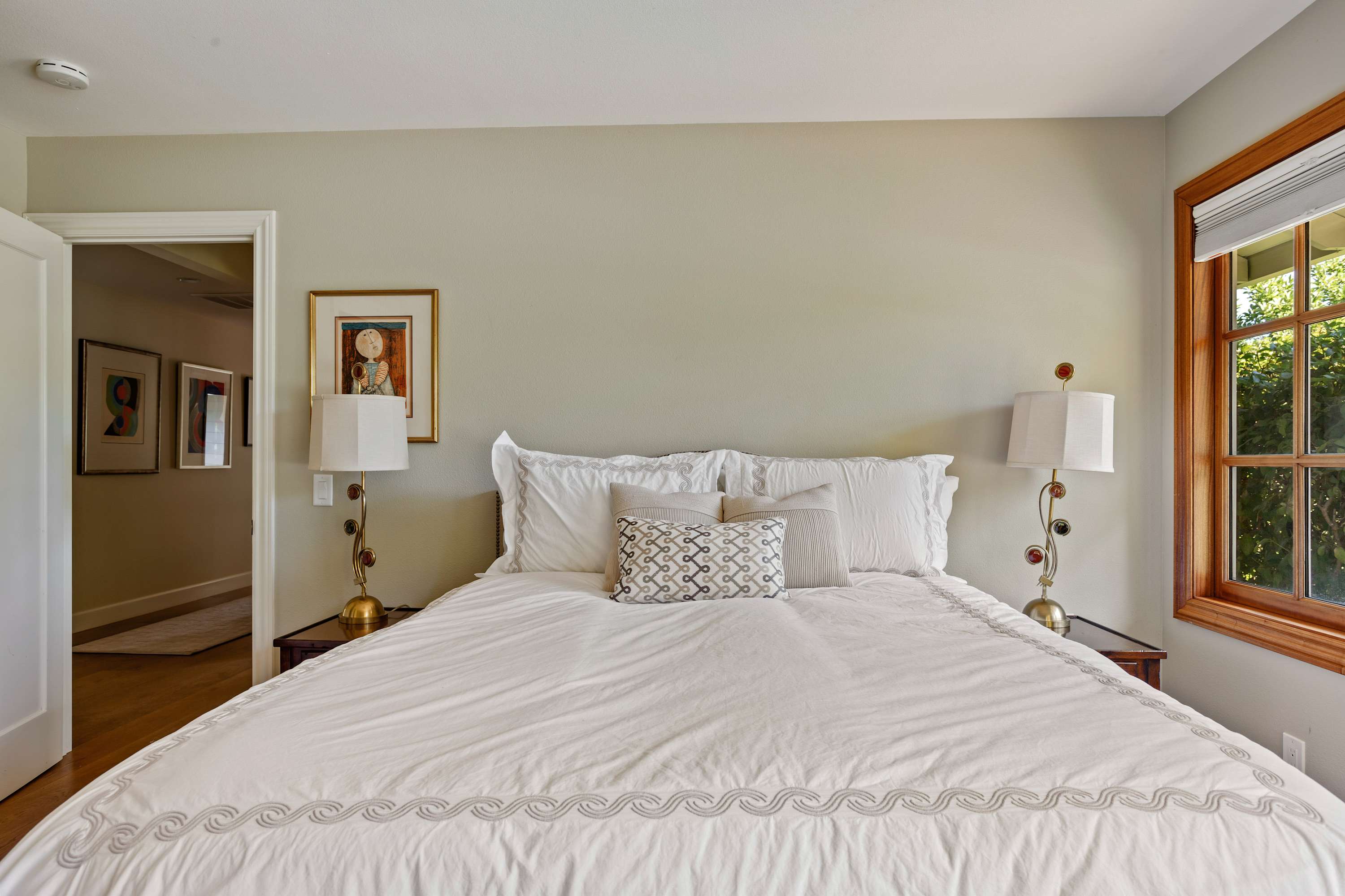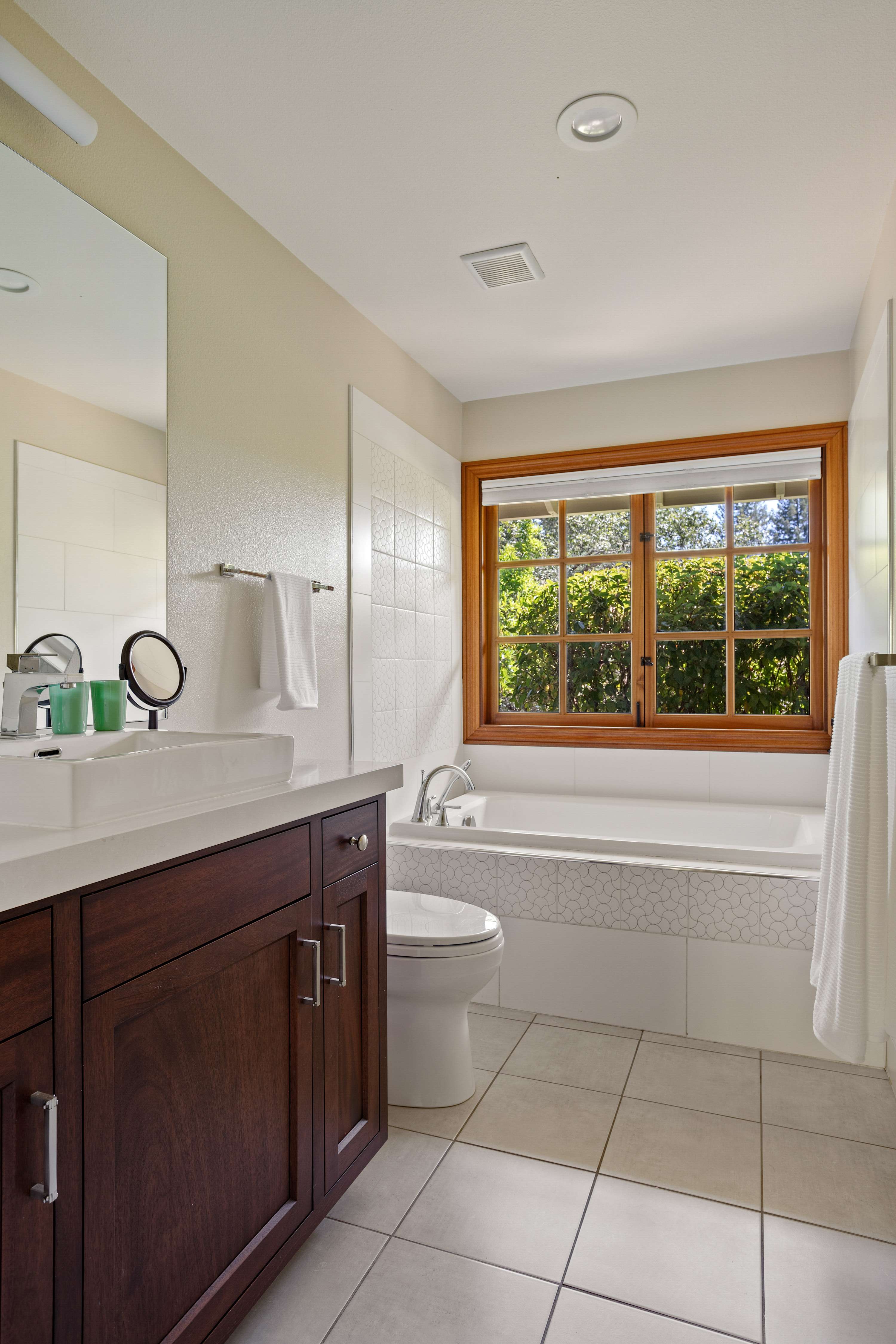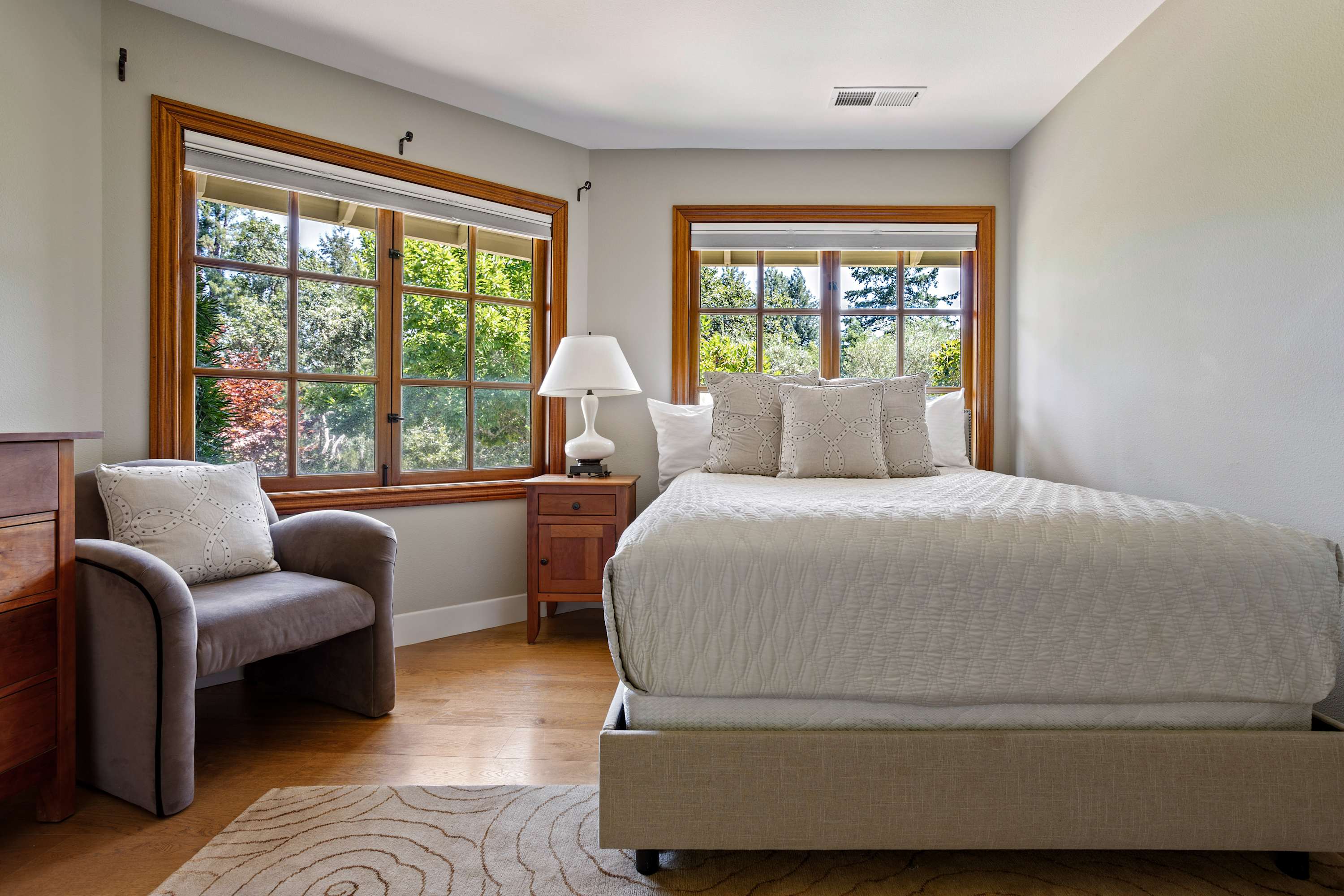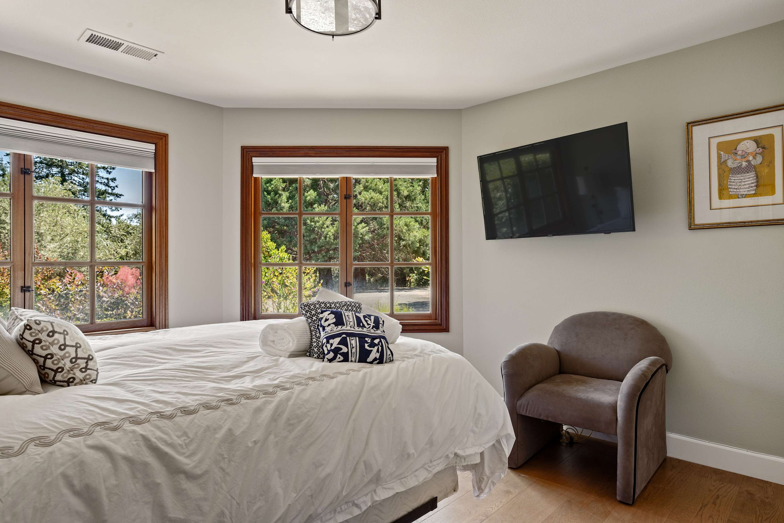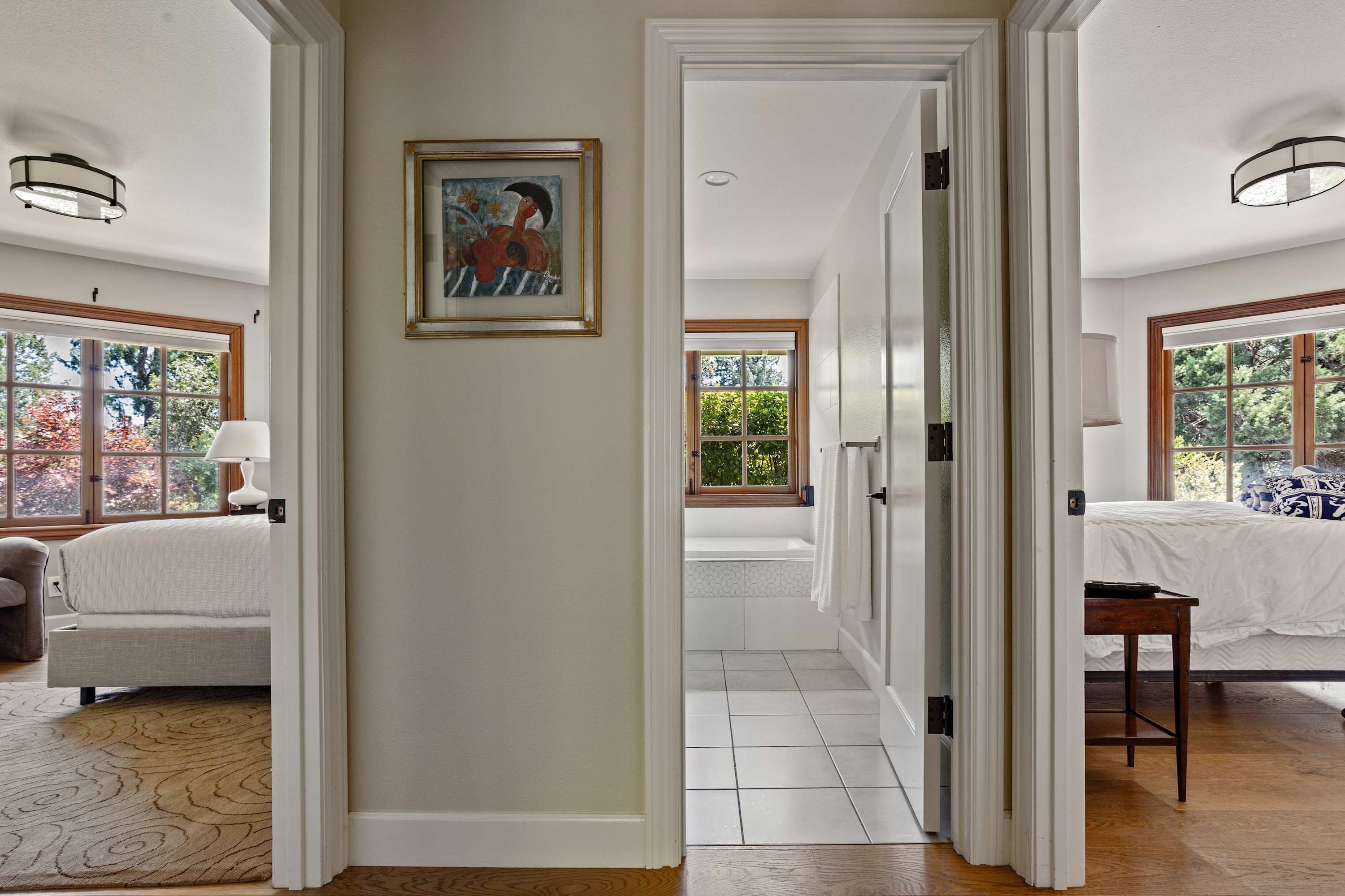 Jack and Jill Bedrooms: Each furnished with a queen bed and its own TV. Both rooms offer lovely views of the beautifully landscaped front yard and share a well-appointed bathroom that features a tub with shower wand.