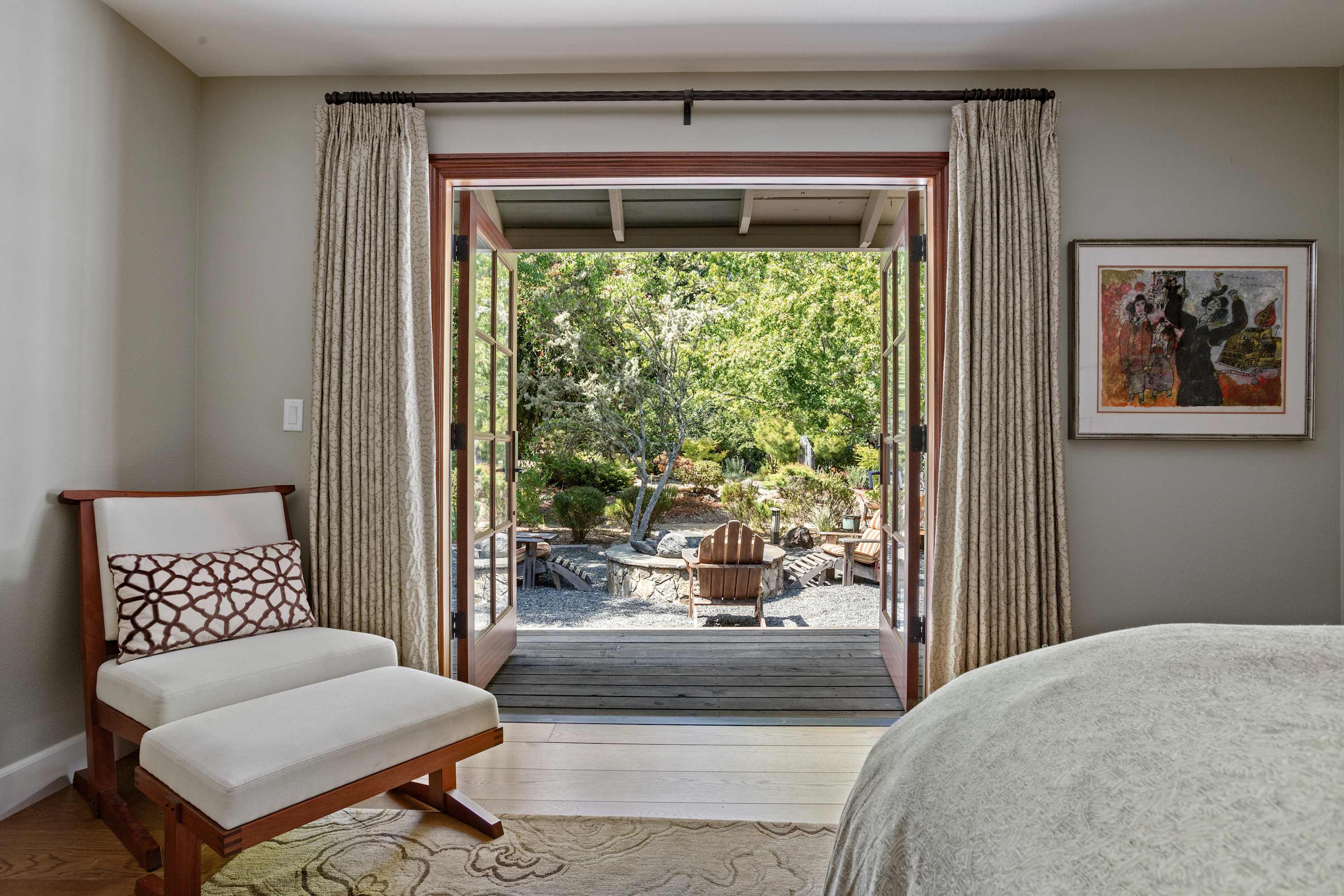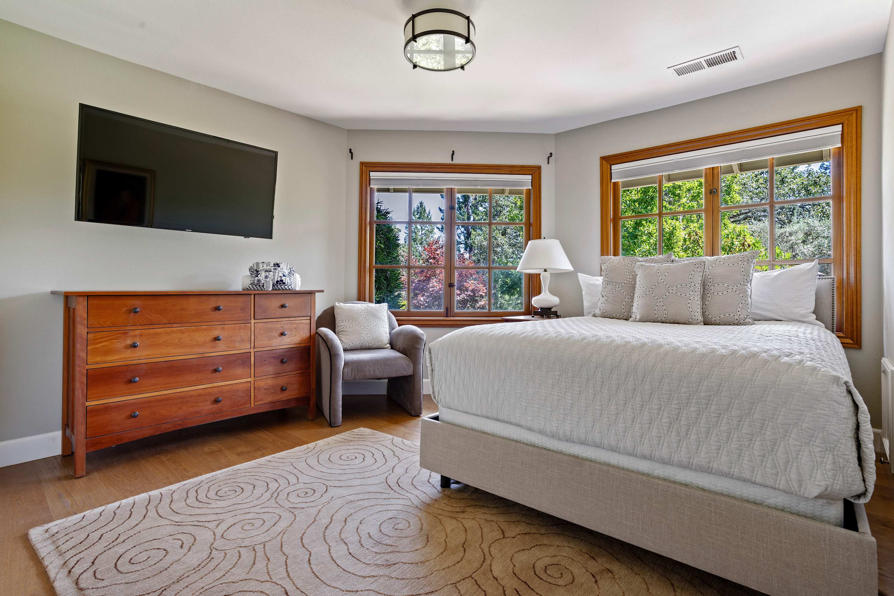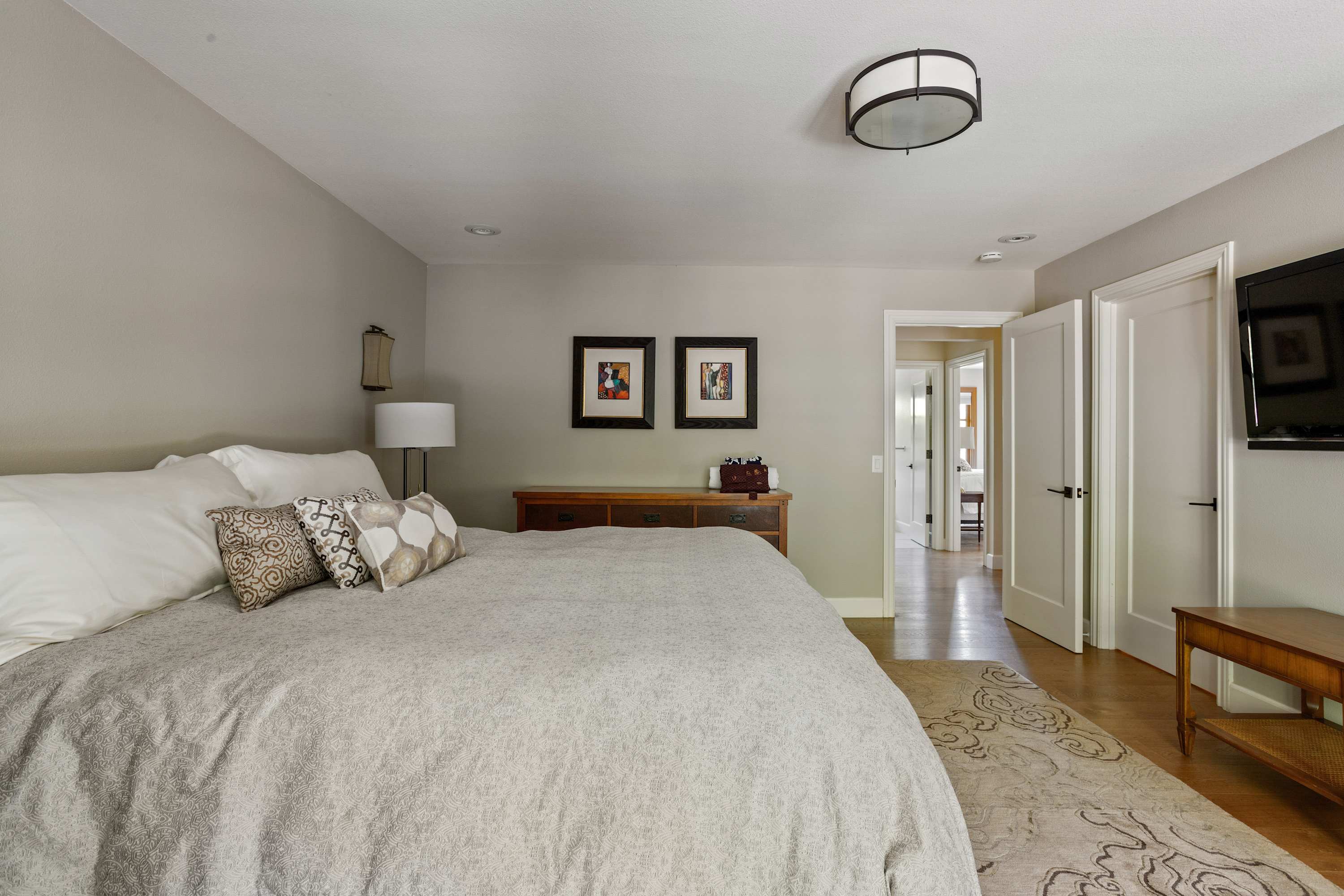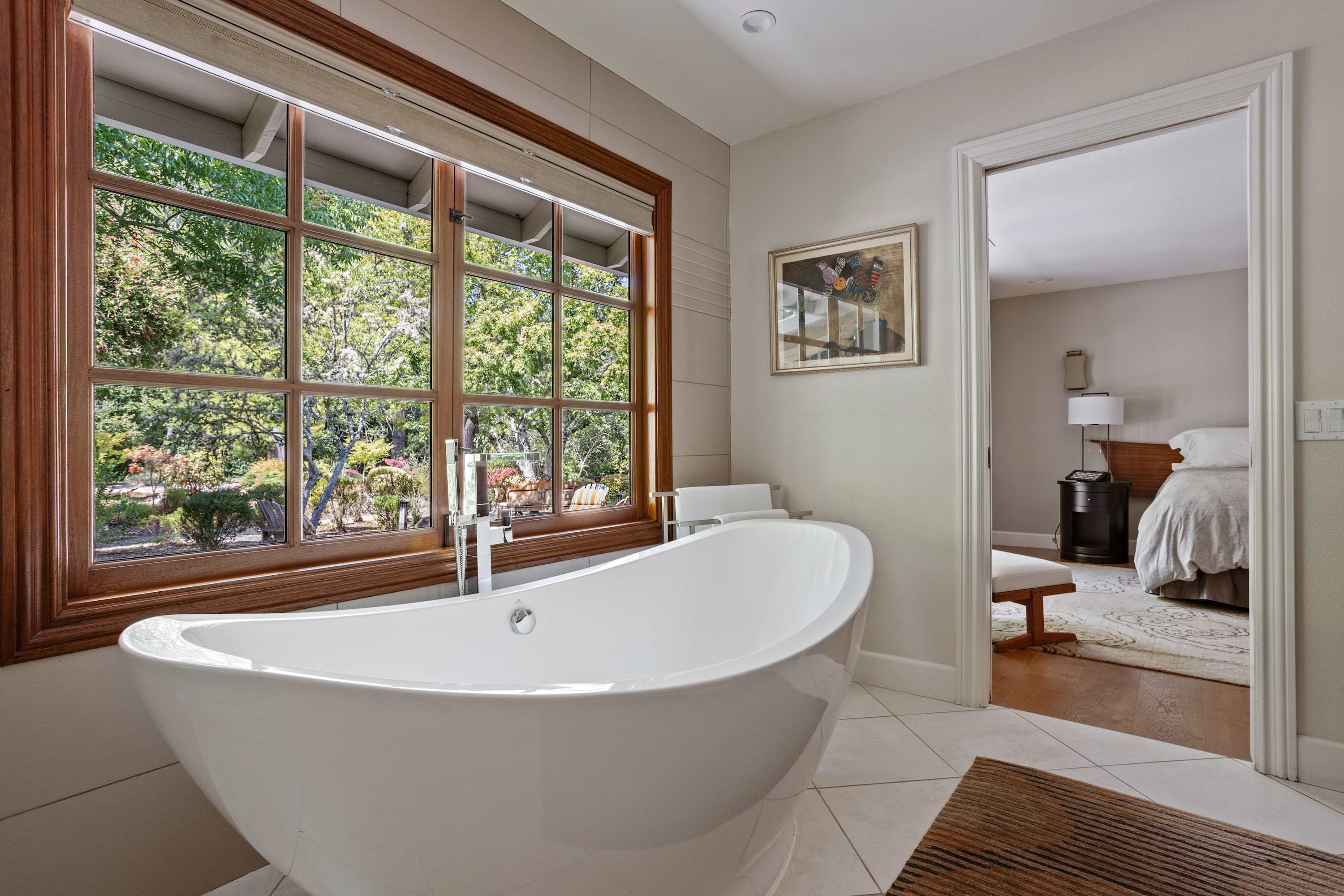The primary suite offers a luxurious king-sized bed with high quality linens, a TV, and double doors that open to the backyard with breathtaking views of the pond and the teahouse. The ensuite bathroom is a spa-like experience with a deep soaking tub, separate shower, double sinks, and a private toilet room.