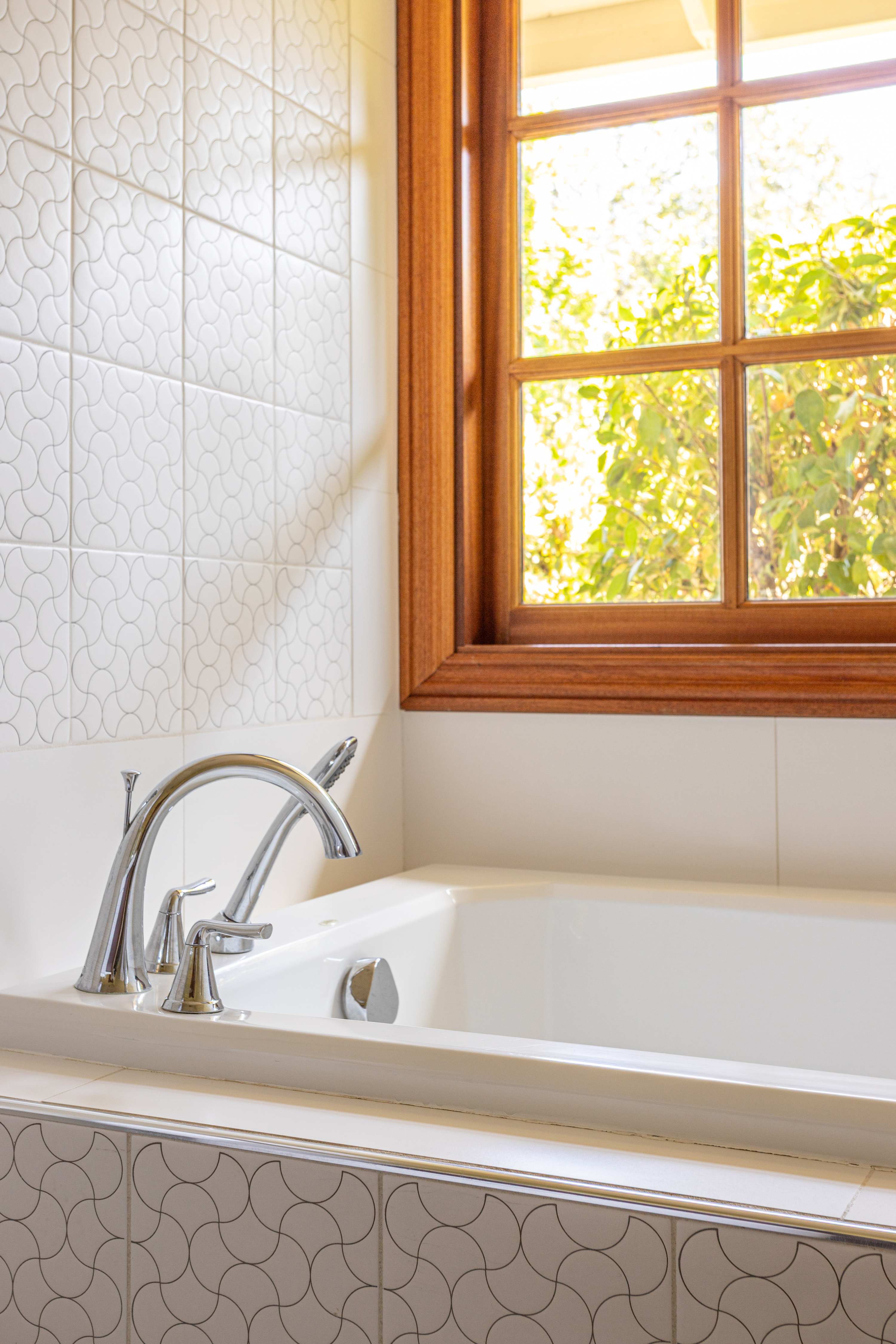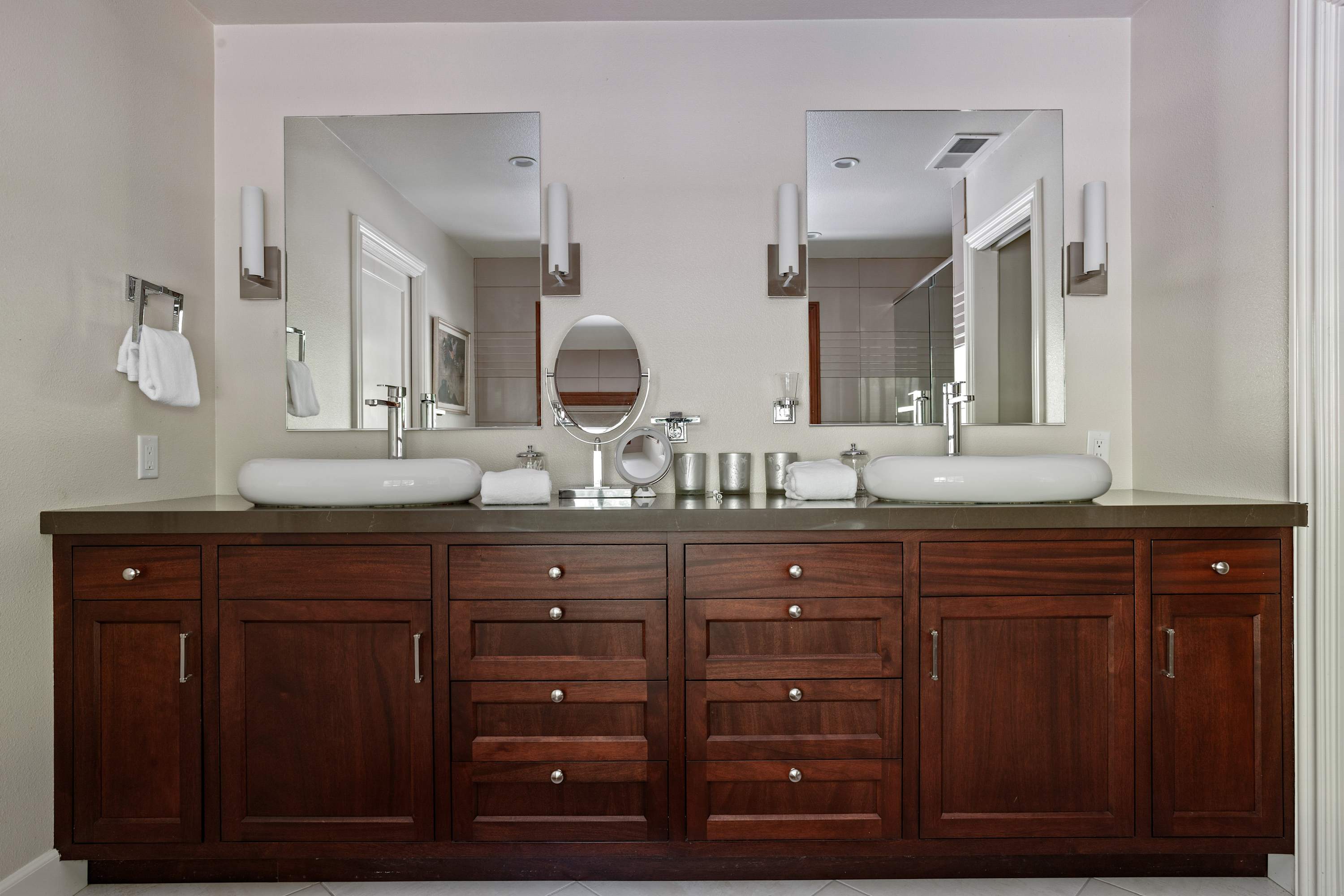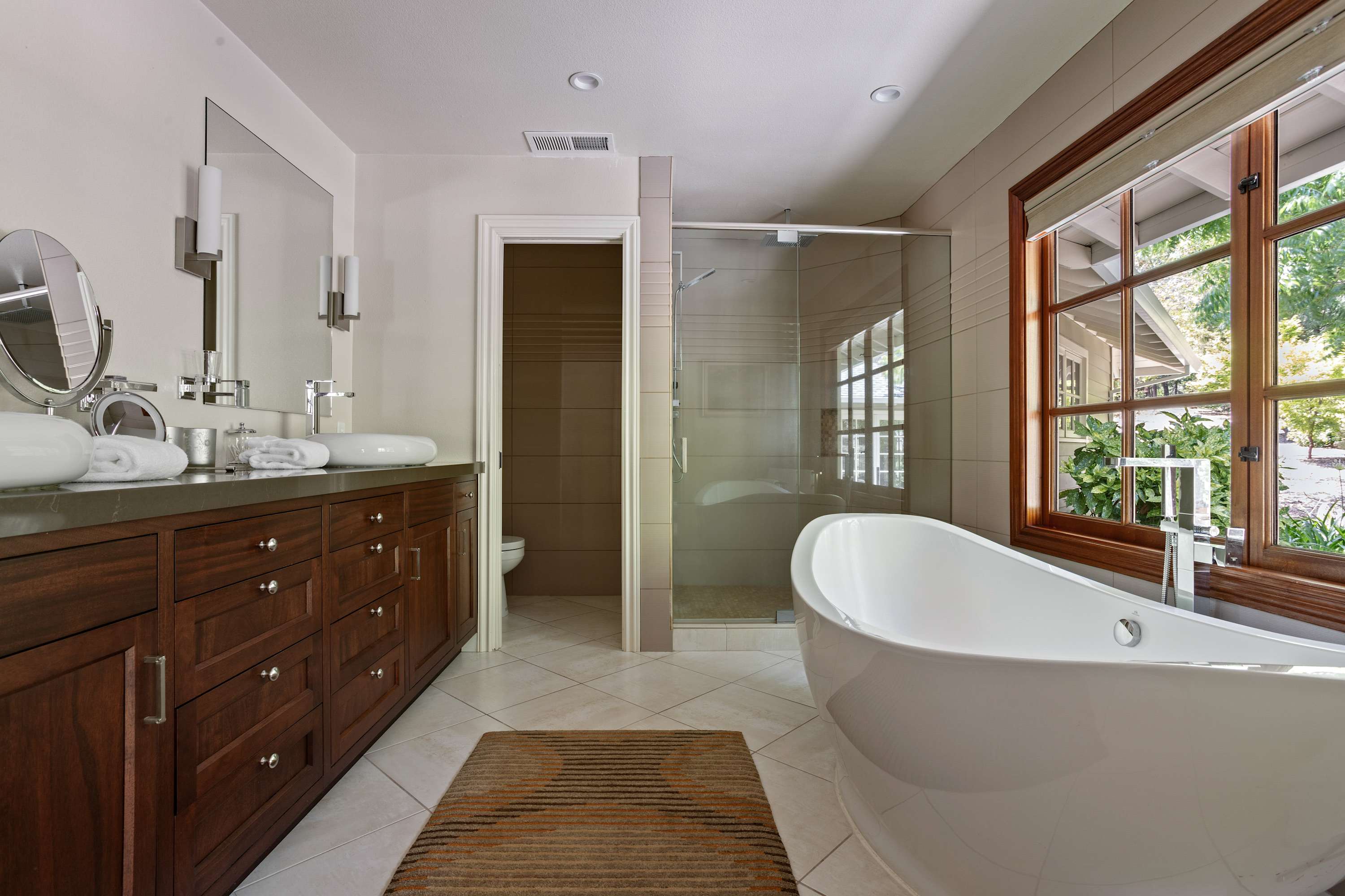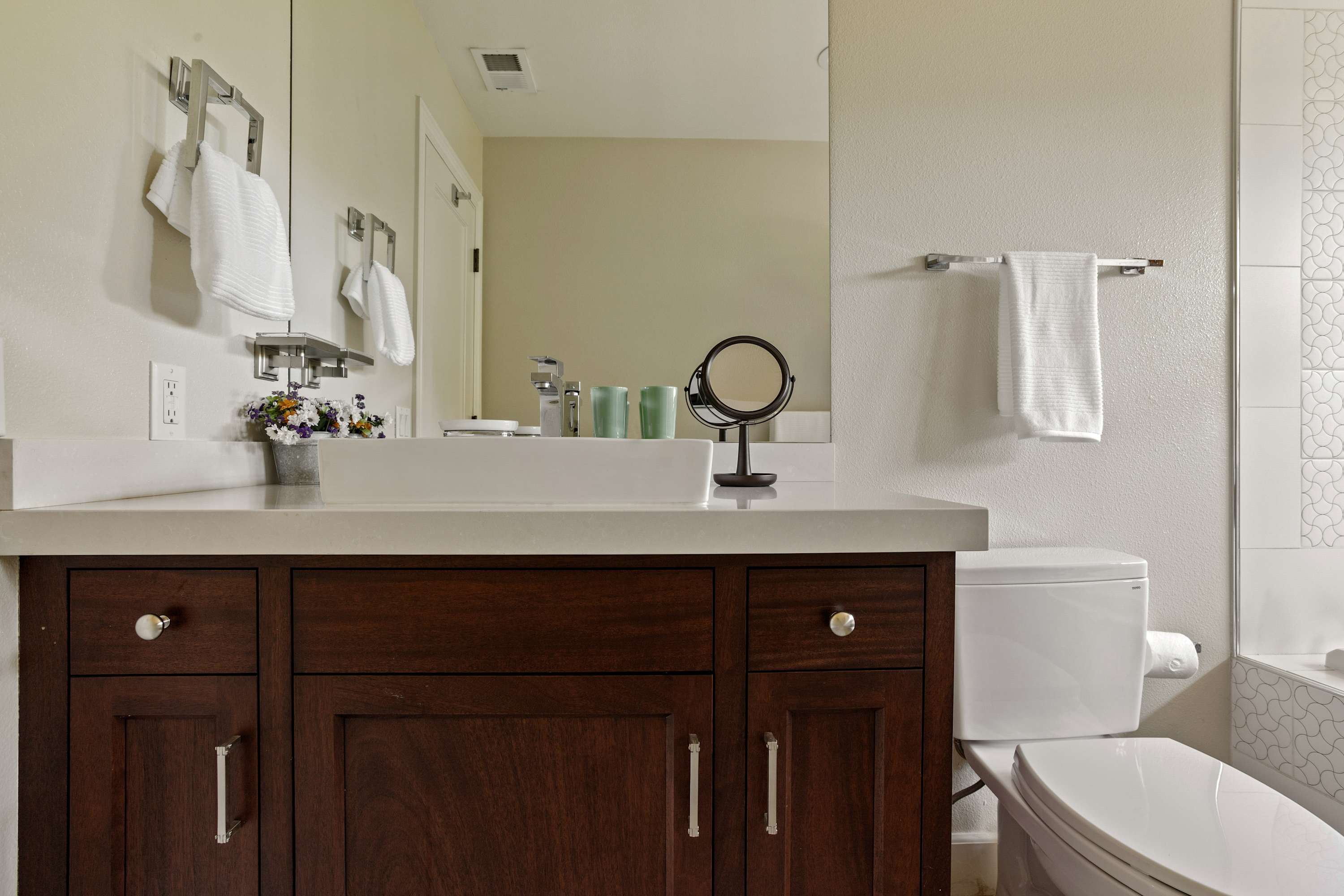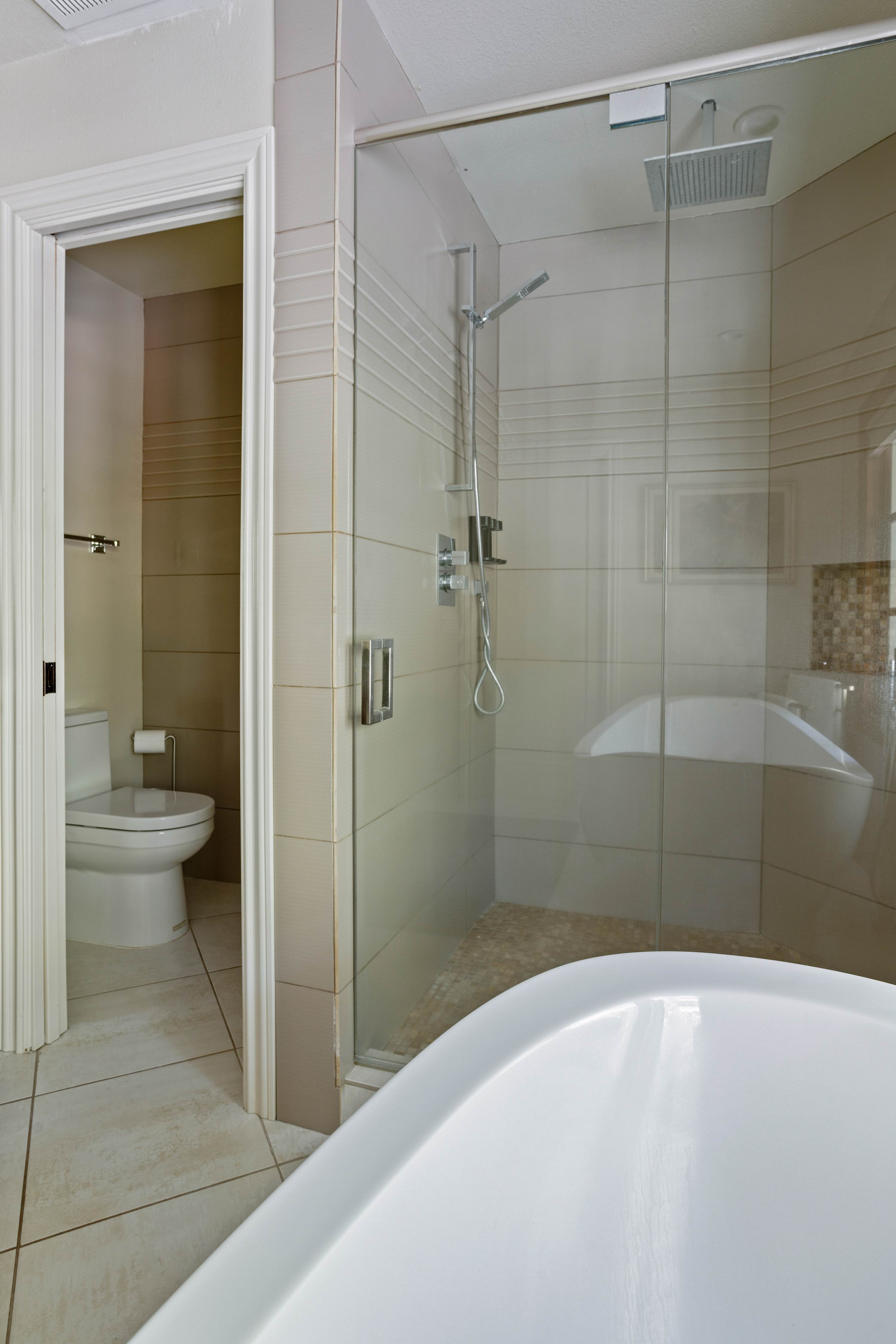 The primary suite offers a luxurious king-sized bed with high quality linens, a TV, and double doors that open to the backyard with breathtaking views of the pond and the teahouse. The ensuite bathroom is a spa-like experience with a deep soaking tub, separate shower, double sinks, and a private toilet room.