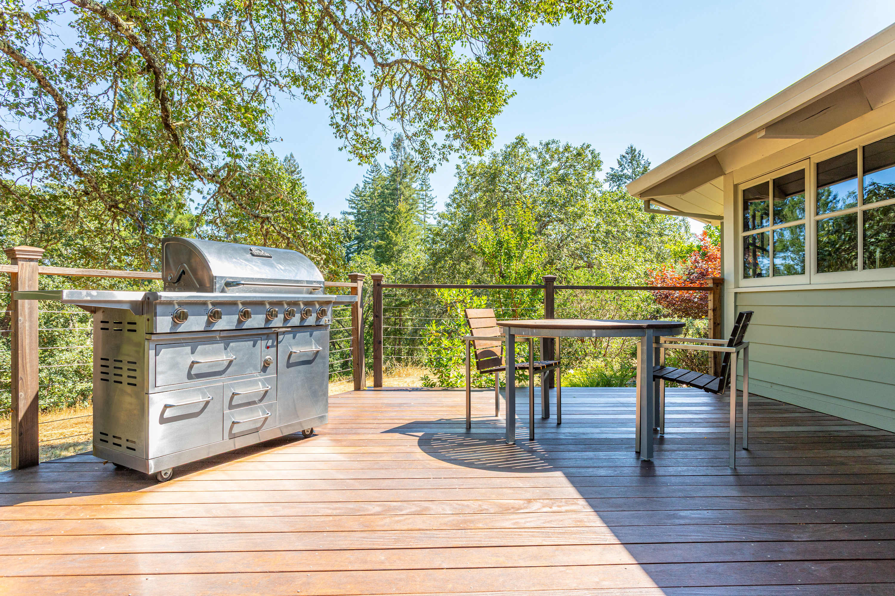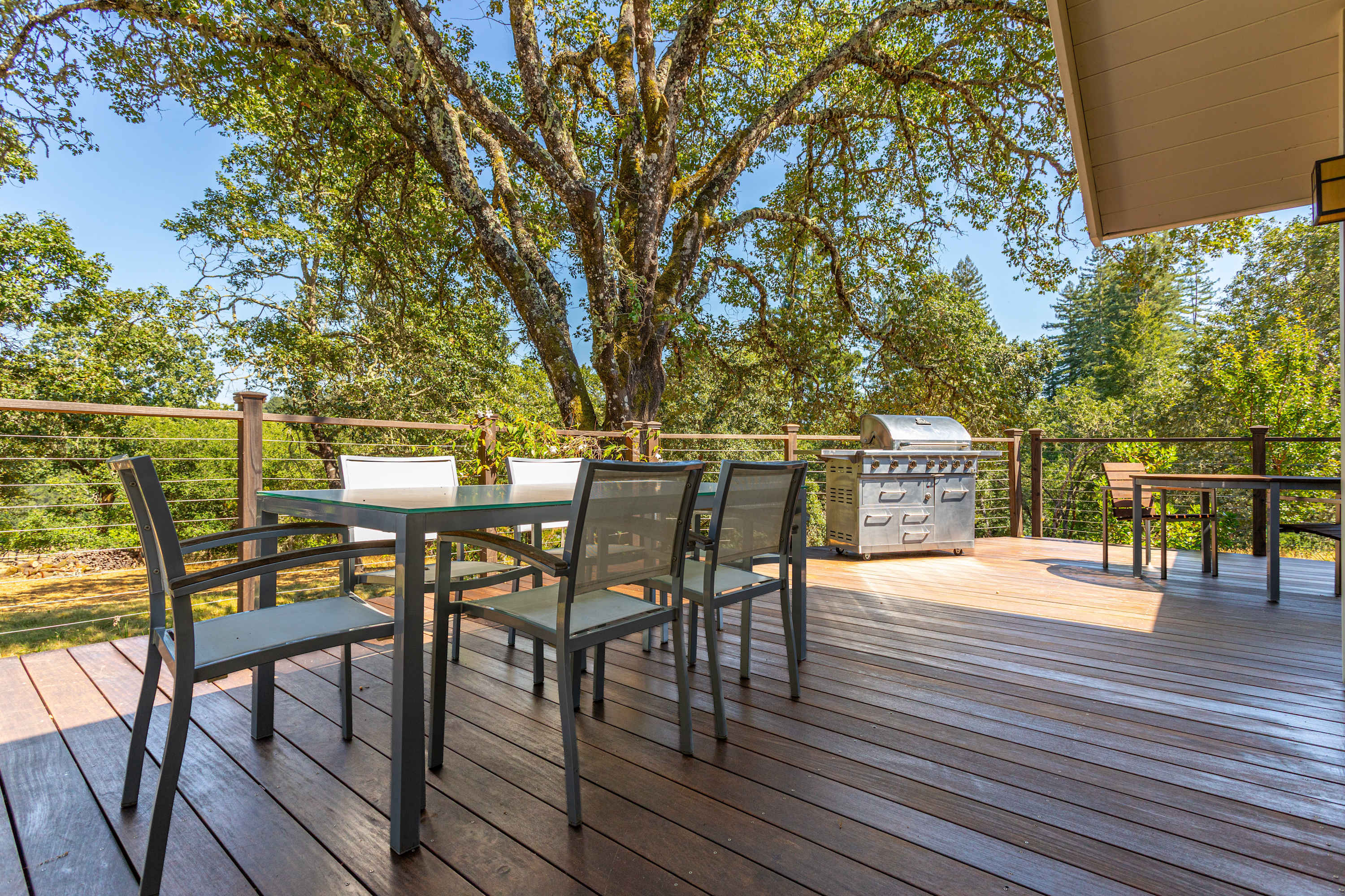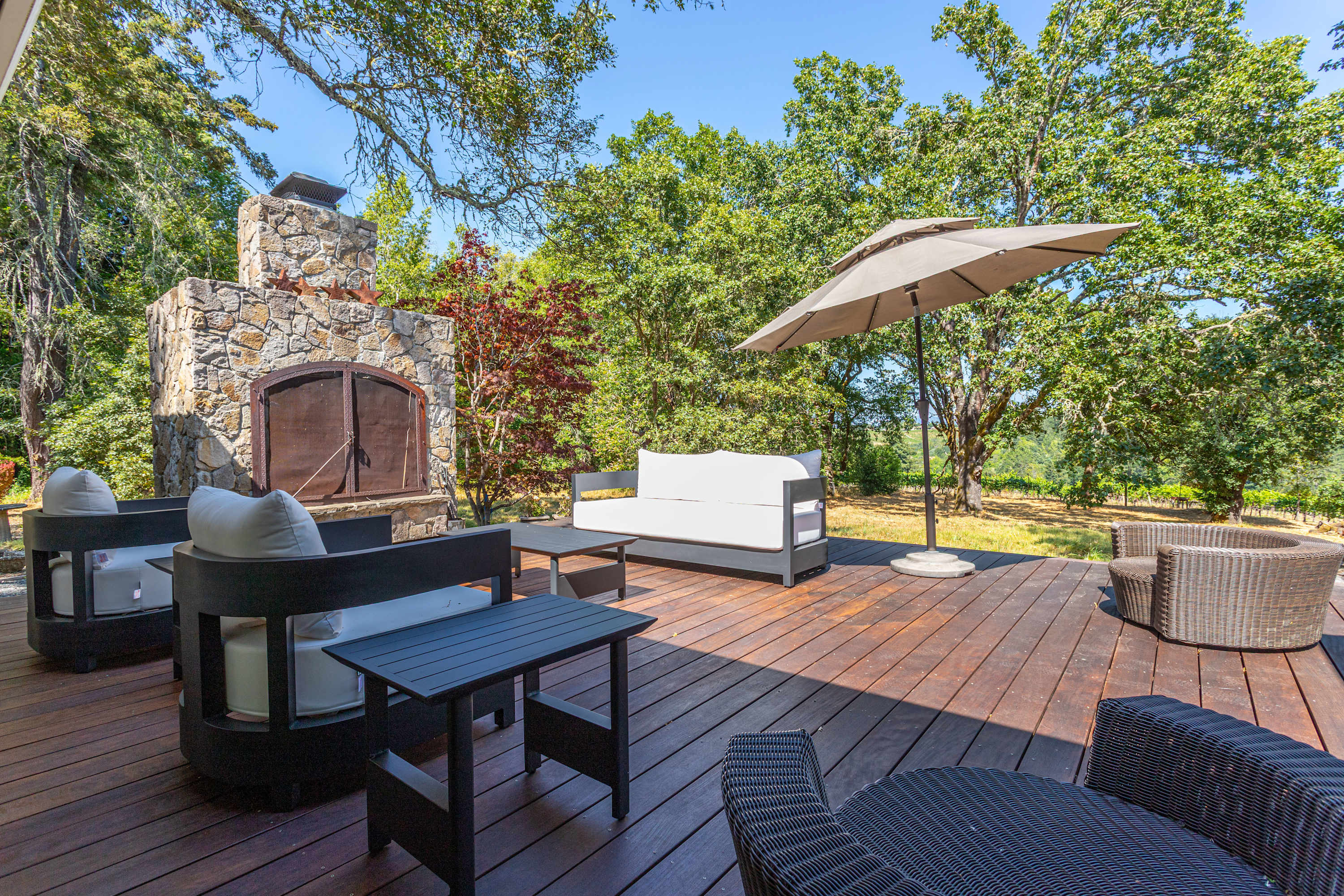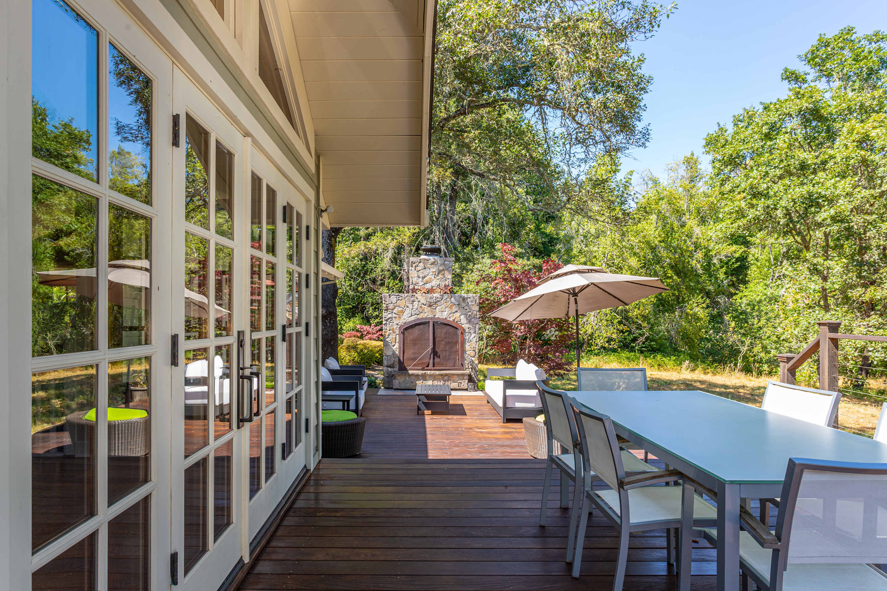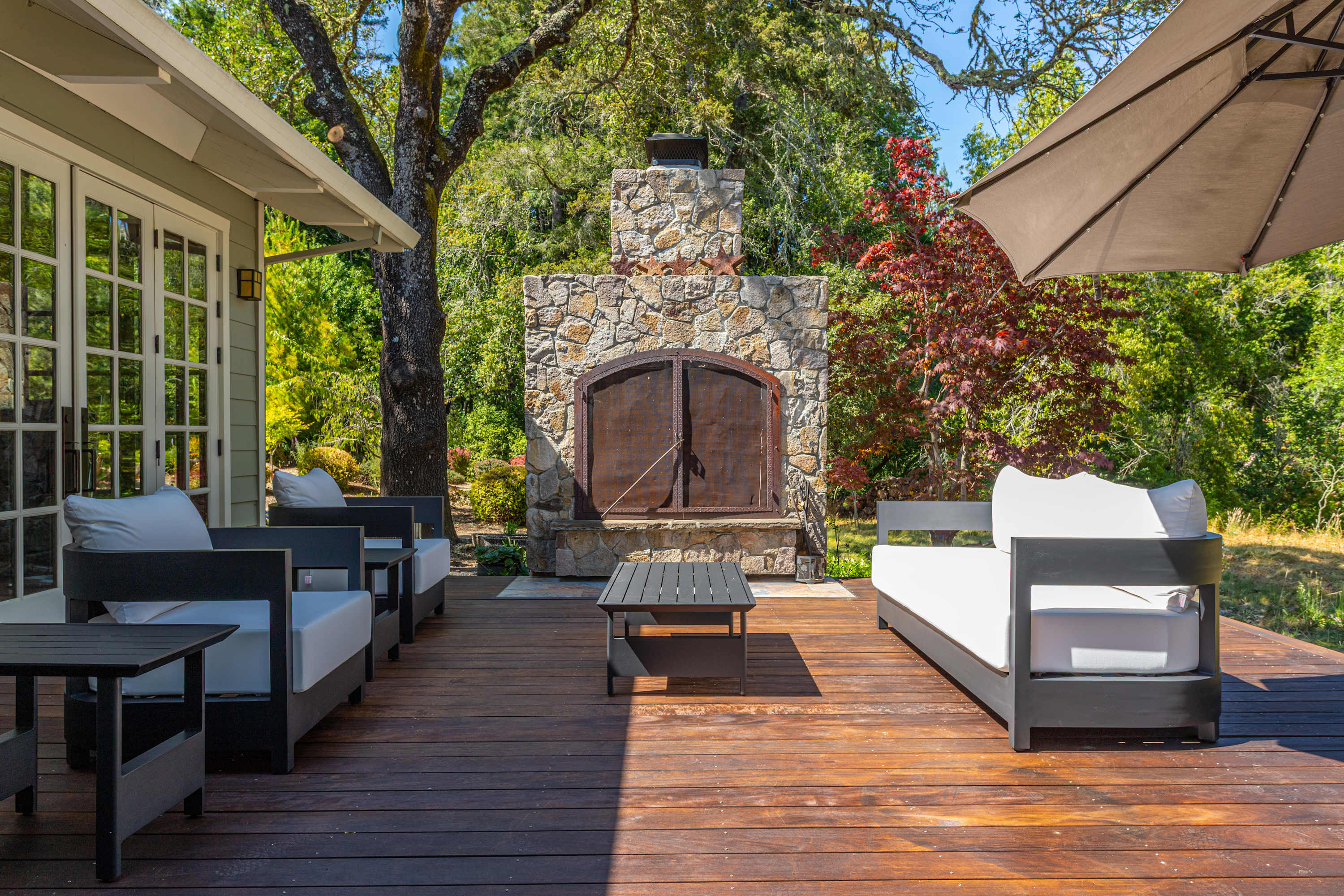 The deck is an entertainer's dream, featuring comfortable outdoor seating, a full table and chairs for al fresco dining, a BBQ grill, and a majestic outdoor fireplace.