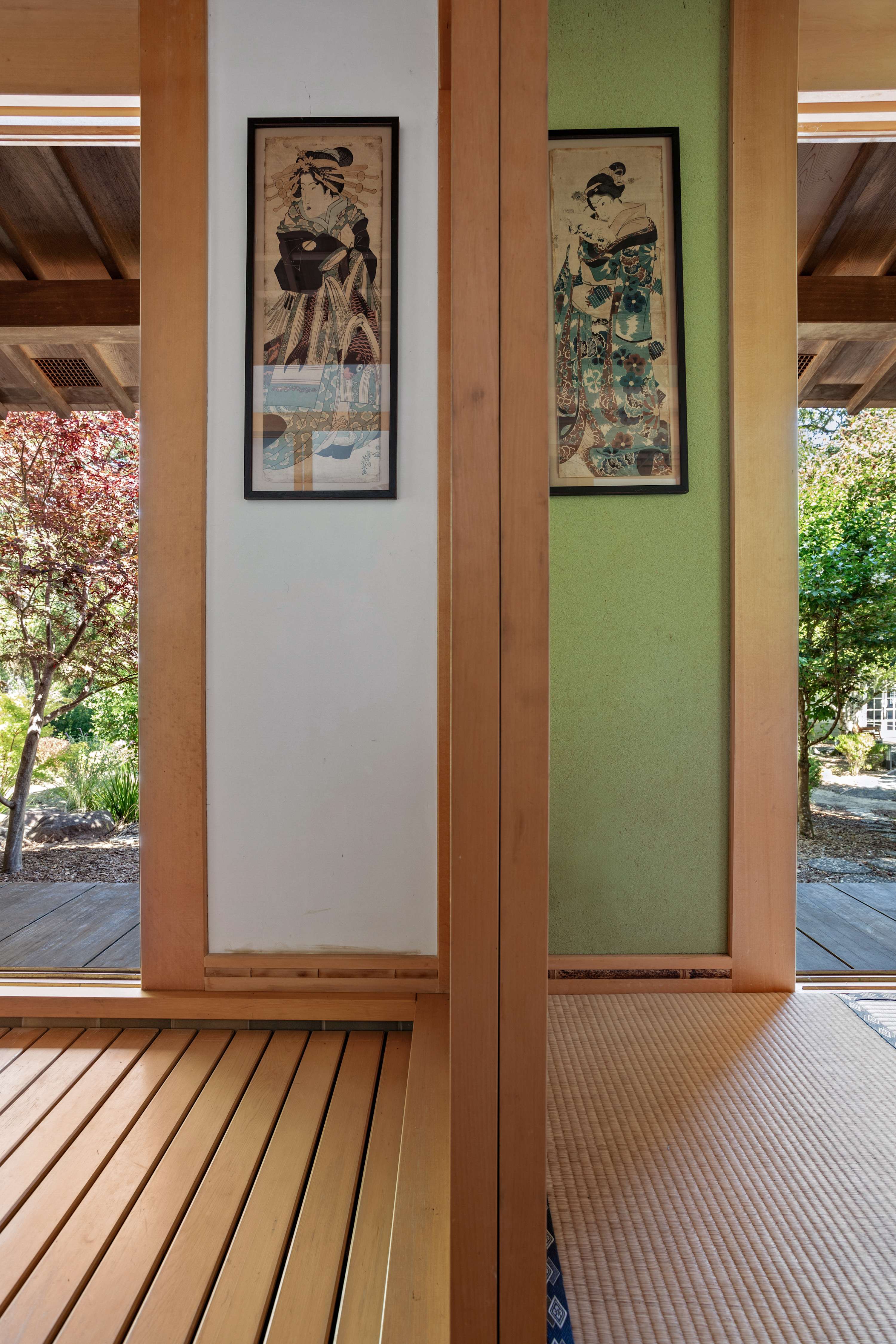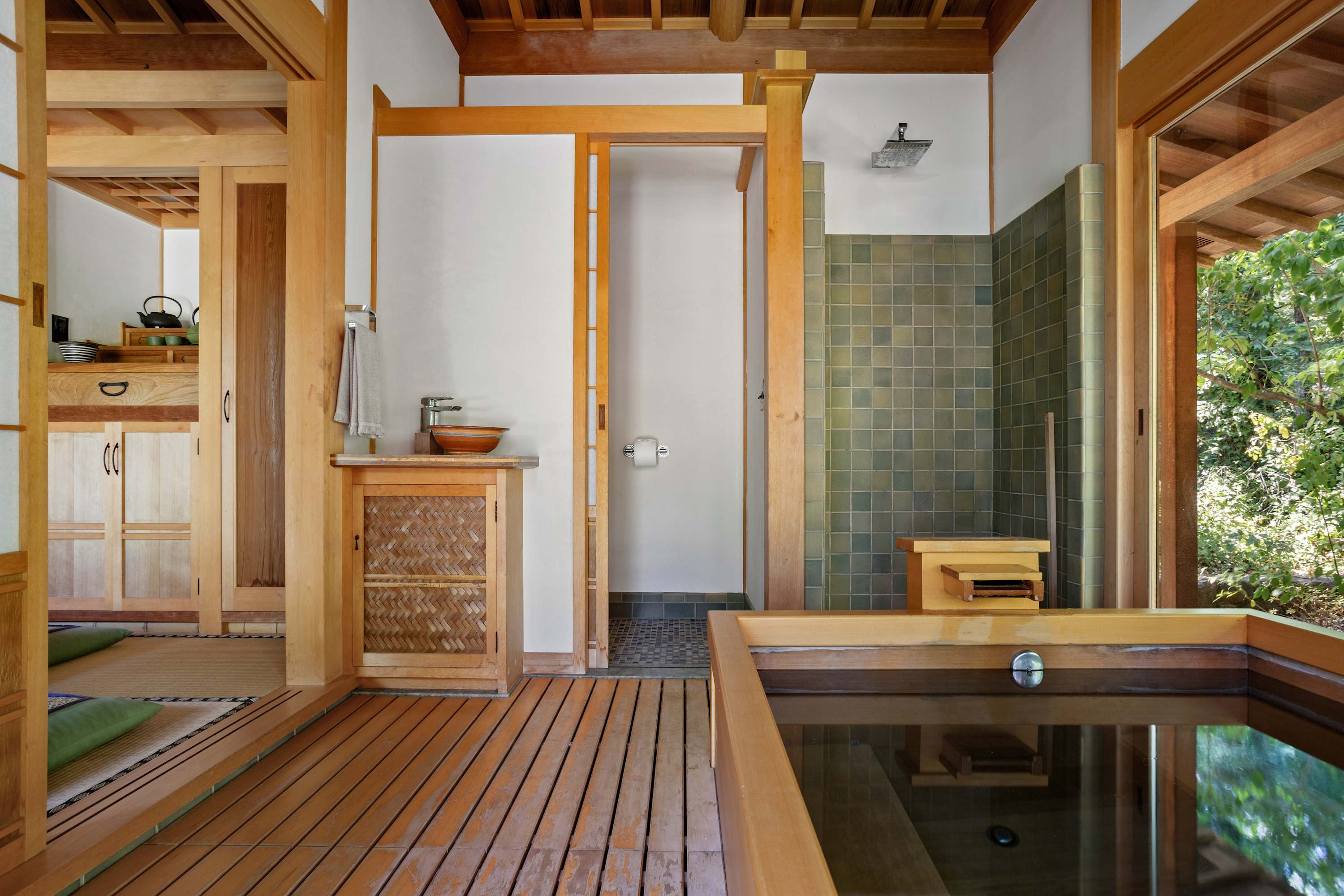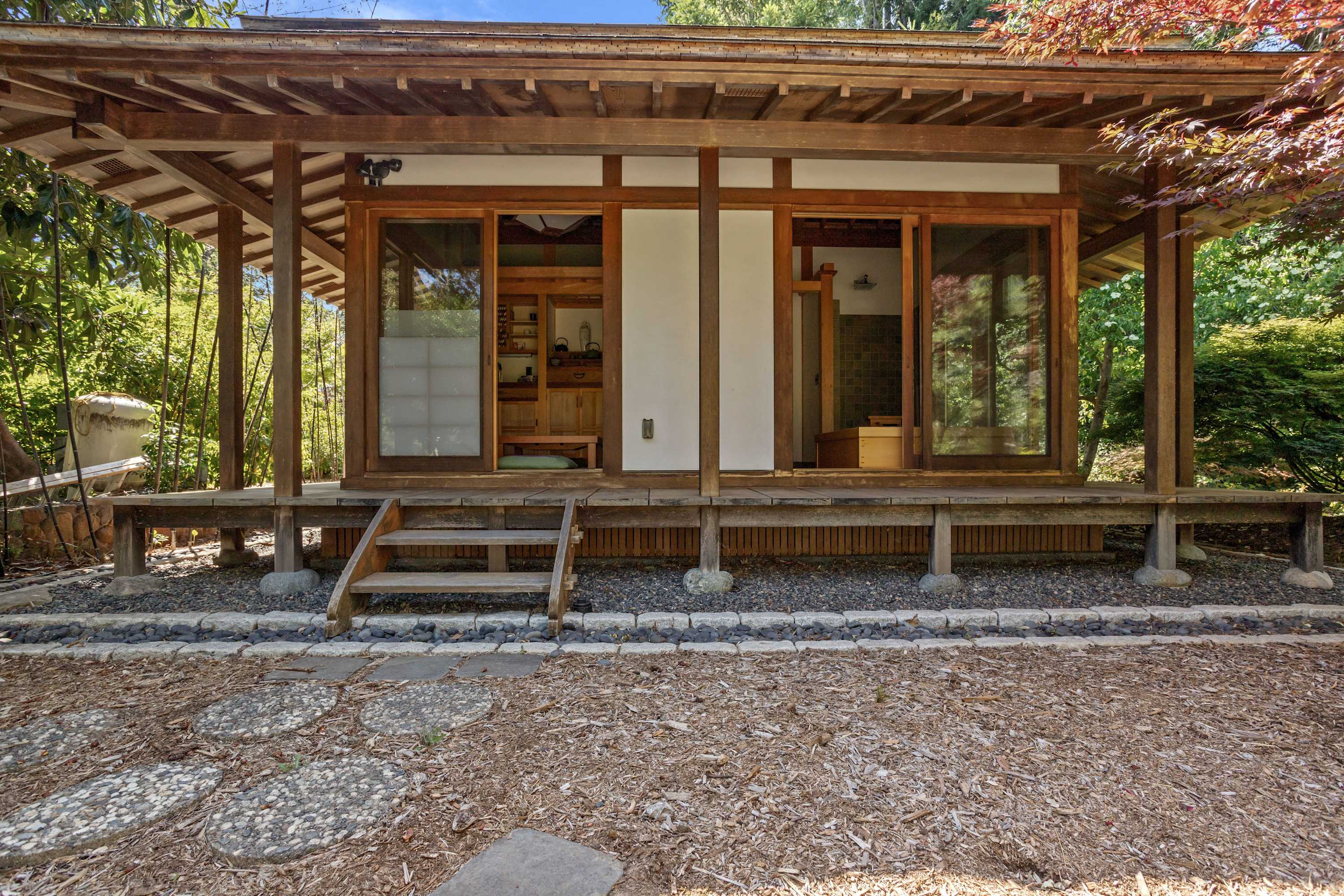 The crown jewel of the estate is the authentic Japanese tea and bath house. Within this expertly crafted building, a traditional tea room awaits, offering the perfect setting for a ceremony. The experience is completed by a separate bathhouse, thoughtfully appointed with a shower and a deep, Japanese-style soaking tub for a truly restorative experience.