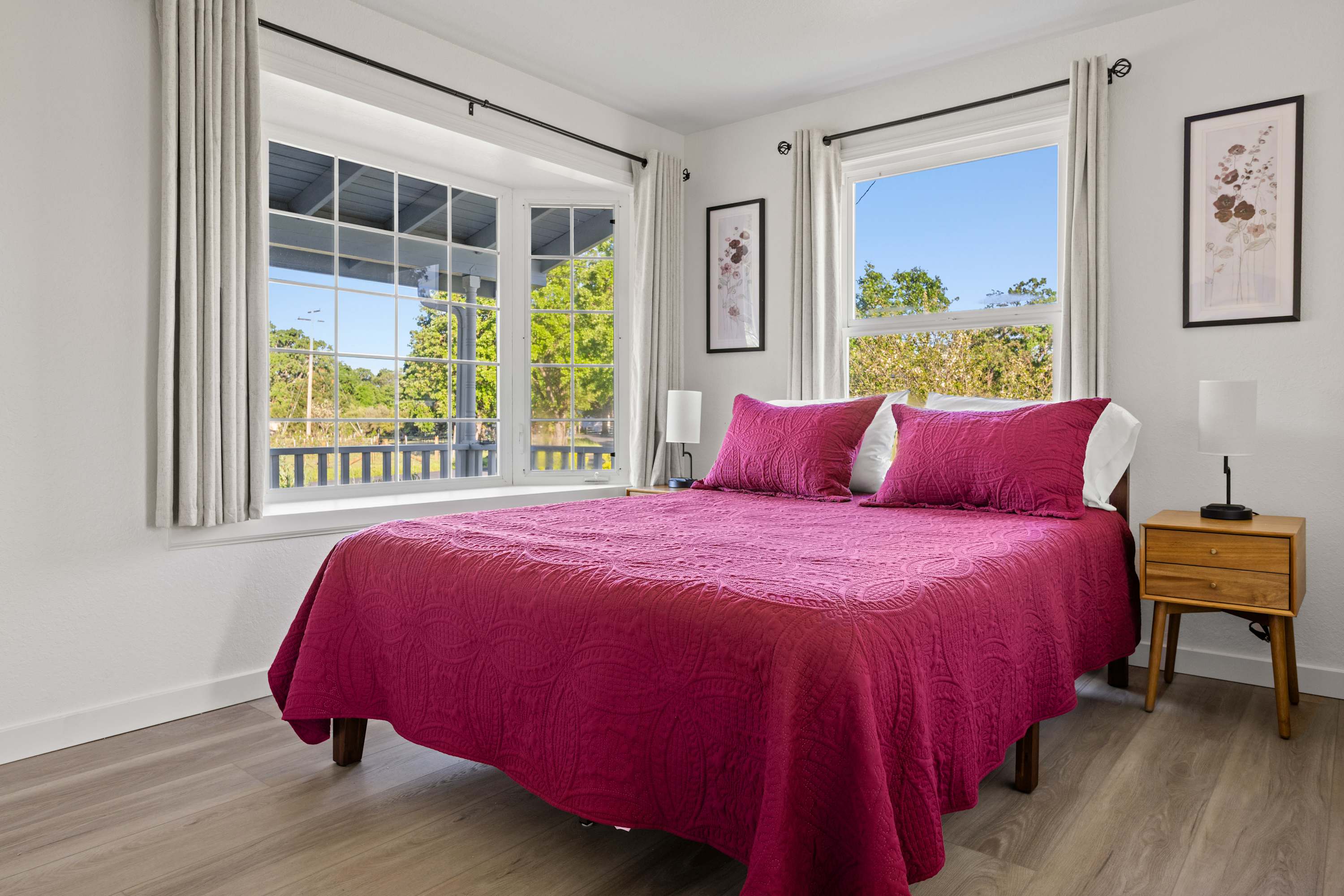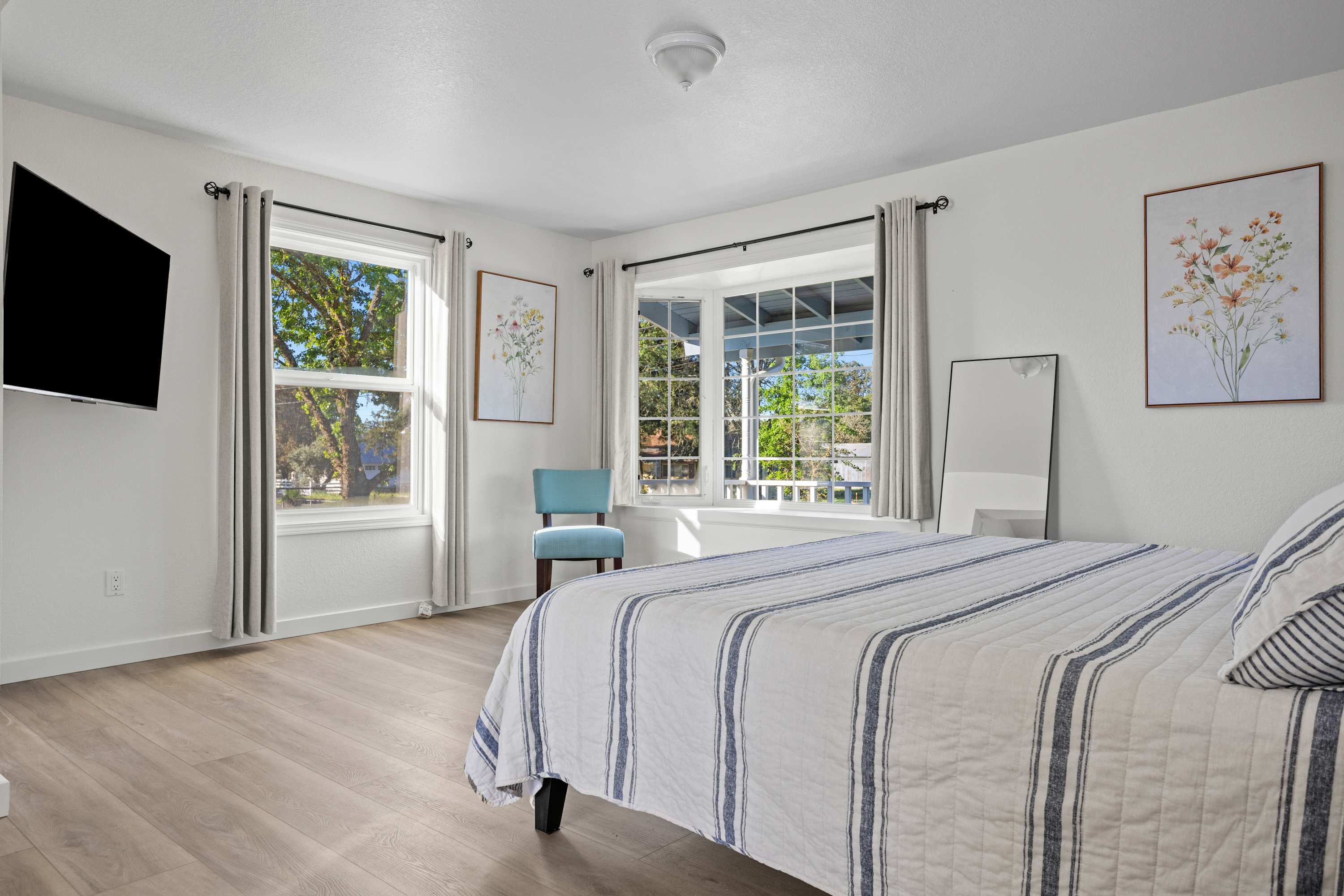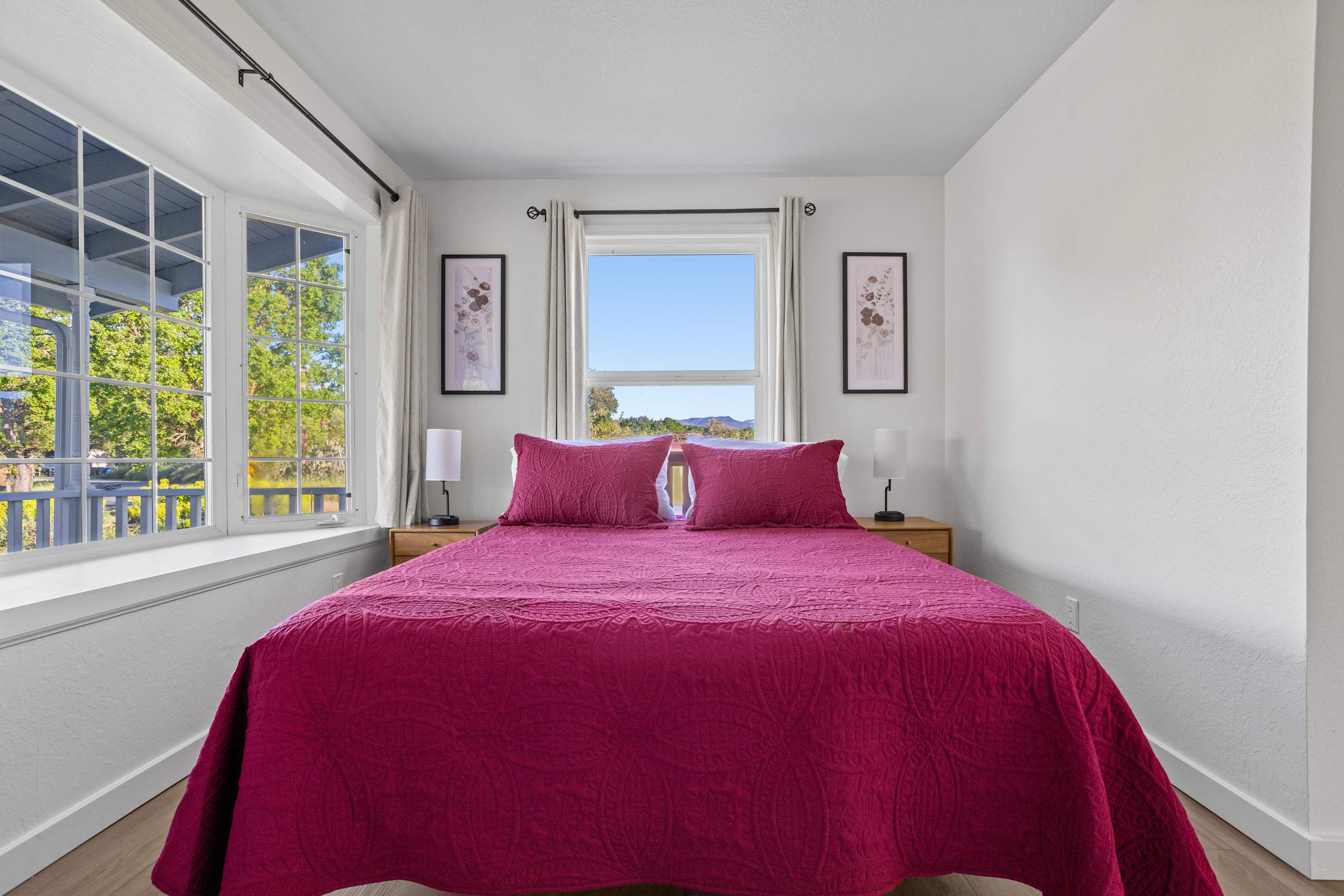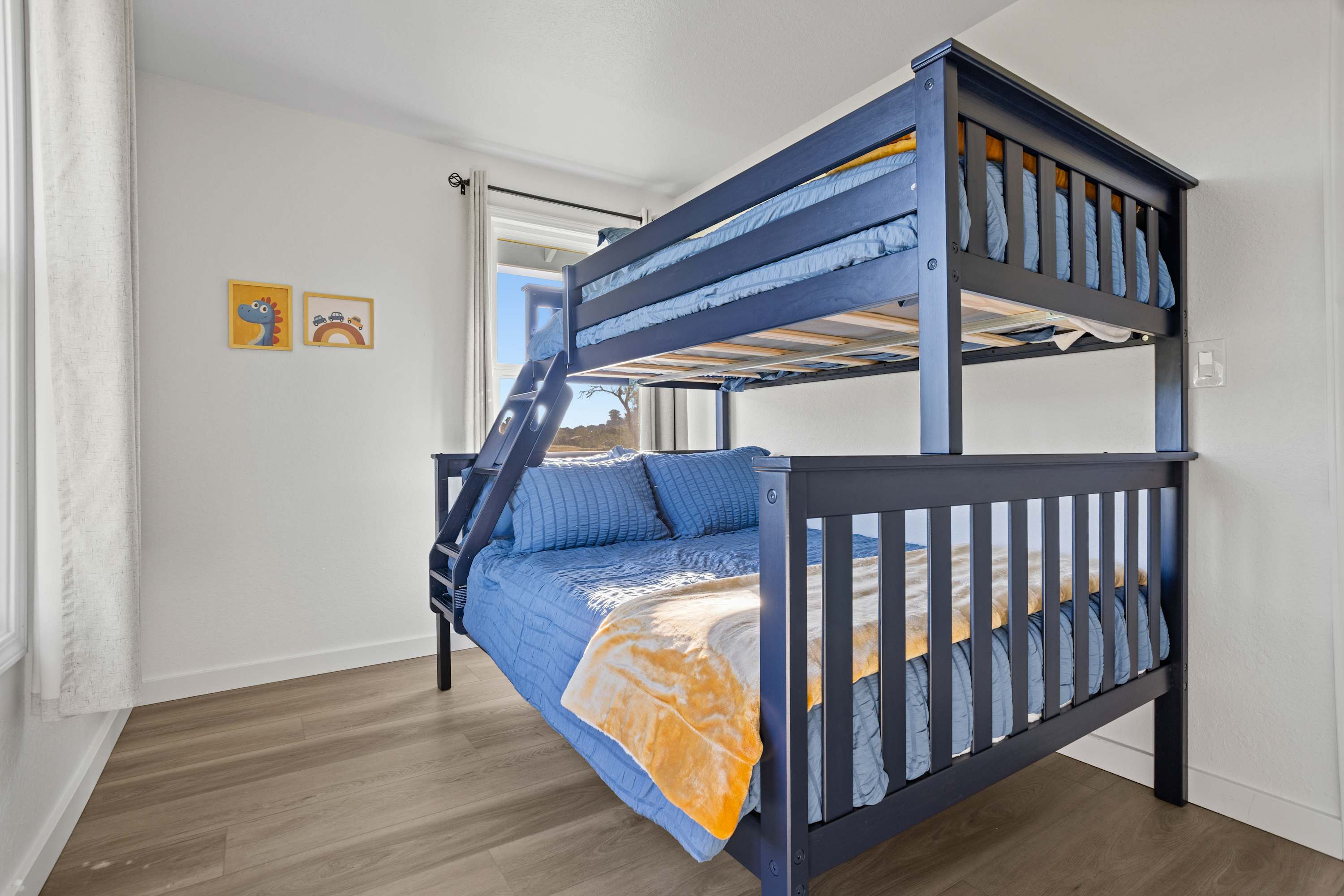 The primary bedroom features a king bed and a private ensuite bathroom with double sinks, a large shower, and a jacuzzi tub. You’ll enjoy amazing views of the Sonoma countryside through the room's two bay windows. The second bedroom is located down the hallway and offers its own TV and a beautiful bay window with picturesque views. The third bedroom was designed with children and teens in mind—though adults will find it comfortable as well—and features a twin-over-full bunk bed, whimsical art, and a full closet.