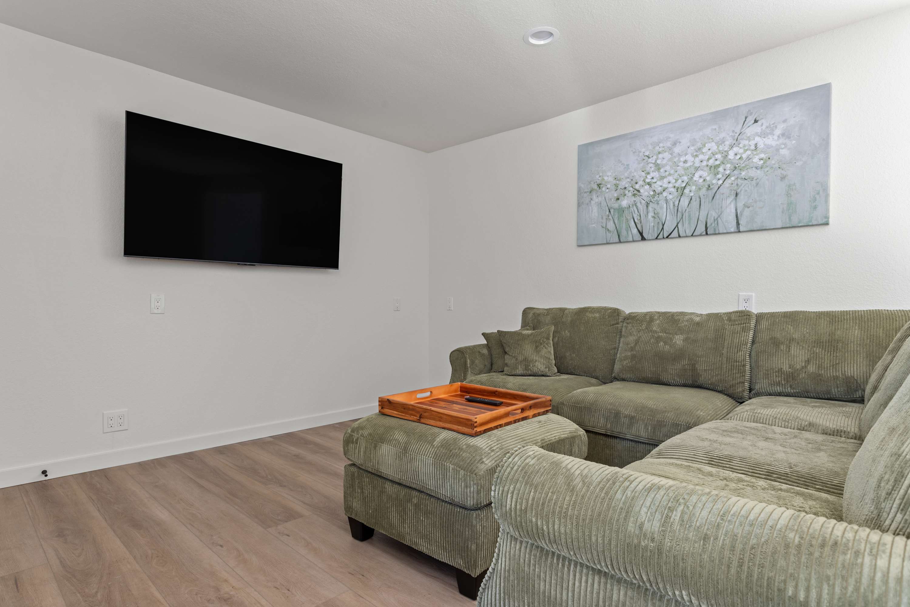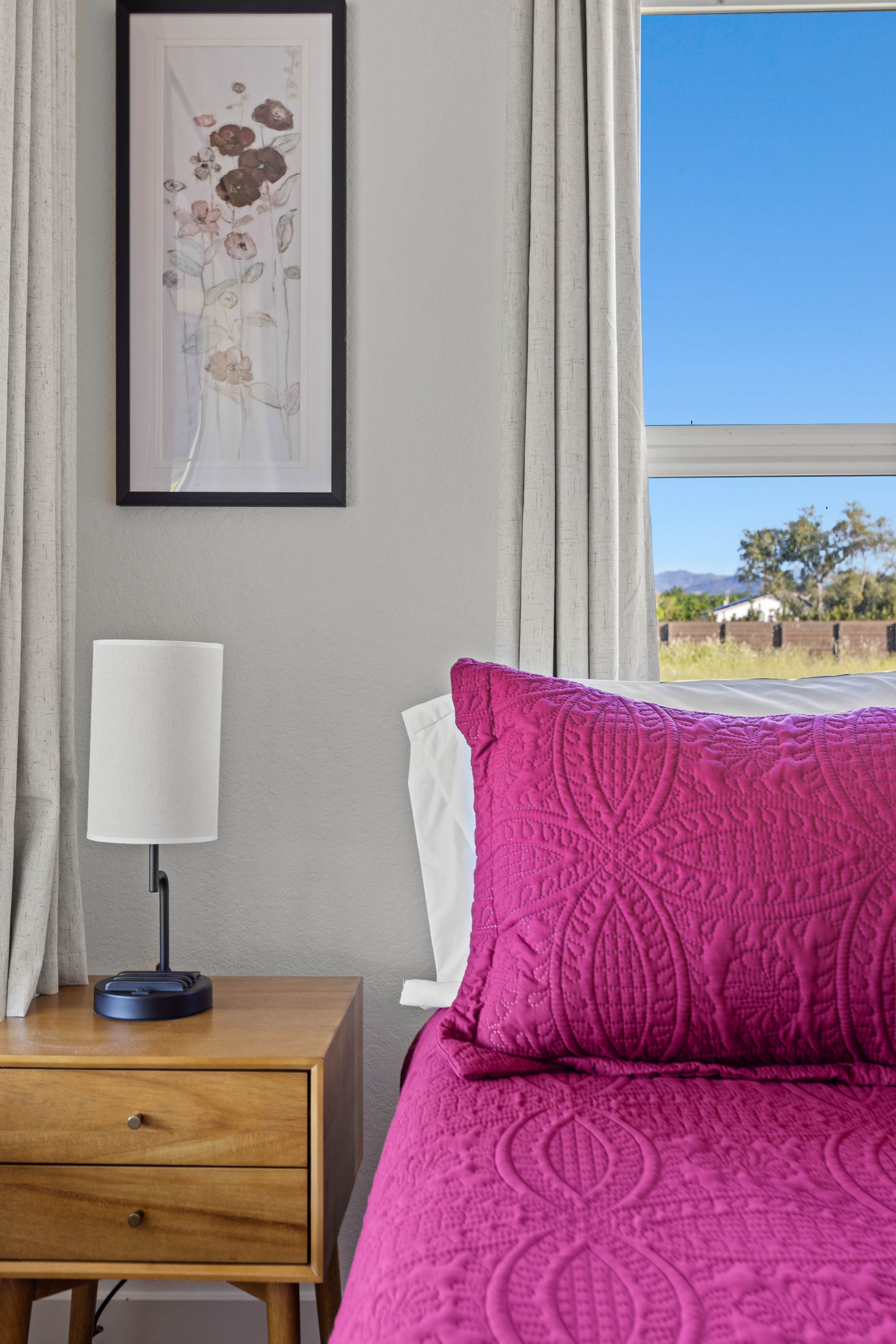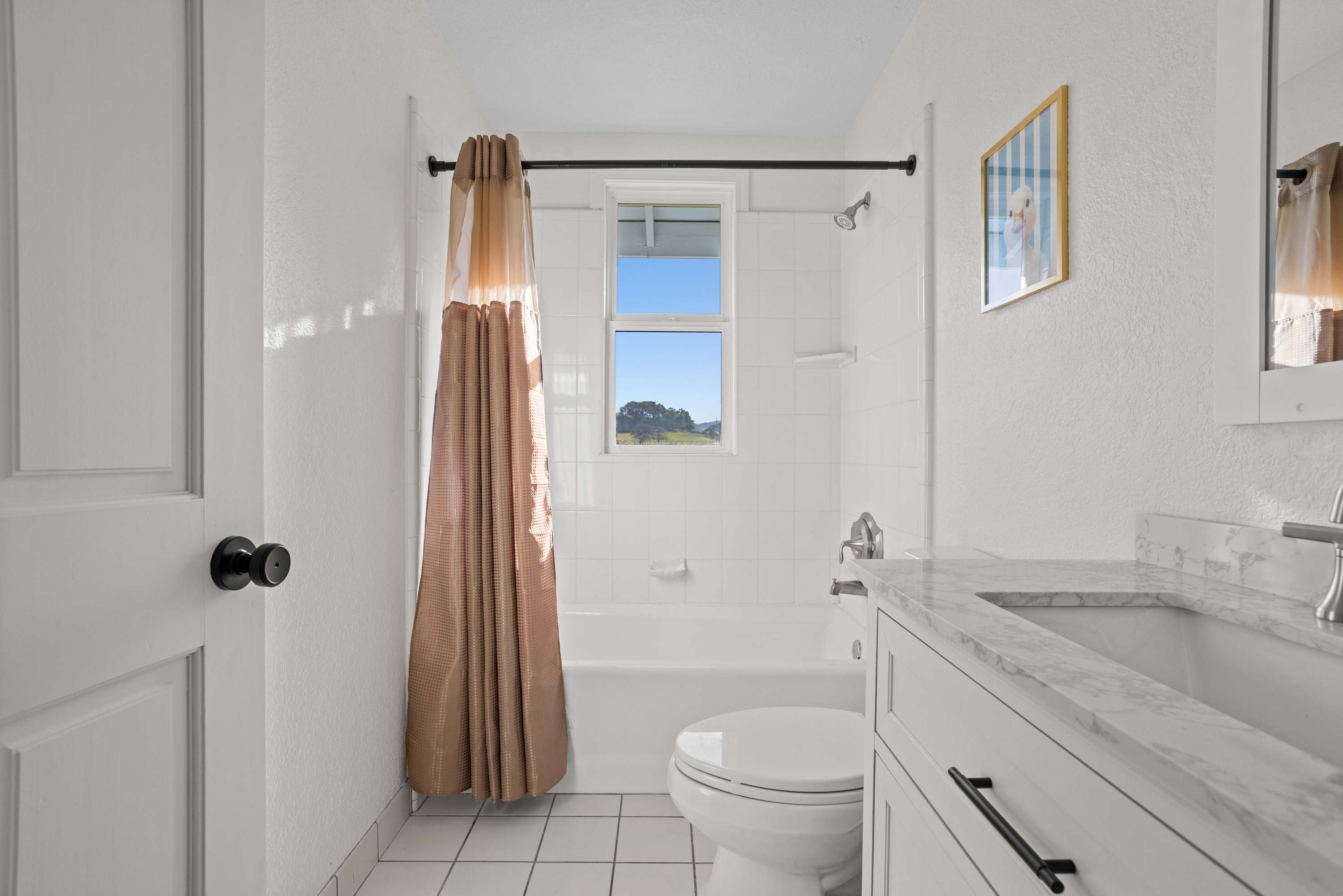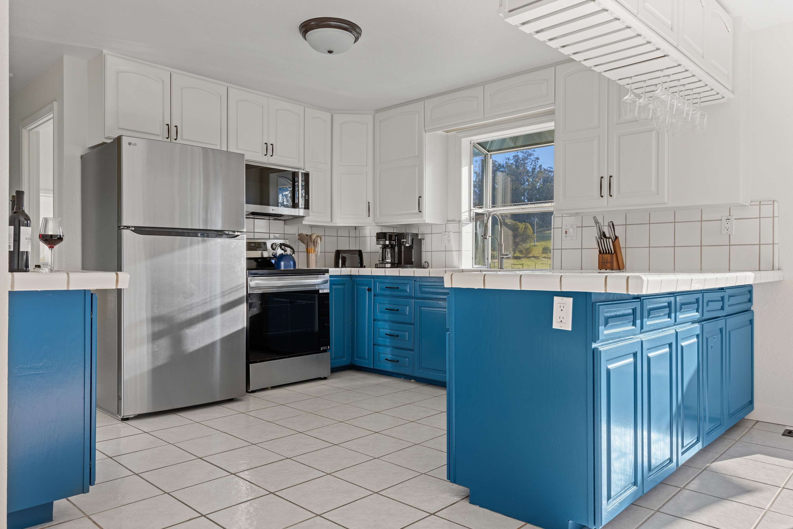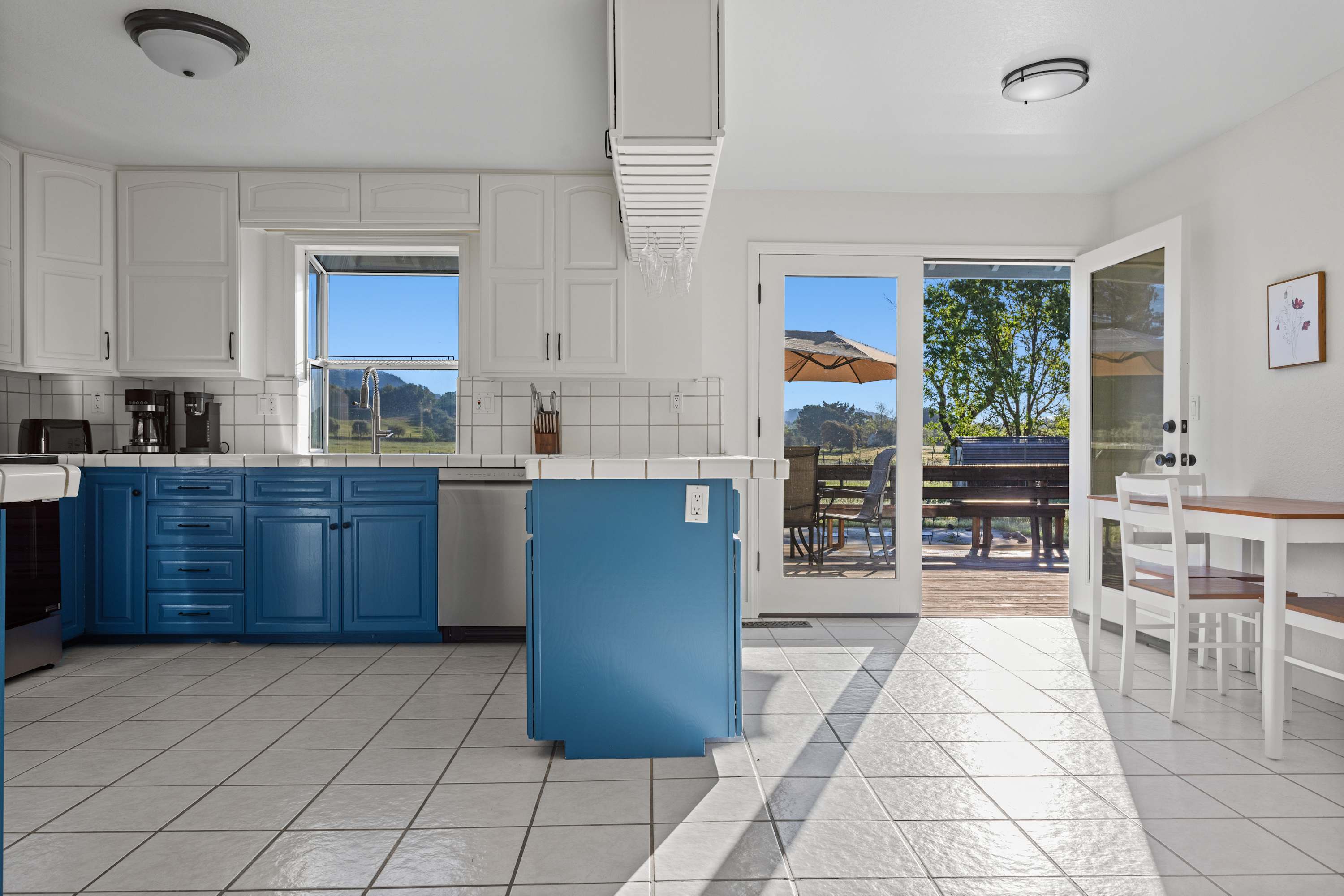 The primary bedroom features a king bed and a private ensuite bathroom with double sinks, a large shower, and a jacuzzi tub. You’ll enjoy amazing views of the Sonoma countryside through the room's two bay windows. The second bedroom is located down the hallway and offers its own TV and a beautiful bay window with picturesque views. The third bedroom was designed with children and teens in mind—though adults will find it comfortable as well—and features a twin-over-full bunk bed, whimsical art, and a full closet.