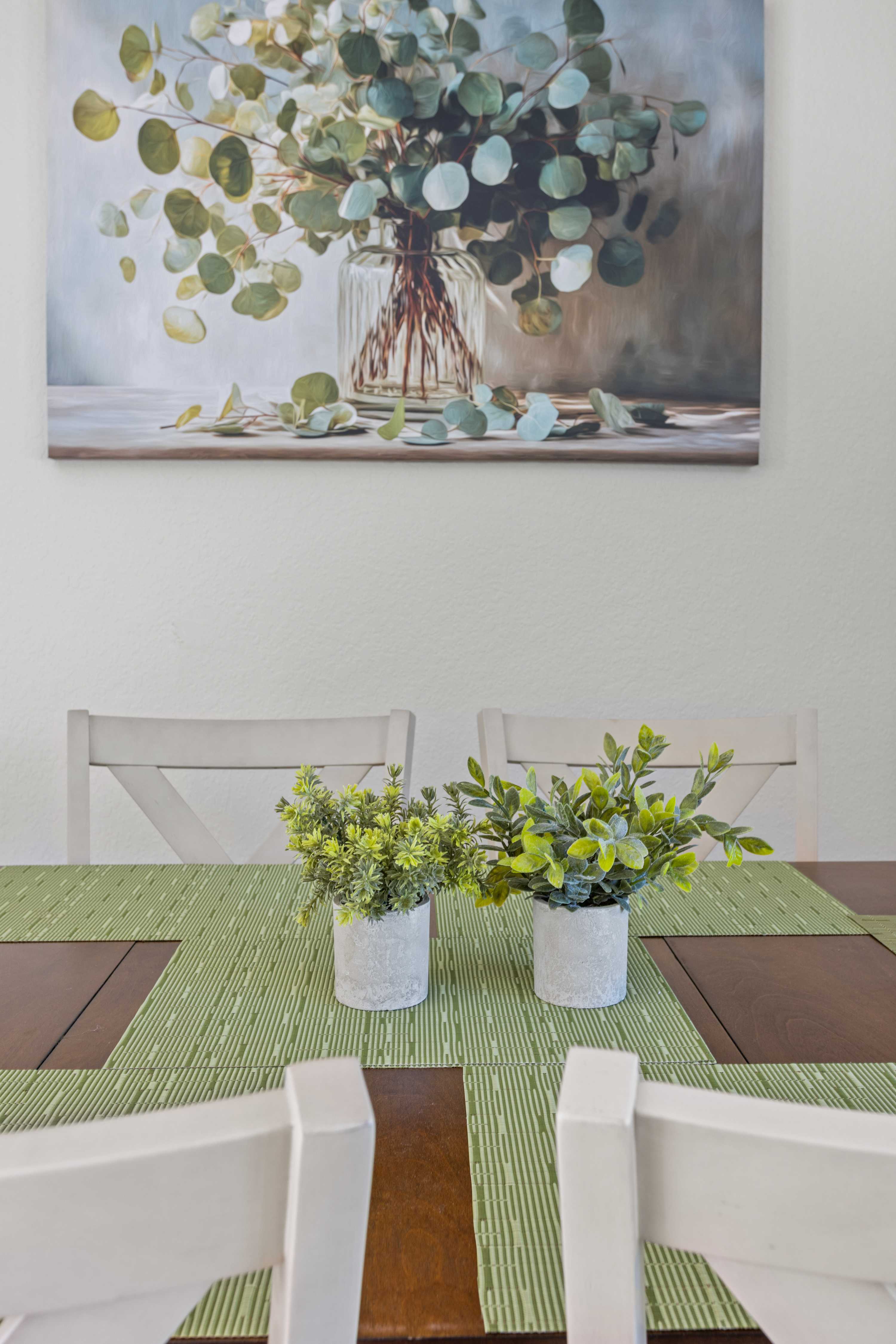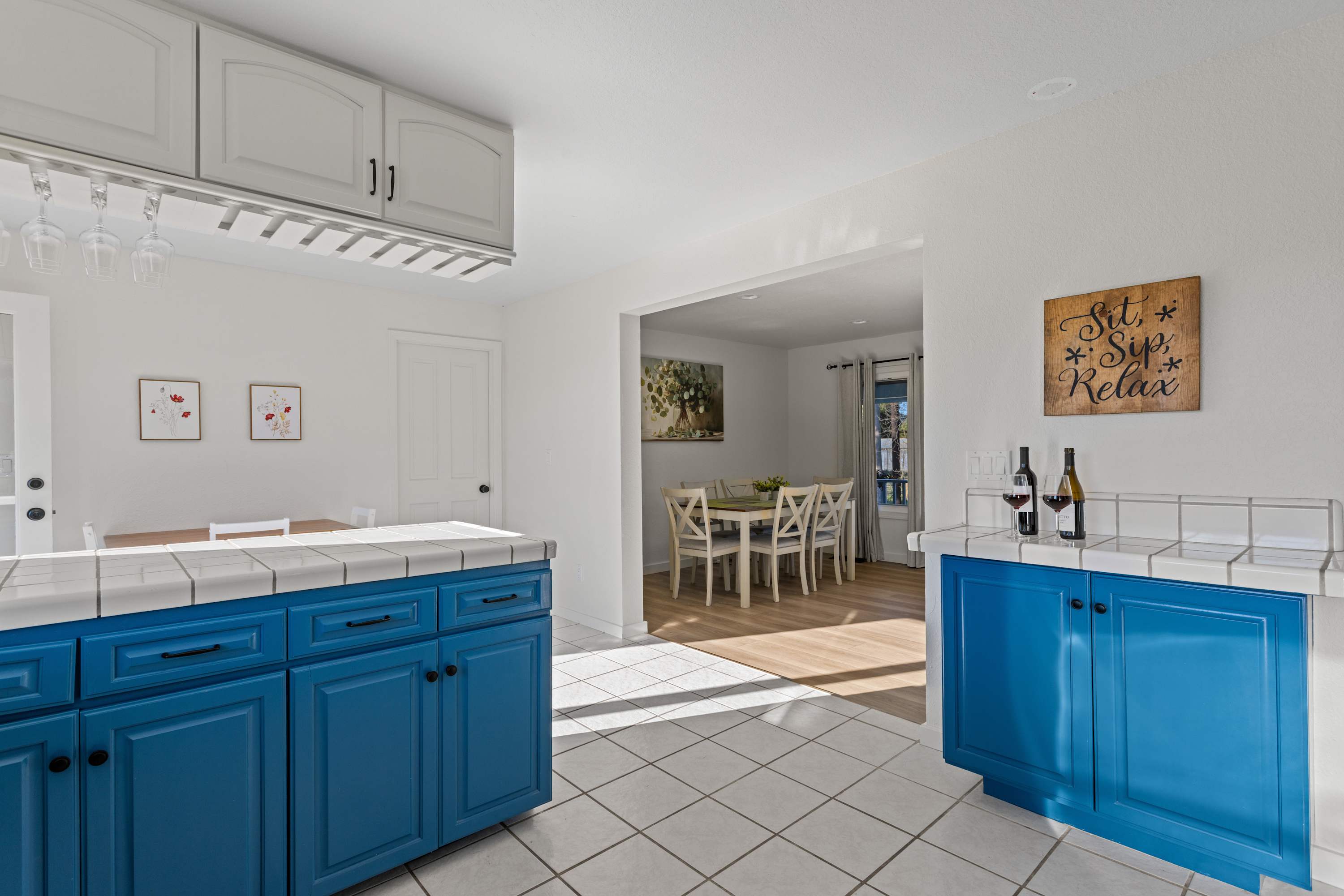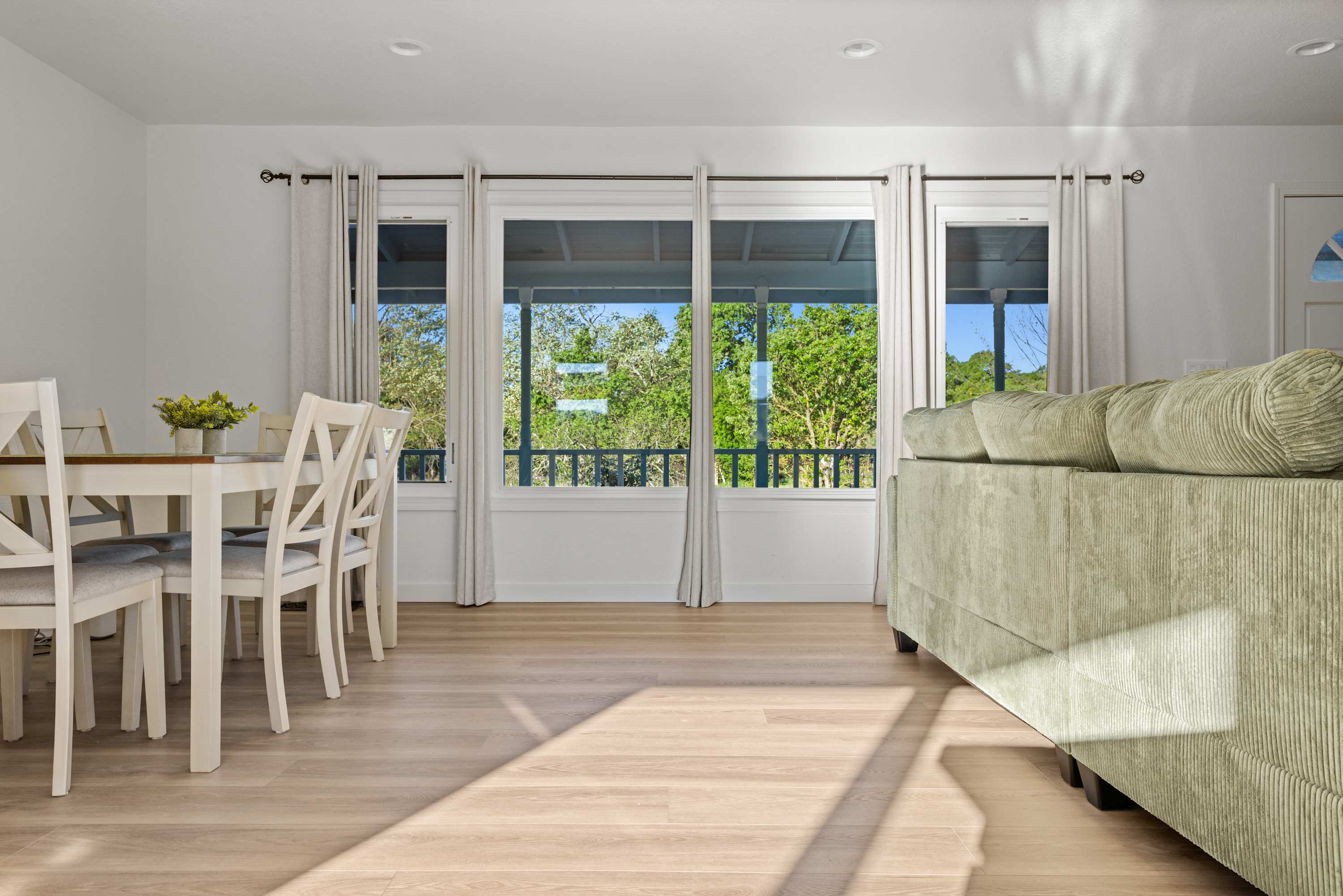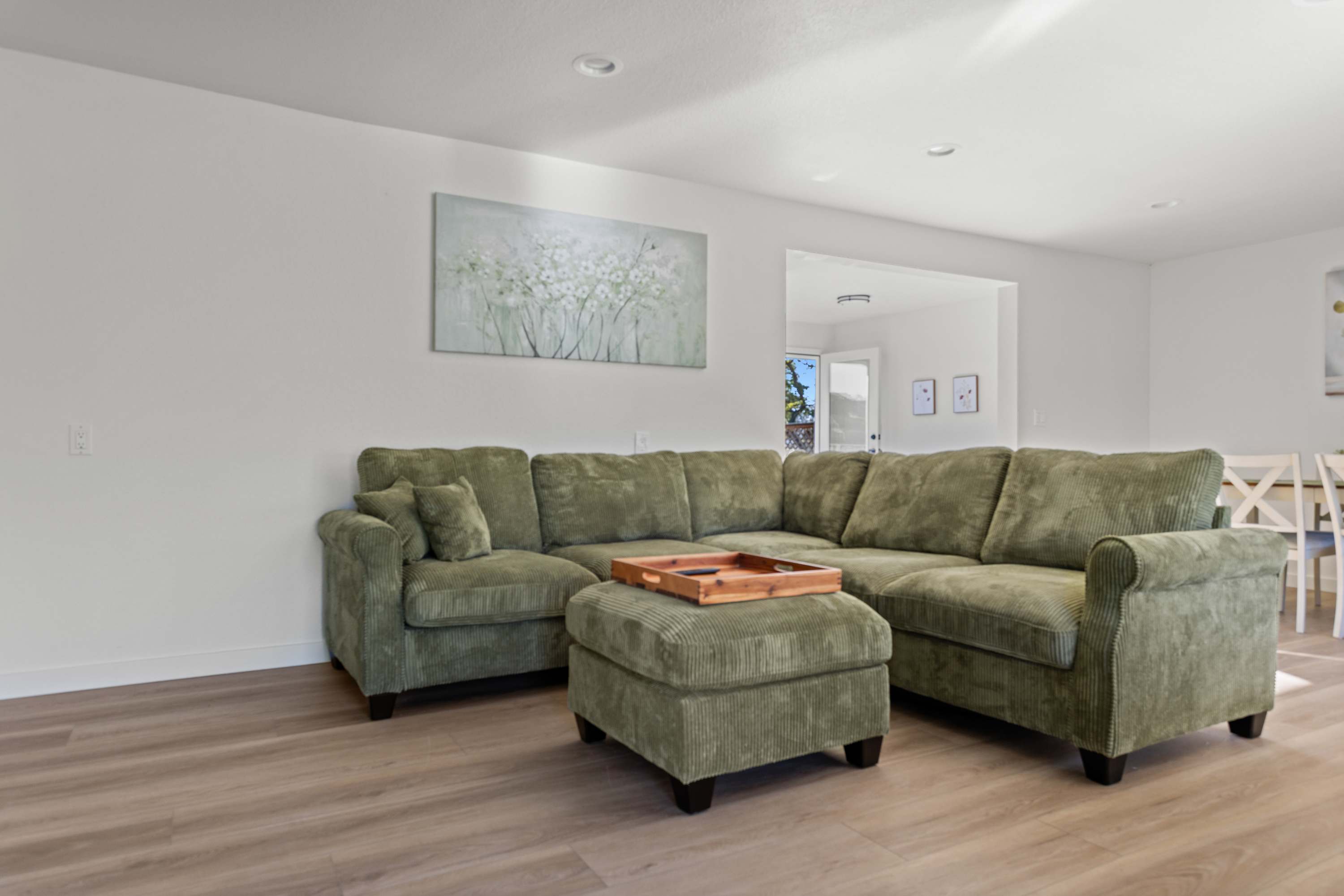 The living area is bright and relaxed, featuring a large-screen TV, a plush sectional sofa, and west-facing windows that fill the space with natural light. The charming dining area seats six, making it an easy place to gather and unwind after a day of exploring.