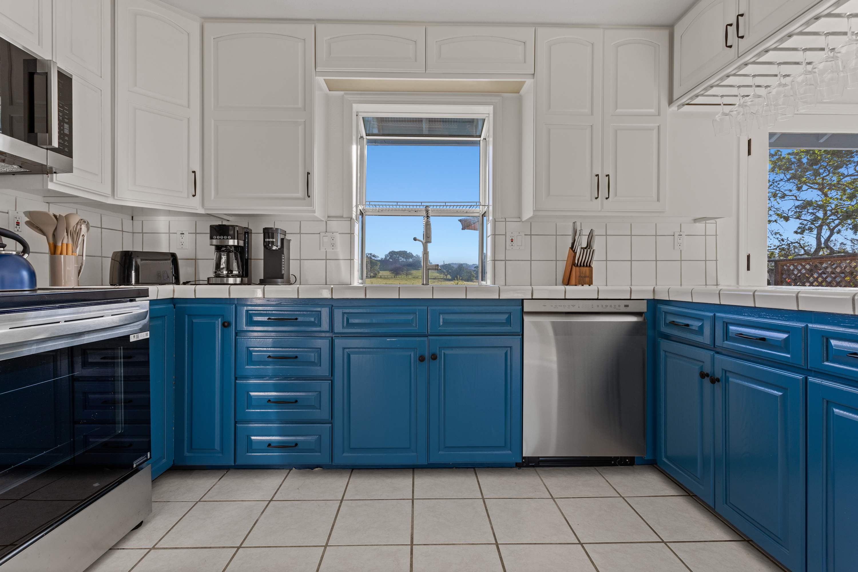 Just beyond the living room is the newly renovated, spacious kitchen. Featuring a cozy eat-in table, new appliances, and inspiring views, it is fully equipped with a range, oven, microwave, coffee maker, and all the essential cookware and spices needed to prepare a farm-to-table feast.