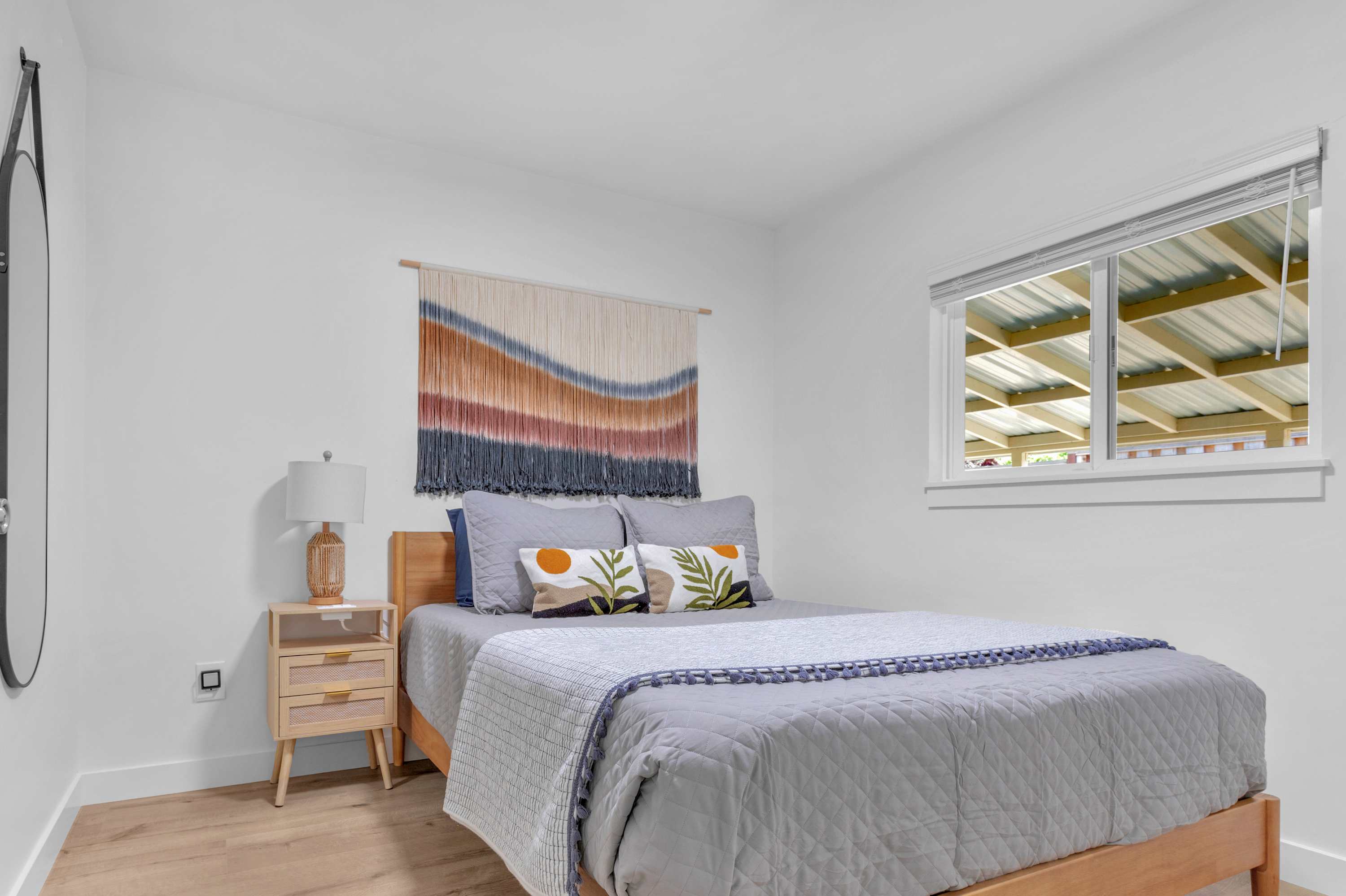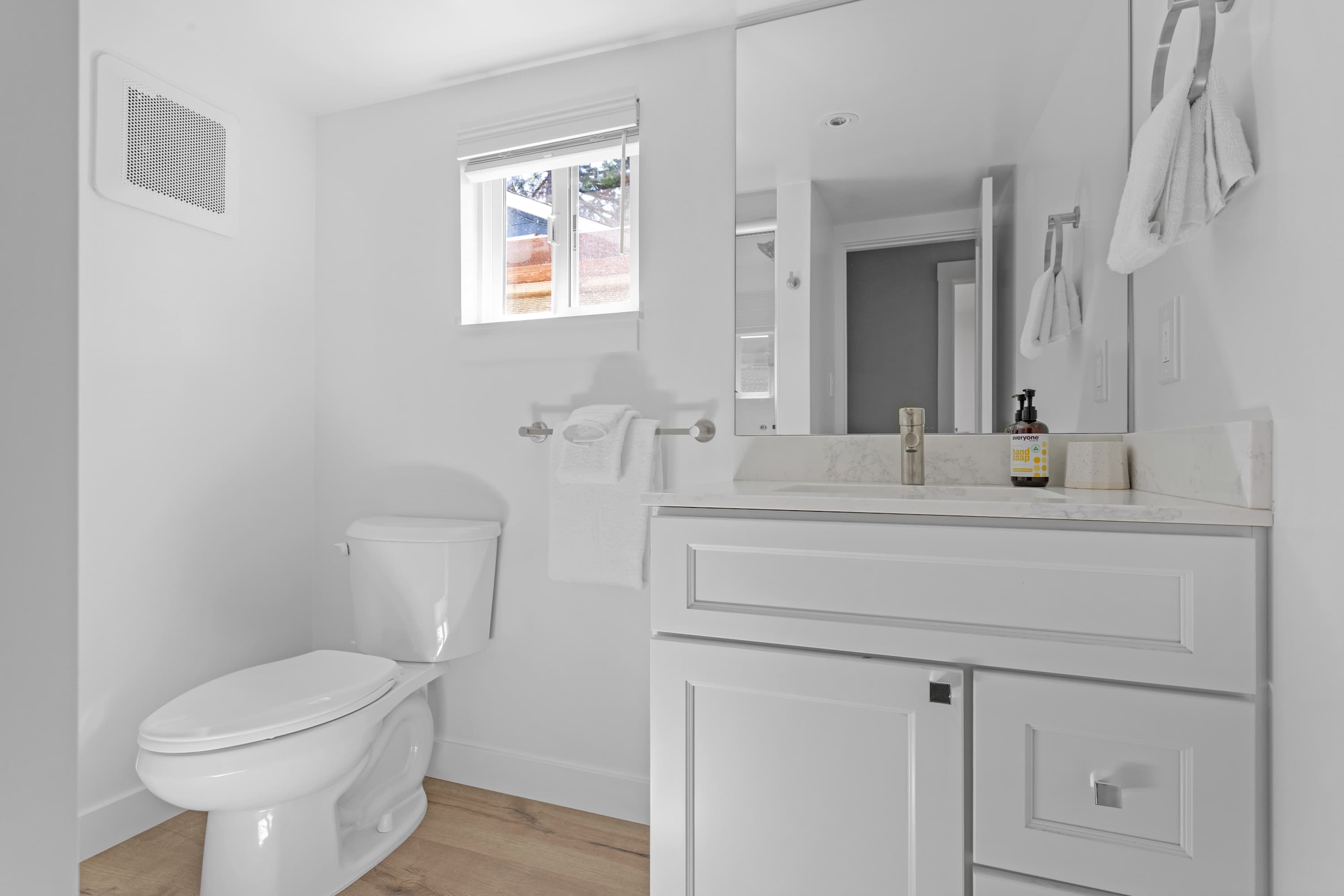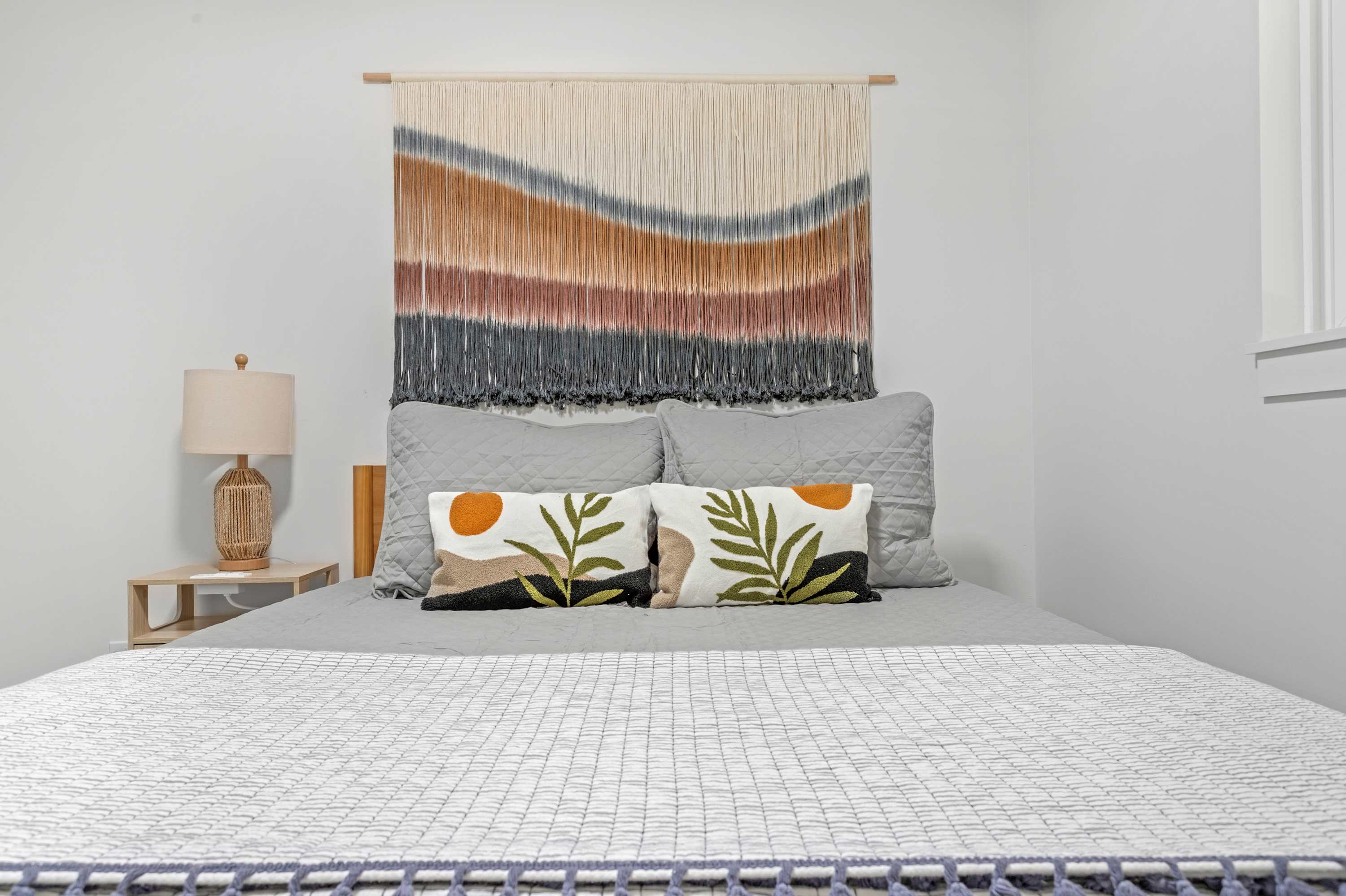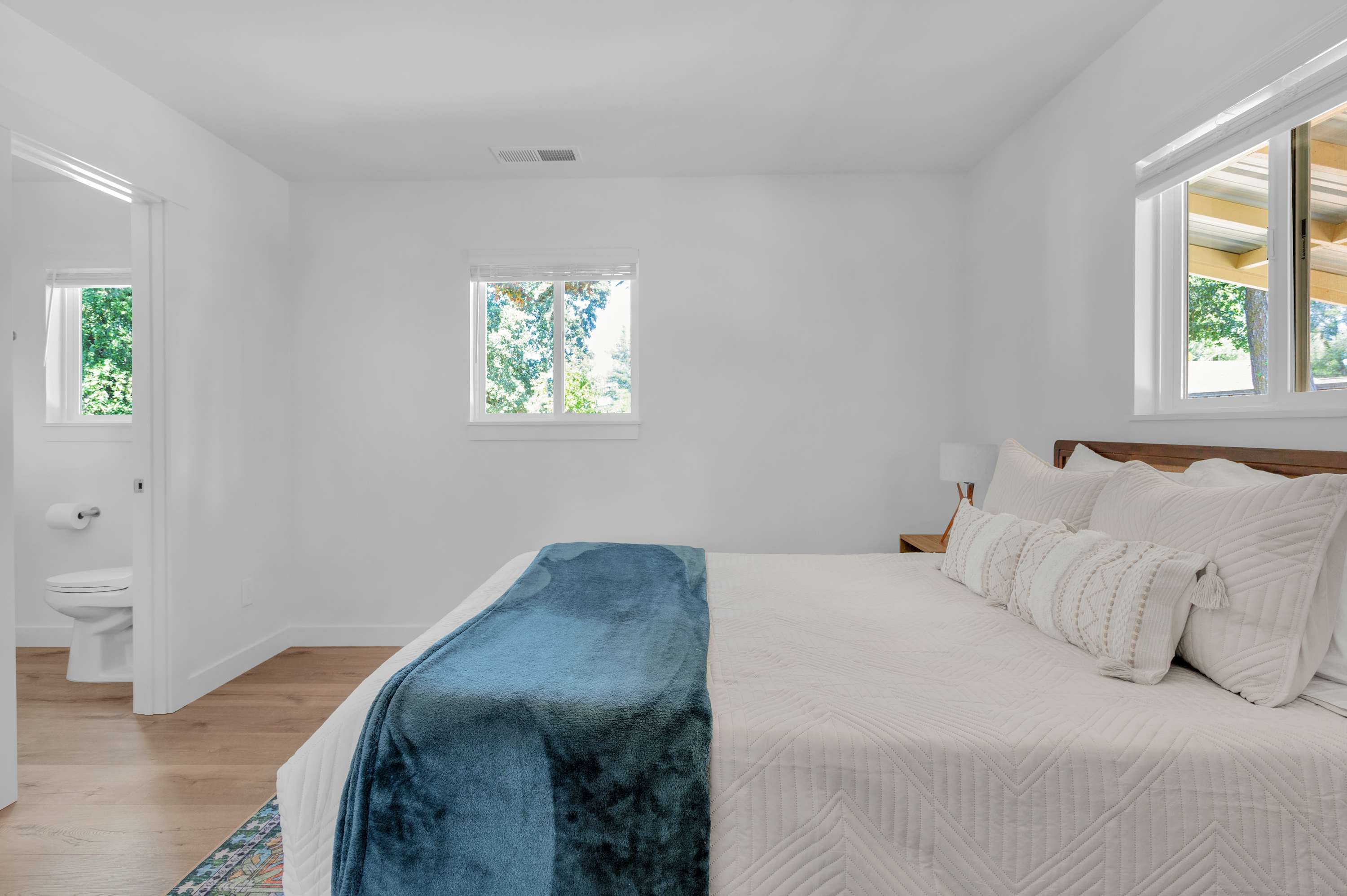 The home comfortably sleeps six guests across three cozy and well-lit bedrooms. The primary bedroom features a queen bed and a private ensuite bathroom. The second bedroom also offers a queen-sized bed, while the third bedroom is furnished with a twin bed and a pull-out trundle. The two full bathrooms are brand-new, featuring beautiful finishes and custom shower doors. The laundry room has a brand new washer and dryer which adds convenience for longer stays.