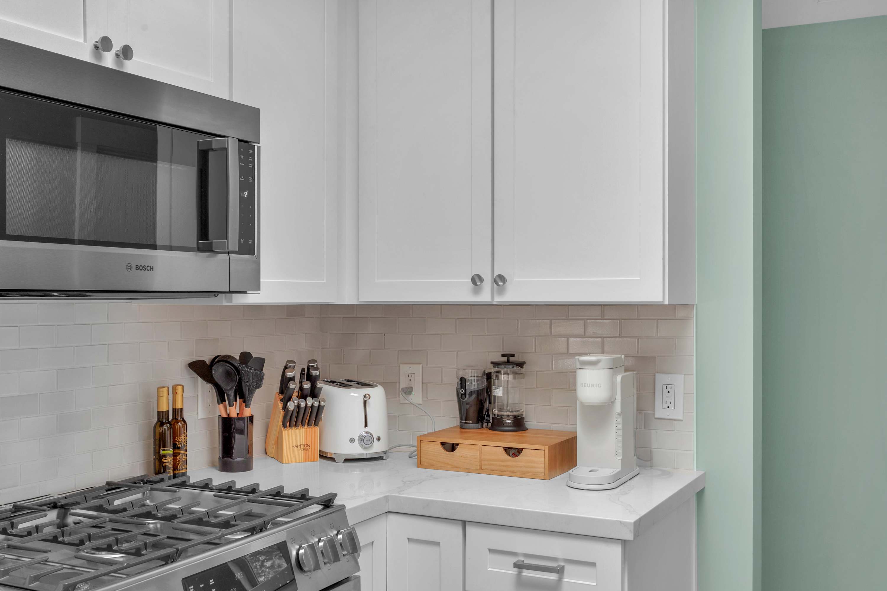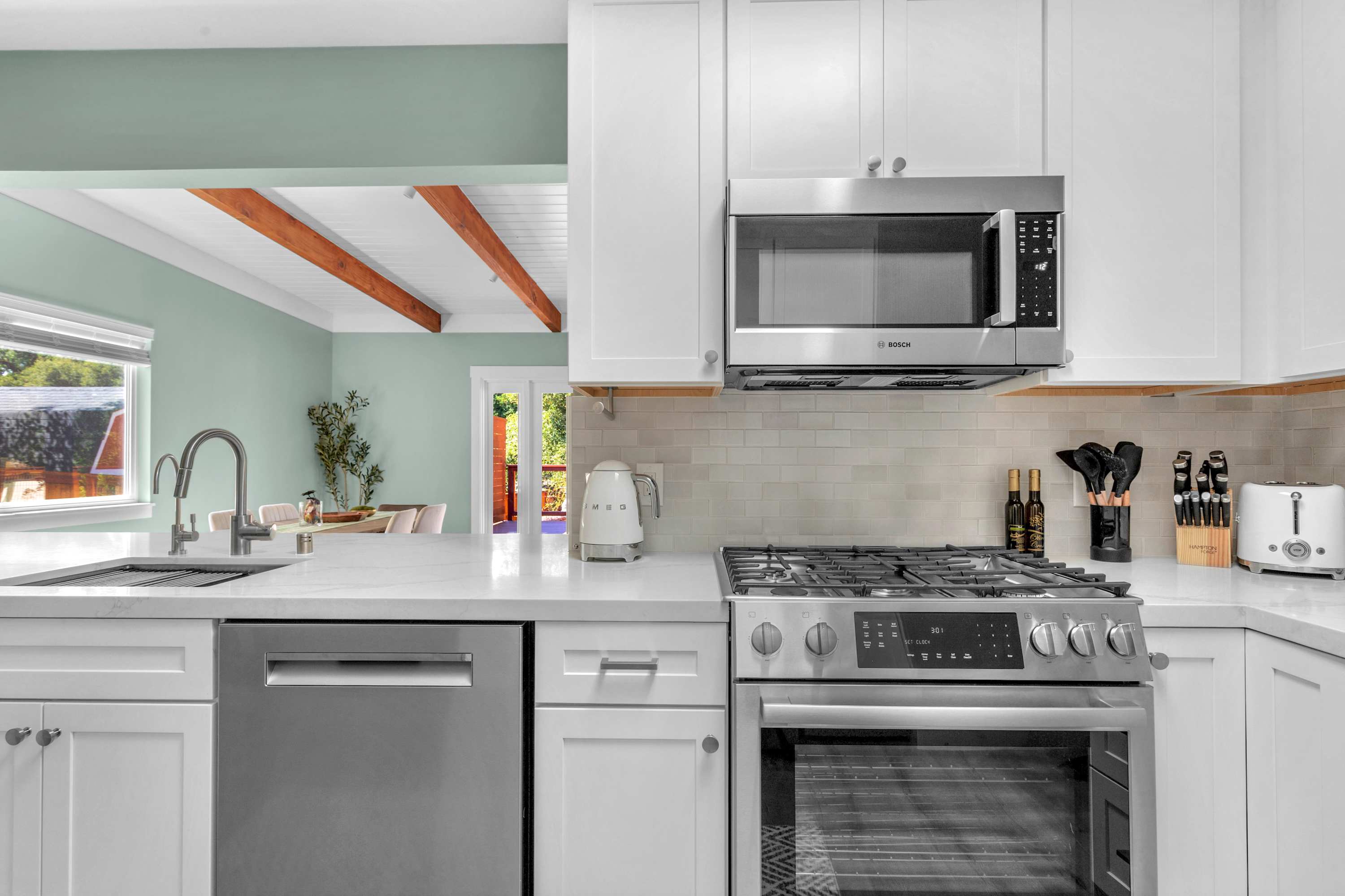 The designer kitchen is a chef's dream, outfitted with custom Schrock cabinets, quartz countertops, Heath Ceramics tile, and all-Bosch appliances, including a built-in fridge, dishwasher, microwave, and gas range.
