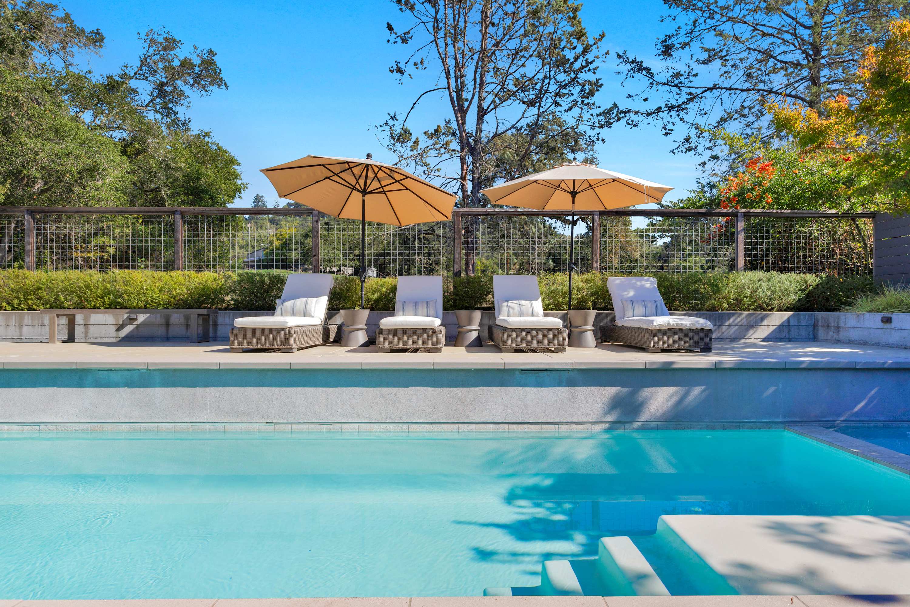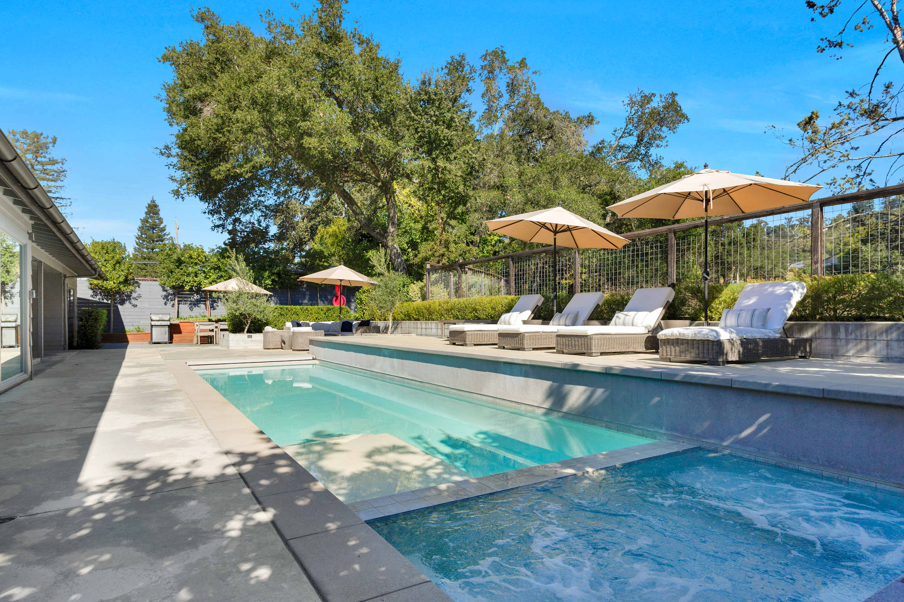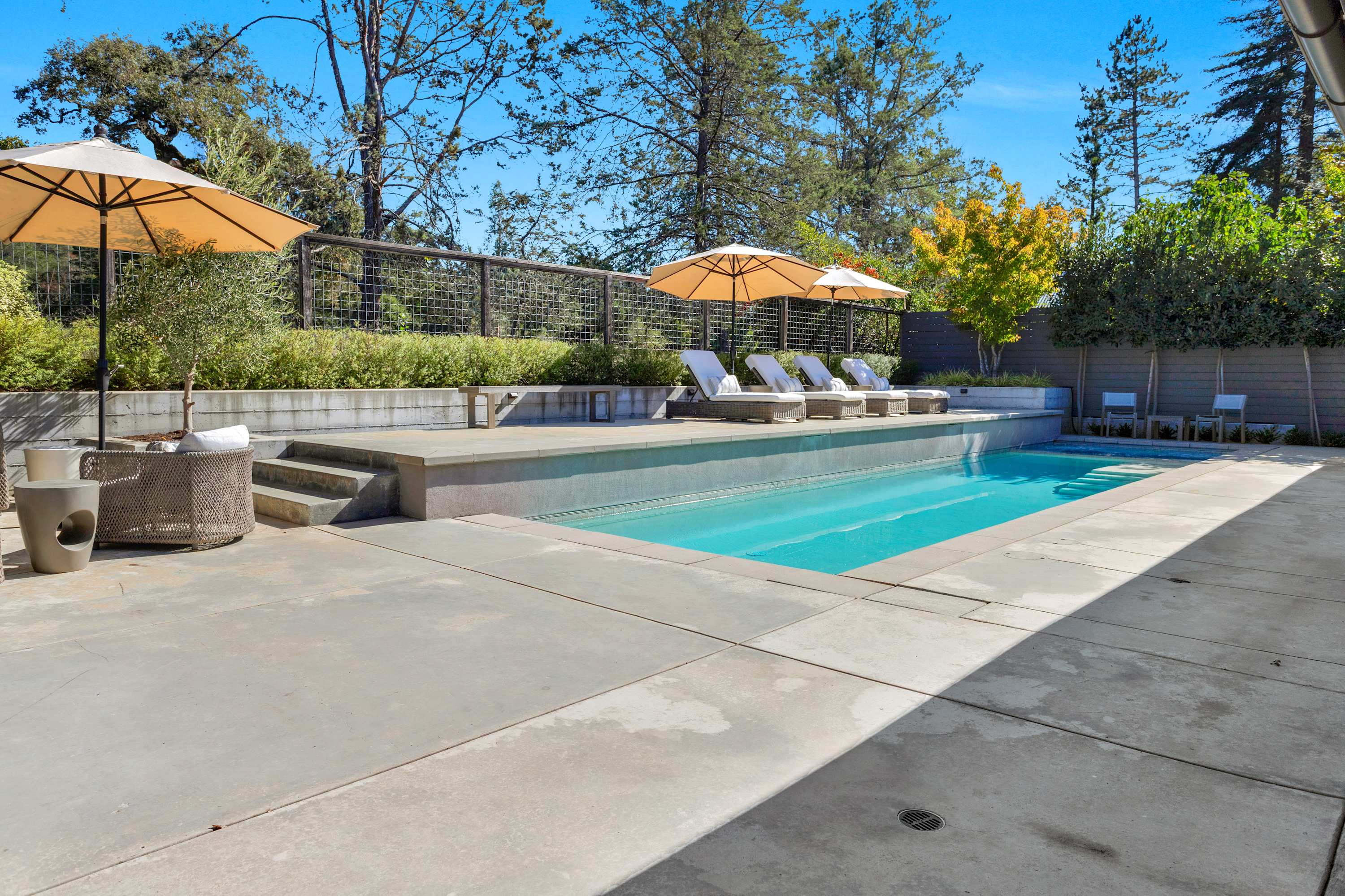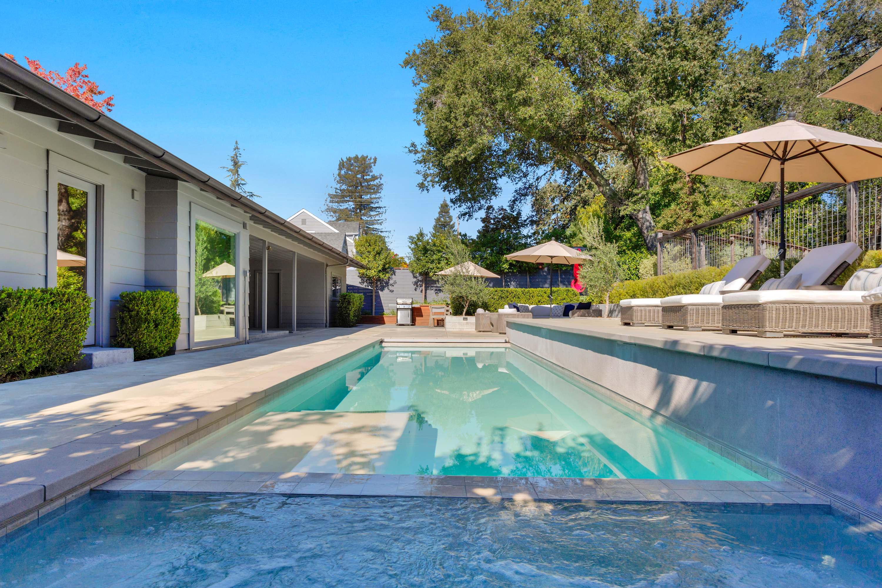 The outdoor areas are a true extension of the home, creating a multi-zone oasis for all-day enjoyment. The 40-foot heated pool with its inset spa is the centerpiece. Lounge on the surrounding chairs, or dine alfresco under the stars at the ten-person outdoor table. Nearby, a covered patio with a sofa, coffee table, and armchairs offers a shady retreat from the afternoon sun. As evening falls, the intimate fire pit area—complete with a comfortable sectional, chairs, and end tables for your drinks—becomes the main attraction.