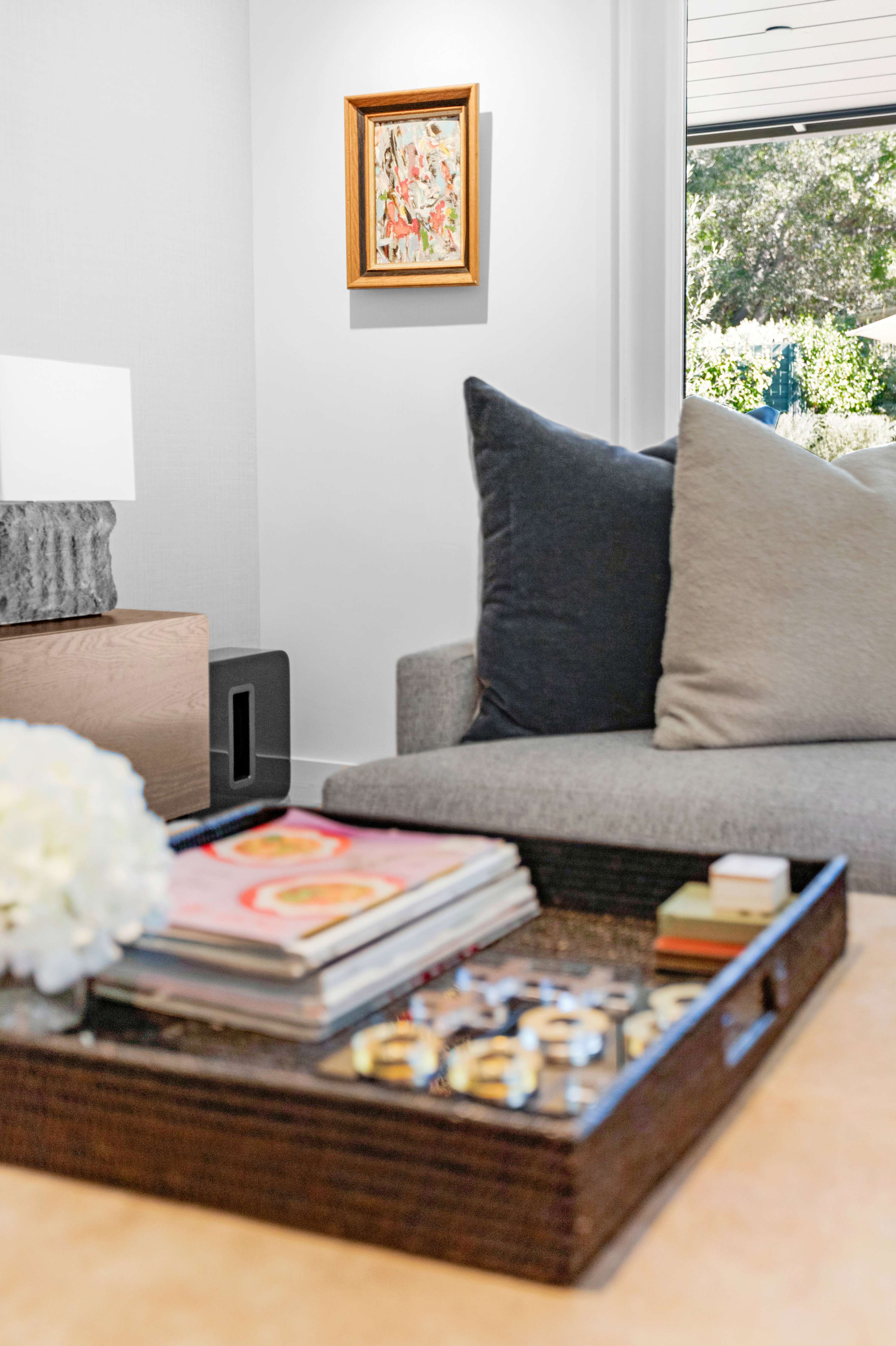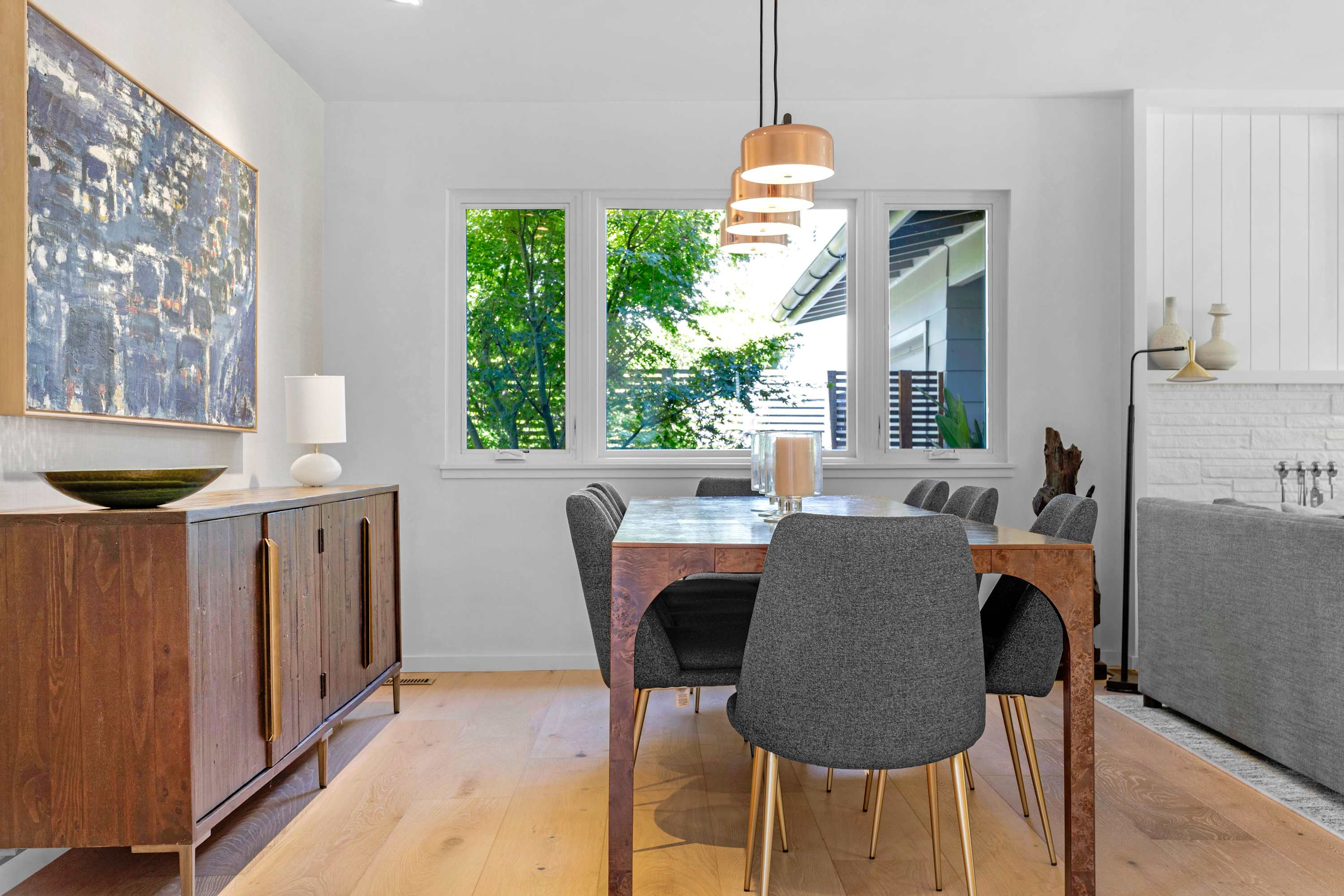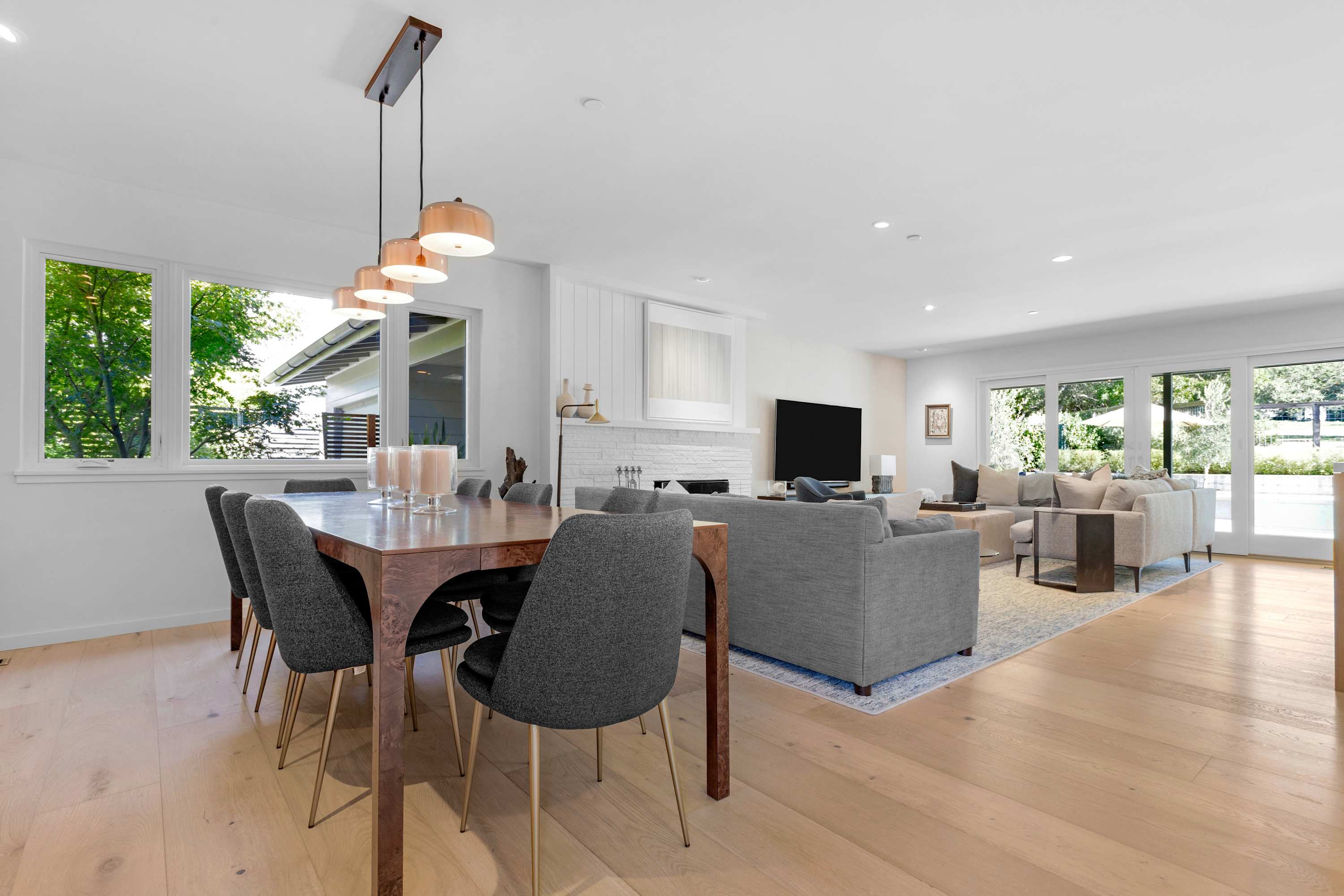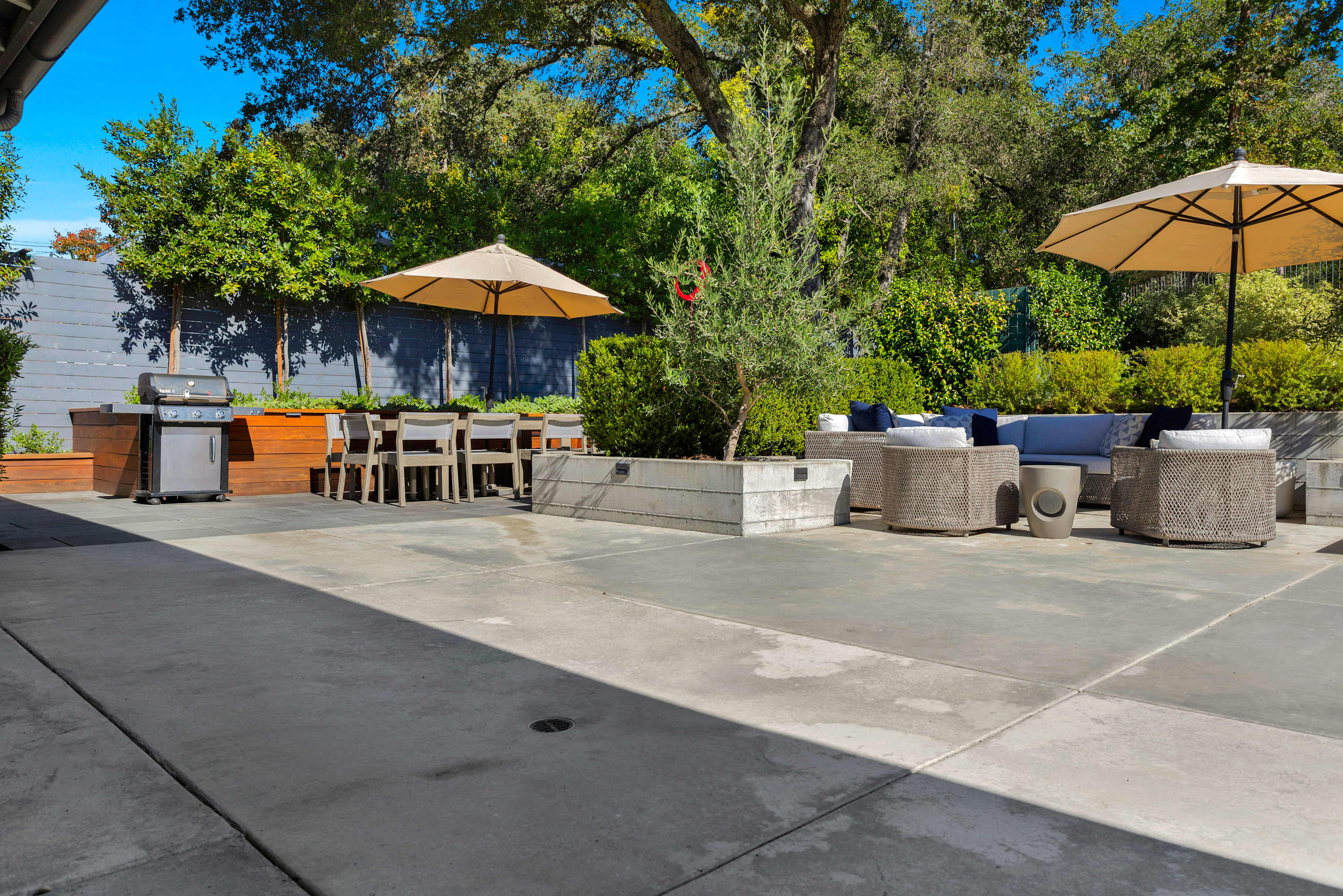 The outdoor areas are a true extension of the home, creating a multi-zone oasis for all-day enjoyment. The 40-foot heated pool with its inset spa is the centerpiece. Lounge on the surrounding chairs, or dine alfresco under the stars at the ten-person outdoor table. Nearby, a covered patio with a sofa, coffee table, and armchairs offers a shady retreat from the afternoon sun. As evening falls, the intimate fire pit area—complete with a comfortable sectional, chairs, and end tables for your drinks—becomes the main attraction.