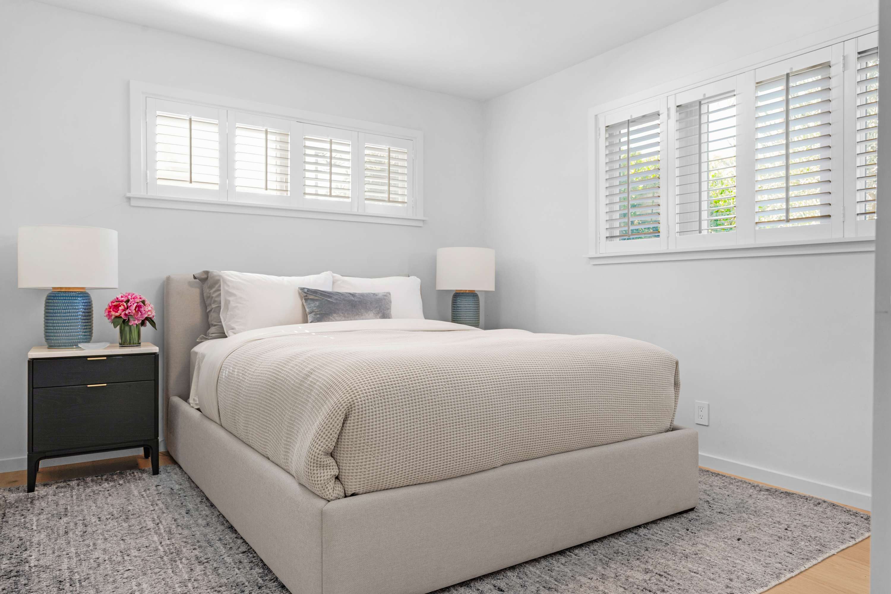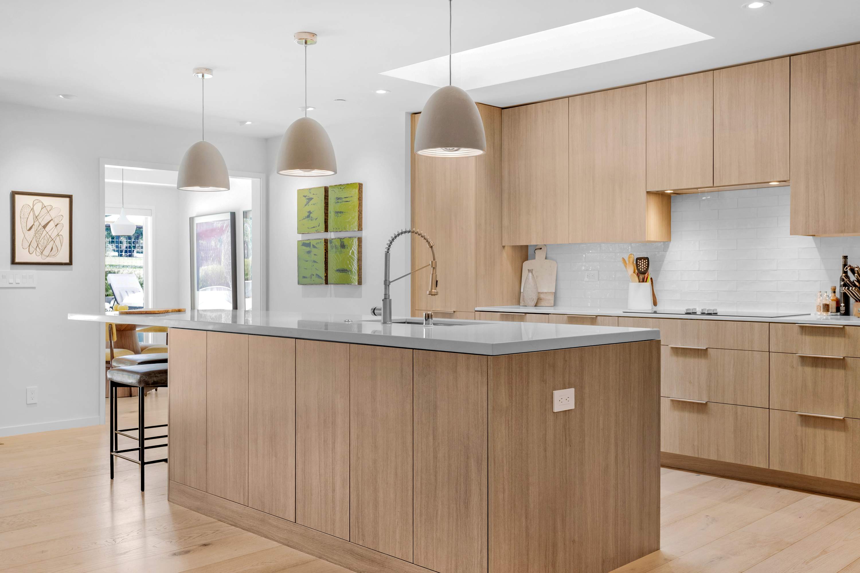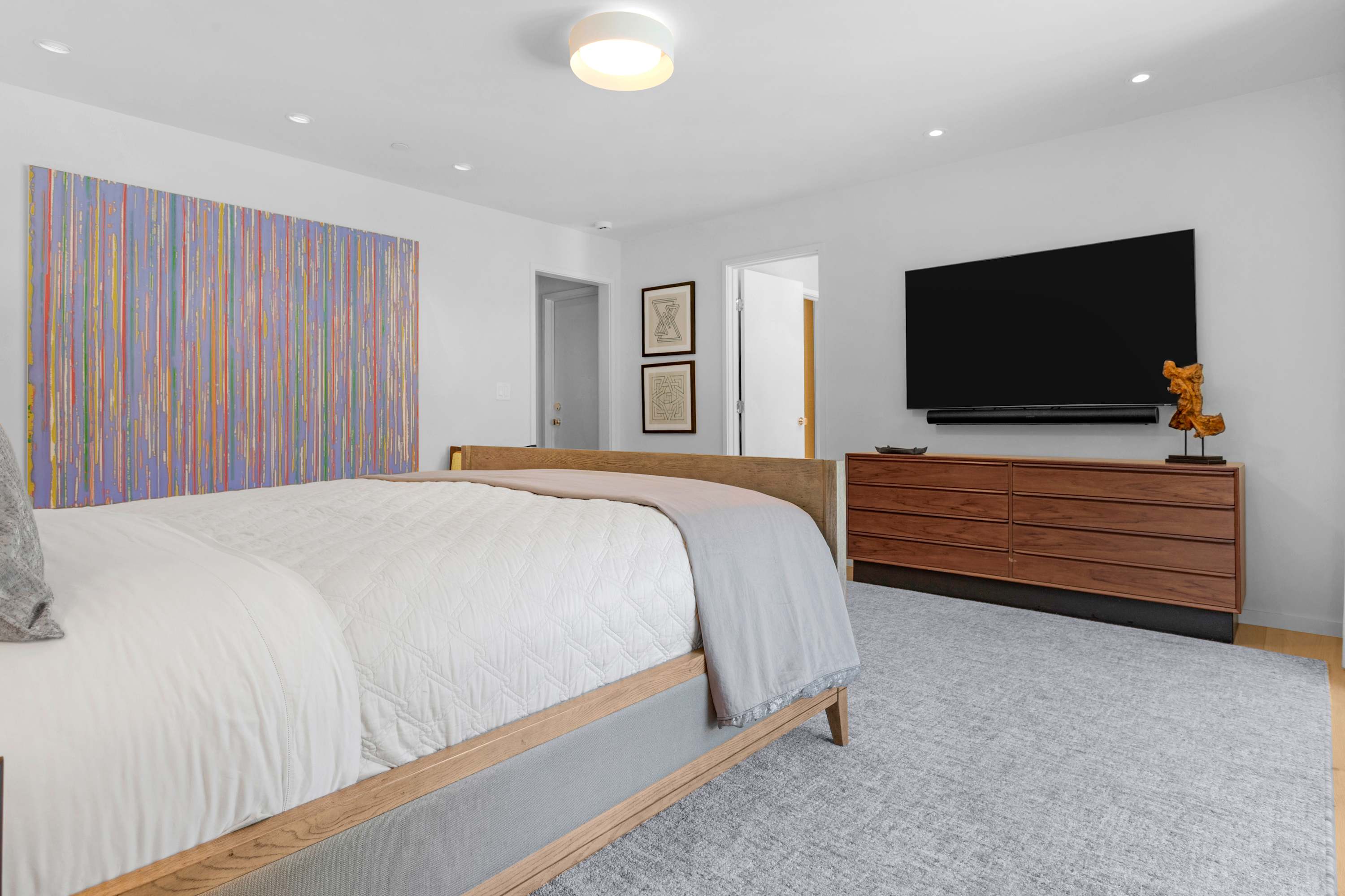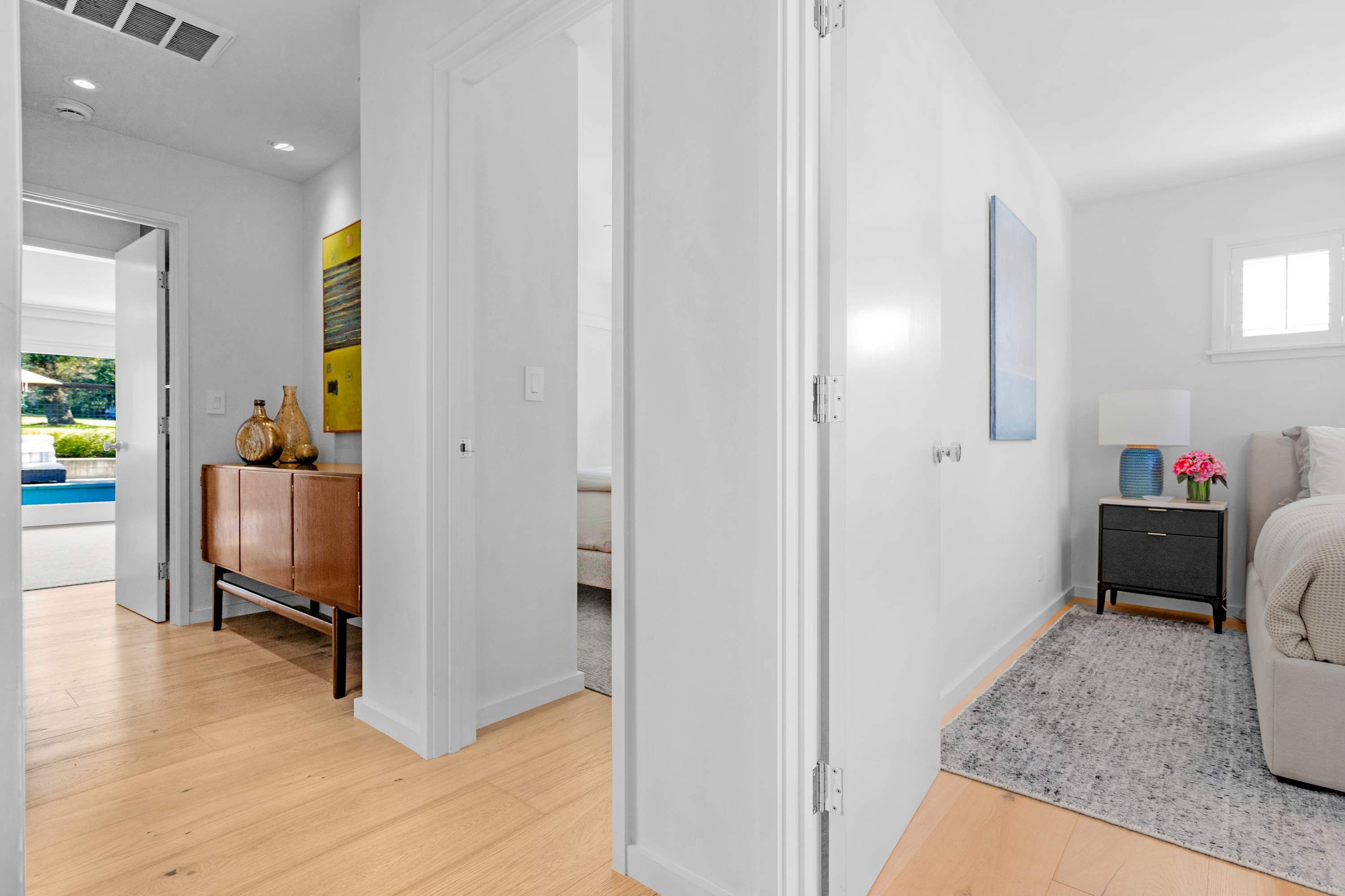 Two additional guest rooms offer quiet, private spaces. One features a comfortable king bed with a simple, contemporary design, while the other is a bright, light-filled room with a queen bed. They share a hall bathroom that continues the home’s clean design with beautiful light wood and high-end finishes.