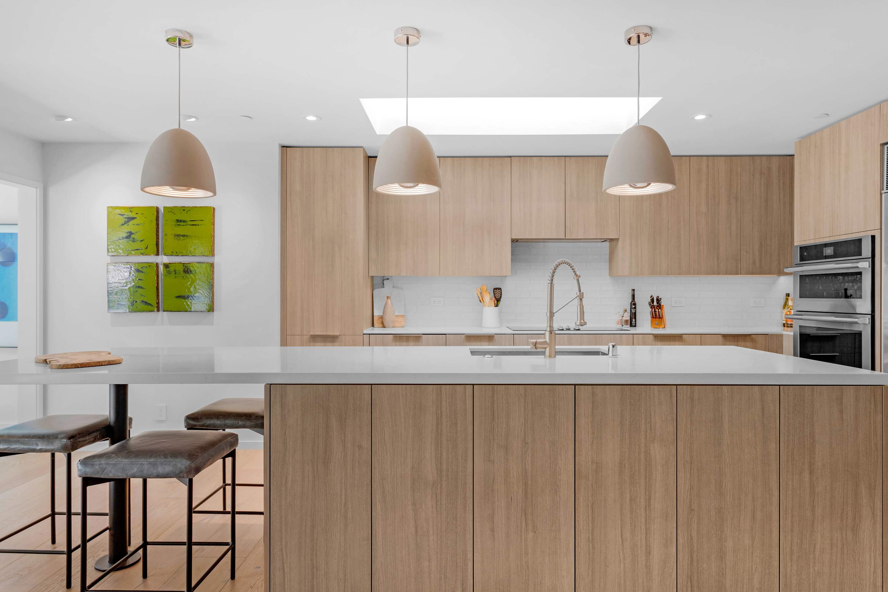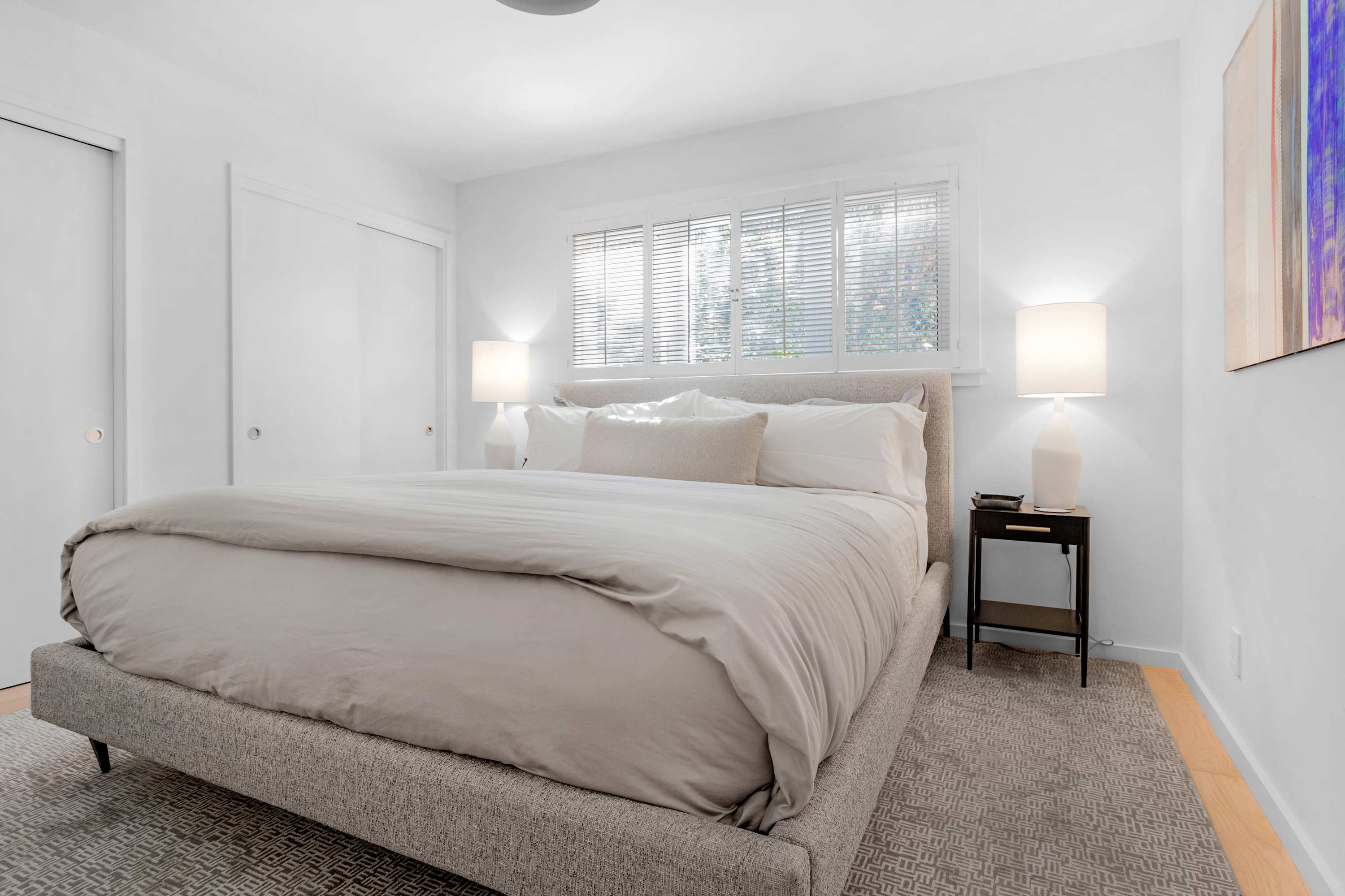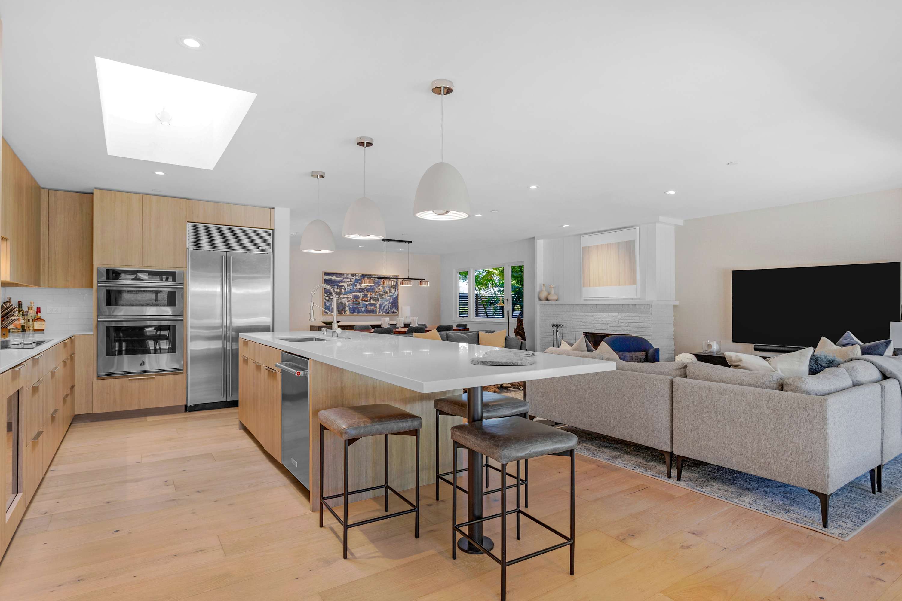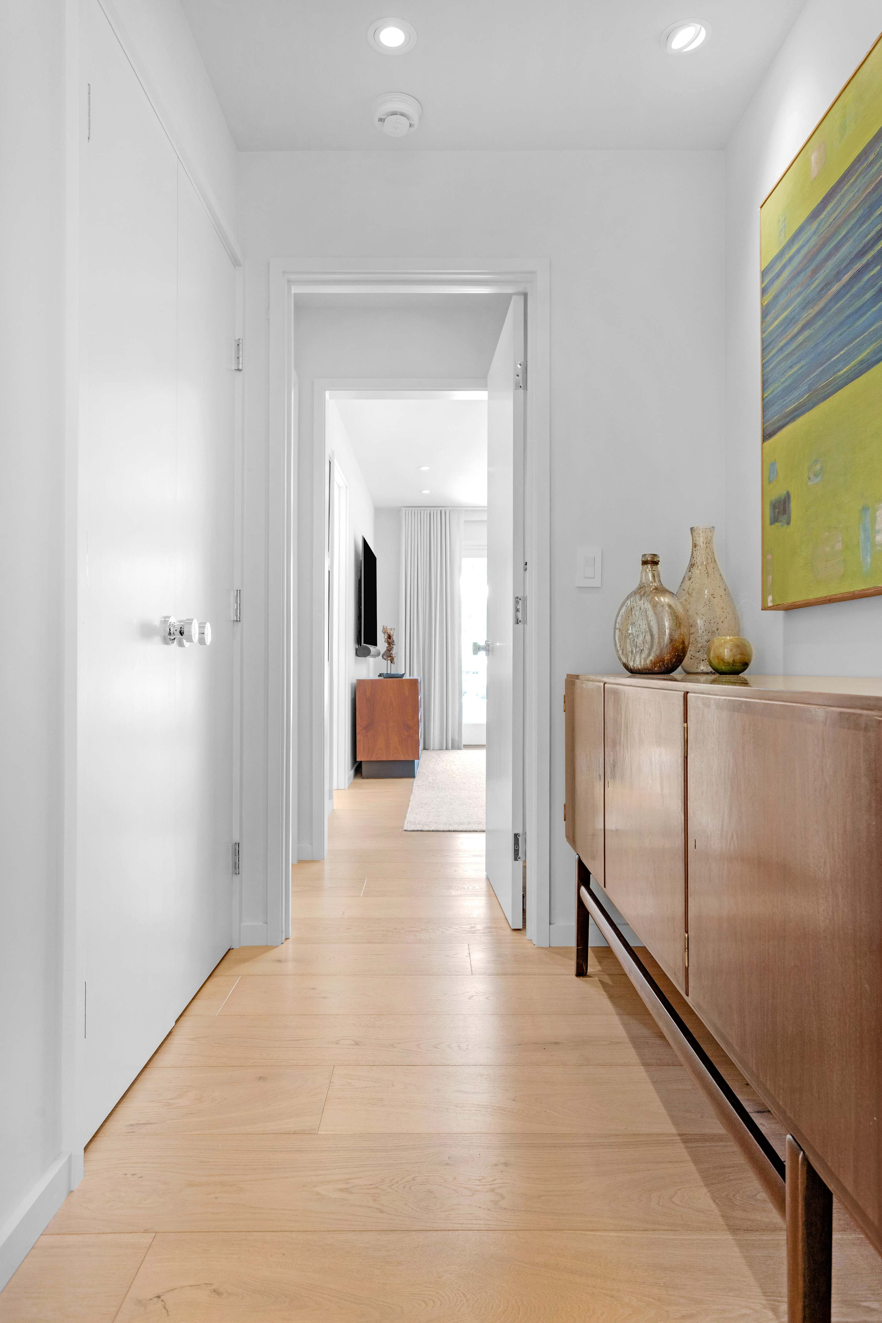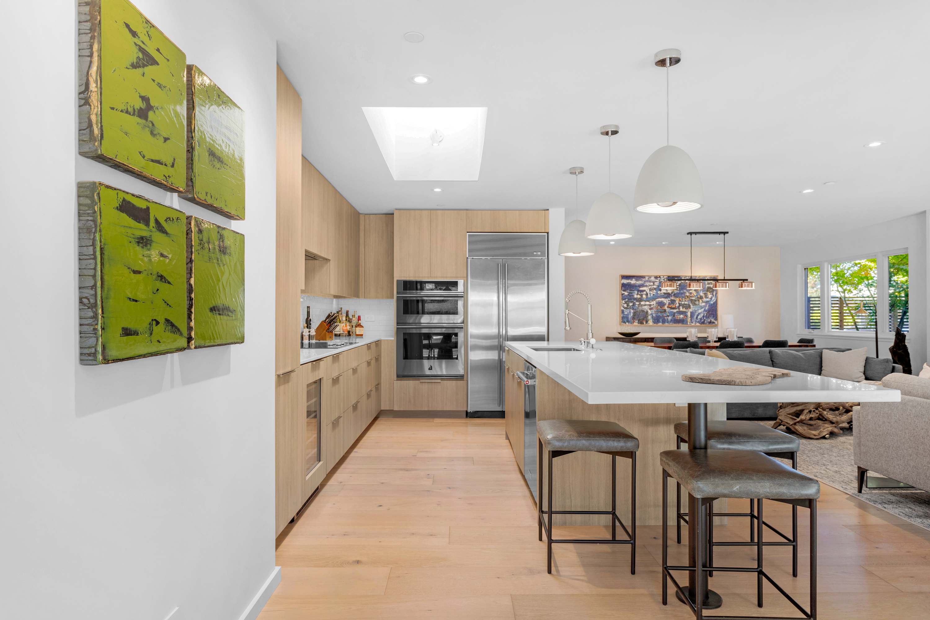Two additional guest rooms offer quiet, private spaces. One features a comfortable king bed with a simple, contemporary design, while the other is a bright, light-filled room with a queen bed. They share a hall bathroom that continues the home’s clean design with beautiful light wood and high-end finishes.