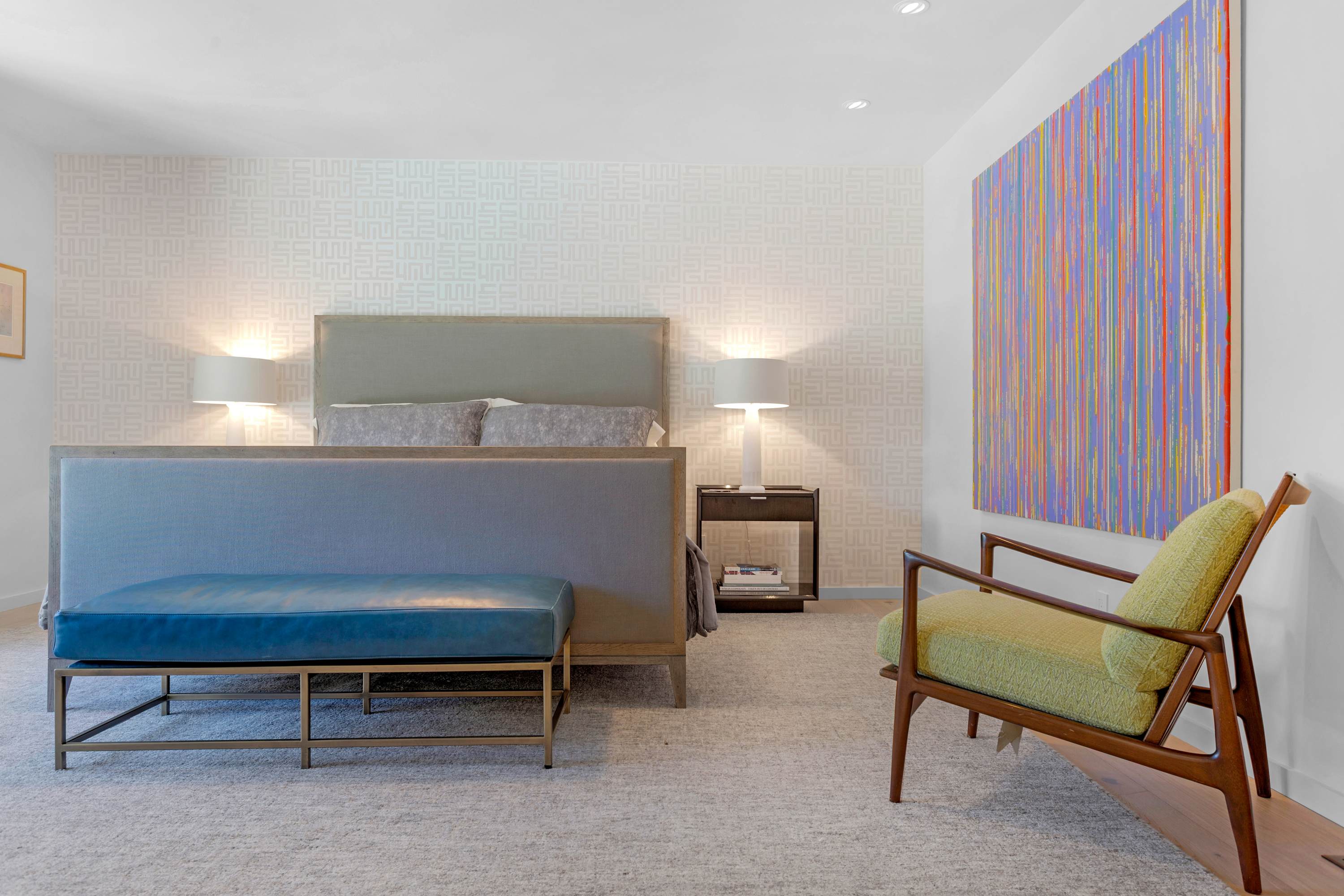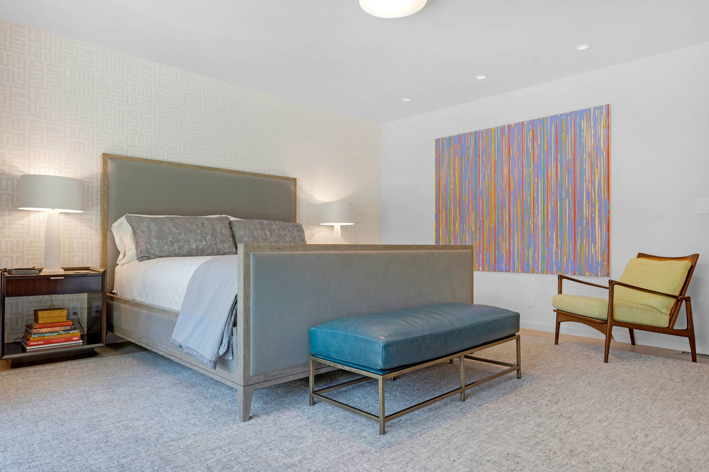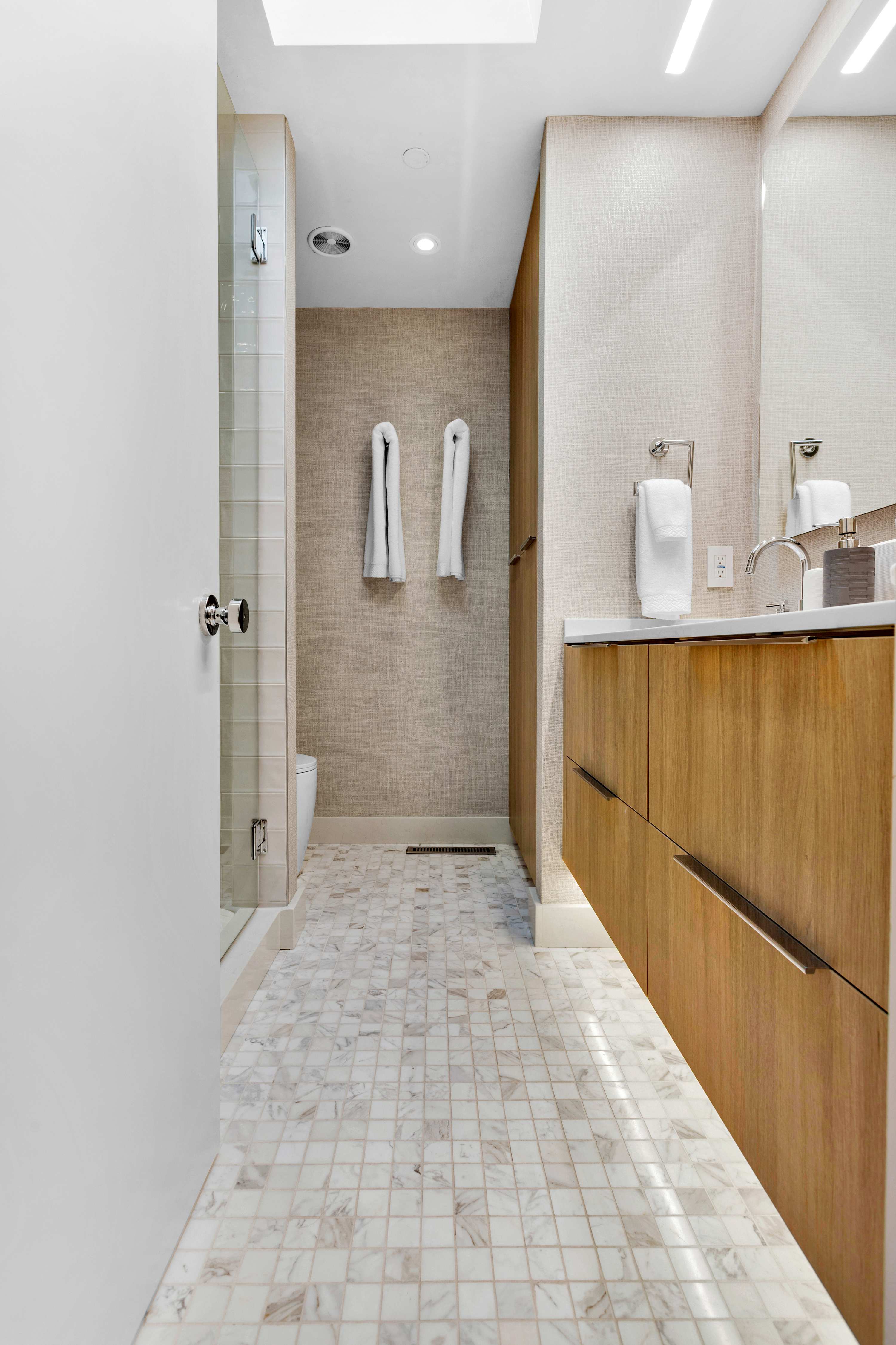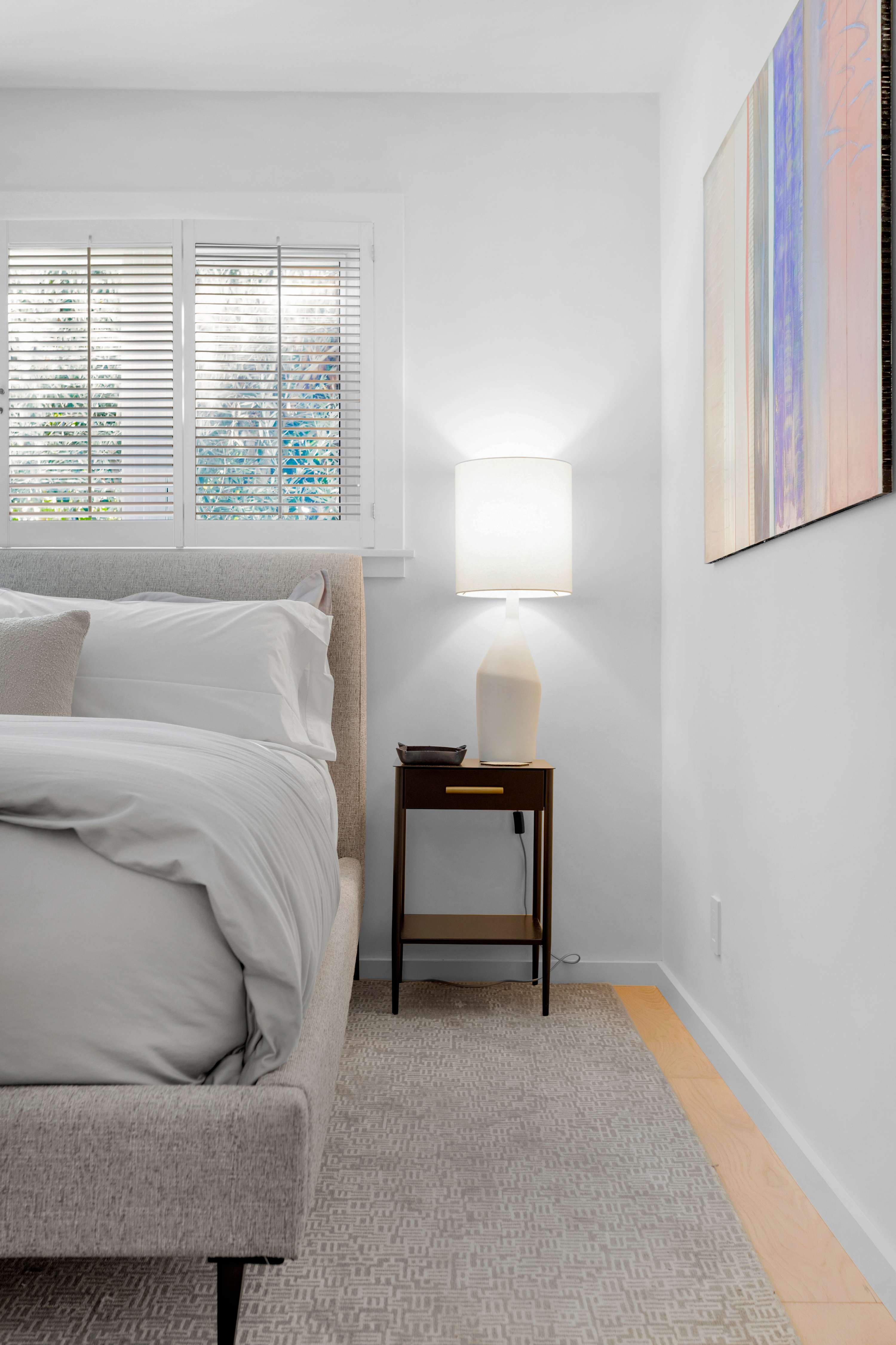 Two additional guest rooms offer quiet, private spaces. One features a comfortable king bed with a simple, contemporary design, while the other is a bright, light-filled room with a queen bed. They share a hall bathroom that continues the home’s clean design with beautiful light wood and high-end finishes.