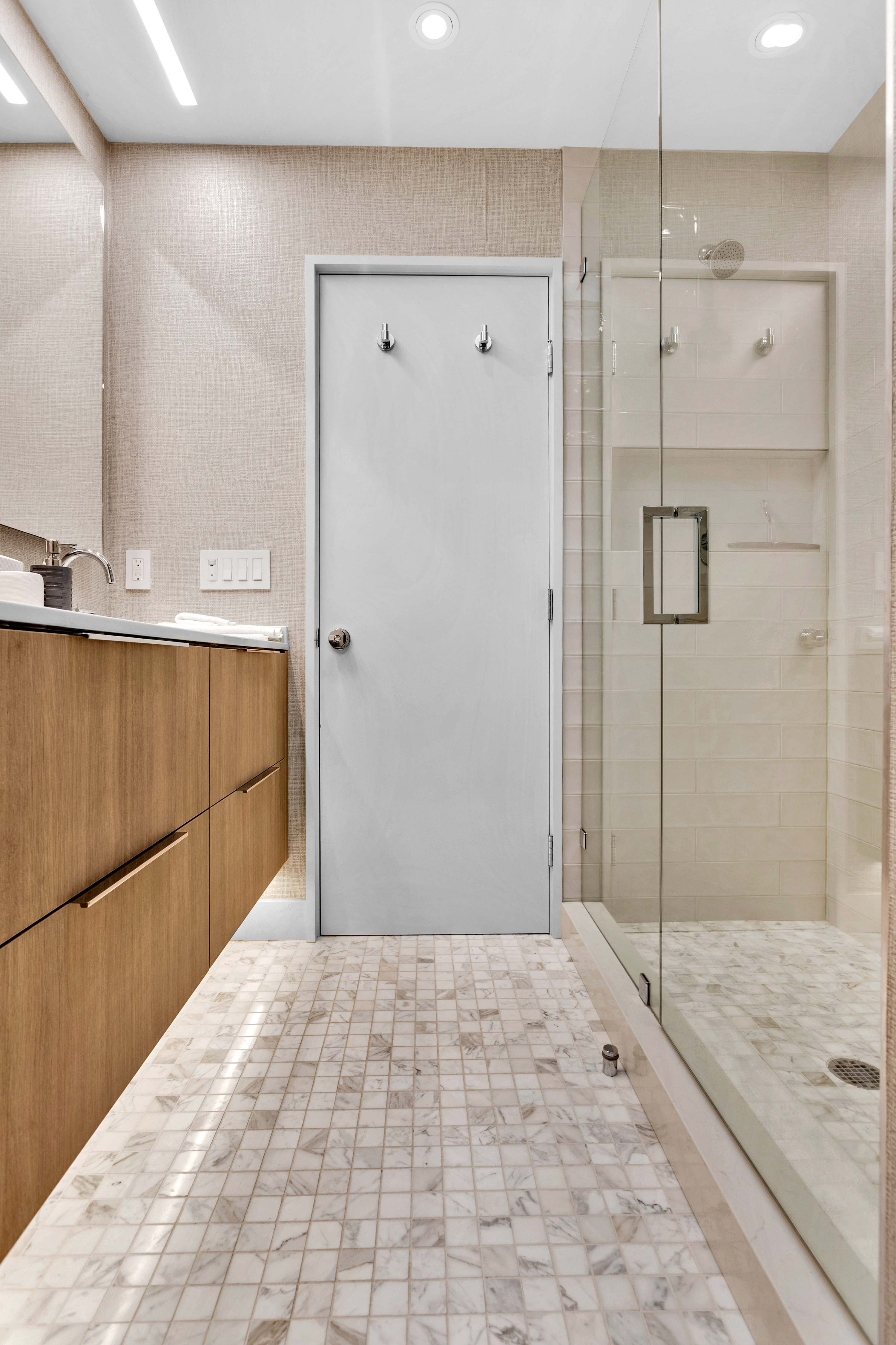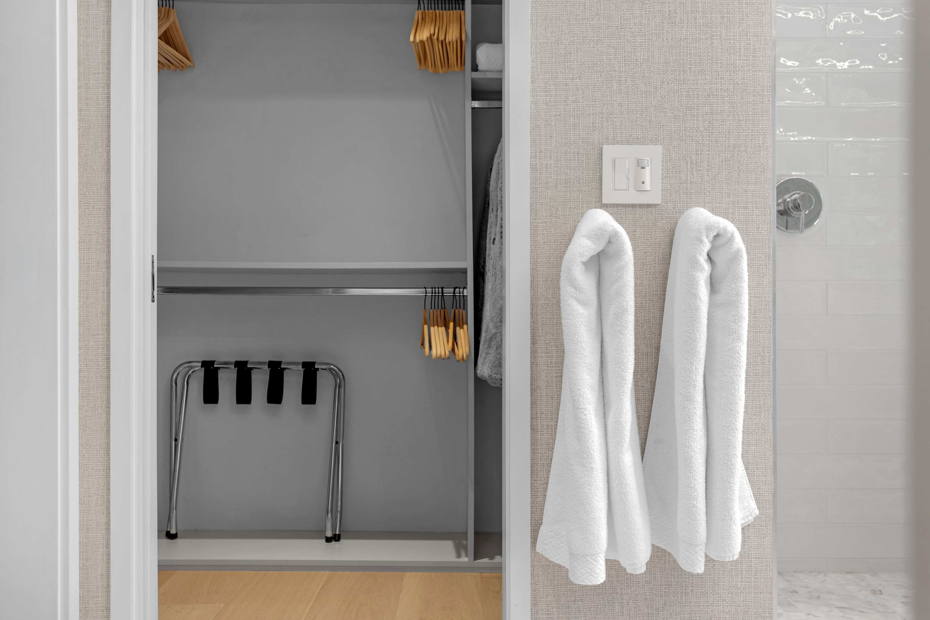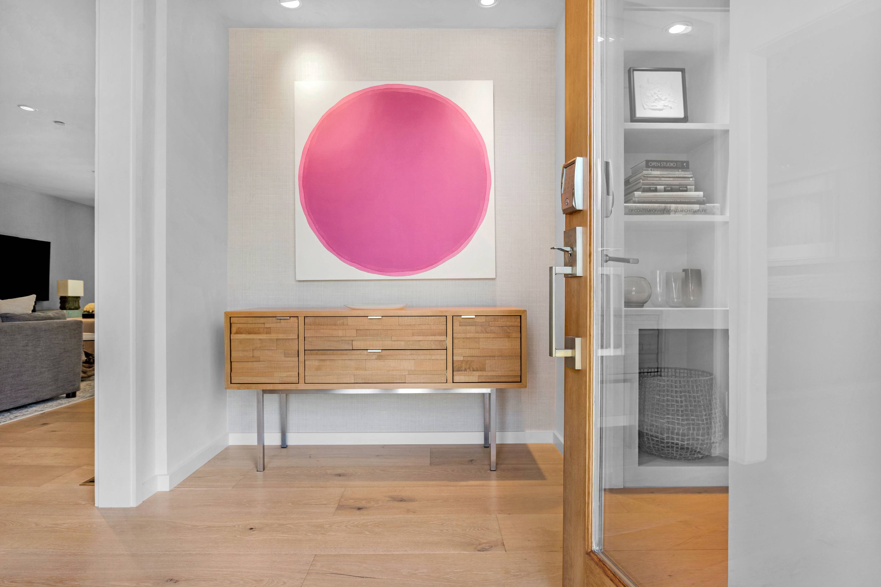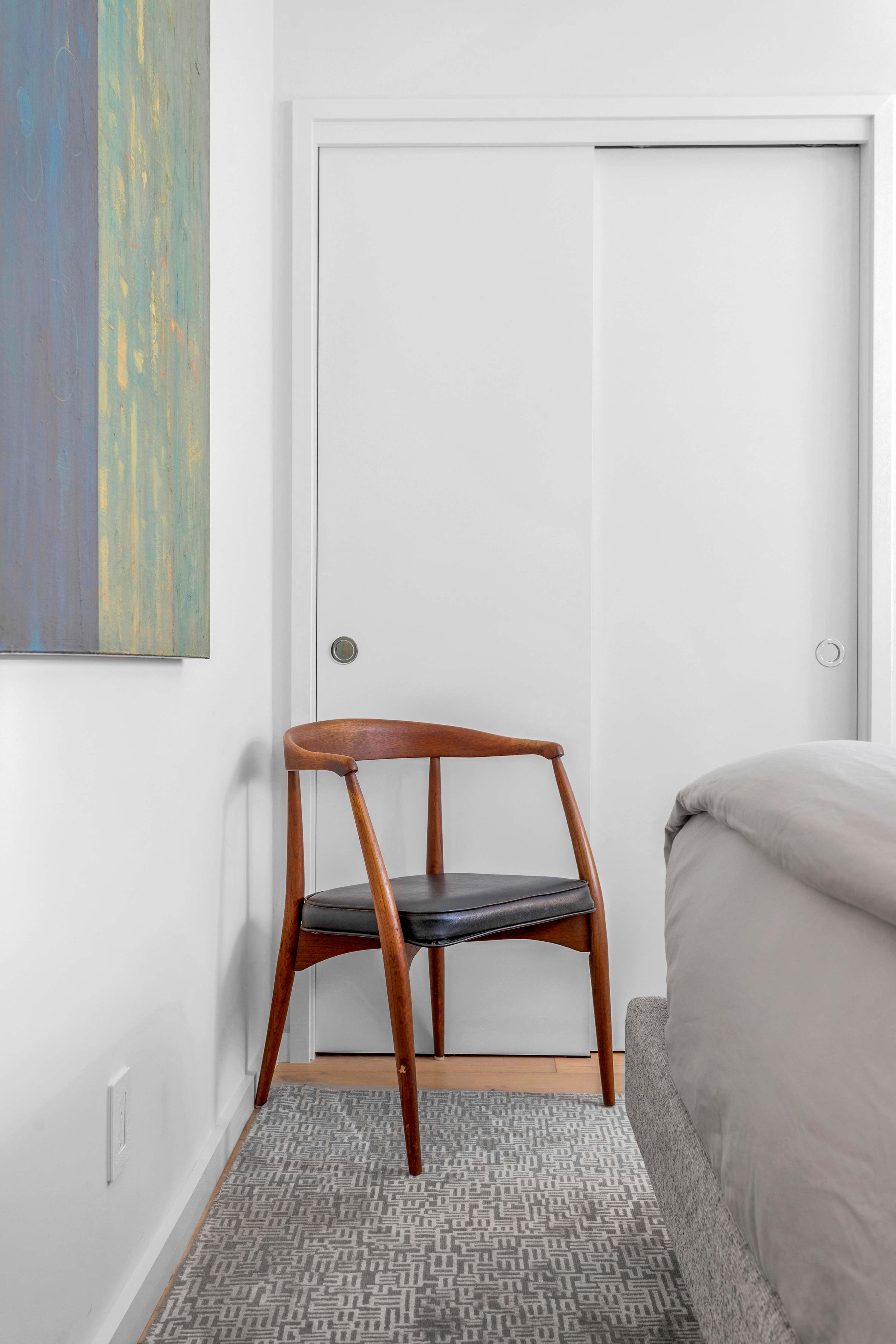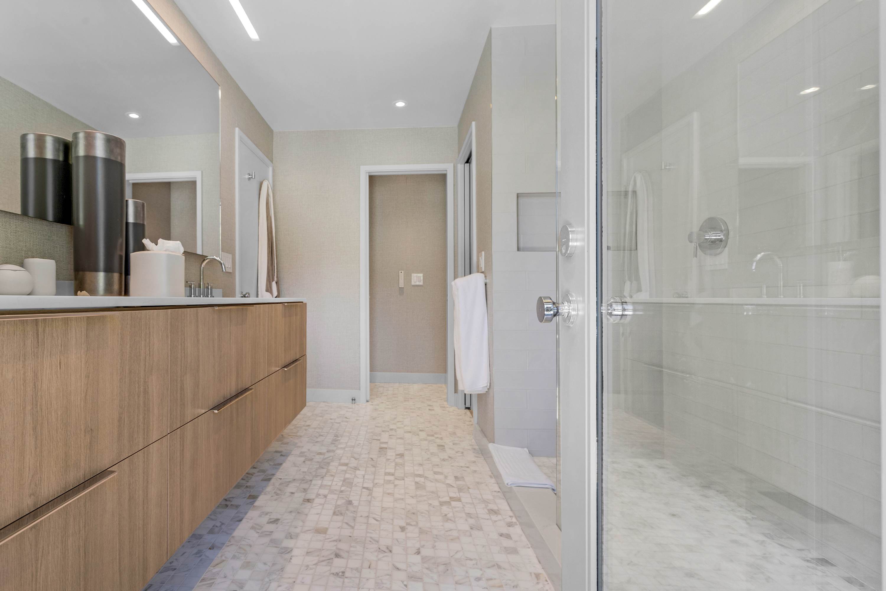 Two additional guest rooms offer quiet, private spaces. One features a comfortable king bed with a simple, contemporary design, while the other is a bright, light-filled room with a queen bed. They share a hall bathroom that continues the home’s clean design with beautiful light wood and high-end finishes.