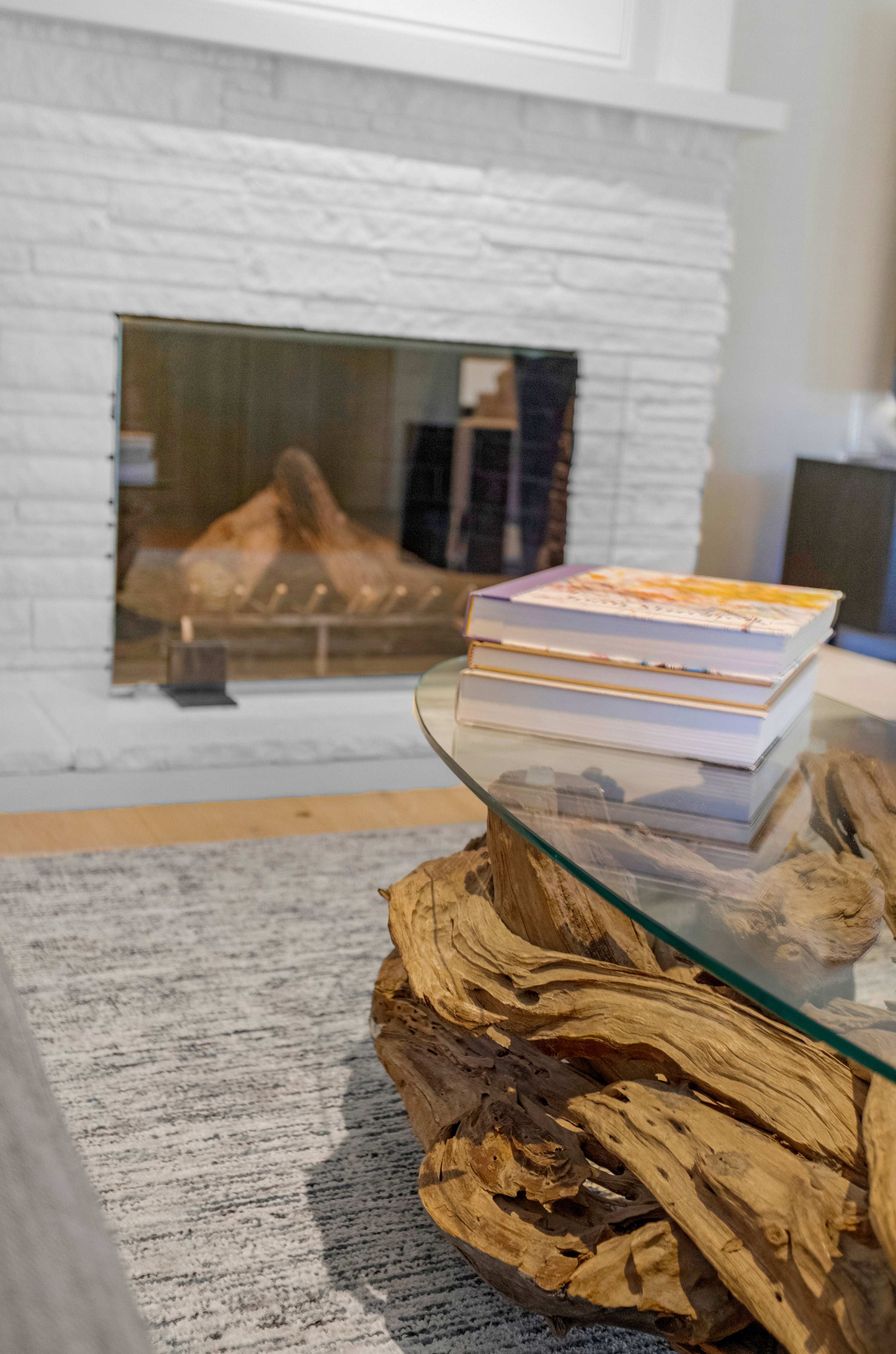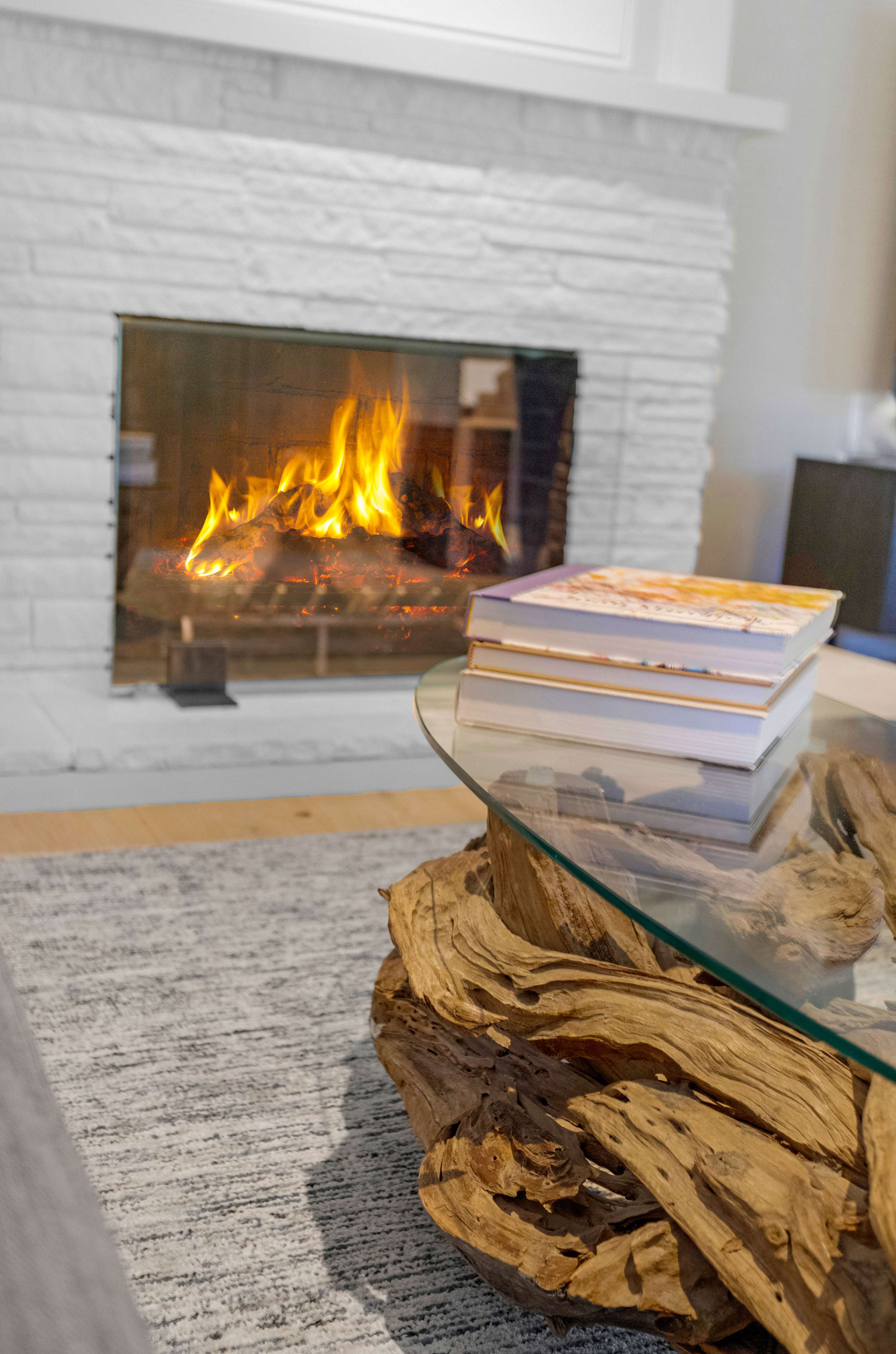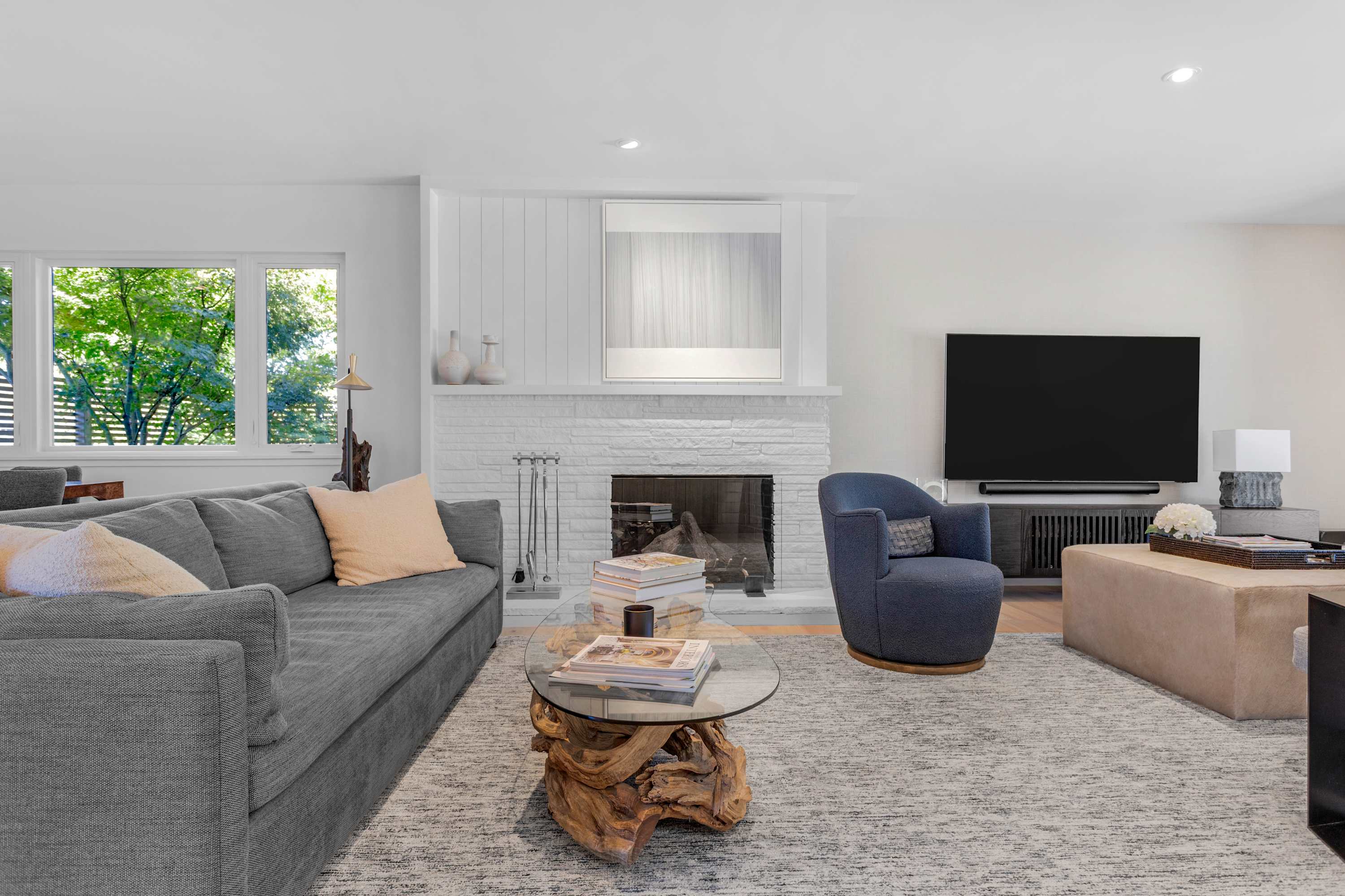 The living room, centered under a vaulted ceiling, is cleverly designed with two distinct seating areas to suit any mood. One area is arranged around the fireplace, inviting lively conversation or quiet reflection. The other is a dedicated media lounge focused on the 8K flatscreen TV, complete with premium cable channels for an immersive movie night experience.
