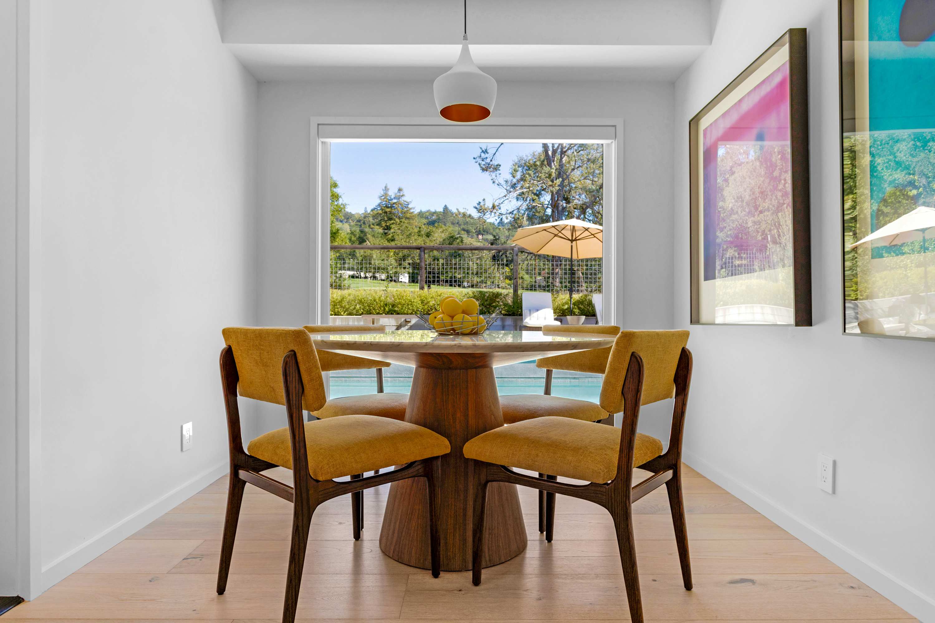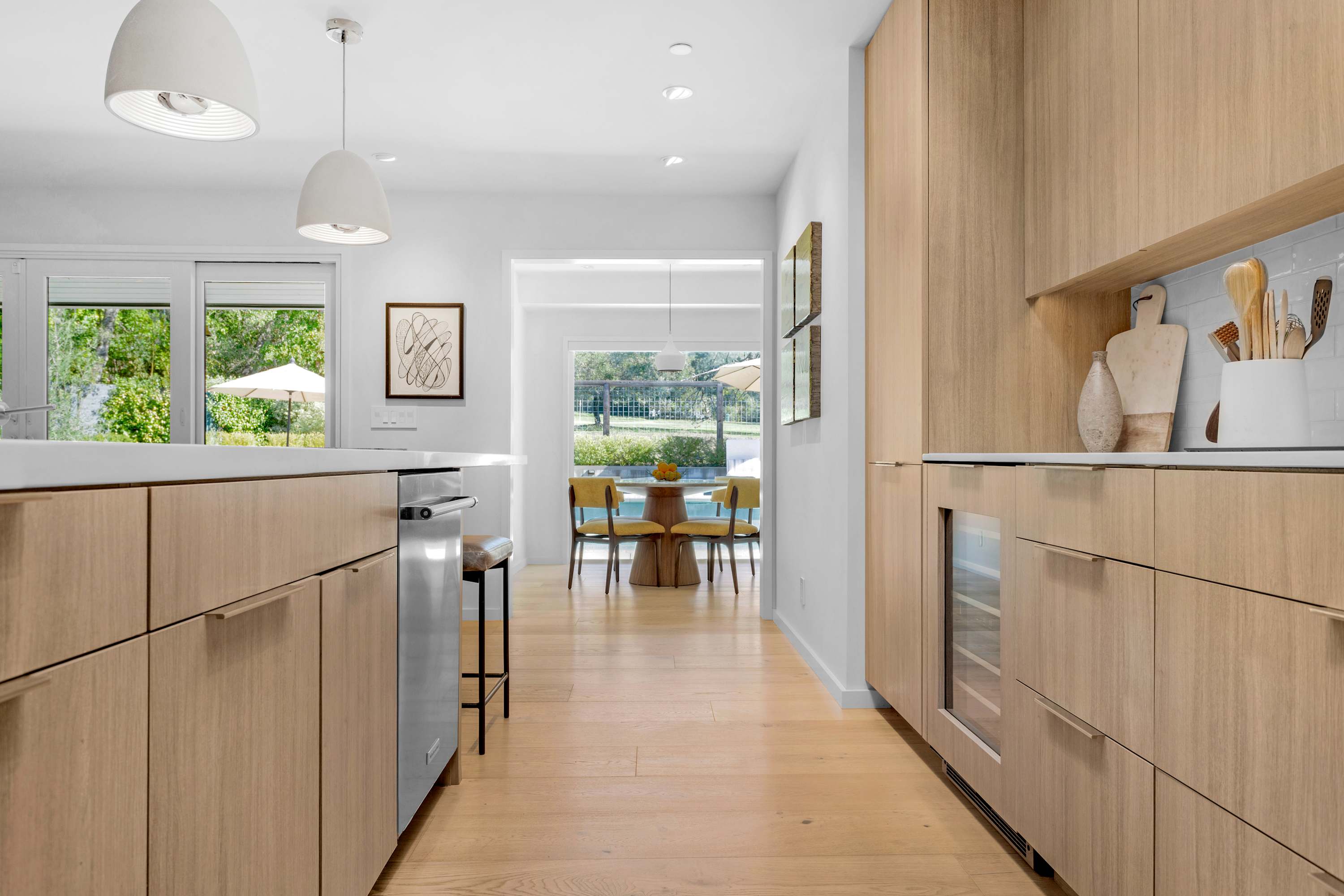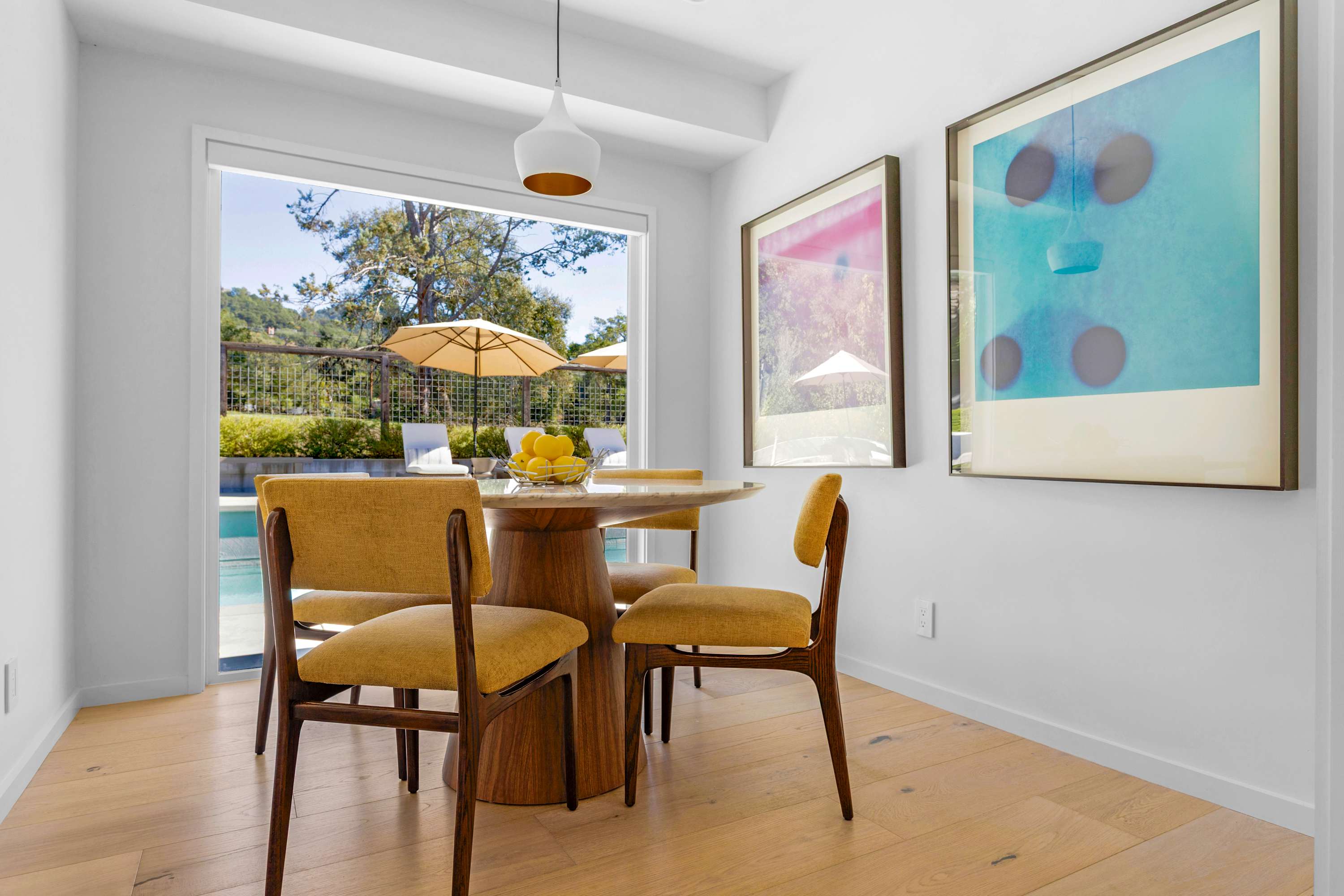Across the open space, the gourmet kitchen serves as the social heart of the home. The host is always part of the action, whether preparing a meal at the large center island—lit by modern pendant lights—or grabbing a bottle from the wine fridge. Adjacent, a cheerful breakfast nook with sunshine-yellow chairs offers the perfect spot to start your day overlooking the pool. For more formal gatherings, the dining area seats eight under a unique, contemporary chandelier.