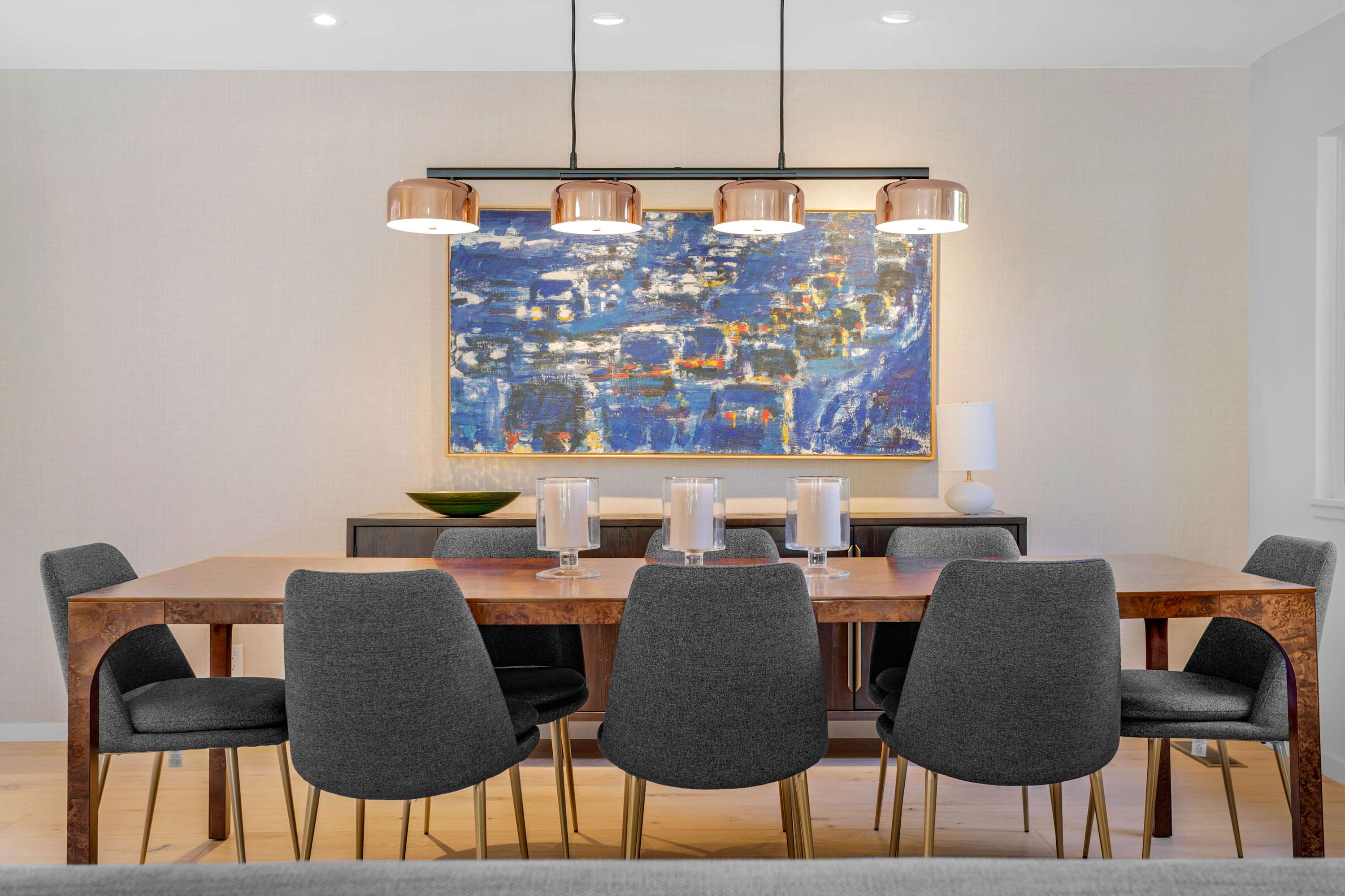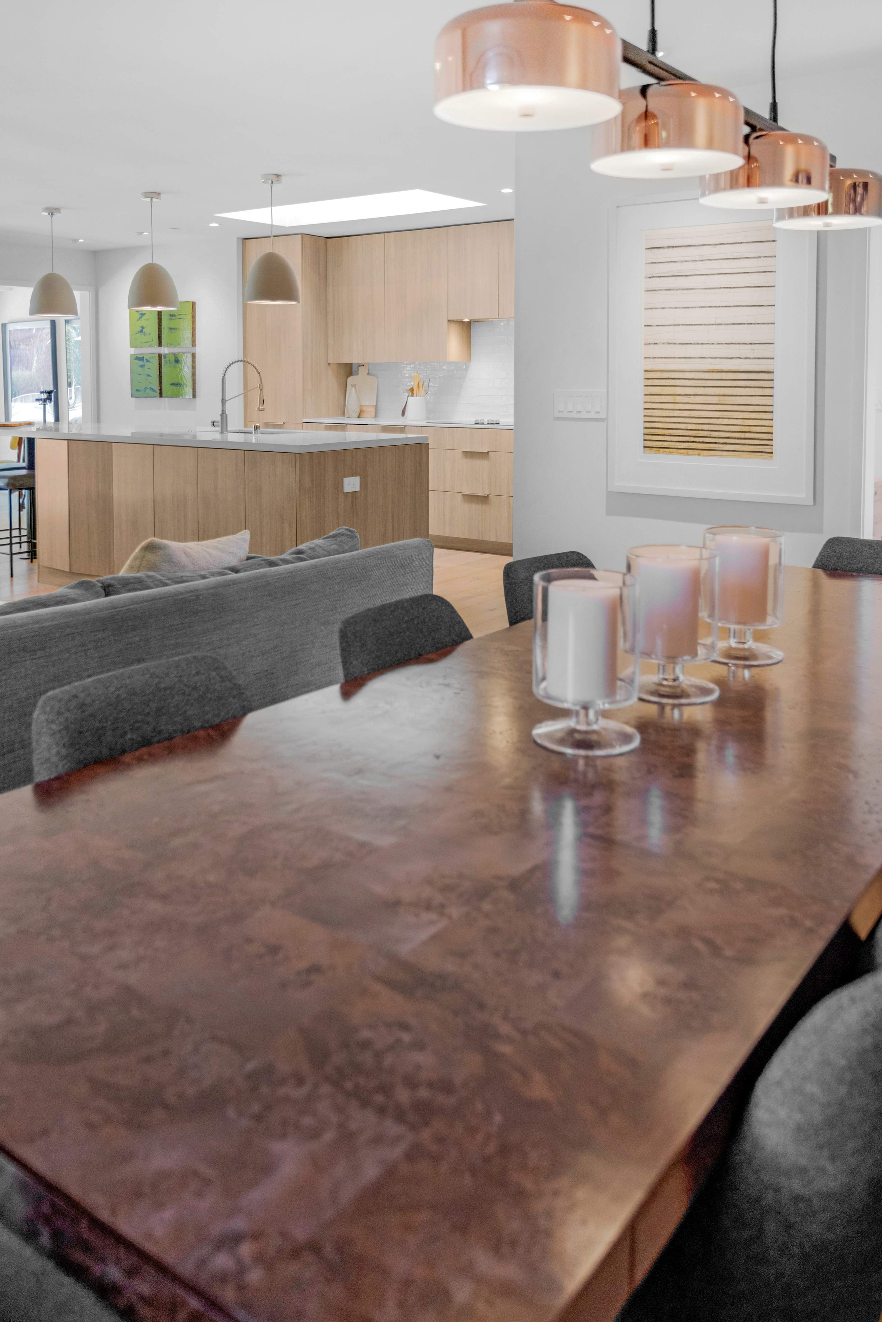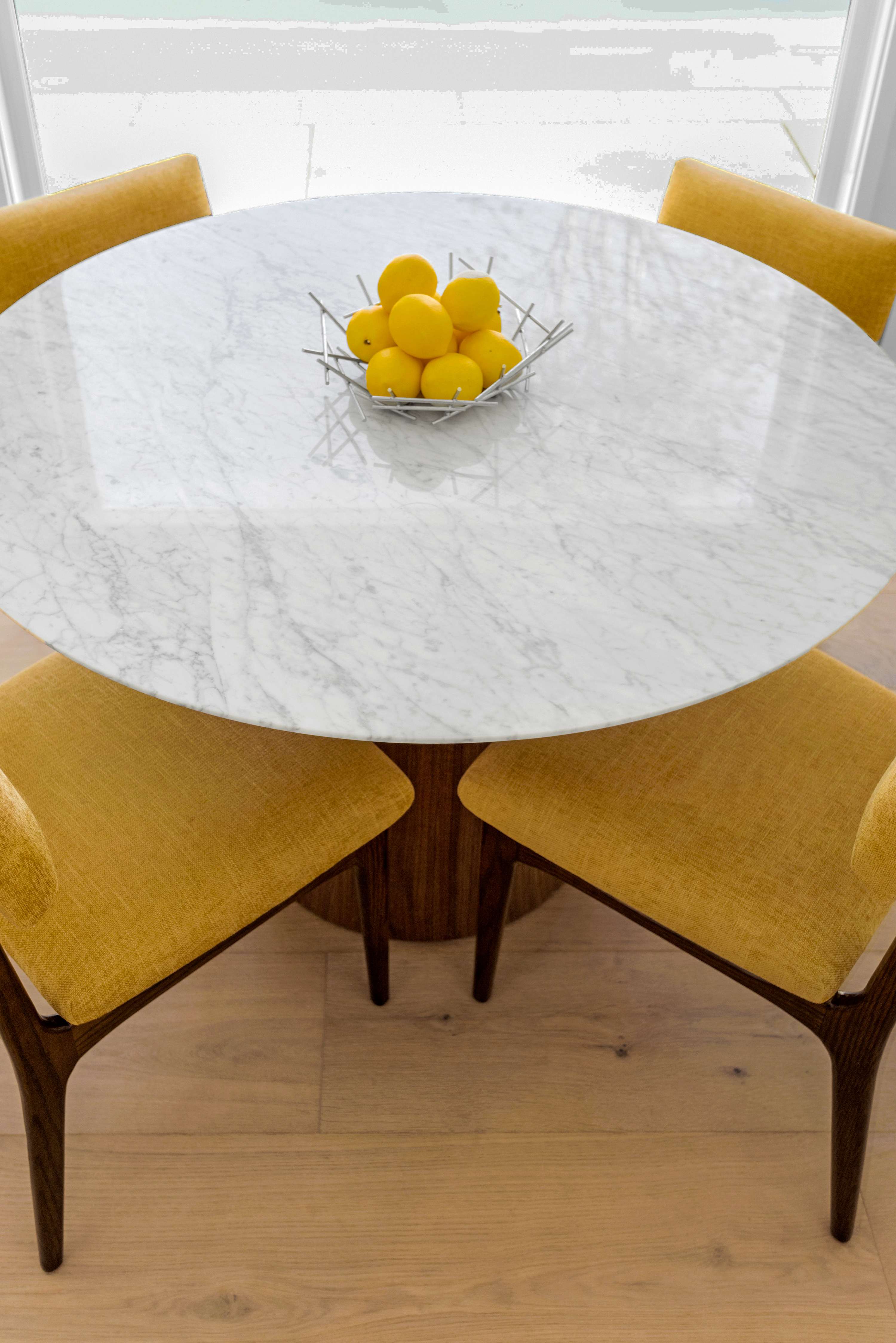 Across the open space, the gourmet kitchen serves as the social heart of the home. The host is always part of the action, whether preparing a meal at the large center island—lit by modern pendant lights—or grabbing a bottle from the wine fridge. Adjacent, a cheerful breakfast nook with sunshine-yellow chairs offers the perfect spot to start your day overlooking the pool. For more formal gatherings, the dining area seats eight under a unique, contemporary chandelier.