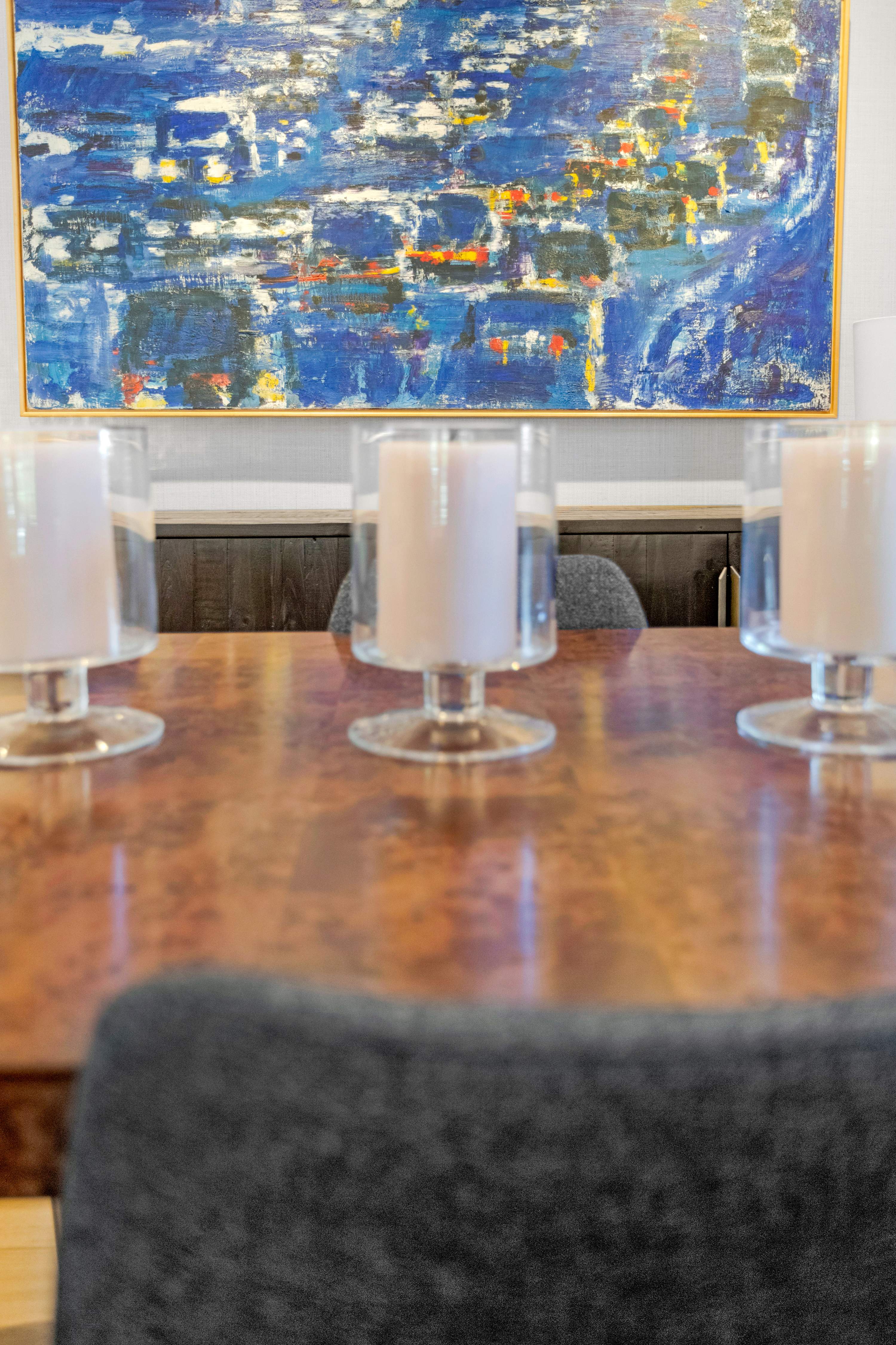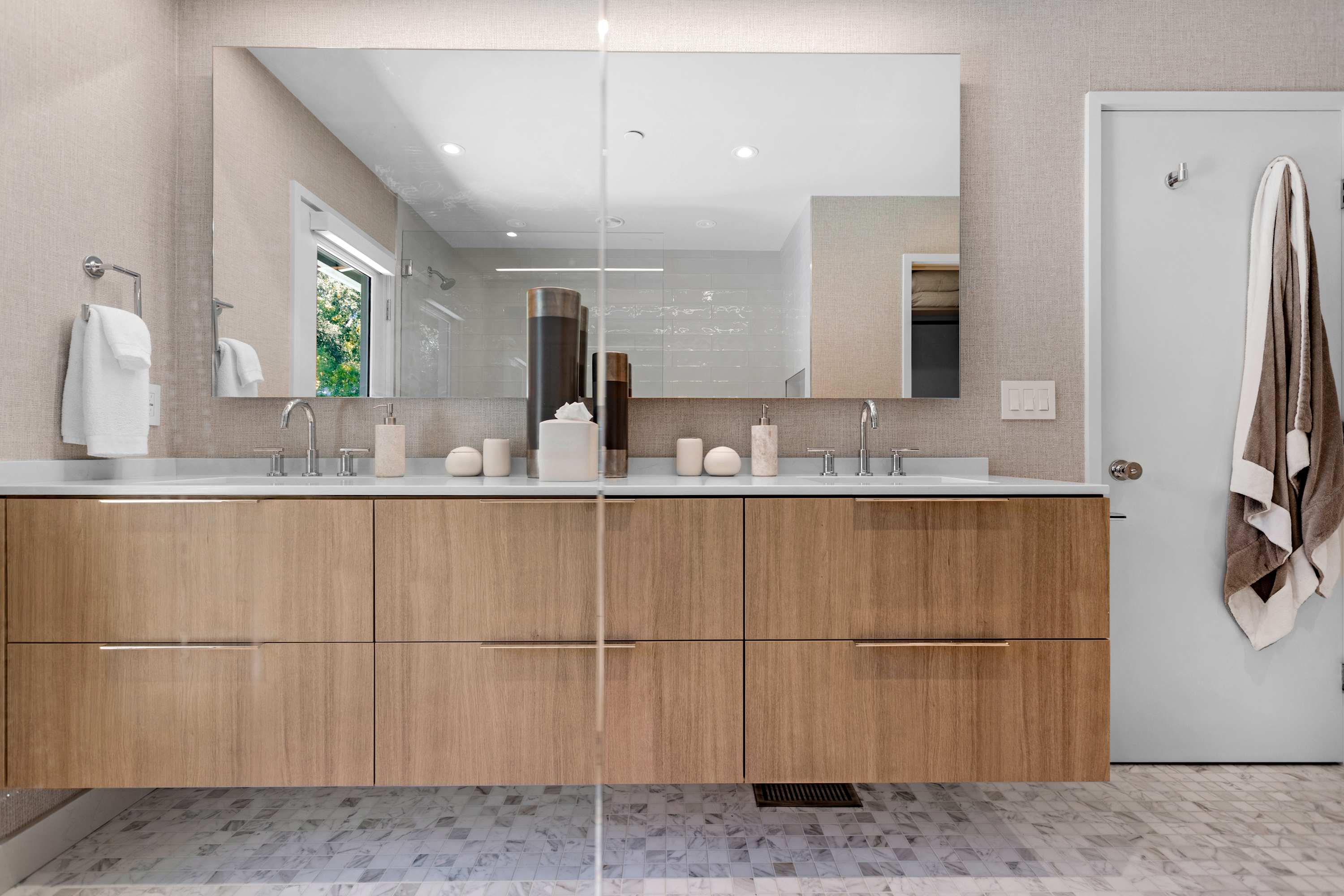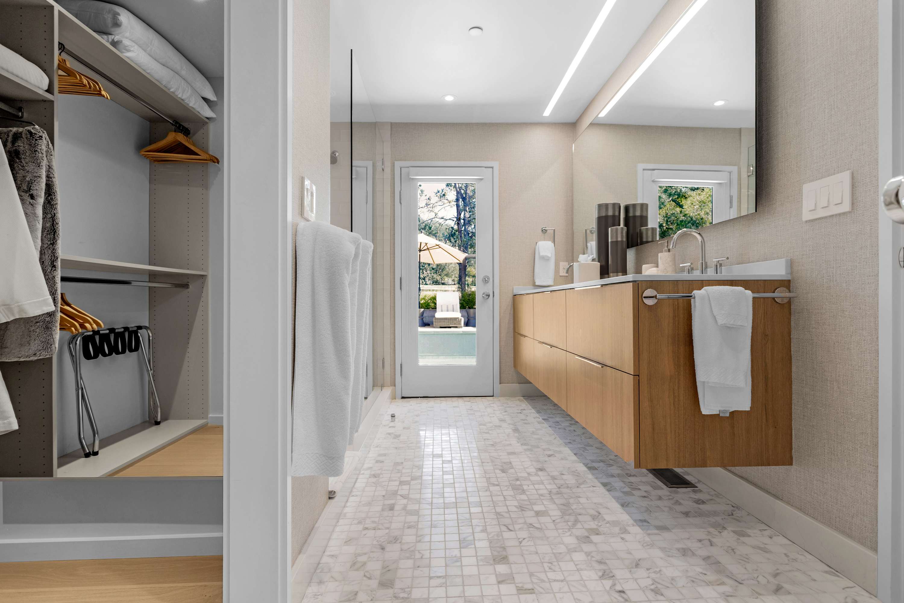 The private quarters are designed as personal sanctuaries for rest. The primary suite is a true retreat, where the first thing you see upon waking is the sparkling pool just beyond your sliding glass door. Textured wallpaper adds warmth and dimension to the room, which features a king bed with luxurious bedding, original art, a comfortable chair for watching the golfers, and a flatscreen TV for private, late-night viewing. The ensuite bathroom is a clean, contemporary space with a dual-sink wood vanity, a spacious glass shower, and views of the peaceful backyard and golf course.