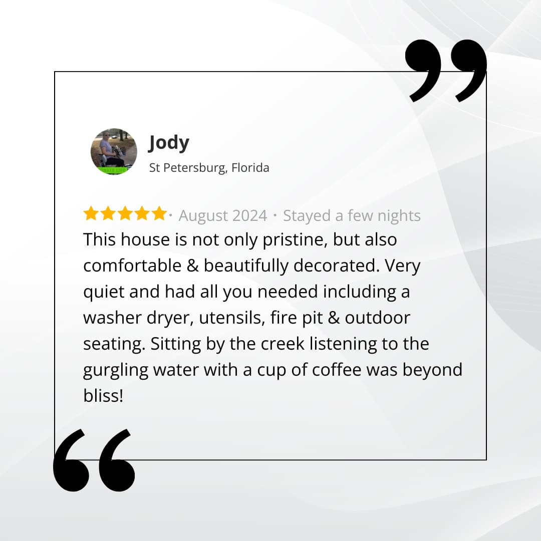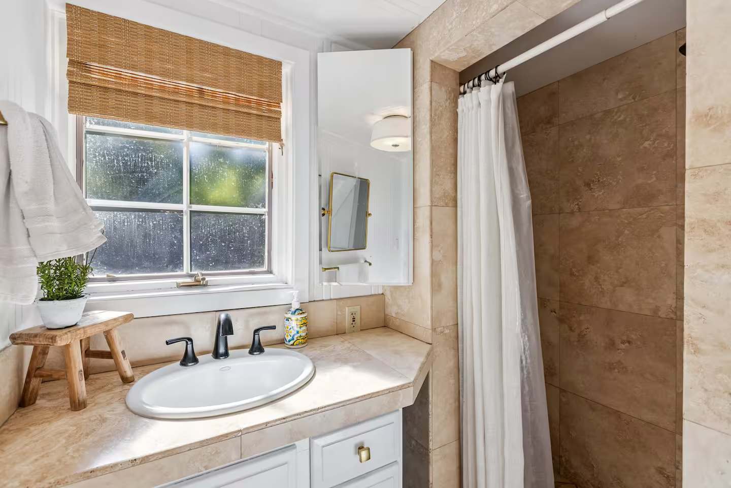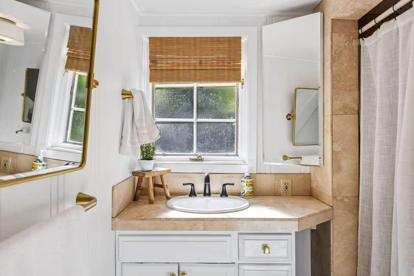 The cottage features three distinct bedrooms, all designed for deep rest. The primary is a bright, airy retreat featuring a king bed, elevated by romantic wallpaper, brass lamps, and tasteful decor. The bed faces the creek so you can wake up to spectacular views. The guest room offers a comfortable queen bed framed by brass embellishments and charming farmhouse doors. Finally, the bunk room is perfect for friends or little ones, featuring a twin-over-double bunk bed. This room has a door leading outside and houses the home’s washer and dryer. All rooms have access to the home’s simple, clean bathroom which features a shower, sink, and commode. Both the guest room and the primary’s architecture leave the top portions of the walls open where it would meet the ceiling. This adds to the home’s charm and is shown in the photos. The bunk room’s walls go up to the ceiling.
