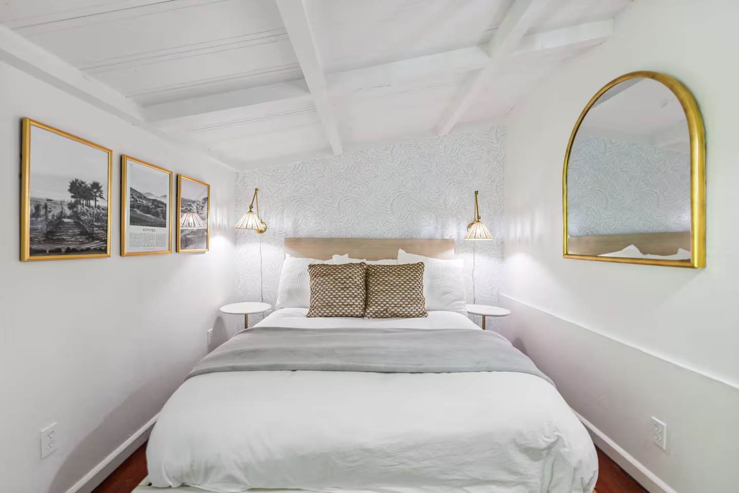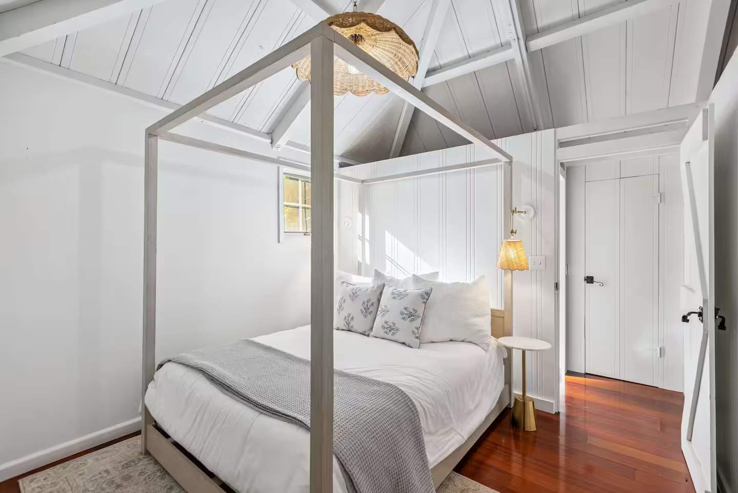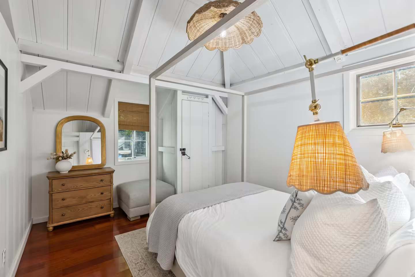 The cottage features three distinct bedrooms, all designed for deep rest. The primary is a bright, airy retreat featuring a king bed, elevated by romantic wallpaper, brass lamps, and tasteful decor. The bed faces the creek so you can wake up to spectacular views. The guest room offers a comfortable queen bed framed by brass embellishments and charming farmhouse doors. Finally, the bunk room is perfect for friends or little ones, featuring a twin-over-double bunk bed. This room has a door leading outside and houses the home’s washer and dryer. All rooms have access to the home’s simple, clean bathroom which features a shower, sink, and commode. Both the guest room and the primary’s architecture leave the top portions of the walls open where it would meet the ceiling. This adds to the home’s charm and is shown in the photos. The bunk room’s walls go up to the ceiling.