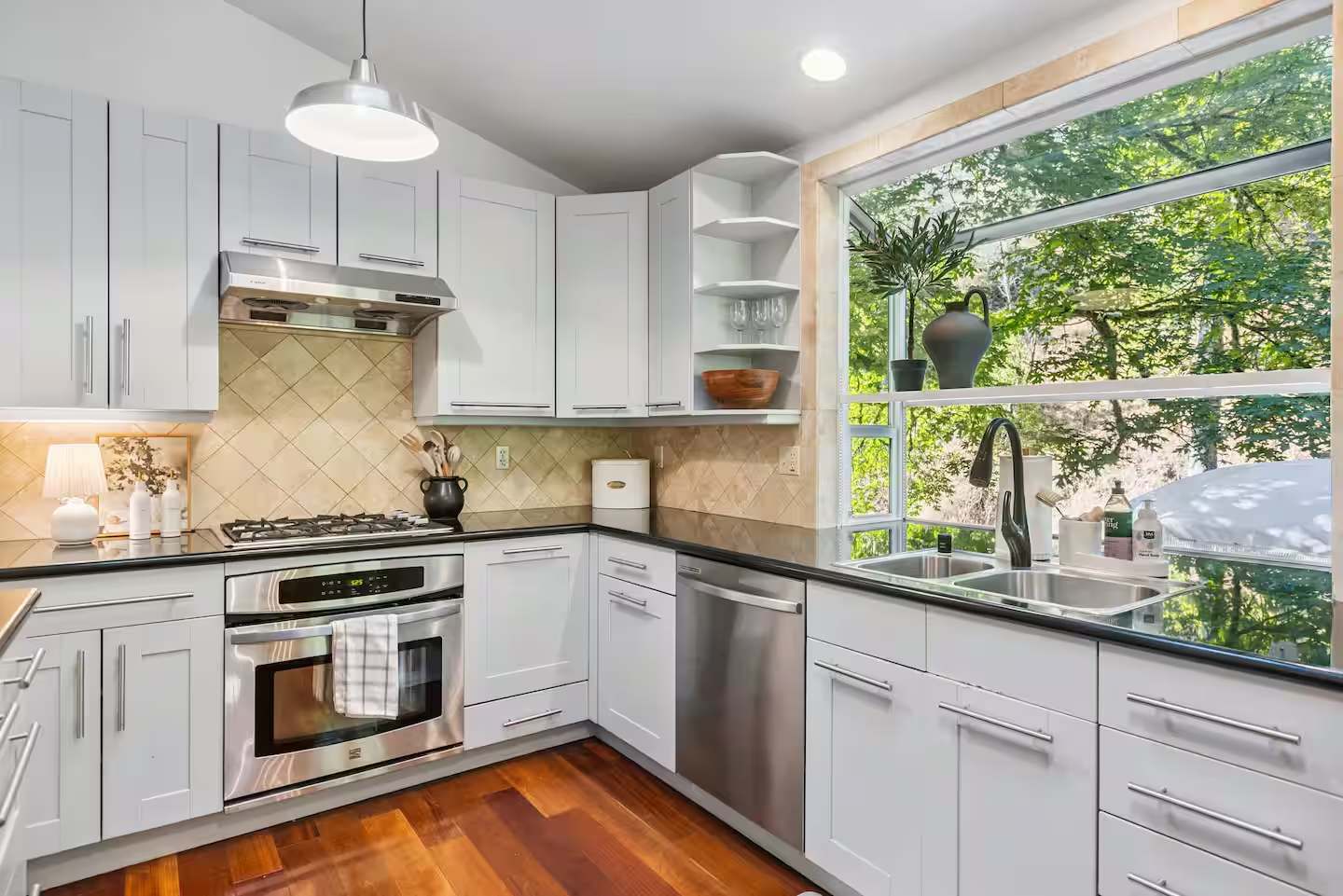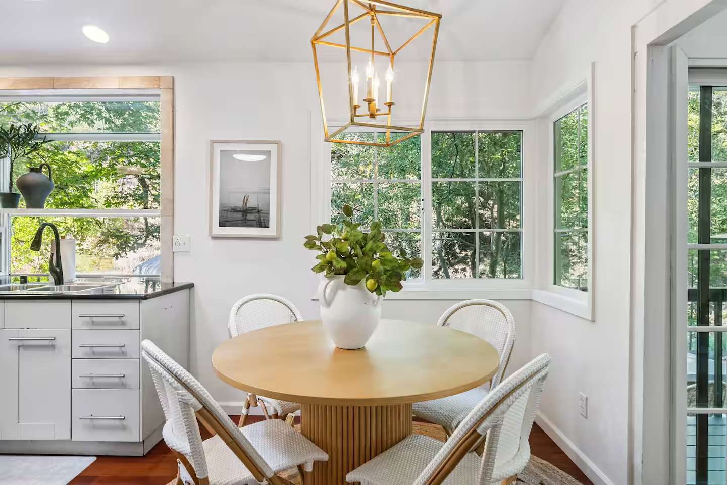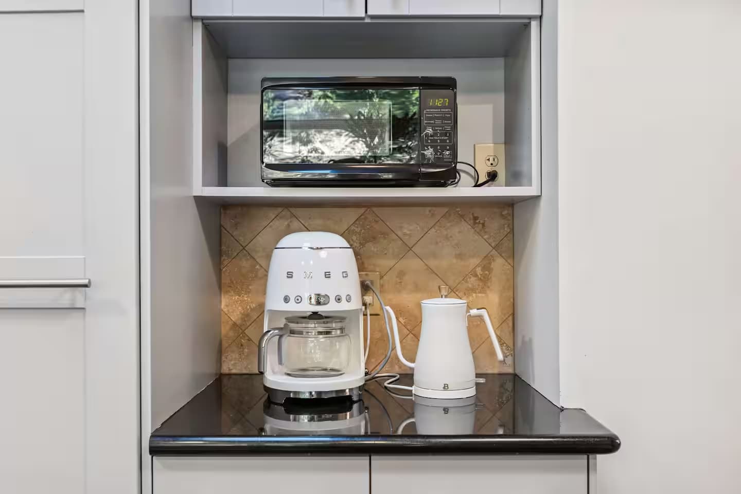The kitchen is simple, clean, and delightful. Crisp white cabinets contrast with the views of the outdoors from the kitchen sink. It is stocked for real life, featuring a gas range and design-forward touches like the SMEG drip coffee maker and electric kettle. You can eat at the kitchen table for four, or take your plates outside to the deck.