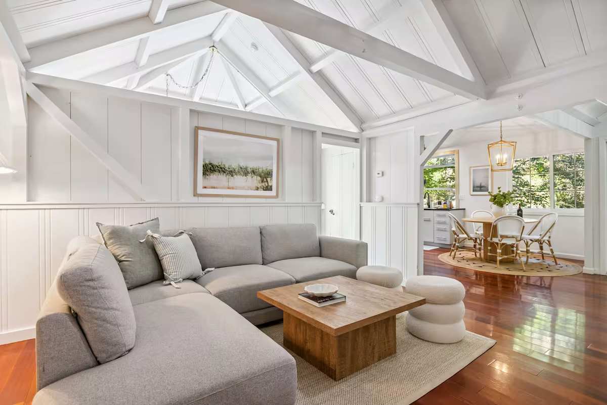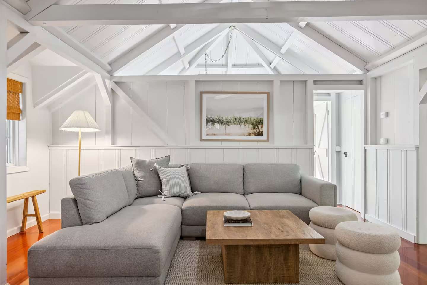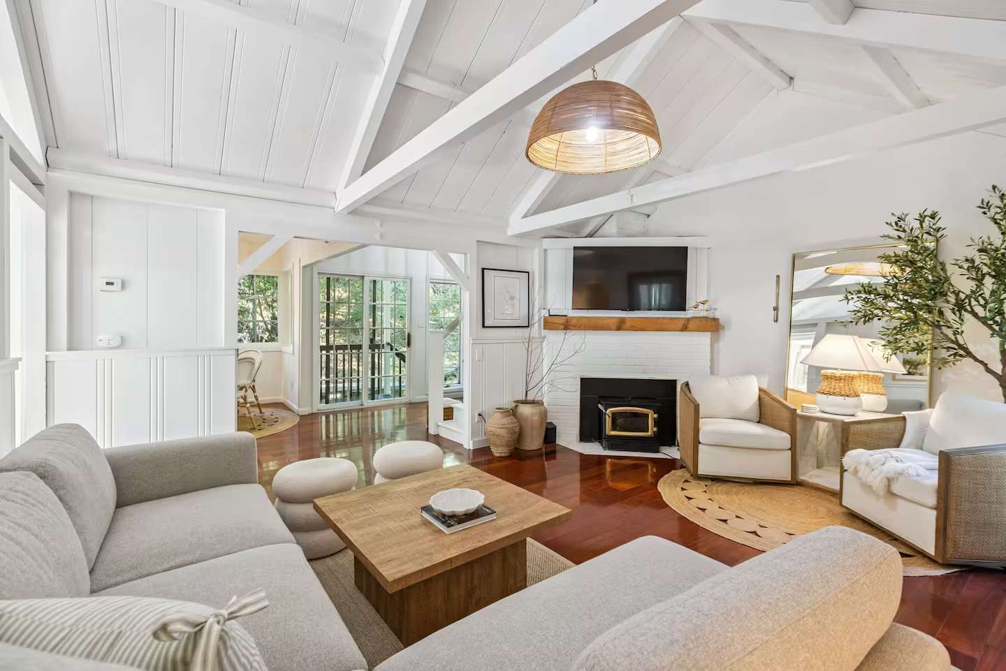 Step indoors to a space that feels airy and curated. We have fully embraced an "organic contemporary" aesthetic, highlighting the home's natural beauty with white-painted planked walls, warm natural wood floors, and a pitched ceiling with exposed beams. The living room is anchored by an overstuffed sectional, woven jute rugs, and rattan chairs—a perfect blend of style and comfort. The focal point of the room is the white painted brick fireplace; a warm wood mantle perfectly frames the fireplace insert and the TV mounted above, blending cozy warmth with modern entertainment.