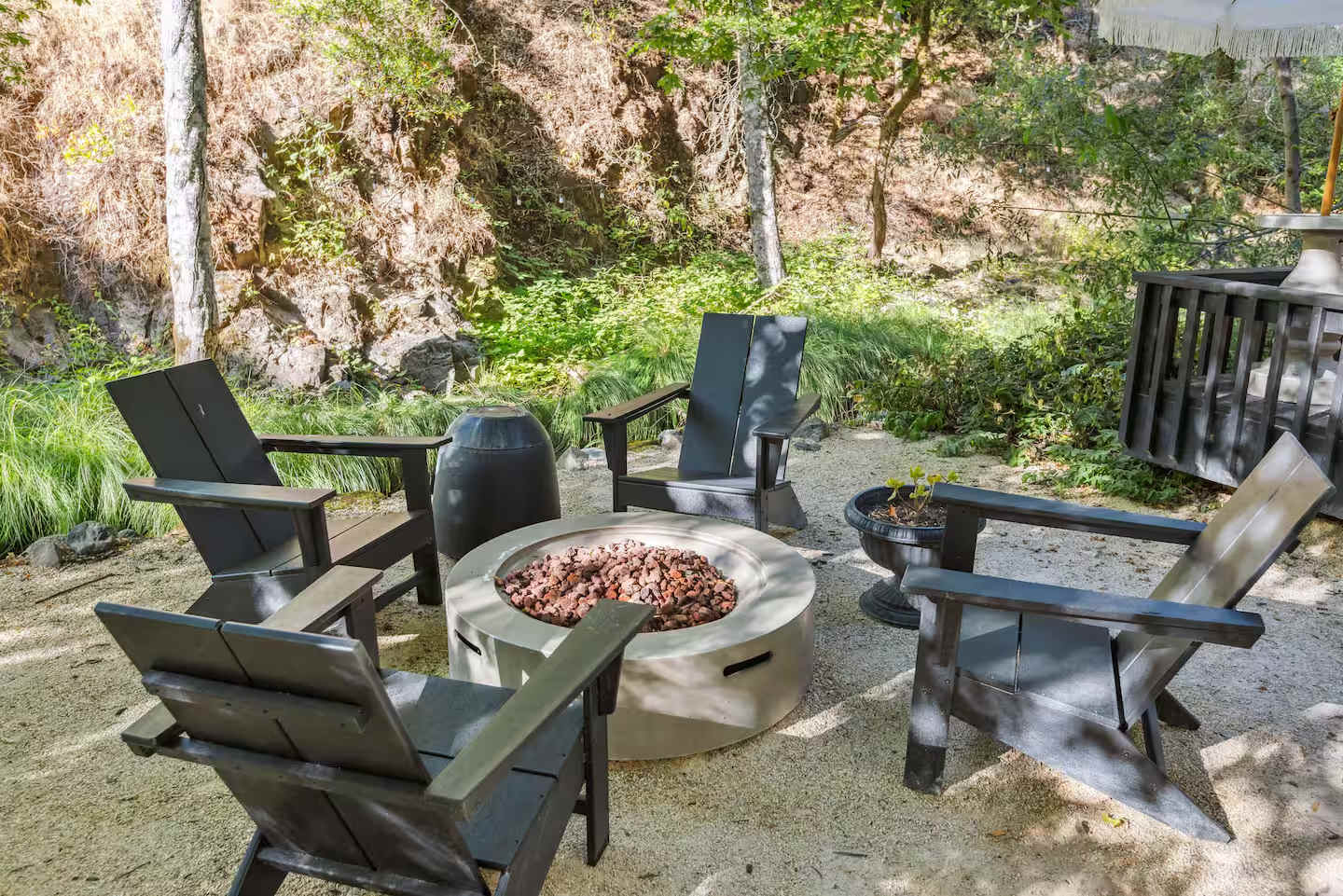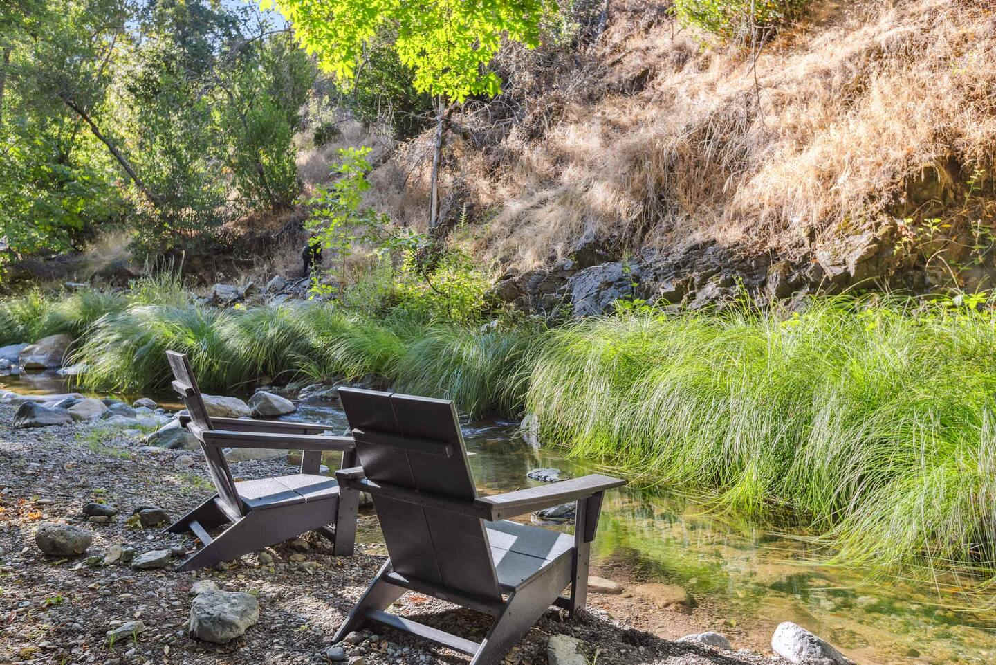 The magic of this property is the water. Step out onto the spacious deck that overlooks the creek—it’s the ultimate spot for alfresco dining under the trees. Just off the deck, we’ve set up a gas fire pit for evening conversation. If you want to get closer to nature, wander down to the water’s edge where we have placed chairs right by the creek. You can literally dip your toes in the water or just sit back and let the current act as your soundtrack.