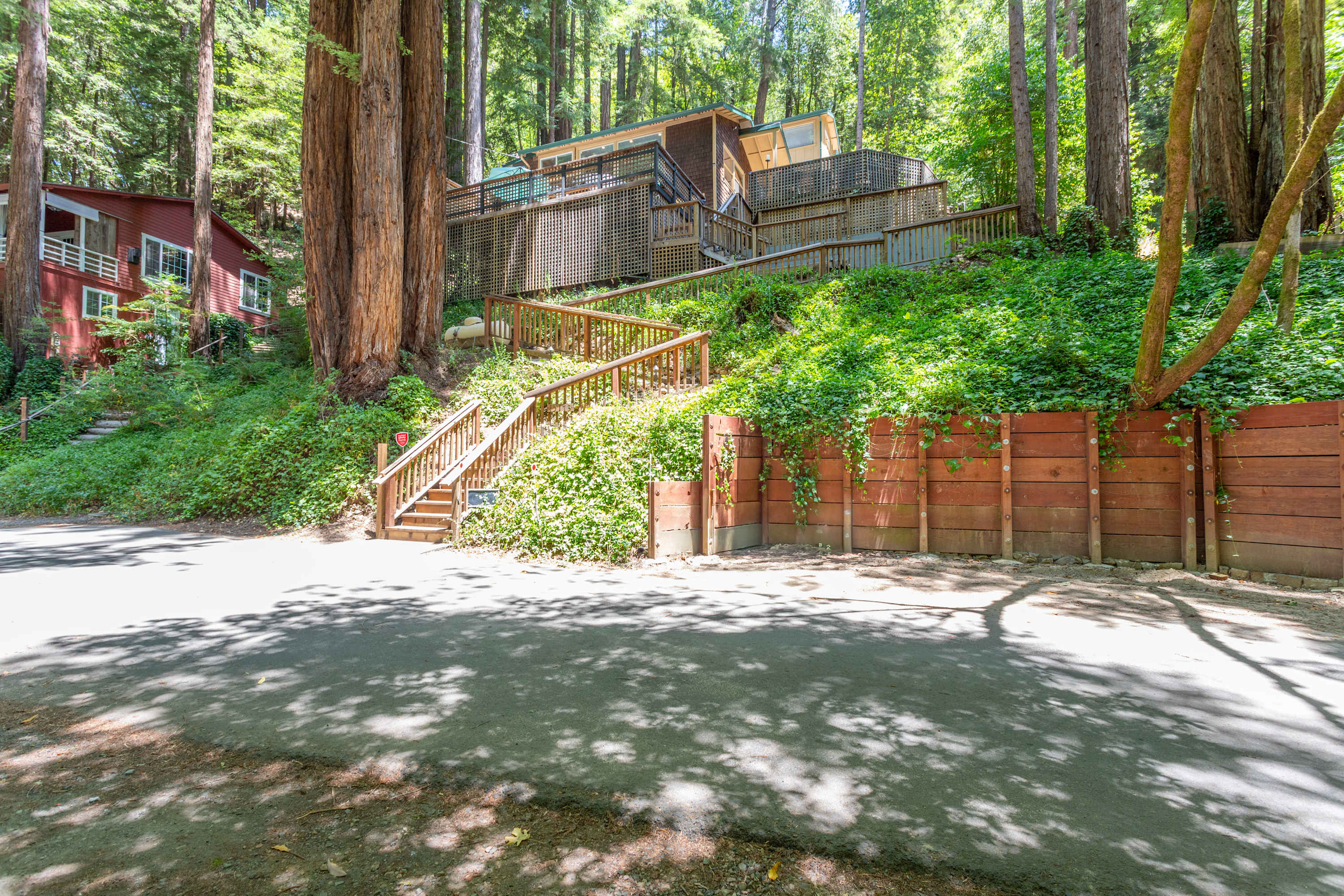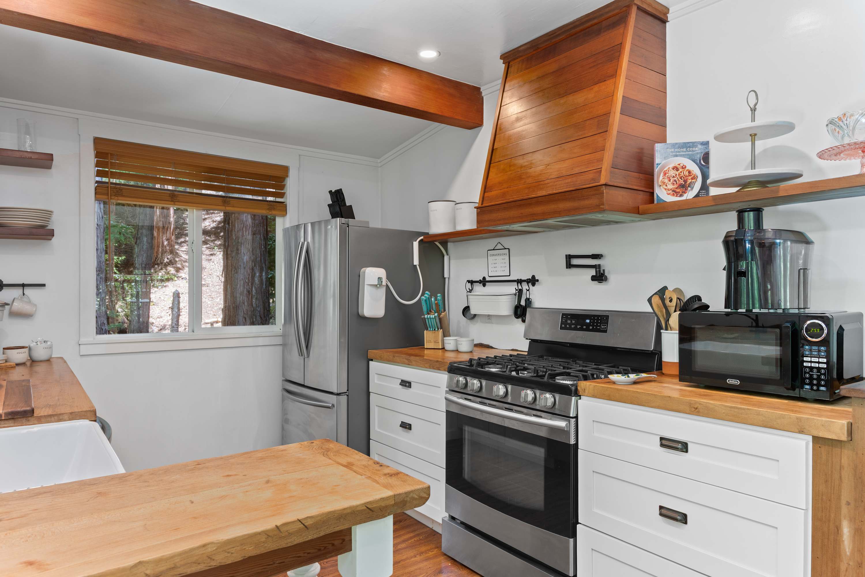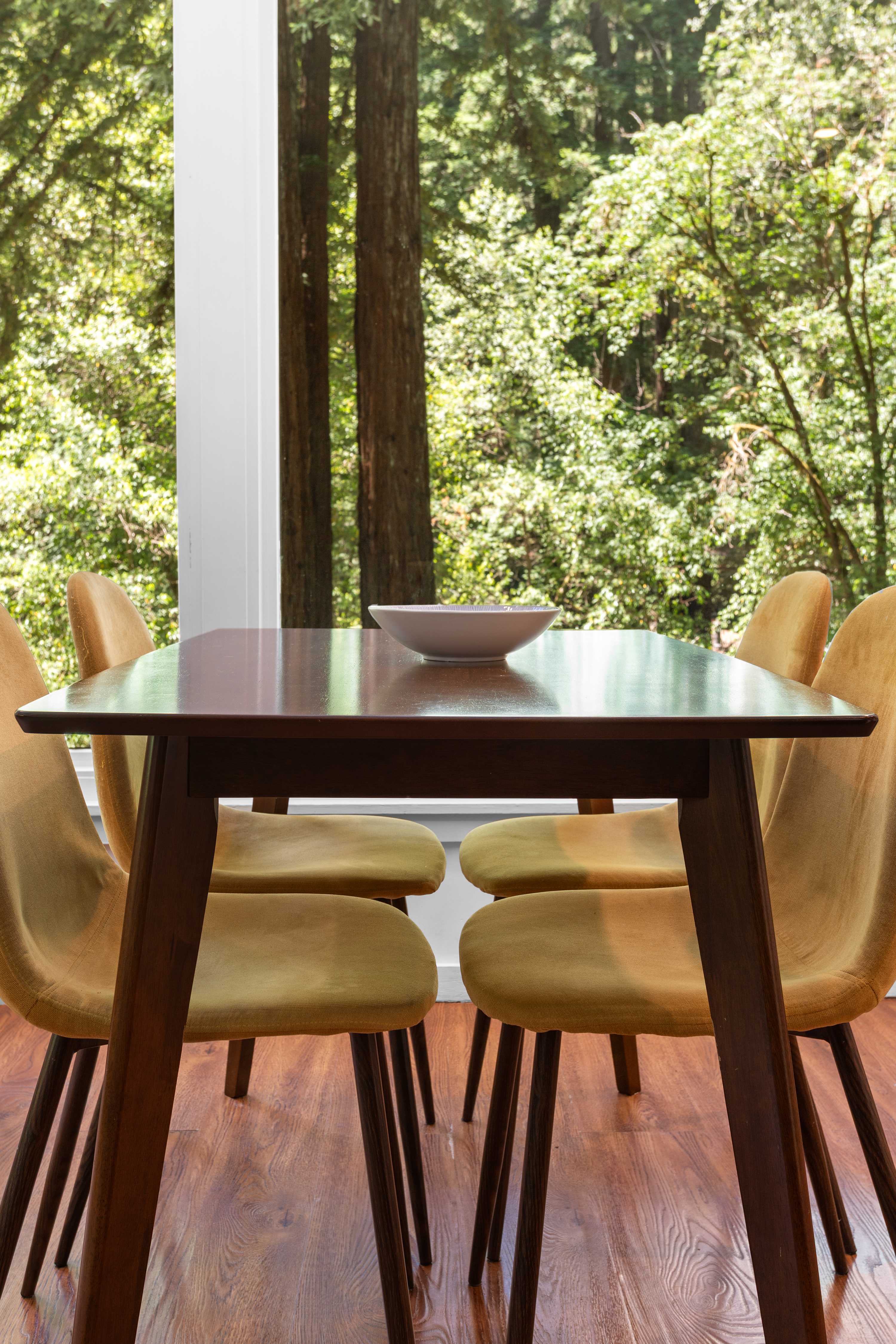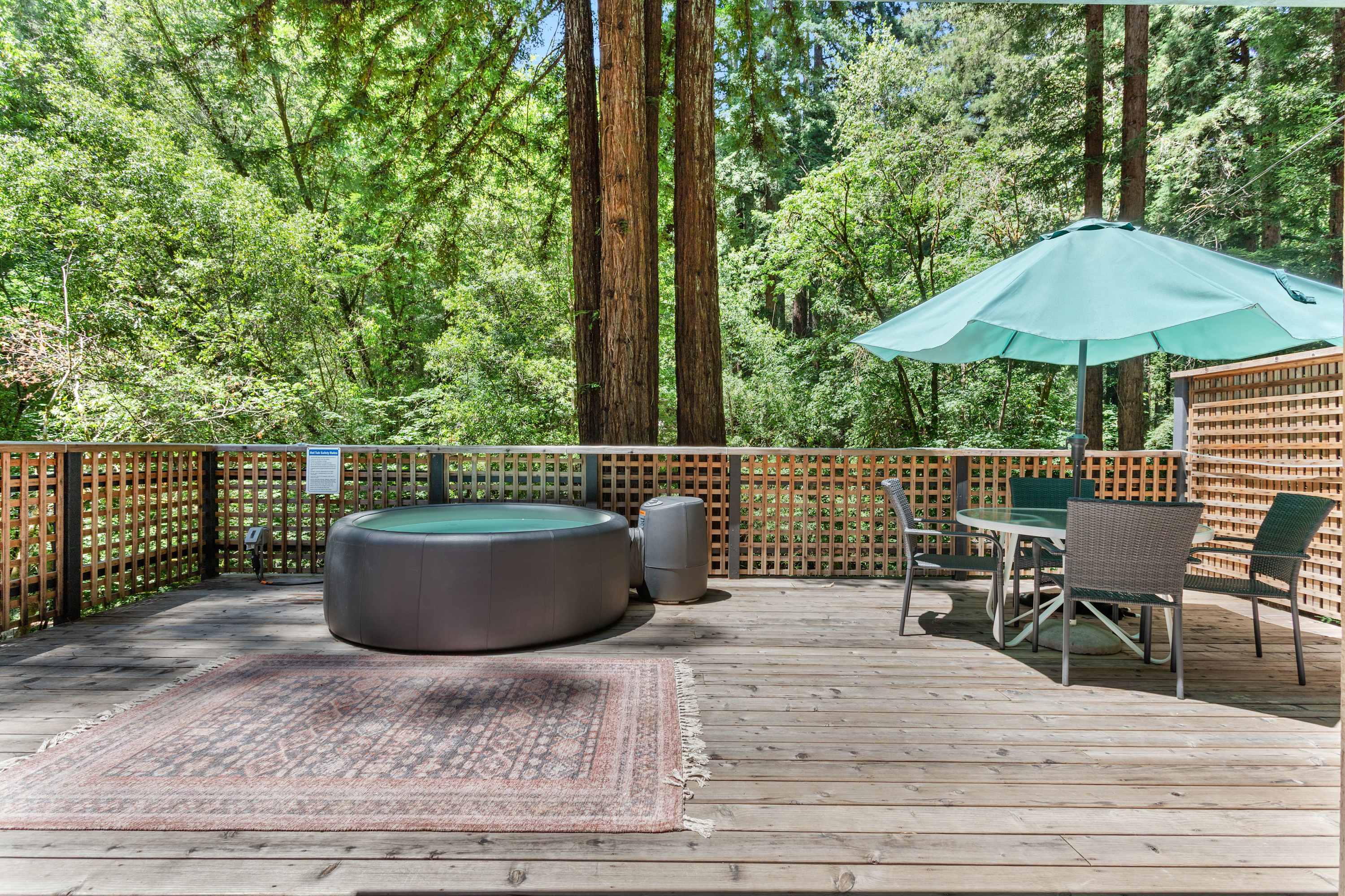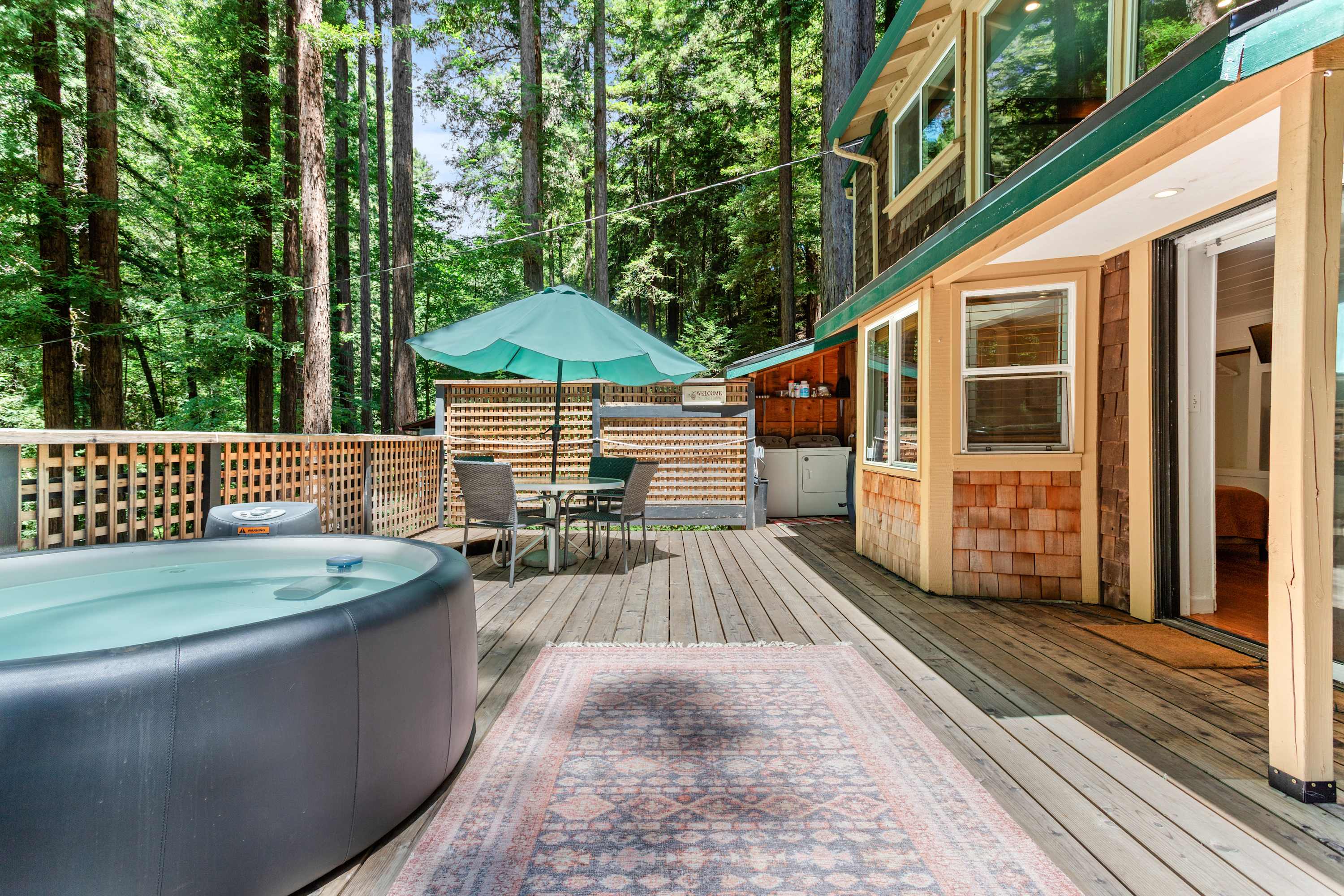 Perched high in the redwood canopy, this stylish two-story retreat offers a true treehouse feel with stunning views over the Rio Nido canyon. The Serenity House is a charming home where you can unwind in nature without forgoing comfort. Relax in the hot tub, enjoy a glass of wine by the outdoor fireplace, or simply gaze out at the towering trees from the large picture windows. It's a place for quiet mornings, adventurous afternoons, and peaceful evenings under the stars.