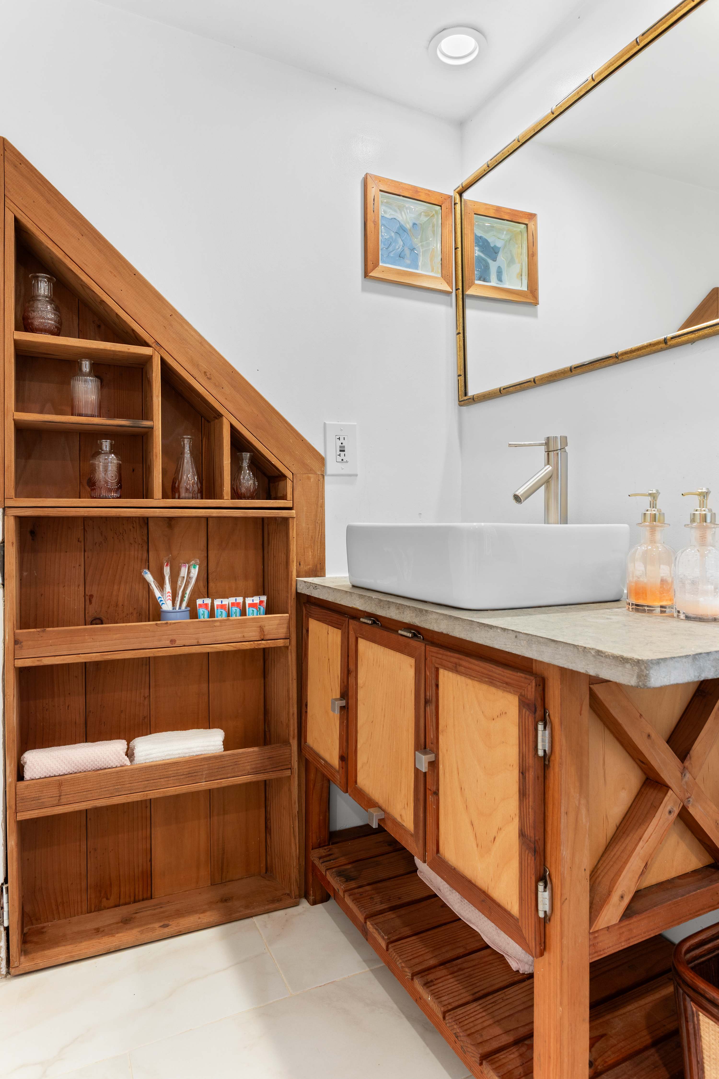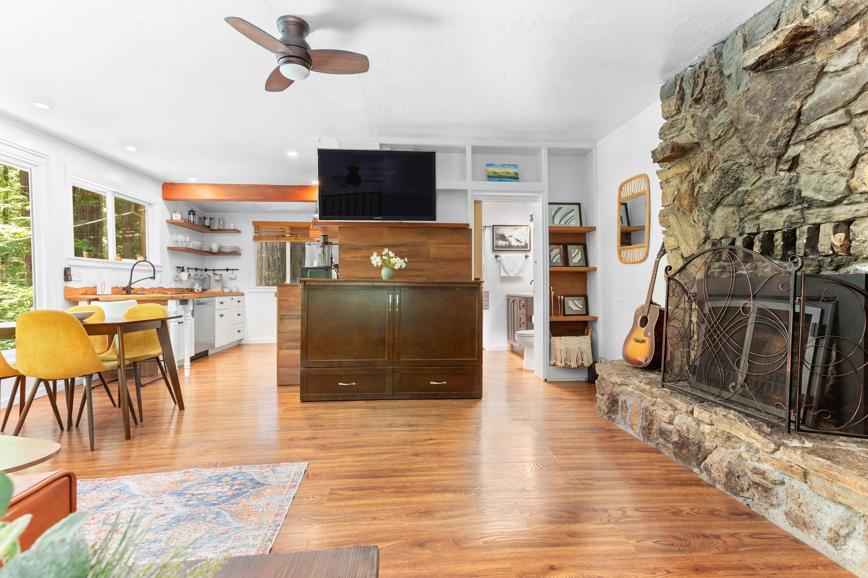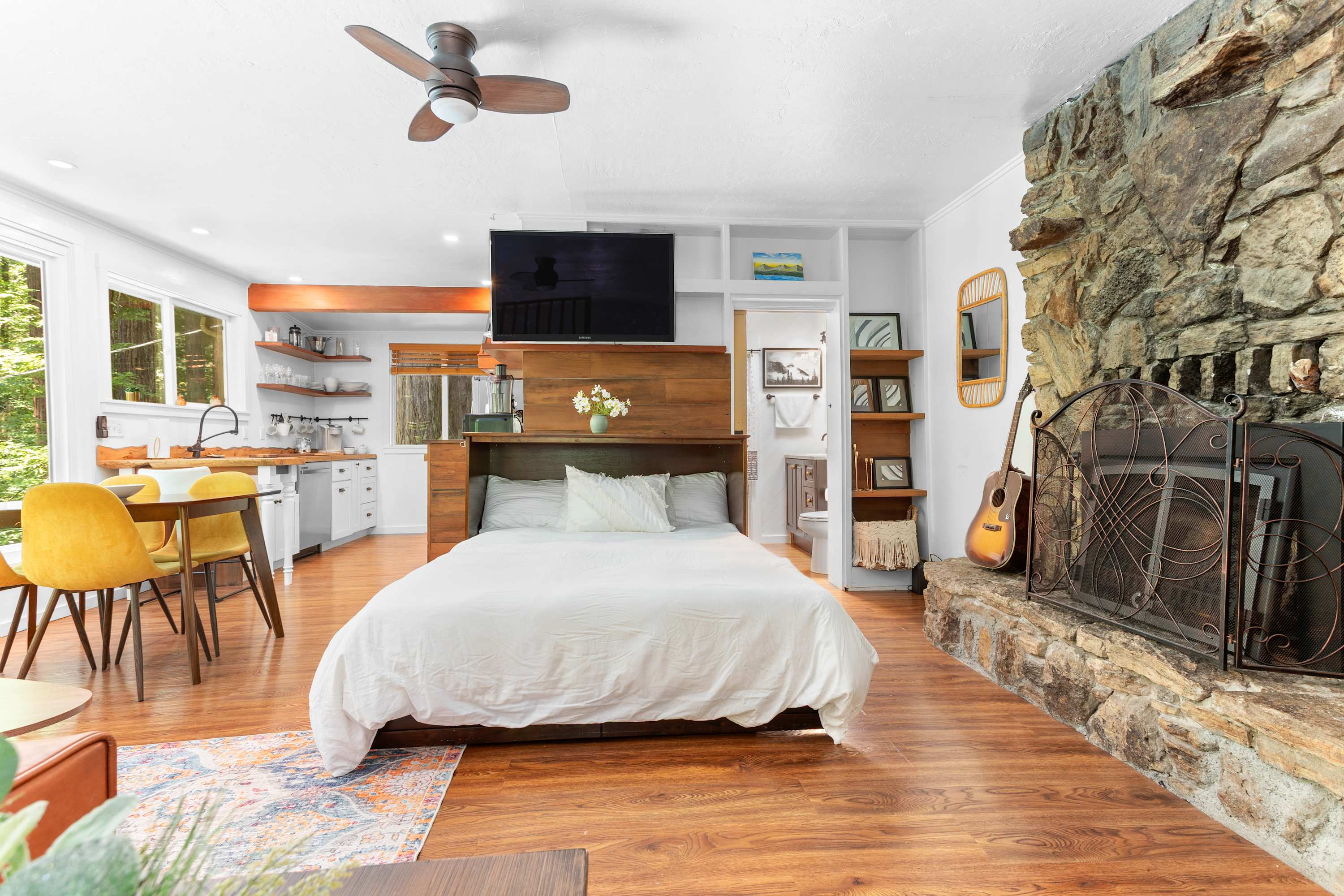 The adorable, well-appointed kitchen is a cook's delight, complete with a propane stove, a full-size refrigerator, a dishwasher, and a classic farmhouse sink—all with an amazing canyon view. A dining area sits adjacent, perfect for sharing meals. From the living room, step out onto the main patio, an entertainer's delight. It’s fully equipped with an outdoor dining table, lounge chairs, a BBQ grill, and an outdoor fireplace for memorable evenings. A convenient full bathroom with a stand-alone shower is also located on this floor.