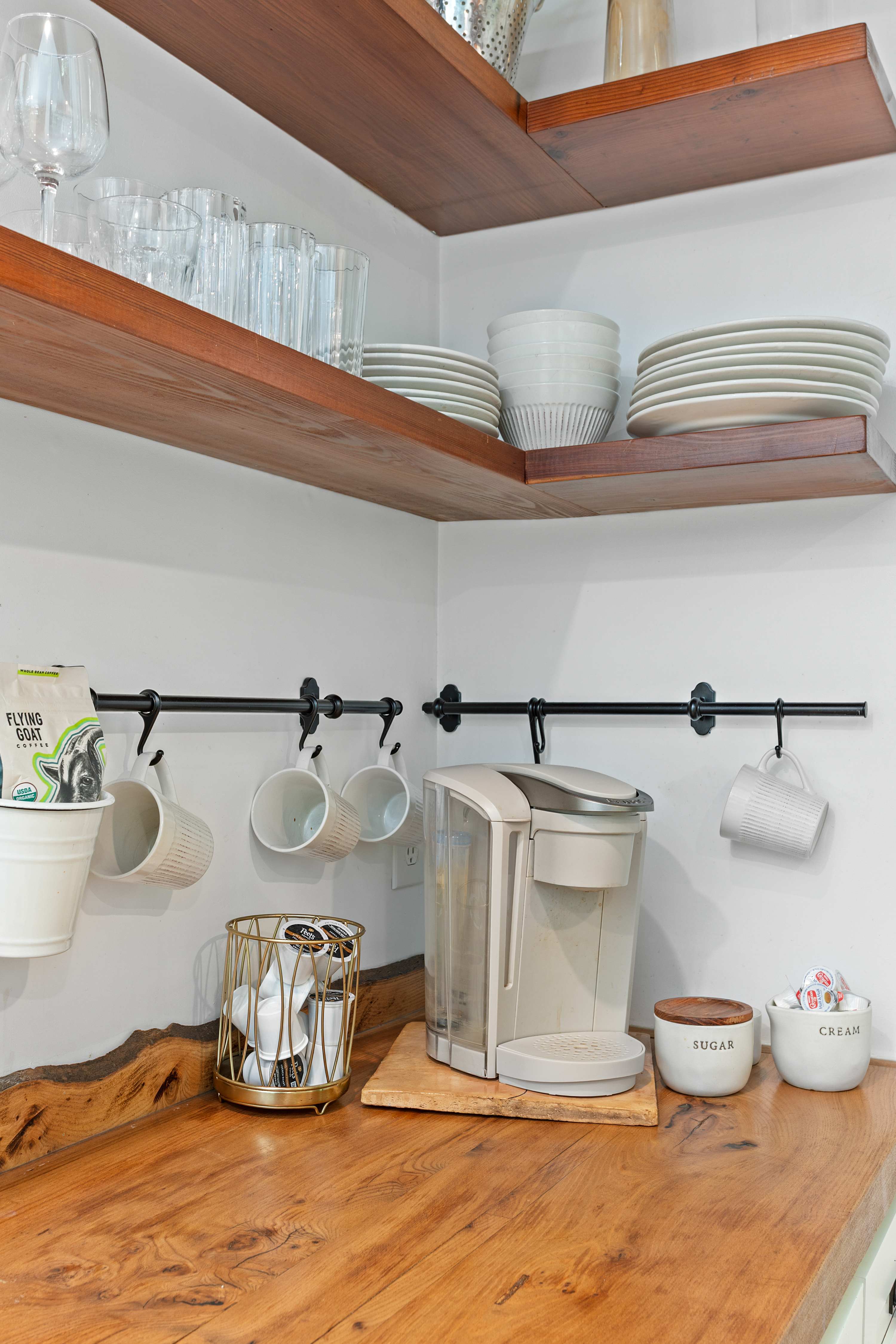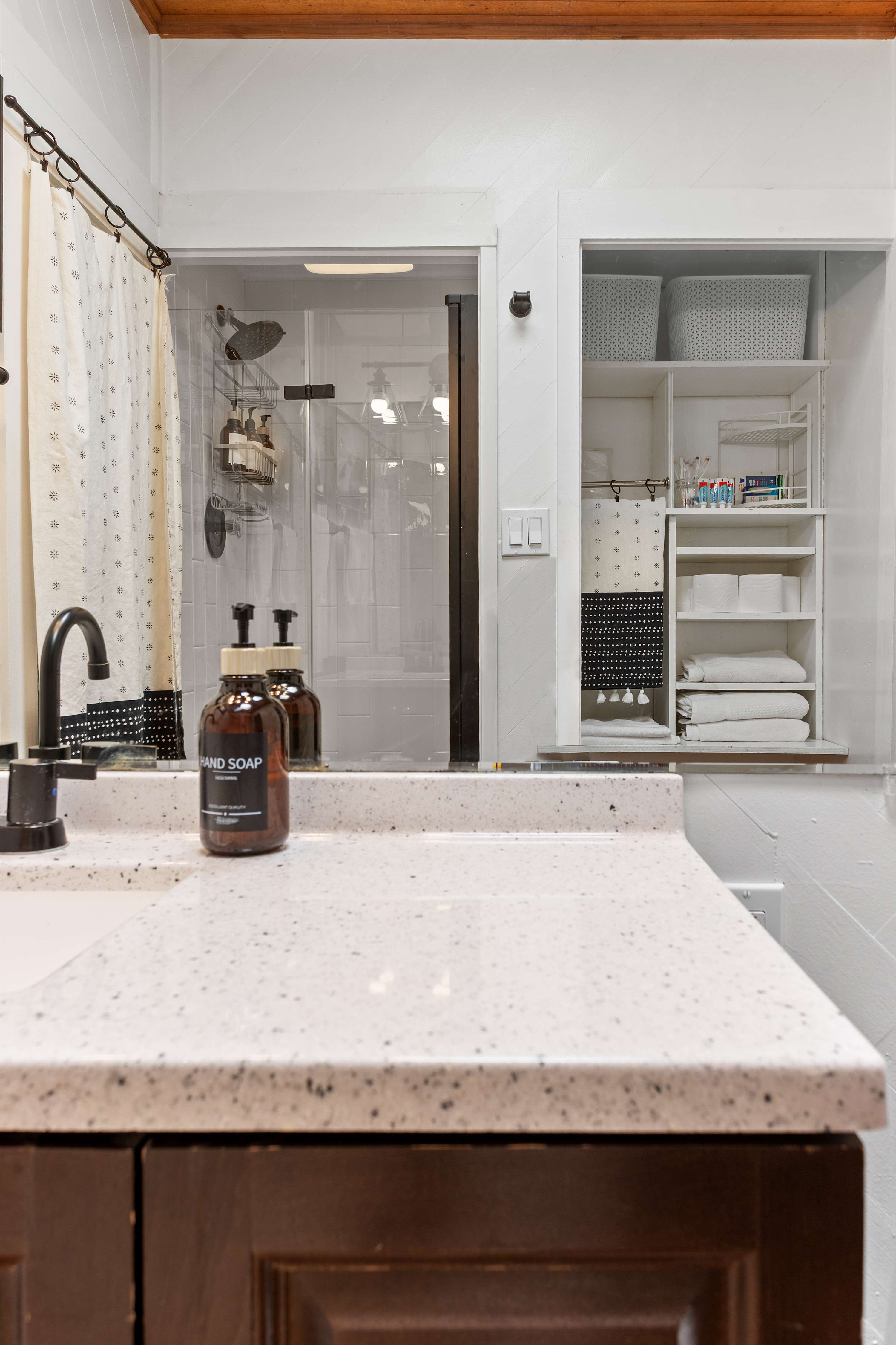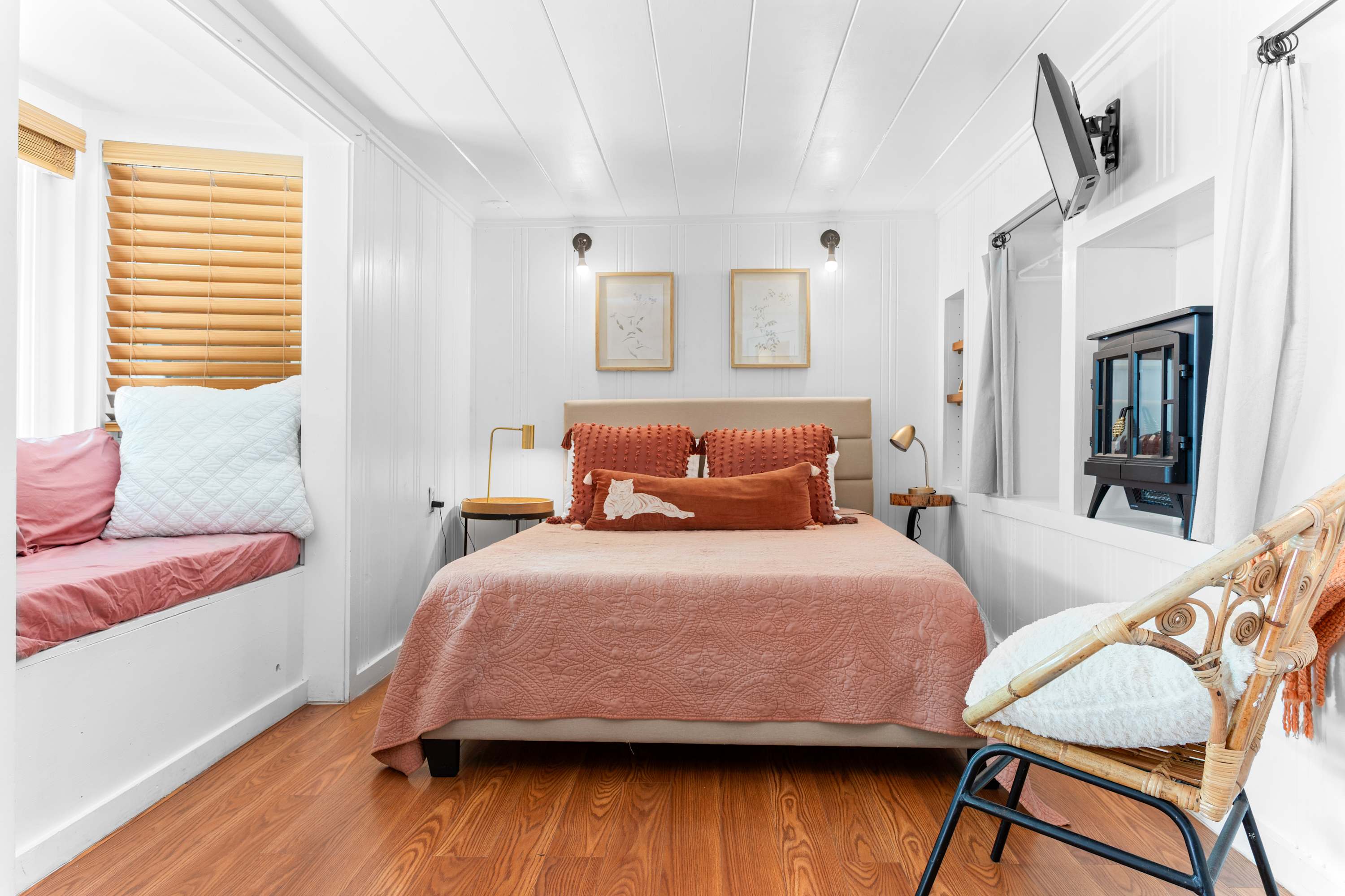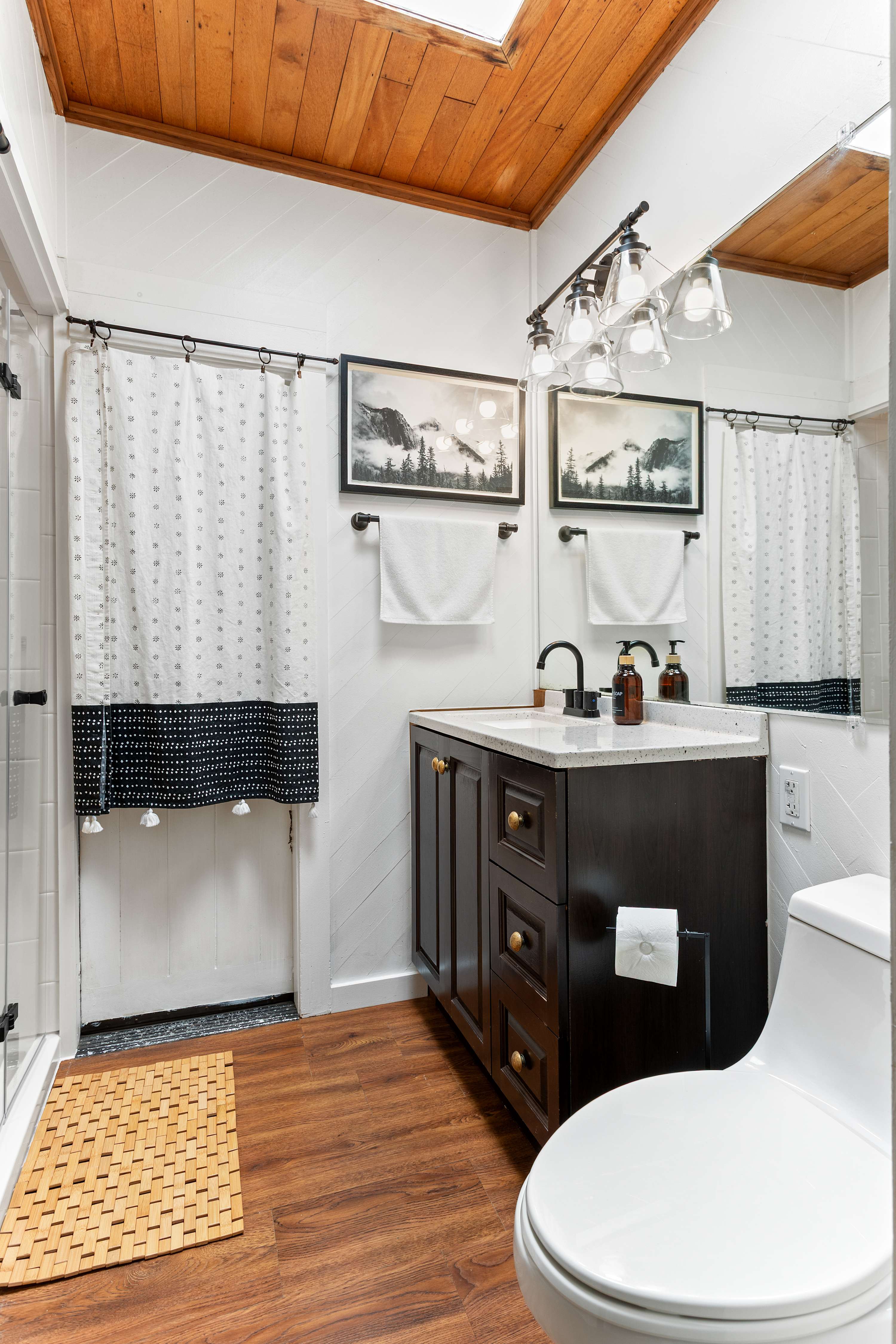 The adorable, well-appointed kitchen is a cook's delight, complete with a propane stove, a full-size refrigerator, a dishwasher, and a classic farmhouse sink—all with an amazing canyon view. A dining area sits adjacent, perfect for sharing meals. From the living room, step out onto the main patio, an entertainer's delight. It’s fully equipped with an outdoor dining table, lounge chairs, a BBQ grill, and an outdoor fireplace for memorable evenings. A convenient full bathroom with a stand-alone shower is also located on this floor.