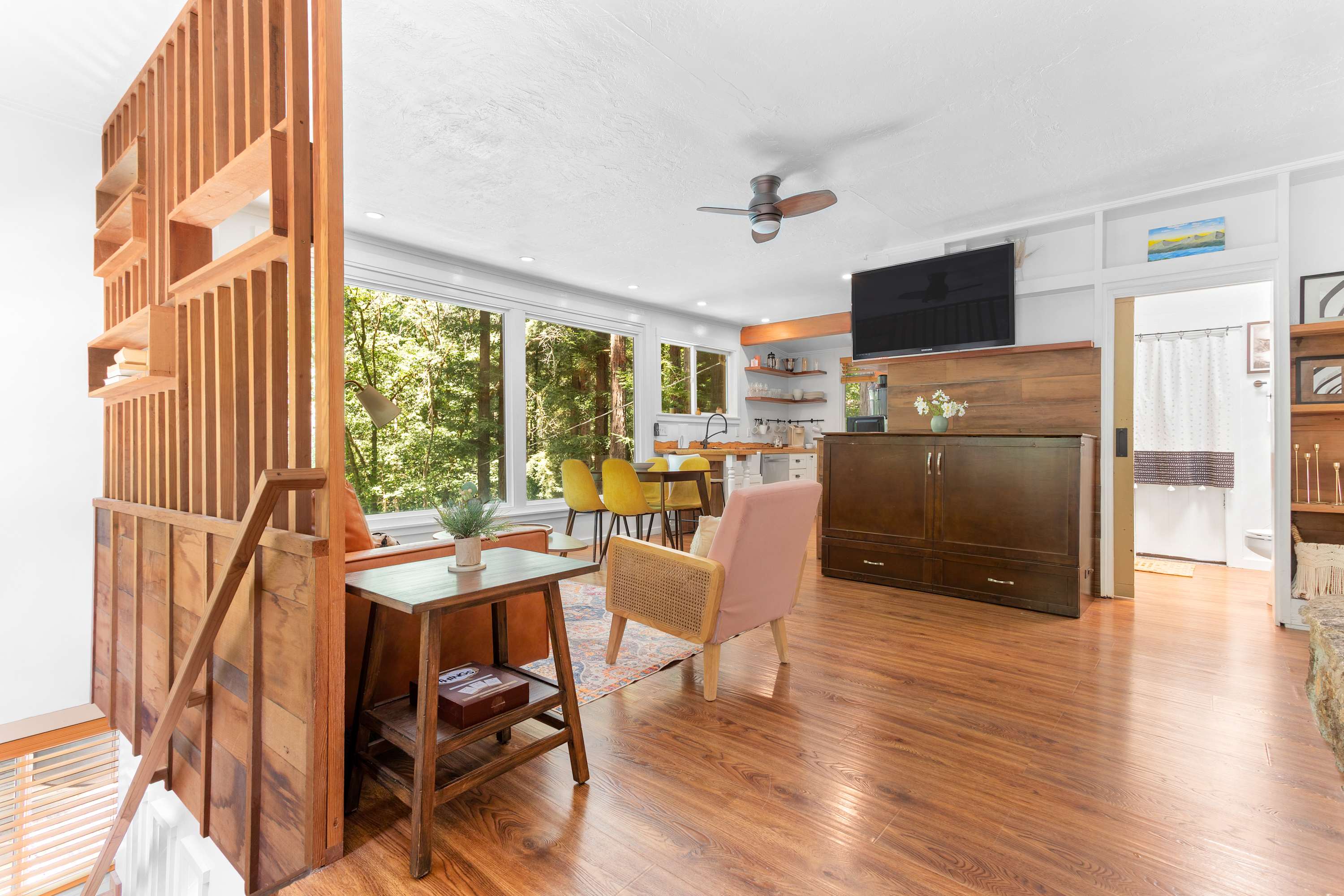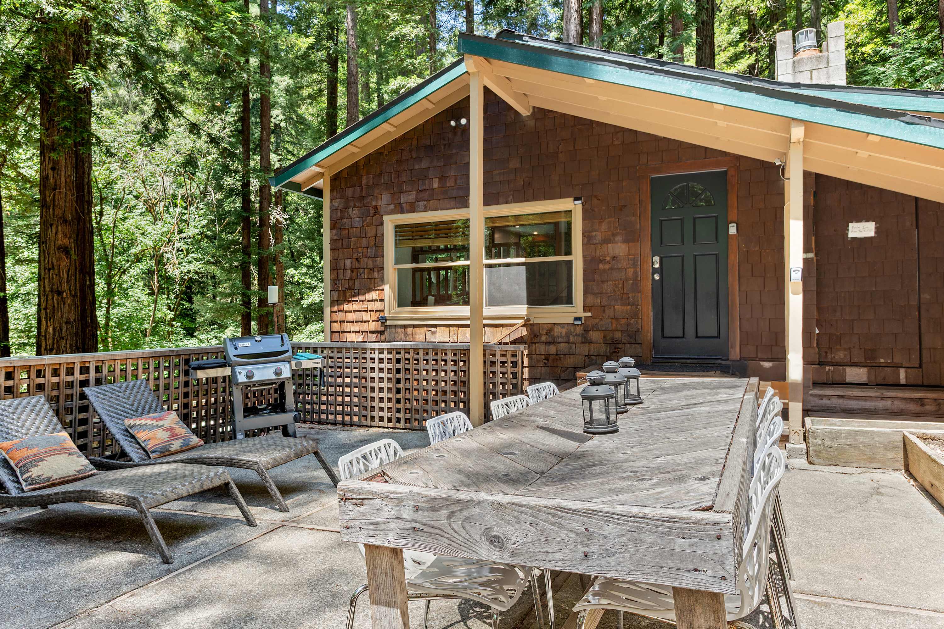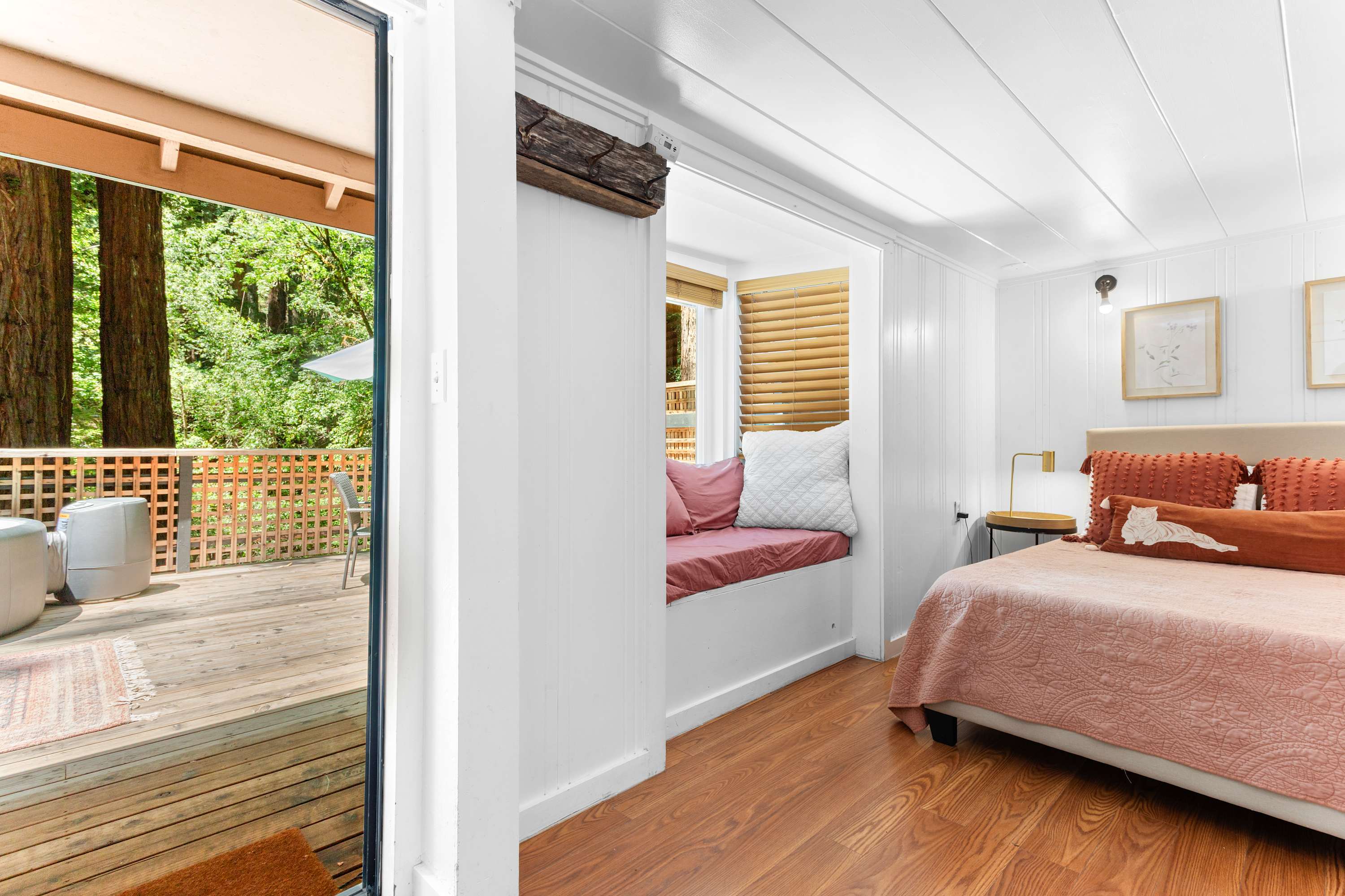 Perched high in the redwood canopy, this stylish two-story retreat offers a true treehouse feel with stunning views over the Rio Nido canyon. The Serenity House is a charming home where you can unwind in nature without forgoing comfort. Relax in the hot tub, enjoy a glass of wine by the outdoor fireplace, or simply gaze out at the towering trees from the large picture windows. It’s a place for quiet mornings, adventurous afternoons, and peaceful evenings under the stars.