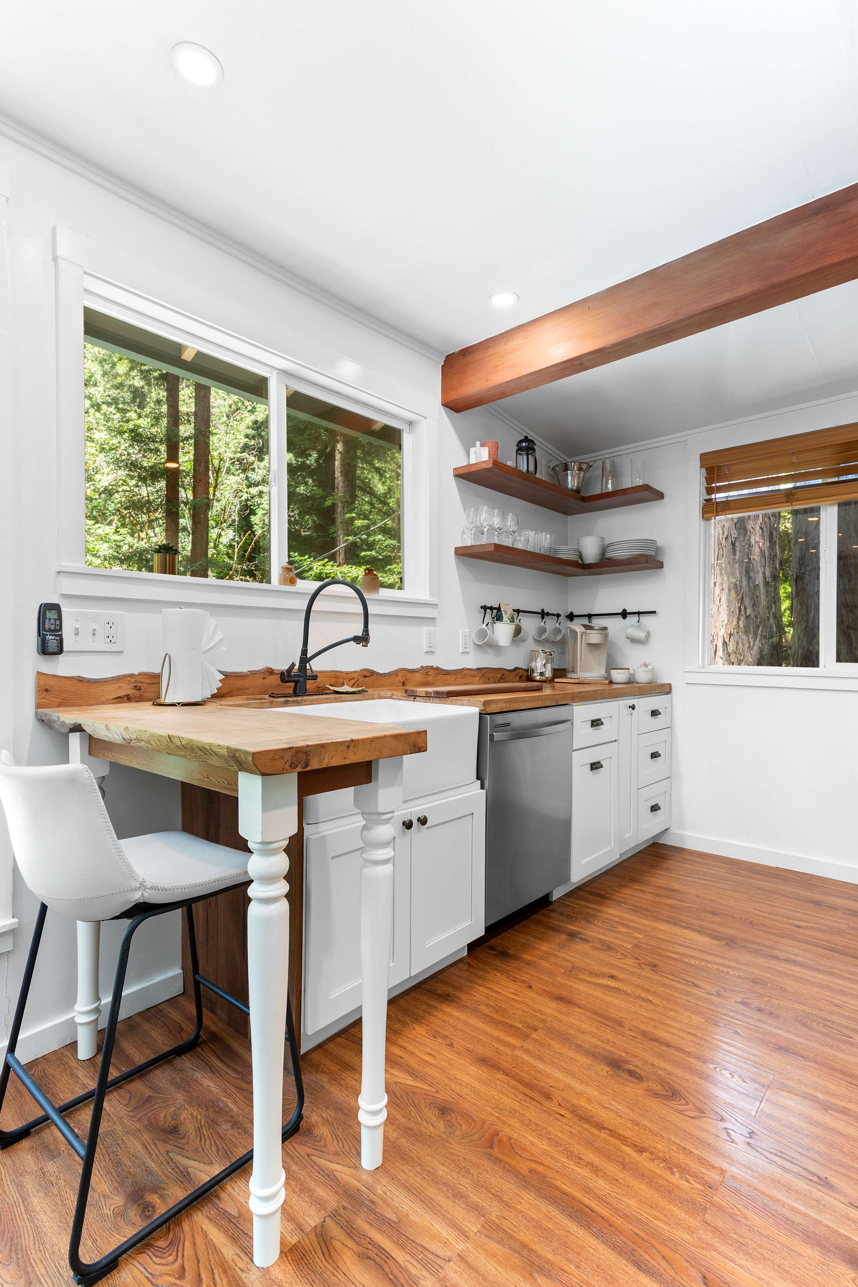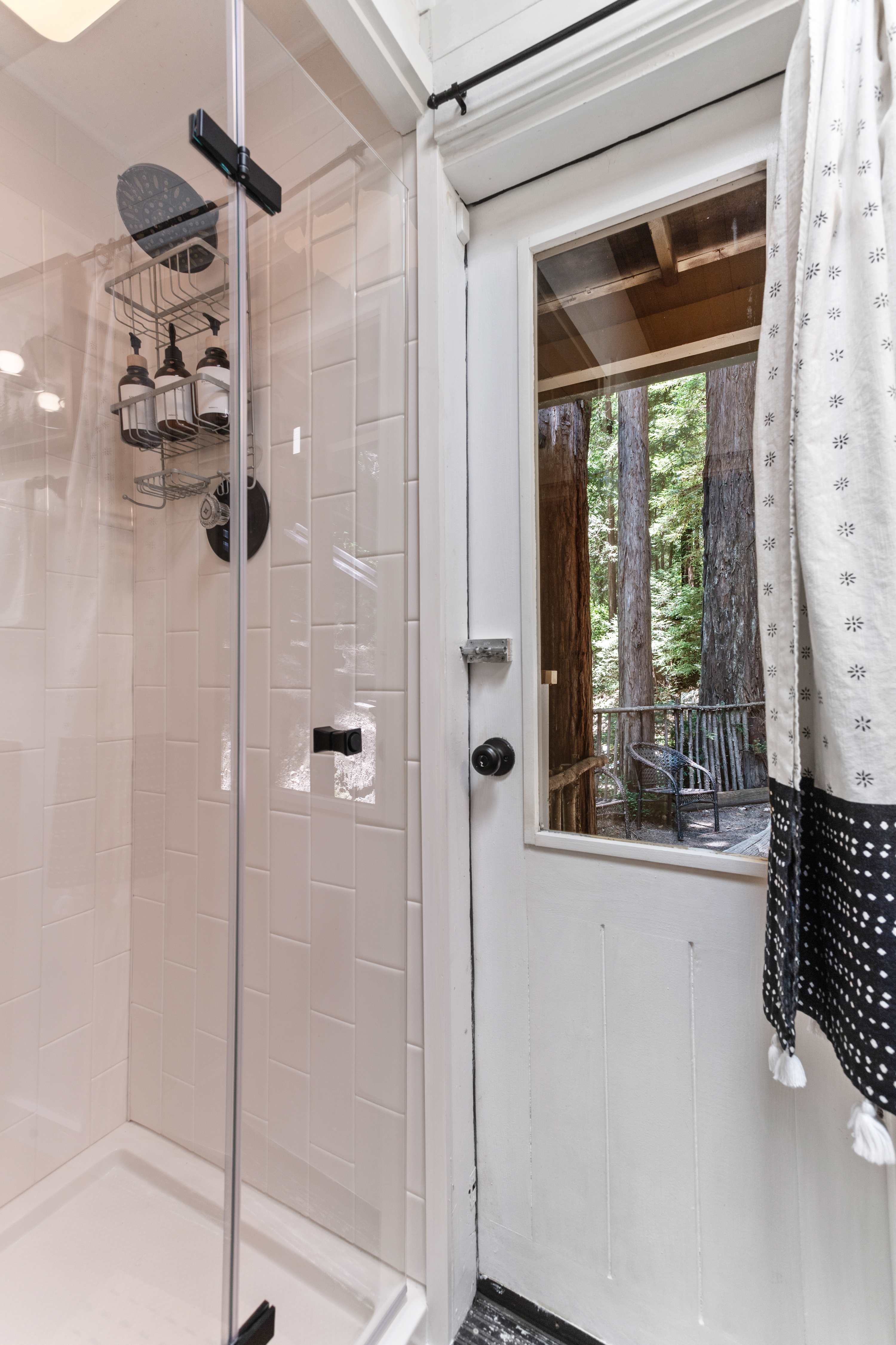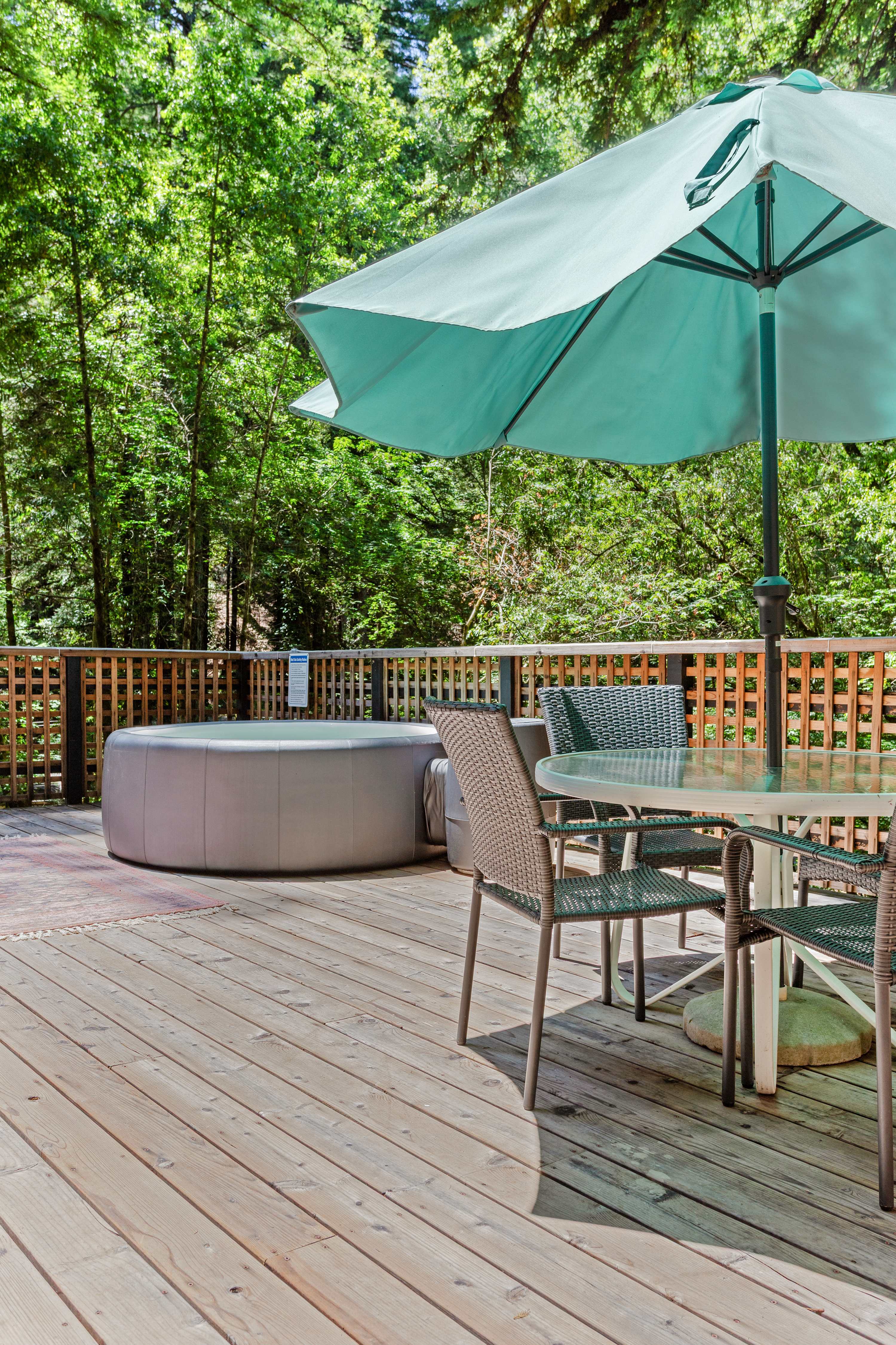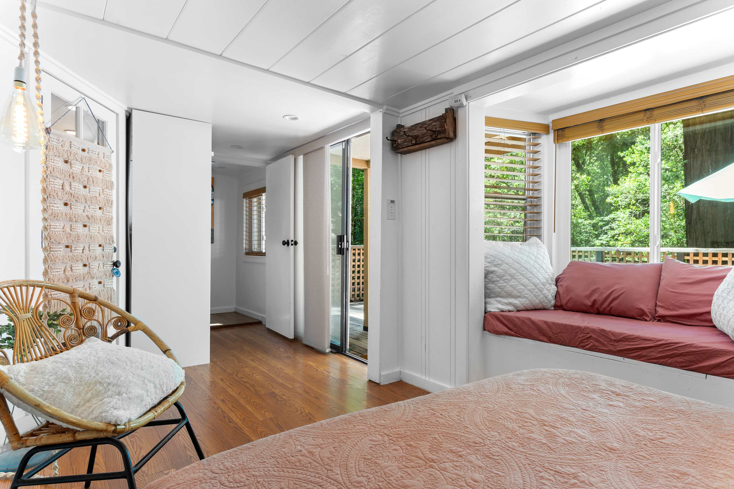 Perched high in the redwood canopy, this stylish two-story retreat offers a true treehouse feel with stunning views over the Rio Nido canyon. The Serenity House is a charming home where you can unwind in nature without forgoing comfort. Relax in the hot tub, enjoy a glass of wine by the outdoor fireplace, or simply gaze out at the towering trees from the large picture windows. It’s a place for quiet mornings, adventurous afternoons, and peaceful evenings under the stars.