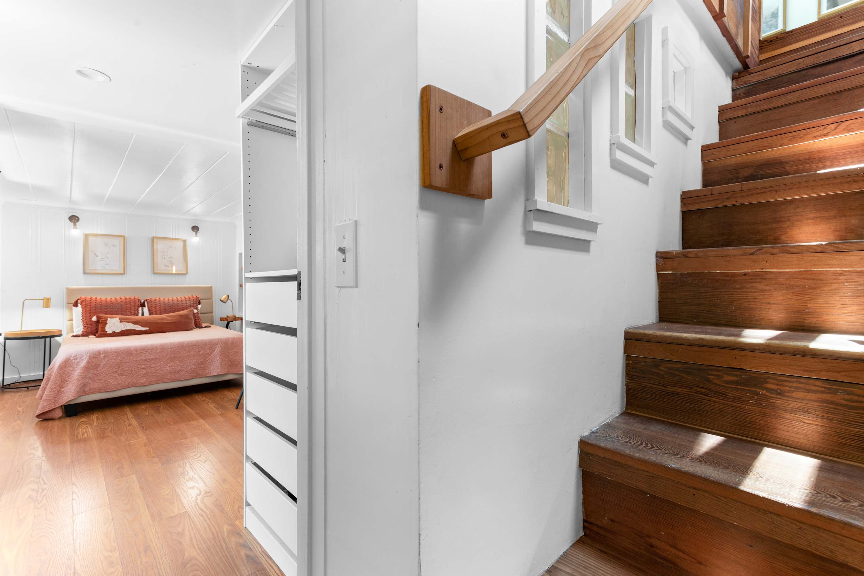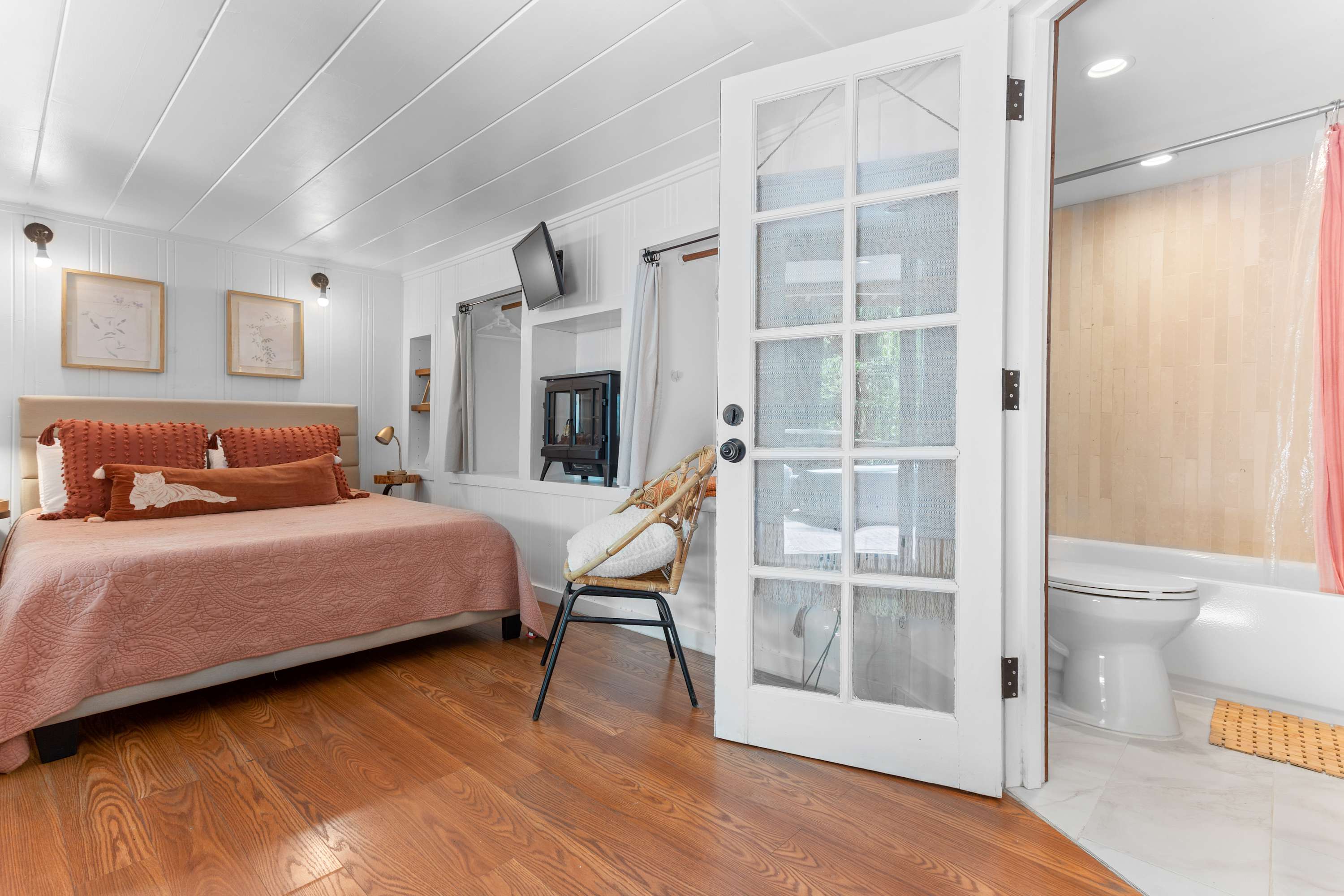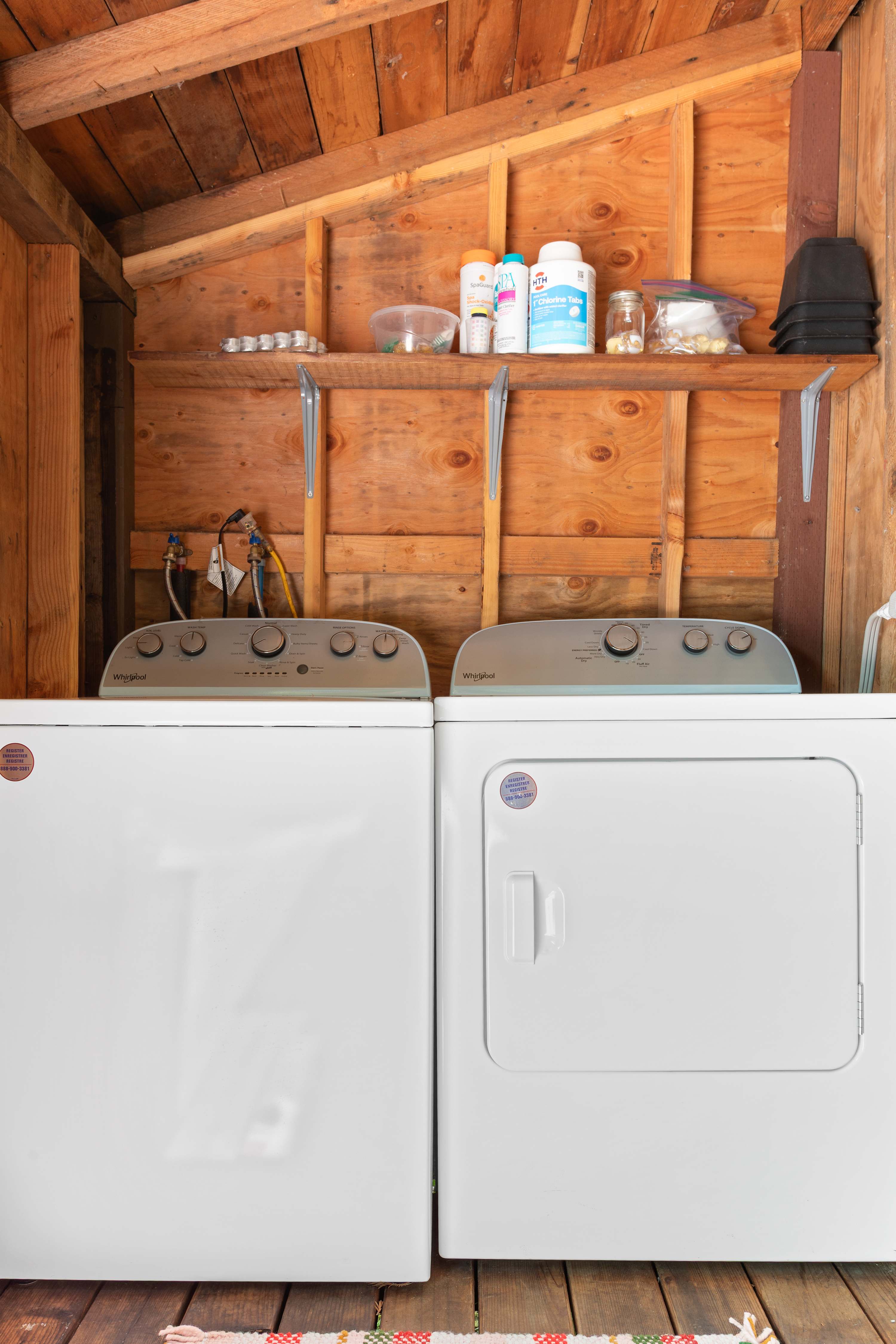 Head downstairs to find the primary bedroom, a private sanctuary featuring a queen-sized bed and an ensuite bathroom with a shower-over-tub combo. Sliding glass doors open directly onto a second patio. Here, you'll find the hot tub and a seating area under an umbrella—the perfect spot to unwind and soak in the sun or stargaze at night as you take in the natural surroundings. For your convenience, laundry facilities are also located on this level.