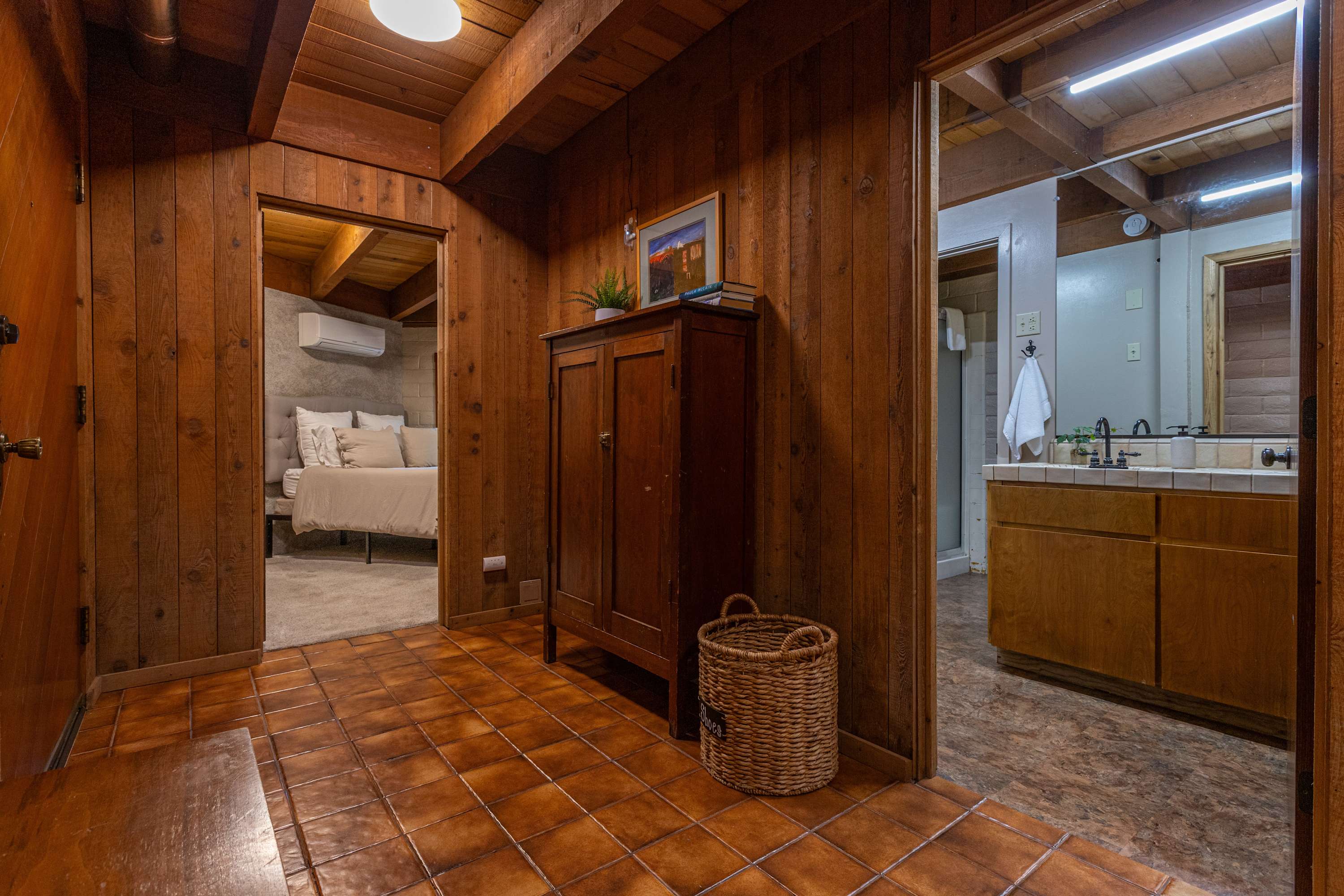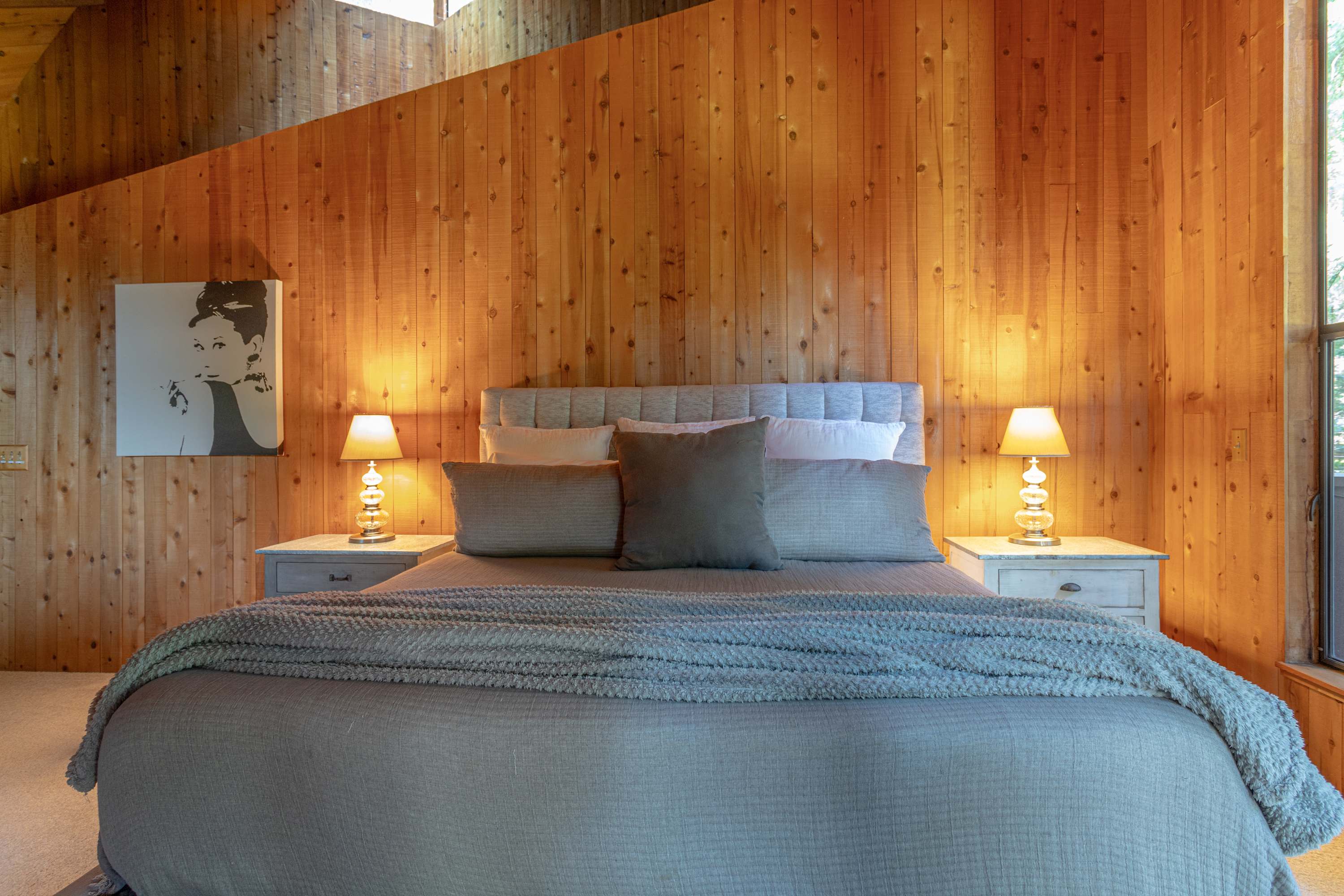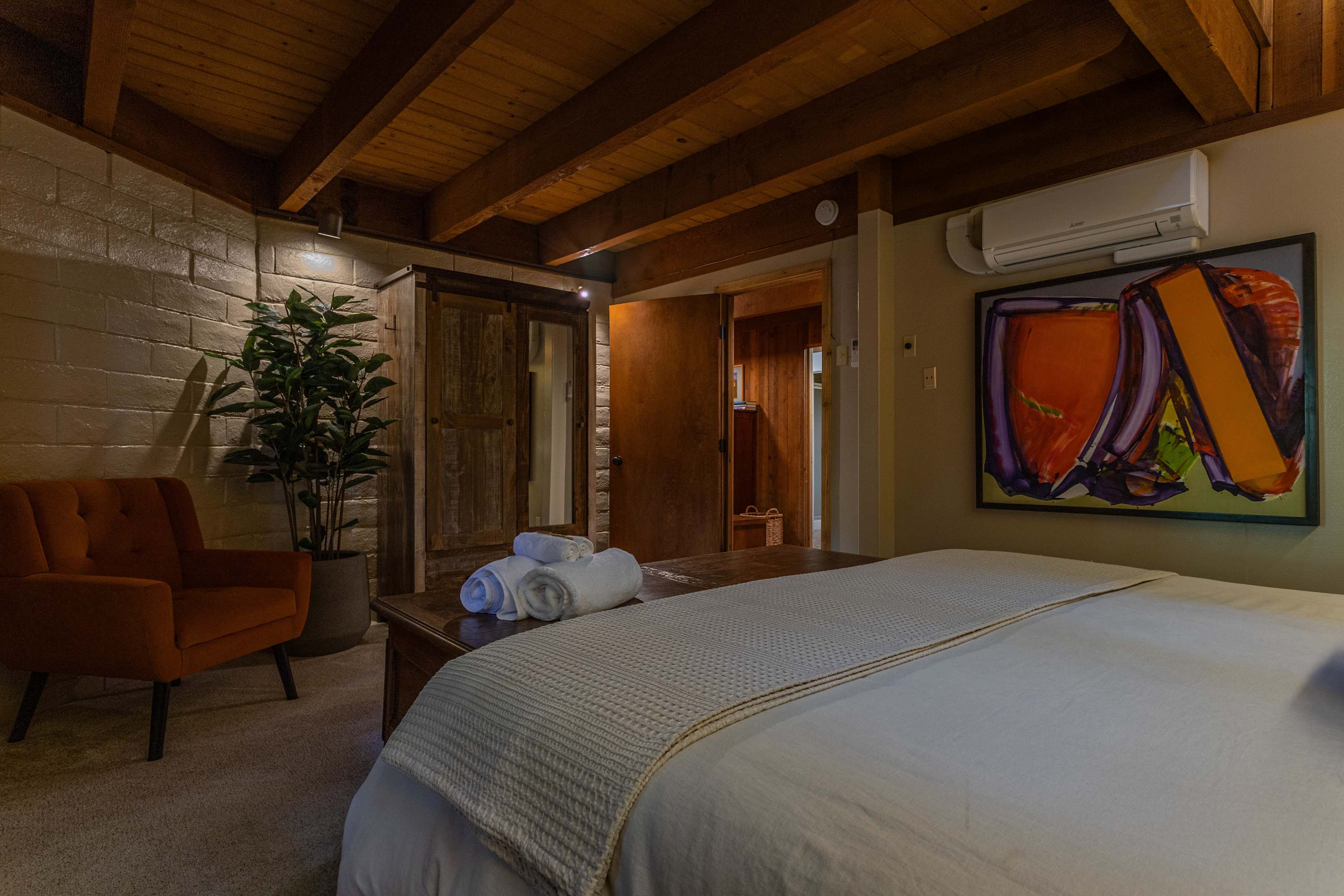 Just off the deck lies the private, detached casita. Perfect for those seeking extra privacy, it has its own bathroom, and a wardrobe. The space boasts a fun, retro vibe with mid-century modern furnishings and a unique throwback carpeted wall.
