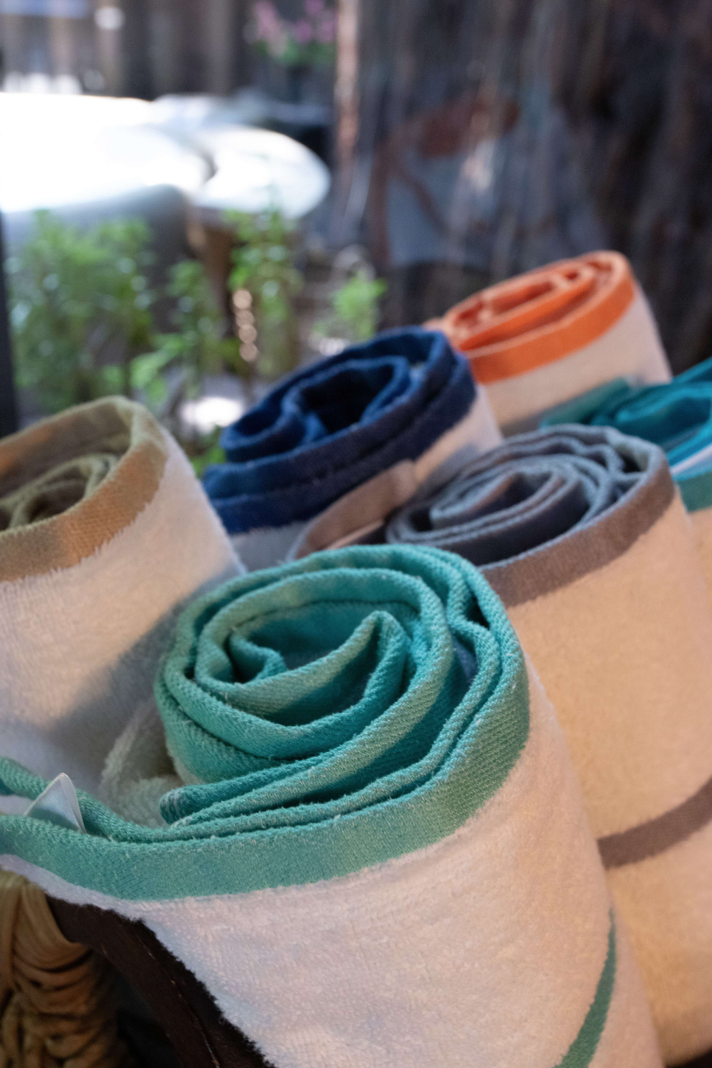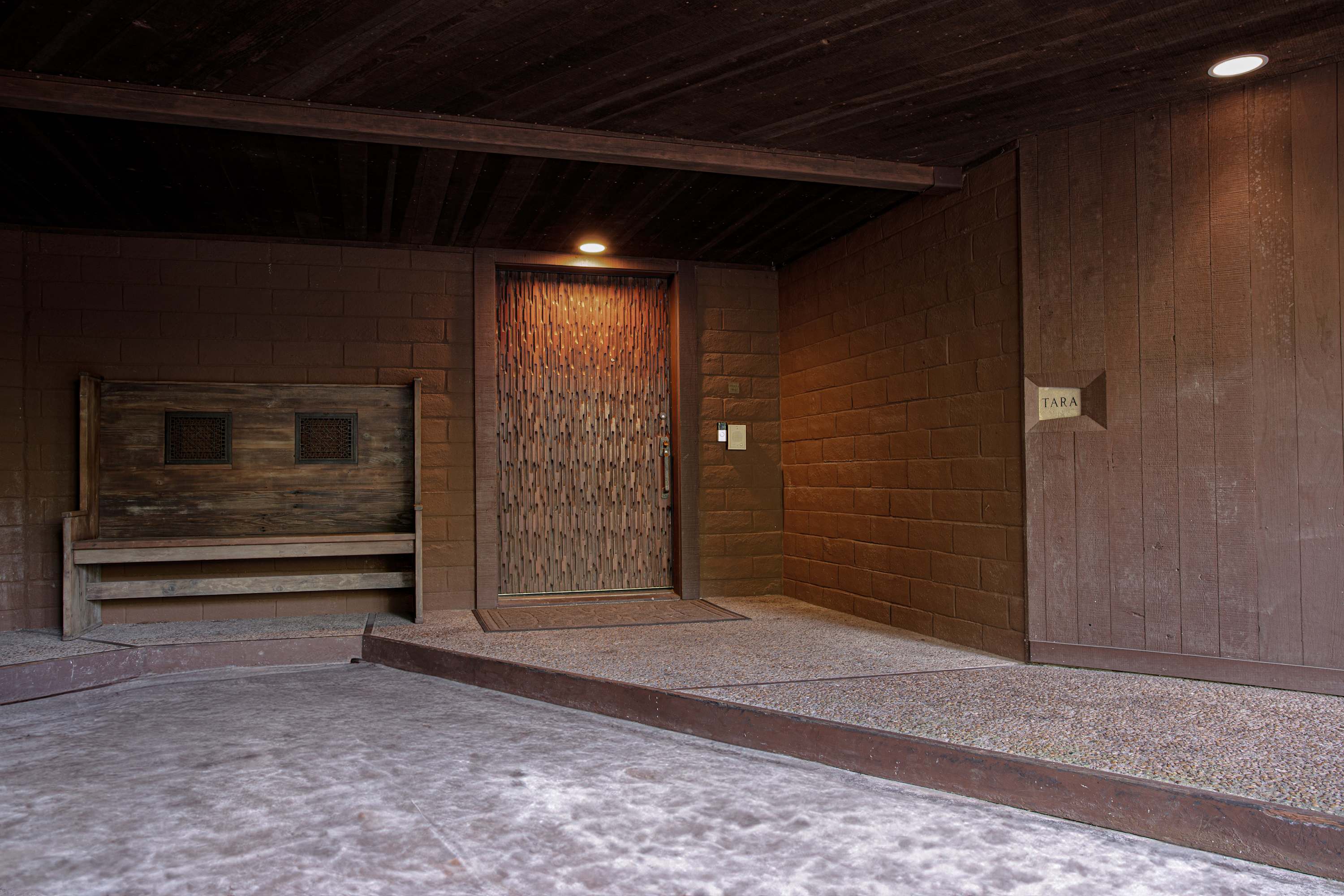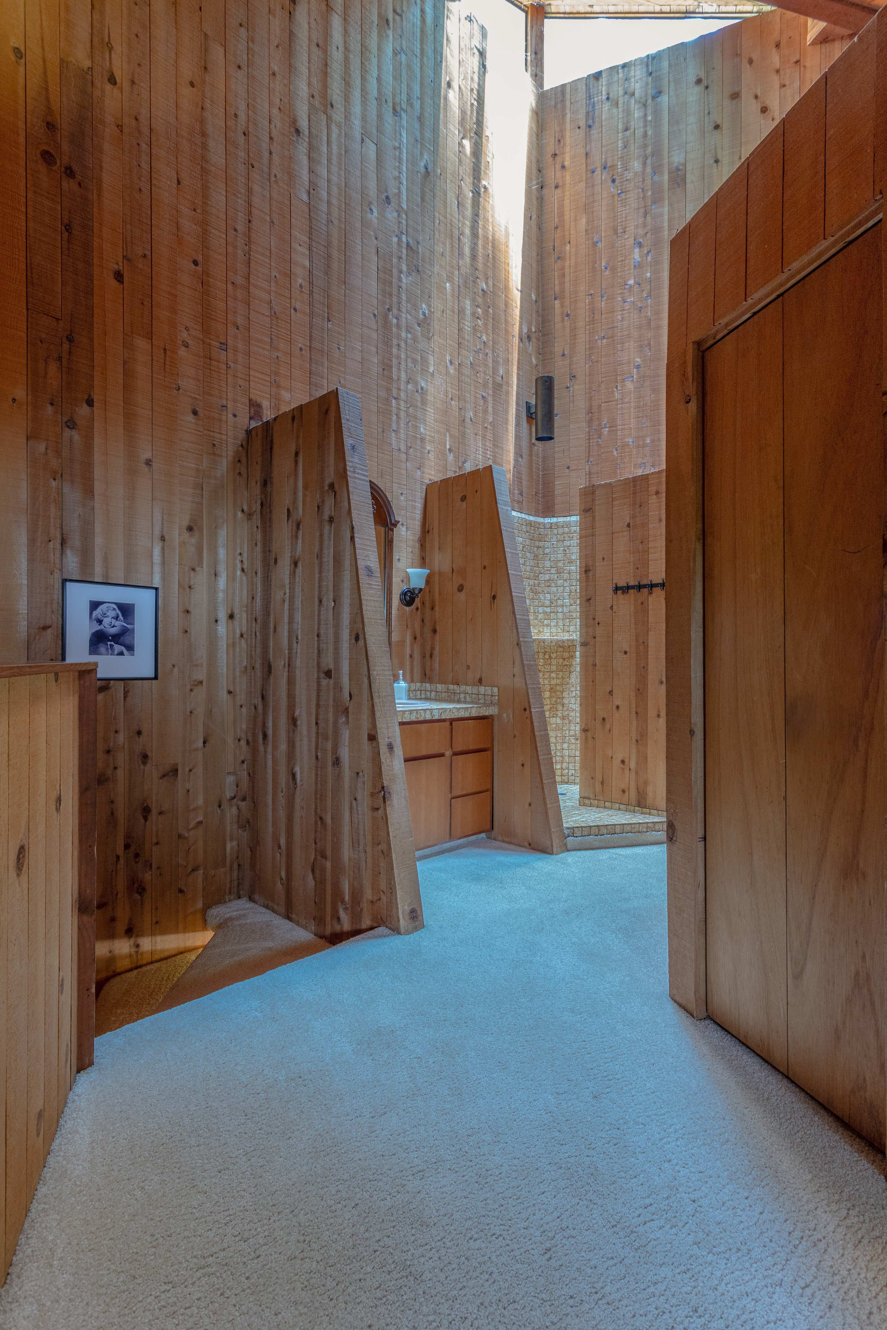 Just off the deck lies the private, detached casita. Perfect for those seeking extra privacy, it has its own bathroom, and a wardrobe. The space boasts a fun, retro vibe with mid-century modern furnishings and a unique throwback carpeted wall.