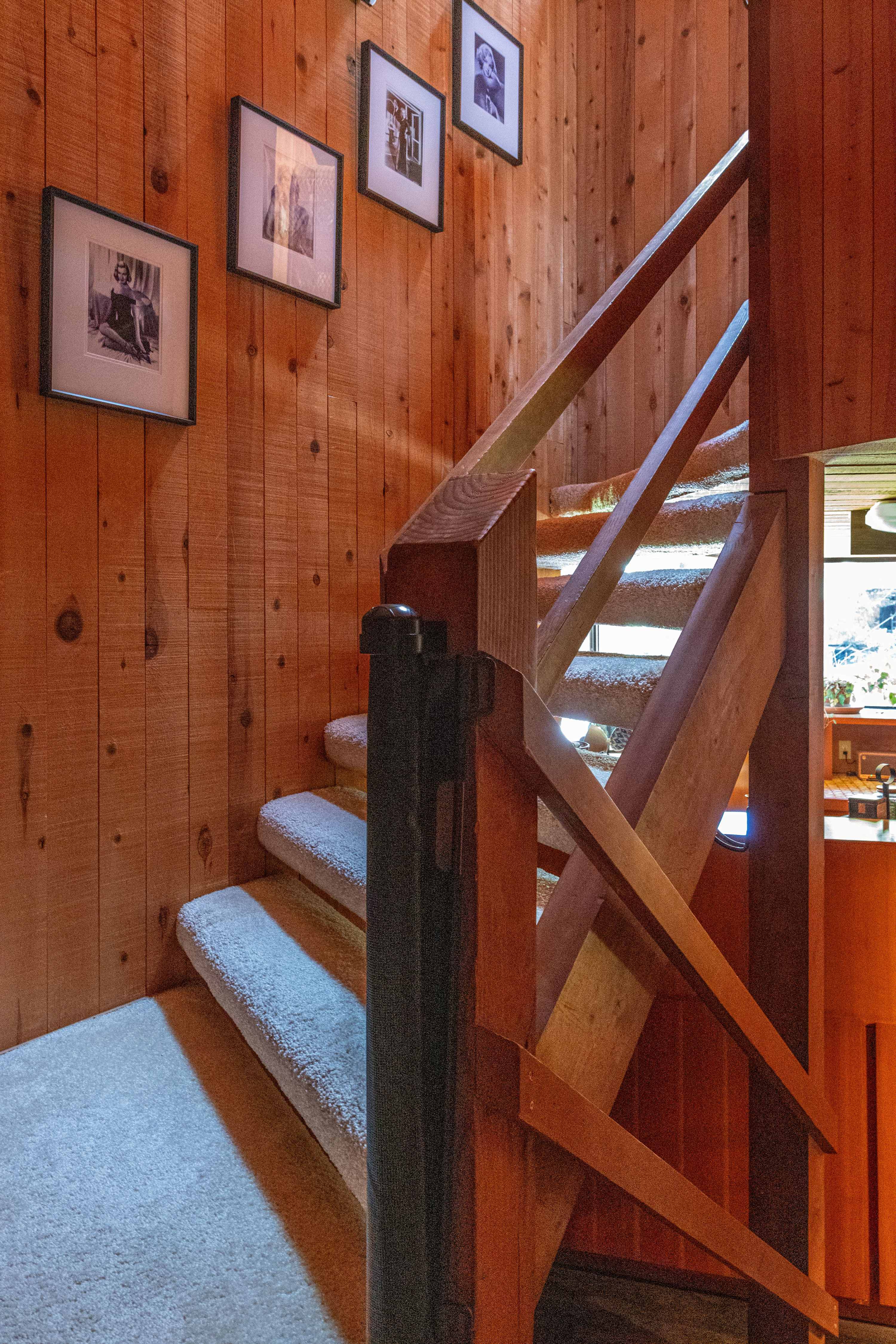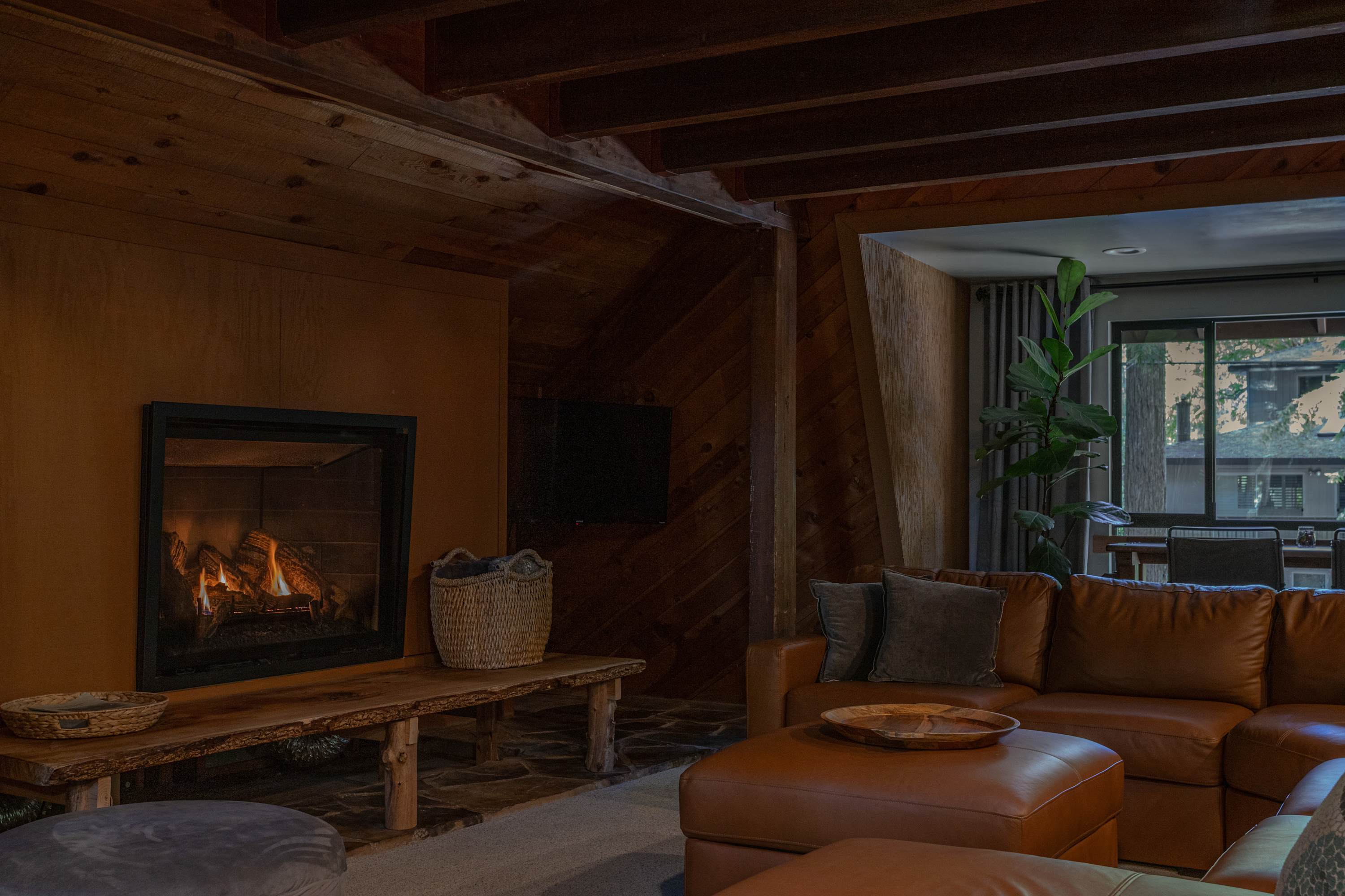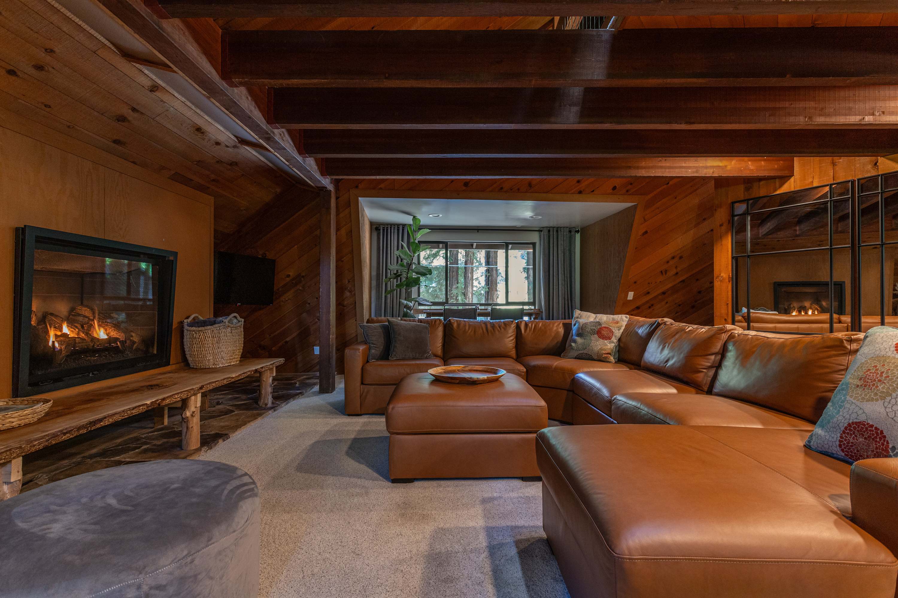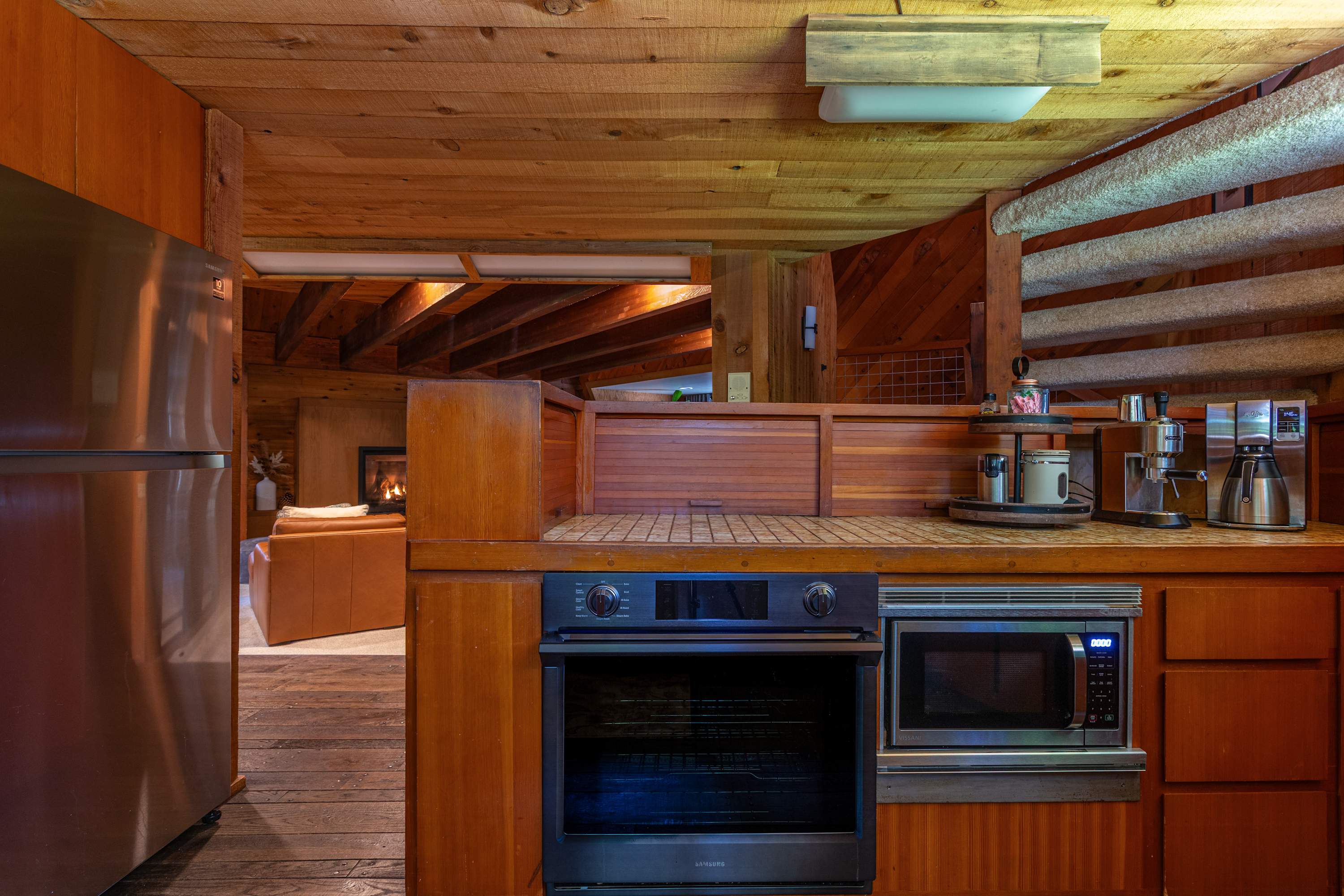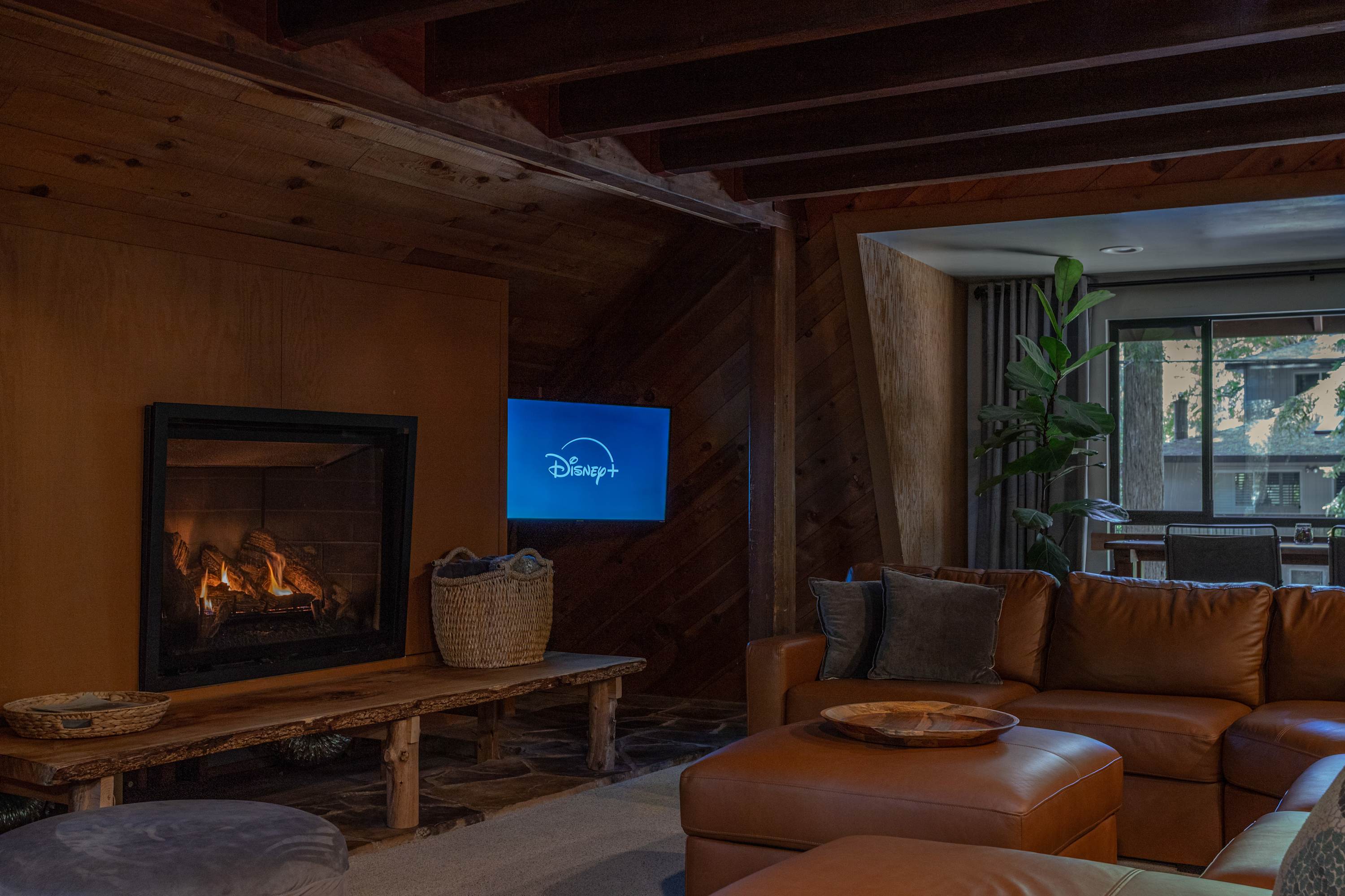 Ascend the beautifully crafted staircase to the heart of the home: a large, open family room with an inviting gas fireplace and TV. Need to get some work done? A dedicated desk looks out a window, providing an inspiring forest view.The space flows into the gourmet kitchen, a stunning example of Mid-Century Modern design that cleverly keeps you connected to the home's social hubs. From the main prep area, you have a clear sightline to the fireplace and living room, so you’re always part of the conversation.