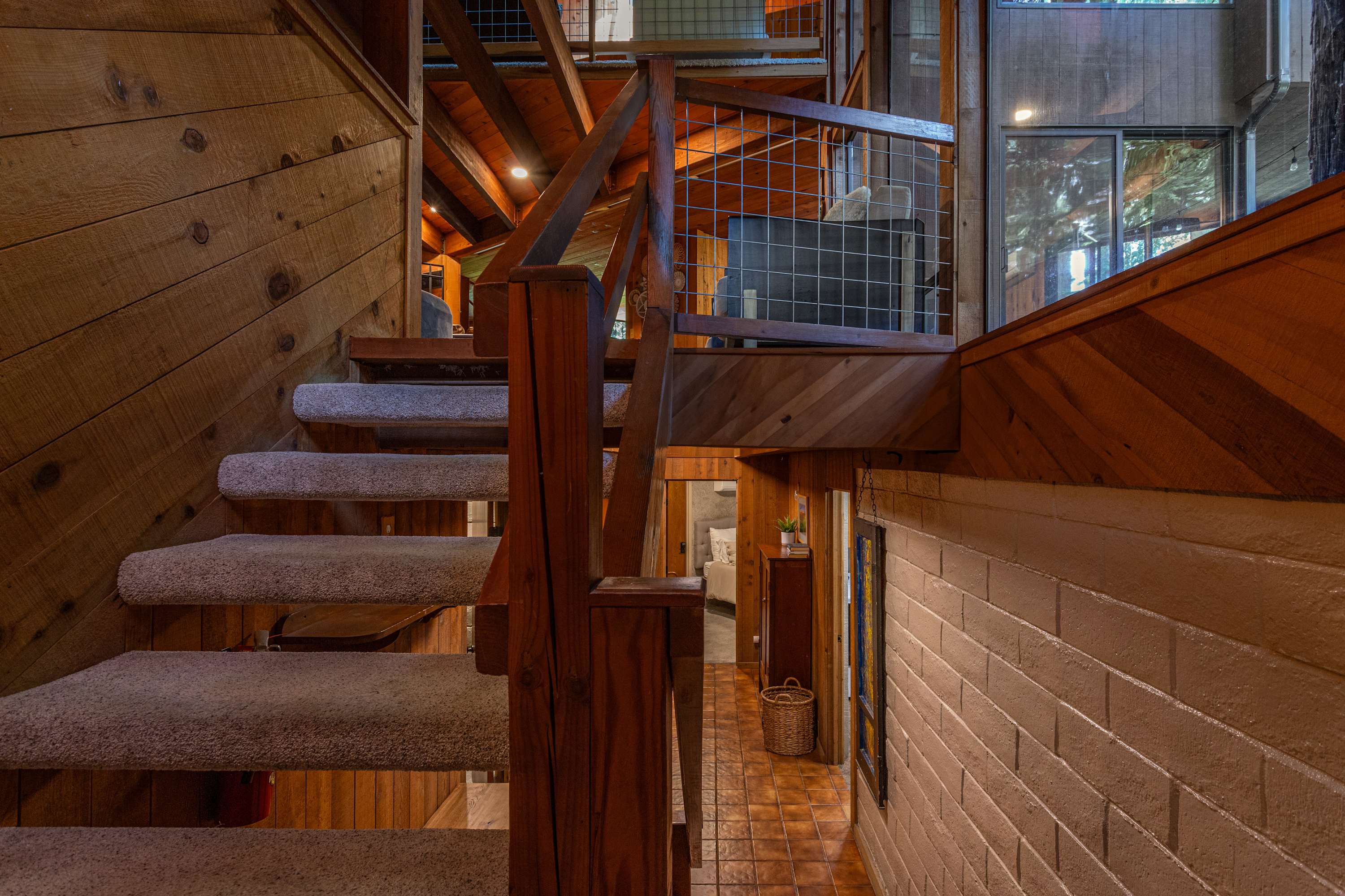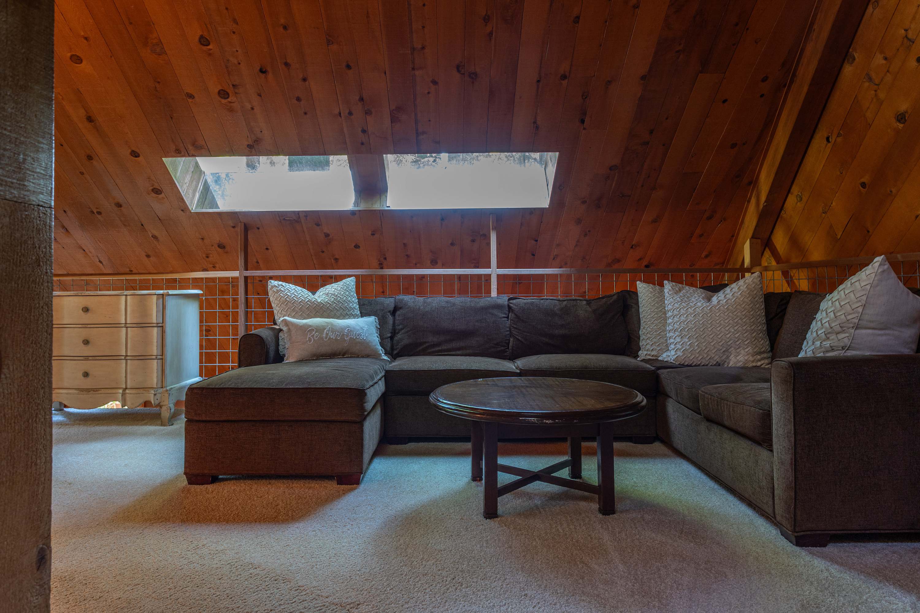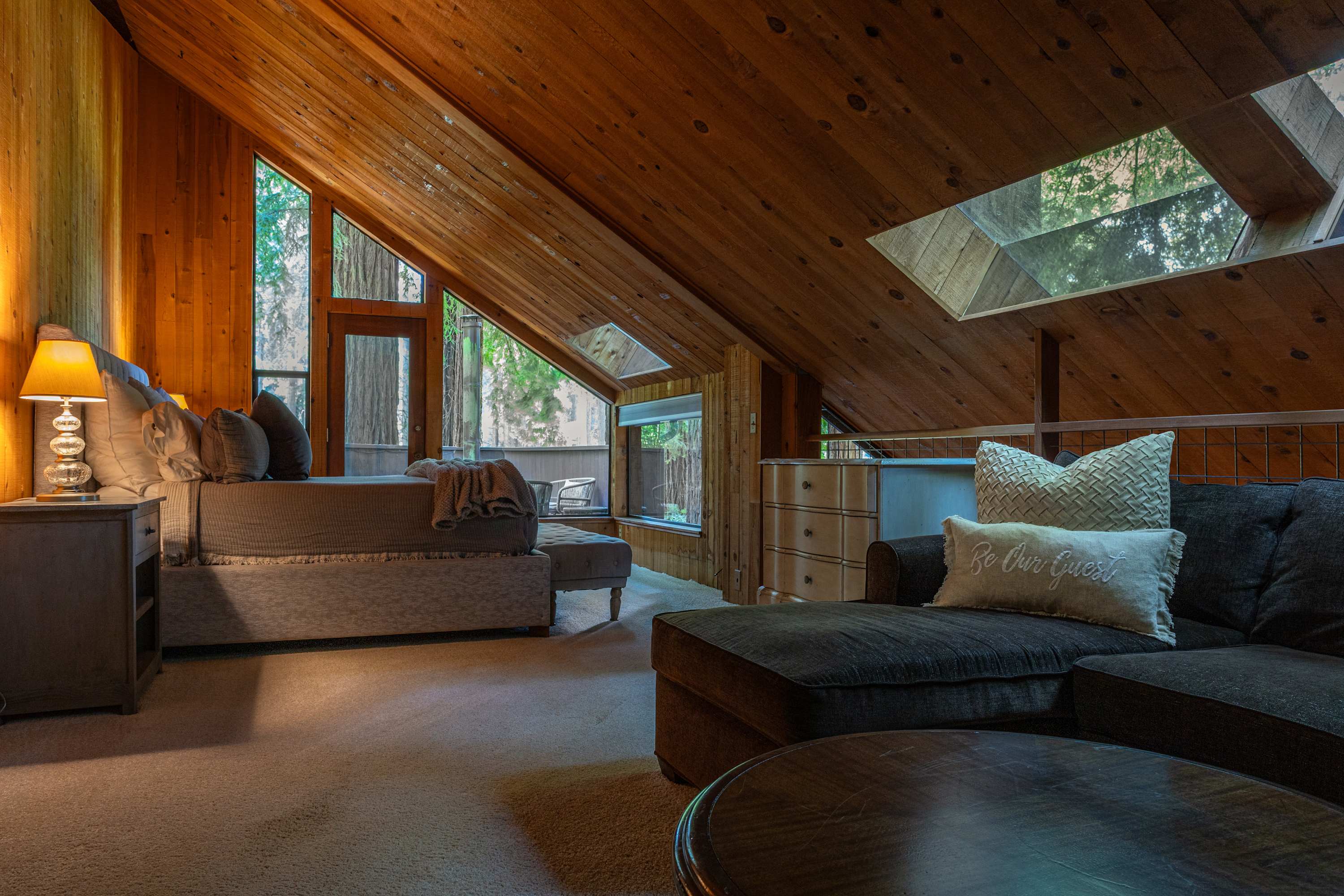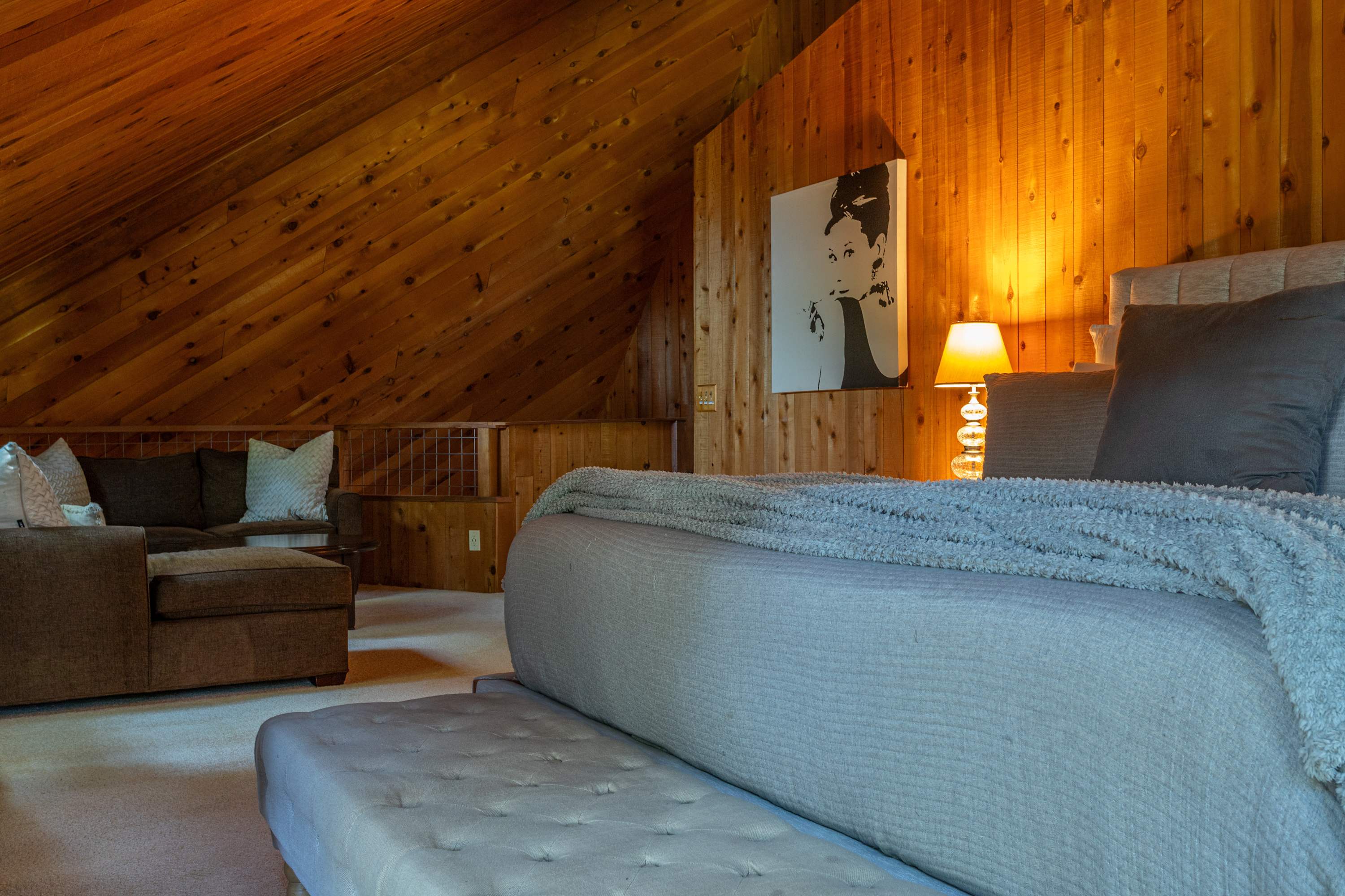 The entire top level is a spectacular, loft-style primary suite. The en-suite bathroom is an architectural marvel: the architects designed it with a dramatic 20-foot pinnacle bordered with skylights, allowing you to shower under the sun or stars. Relax on the sectional sofa in the private seating area or rest in the grand King bed. Best of all, step out onto your private rooftop patio—a secluded escape perfect for morning coffee or nighttime stargazing.